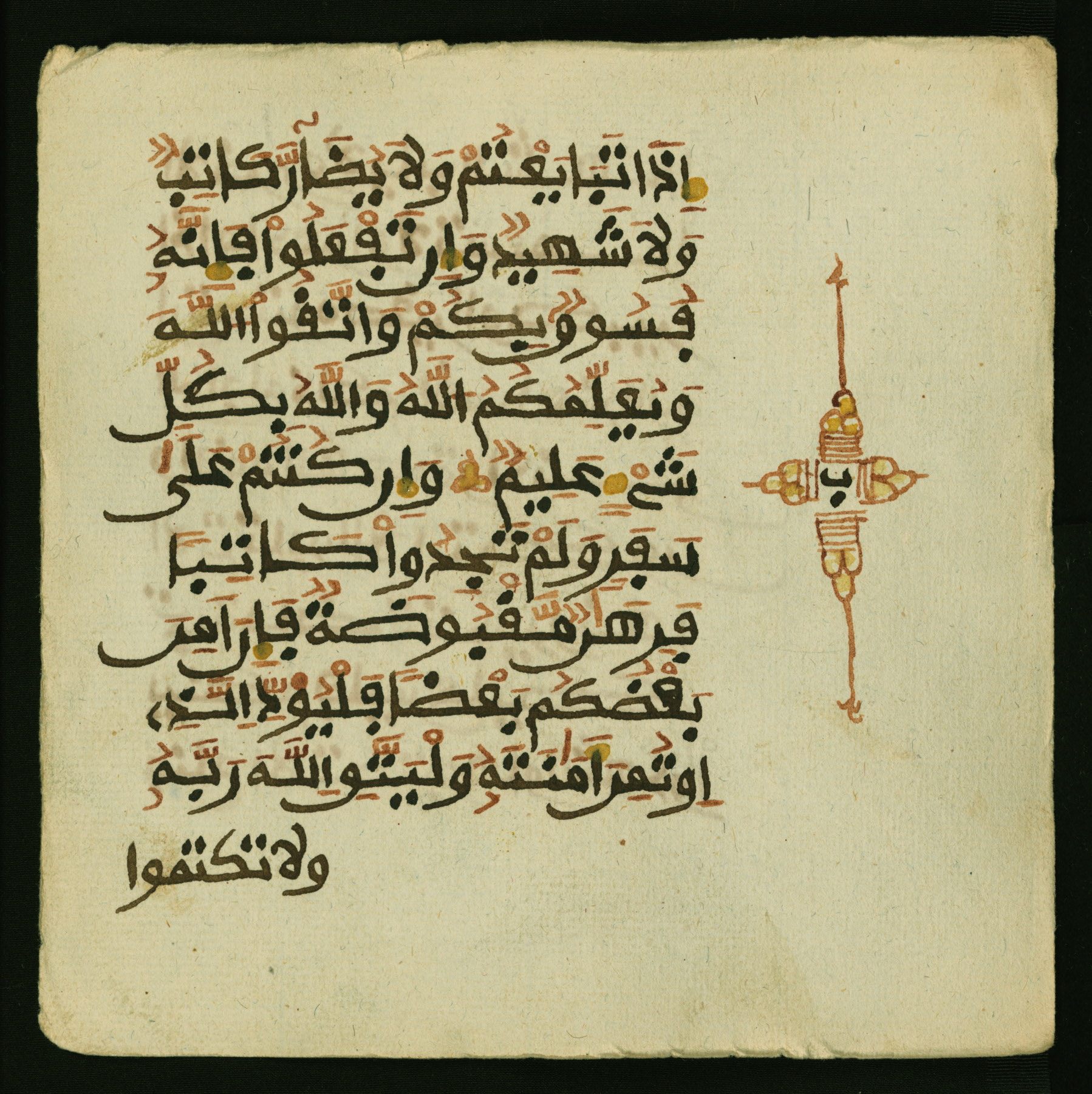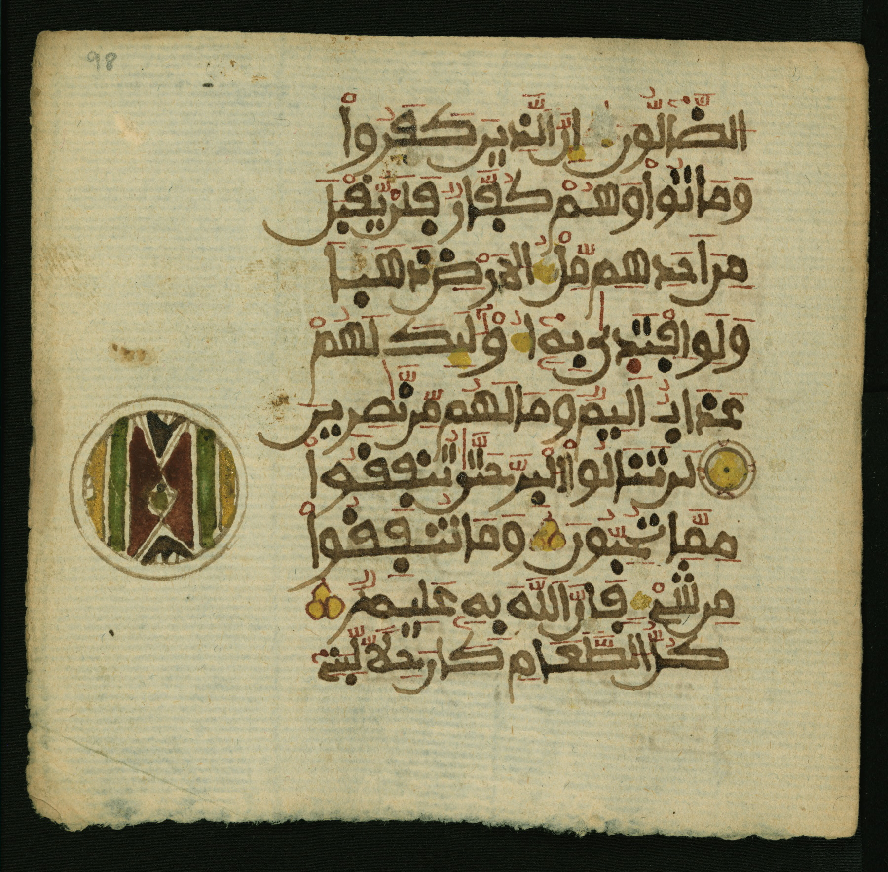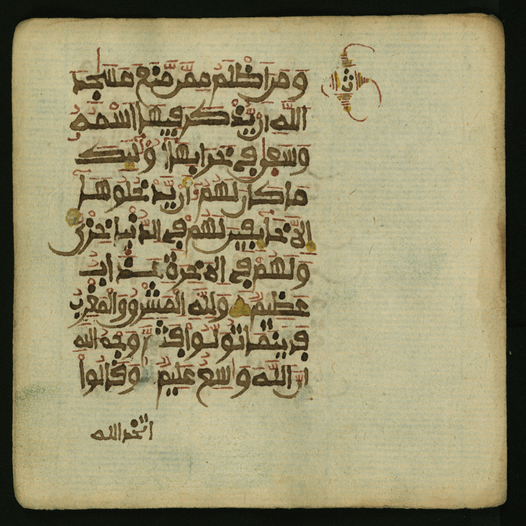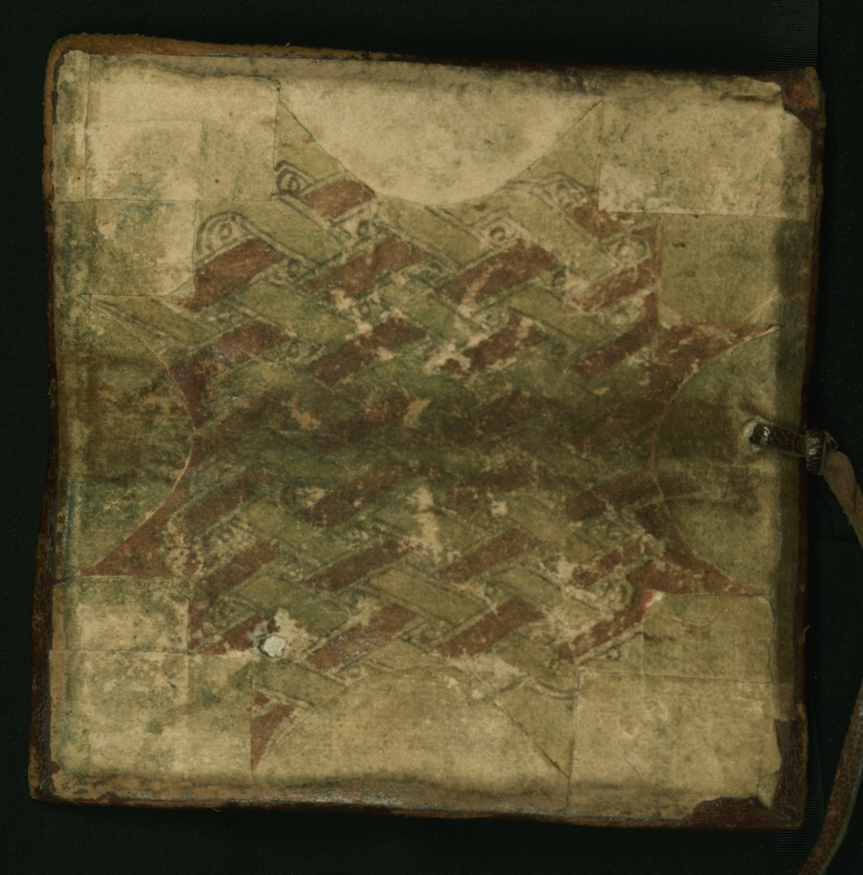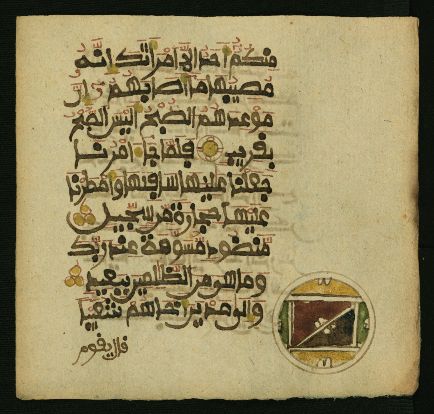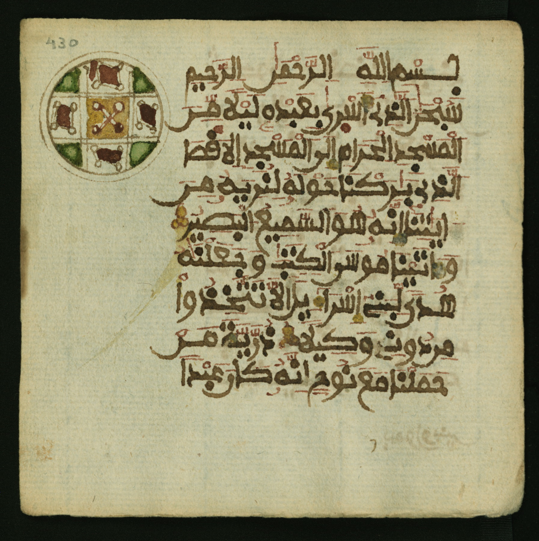 This square-format manuscript is volume 1, containing chapters 1-18 (Sūrat al-fātiḥah through Sūrat al-kahf), of an illuminated two-volume Qur'an produced in Sub-Saharan (West) Africa in the thirteenth century AH / nineteenth CE. The text is written in Sūdānī script in dark brown ink with vocalization in red on loose leaves. Chapter headings are in reddish-brown ink. Three yellow dots outlined in red arranged in a triangular form separate verses. Polychrome circular medallions as well as square and rectangular devices in a variety of patterns and colors mark textual divisions. The leaves of the text are organized between two decorated boards with geometric compositions. The pages and boards are housed in a leather pouch (satchel).