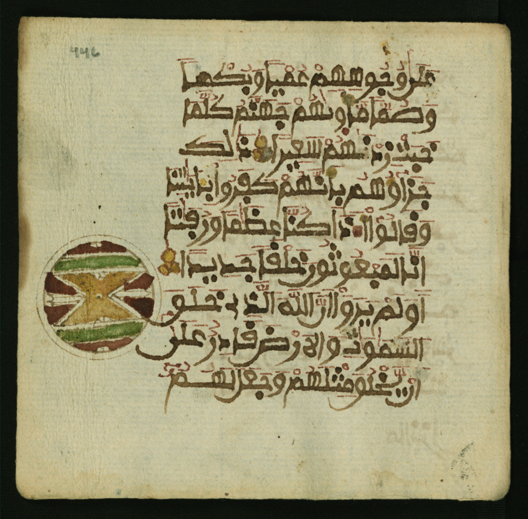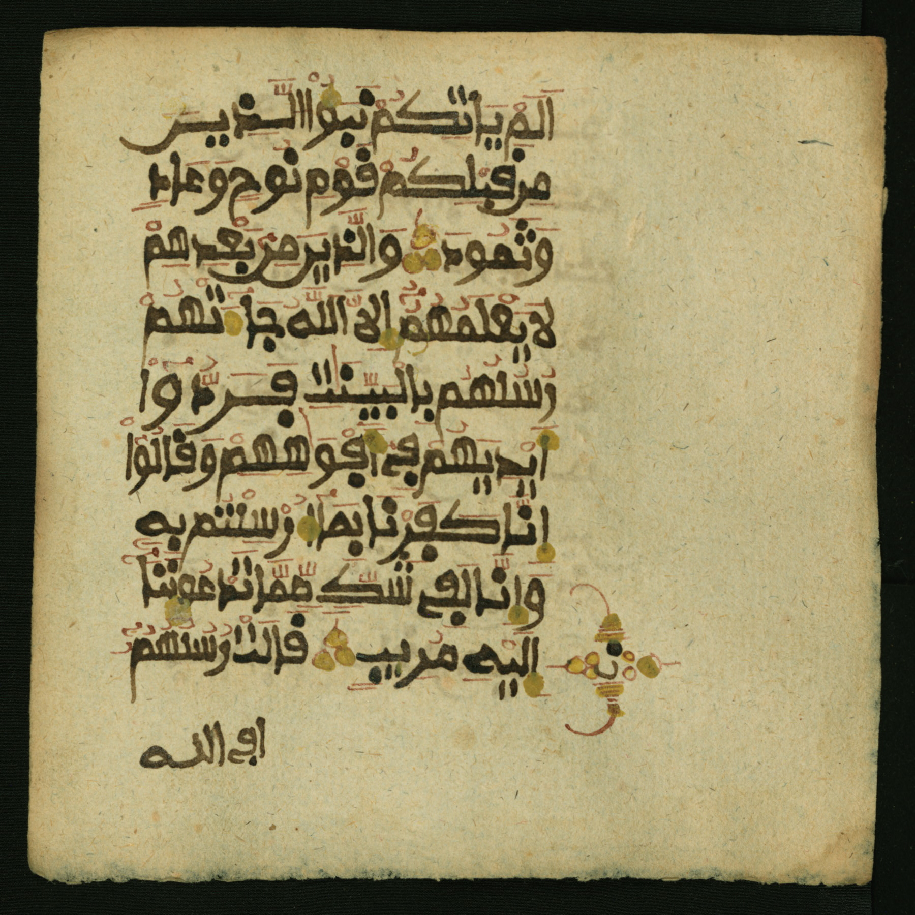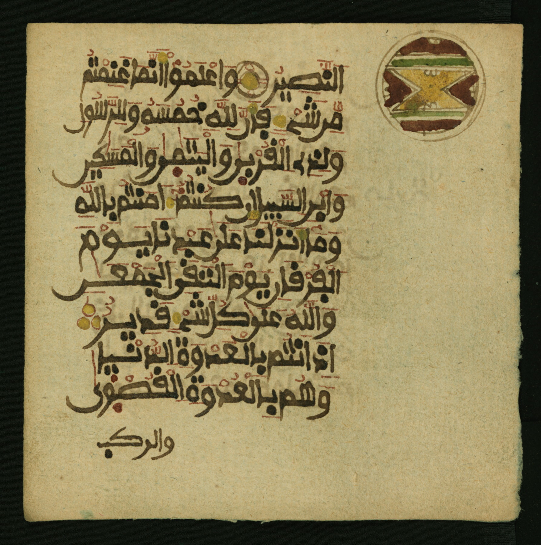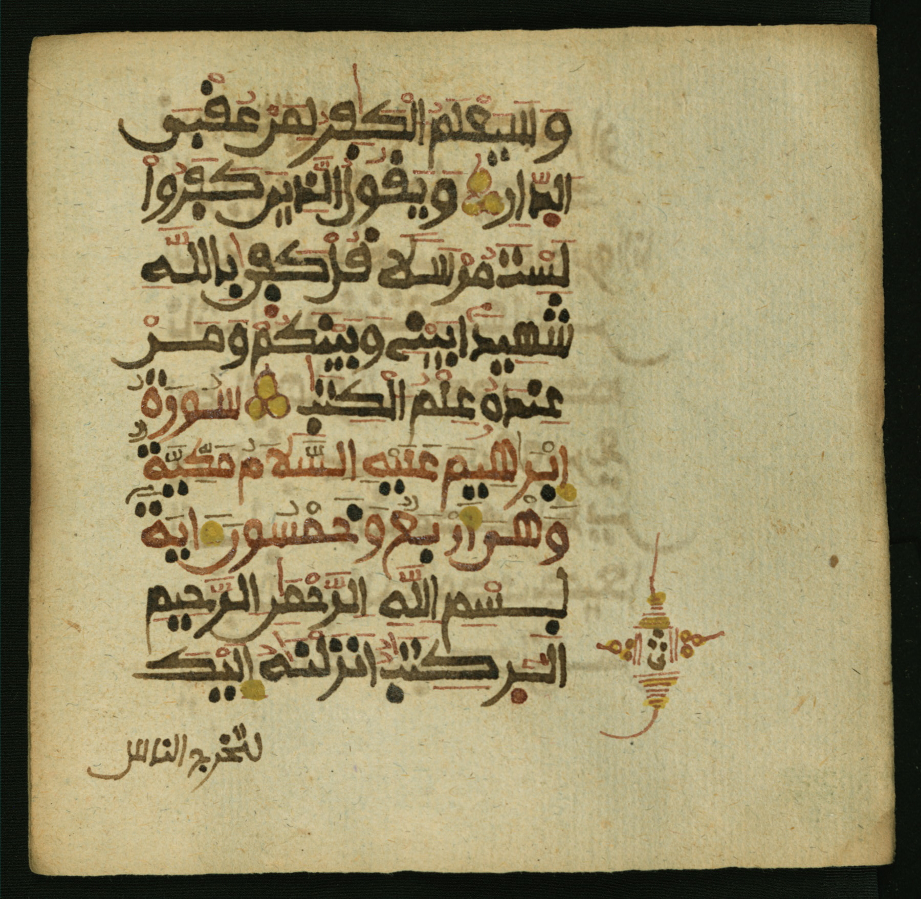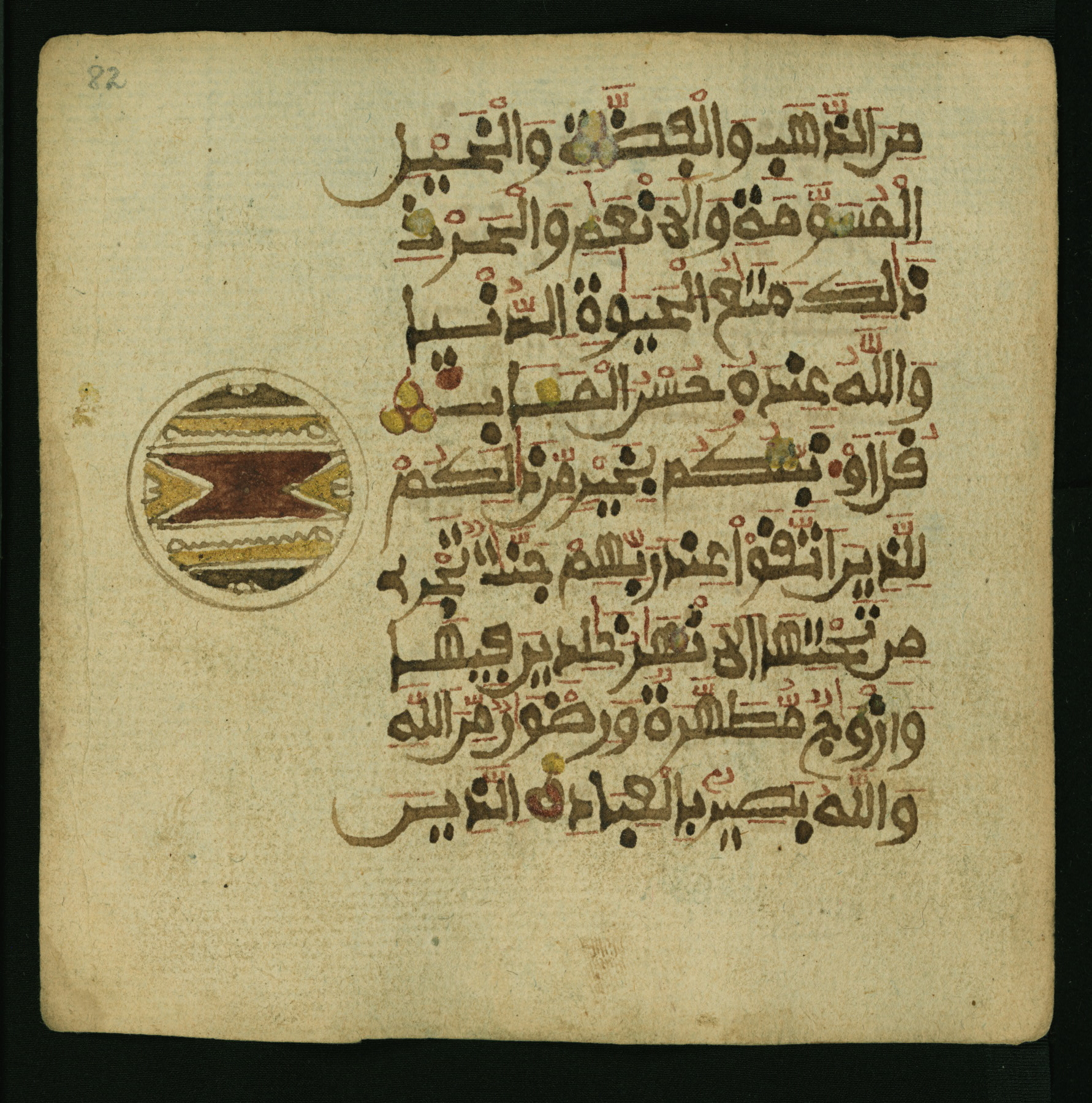 This square-format manuscript is volume 1, containing chapters 1-18 (Sūrat al-fātiḥah through Sūrat al-kahf), of an illuminated two-volume Qur'an produced in Sub-Saharan (West) Africa in the thirteenth century AH / nineteenth CE. The text is written in Sūdānī script in dark brown ink with vocalization in red on loose leaves. Chapter headings are in reddish-brown ink. Three yellow dots outlined in red arranged in a triangular form separate verses. Polychrome circular medallions as well as square and rectangular devices in a variety of patterns and colors mark textual divisions. The leaves of the text are organized between two decorated boards with geometric compositions. The pages and boards are housed in a leather pouch (satchel).