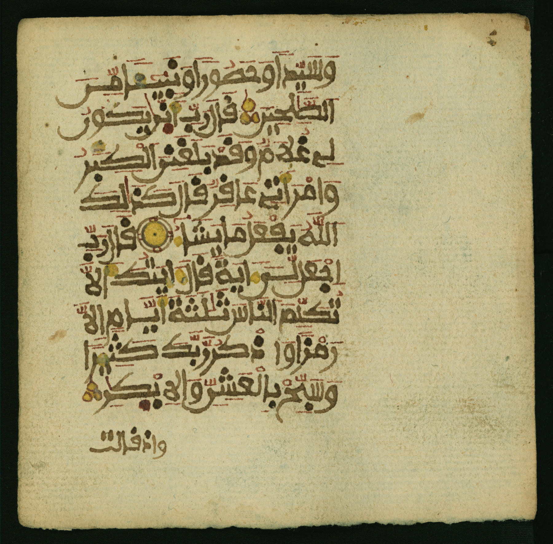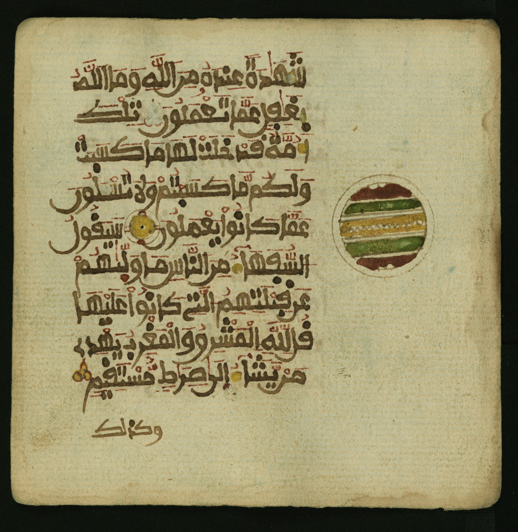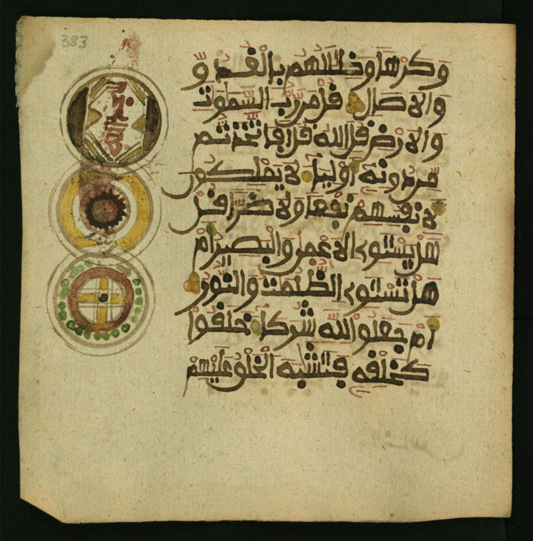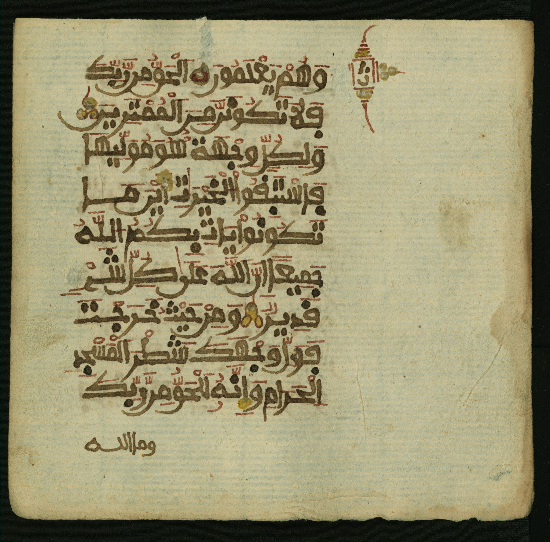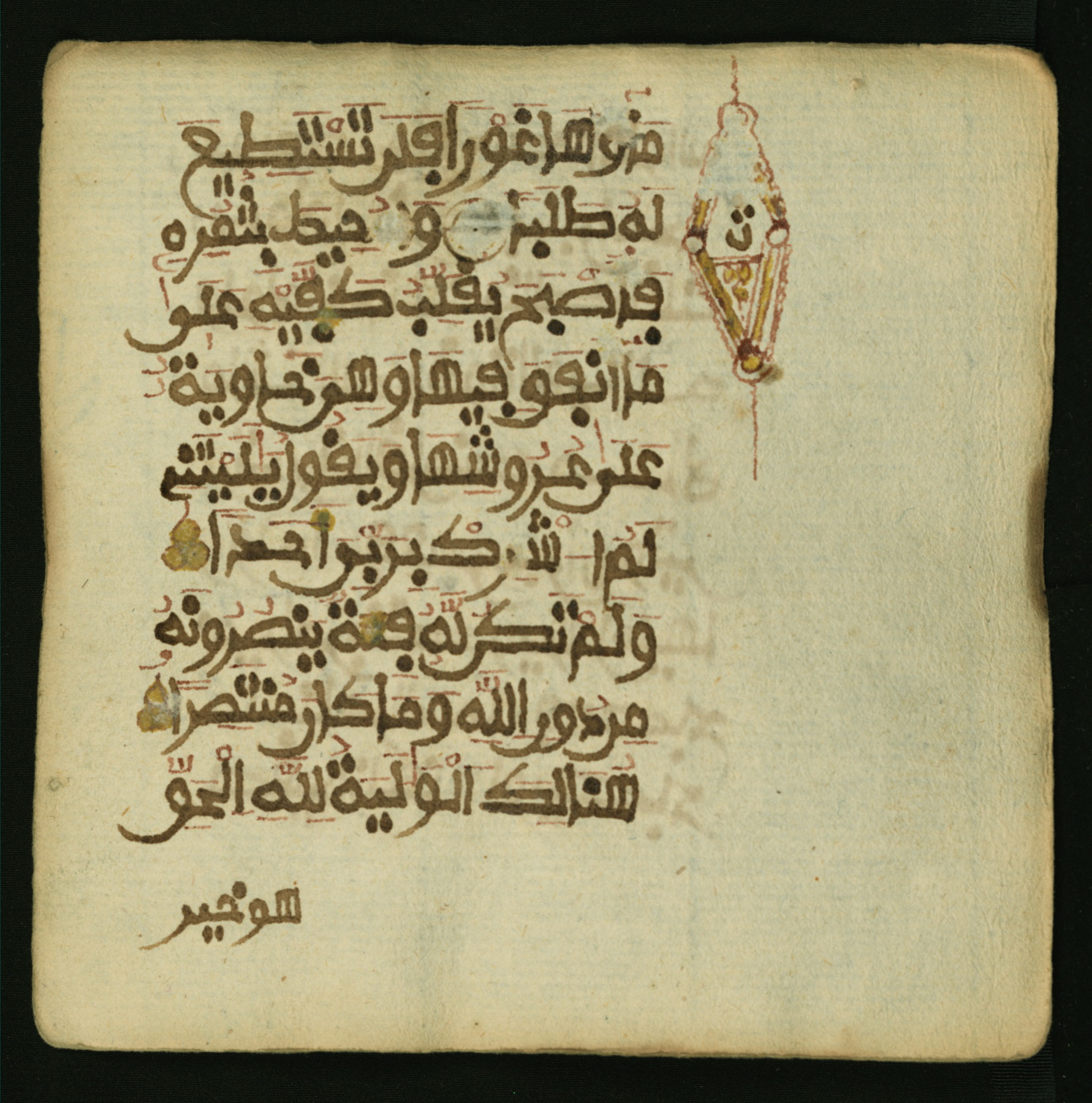 This square-format manuscript is volume 1, containing chapters 1-18 (Sūrat al-fātiḥah through Sūrat al-kahf), of an illuminated two-volume Qur'an produced in Sub-Saharan (West) Africa in the thirteenth century AH / nineteenth CE. The text is written in Sūdānī script in dark brown ink with vocalization in red on loose leaves. Chapter headings are in reddish-brown ink. Three yellow dots outlined in red arranged in a triangular form separate verses. Polychrome circular medallions as well as square and rectangular devices in a variety of patterns and colors mark textual divisions. The leaves of the text are organized between two decorated boards with geometric compositions. The pages and boards are housed in a leather pouch (satchel).