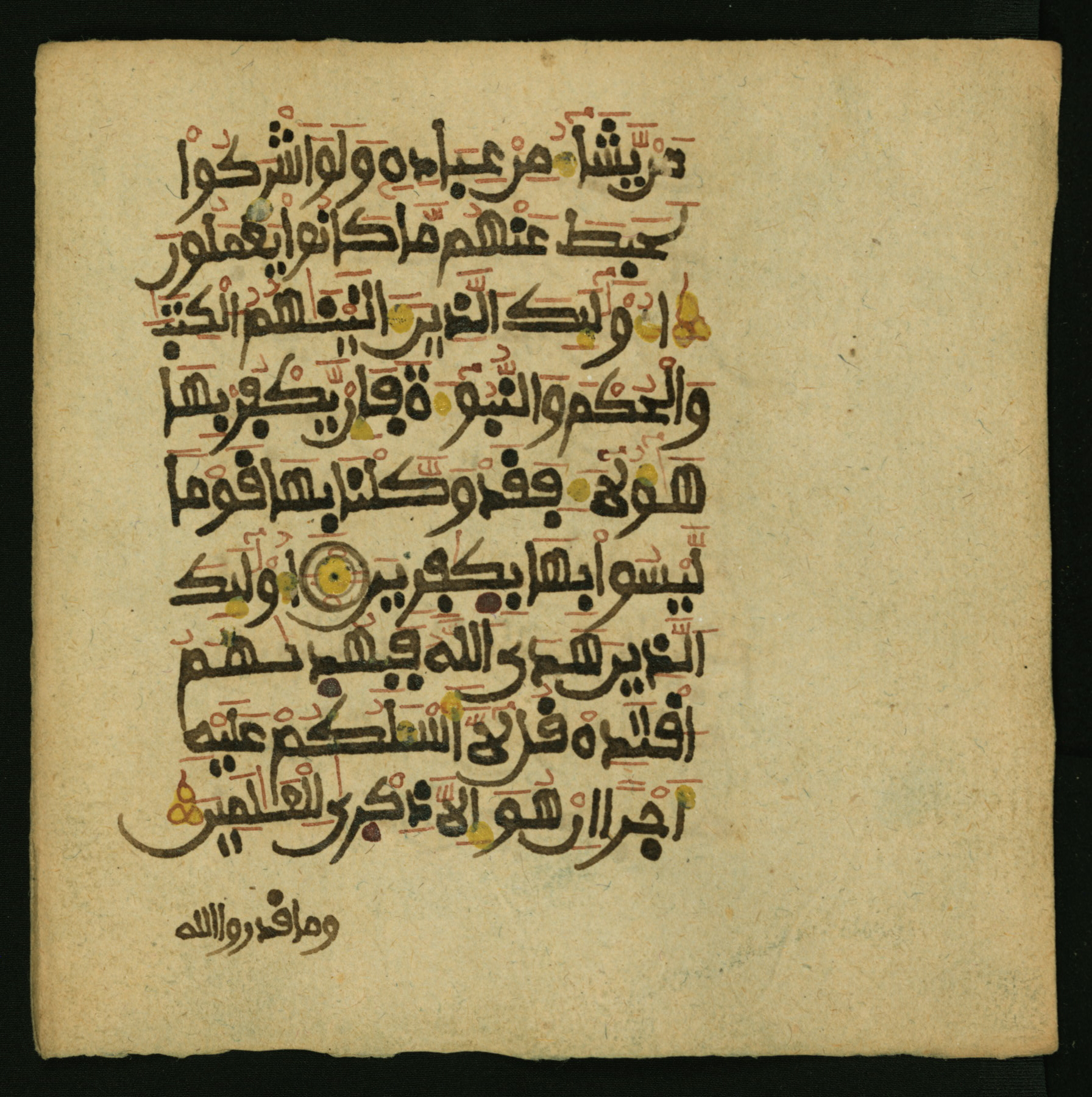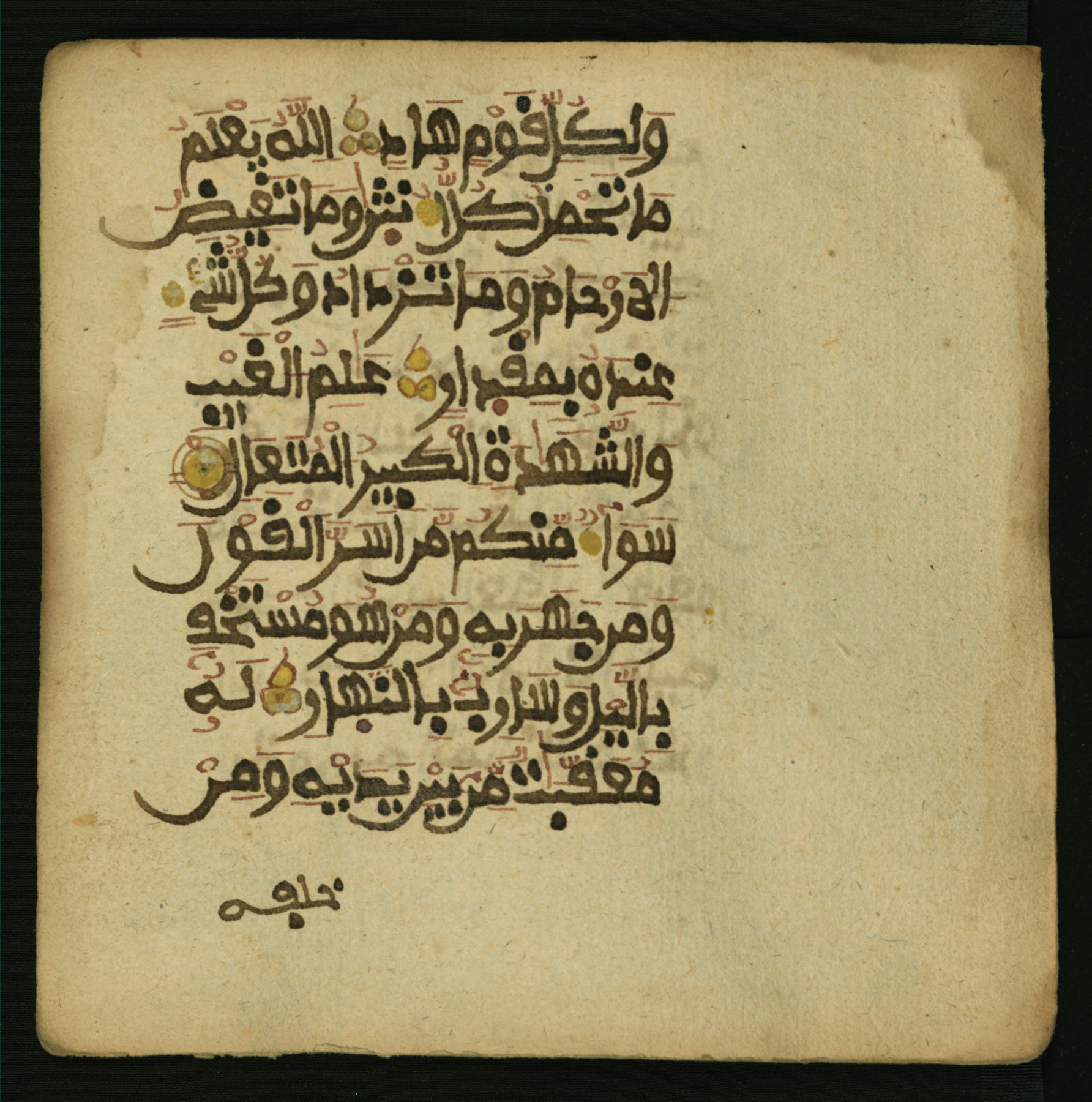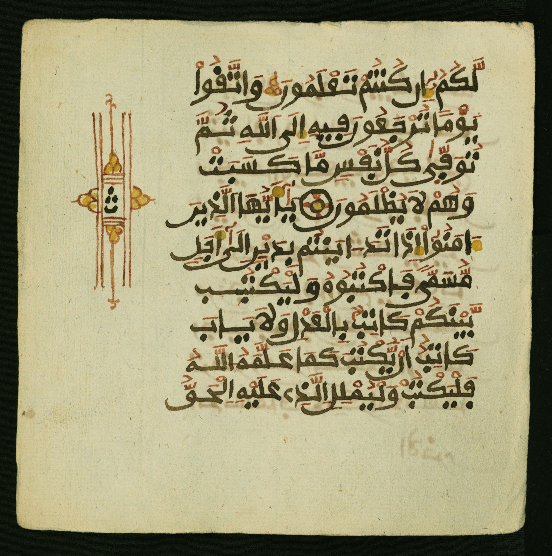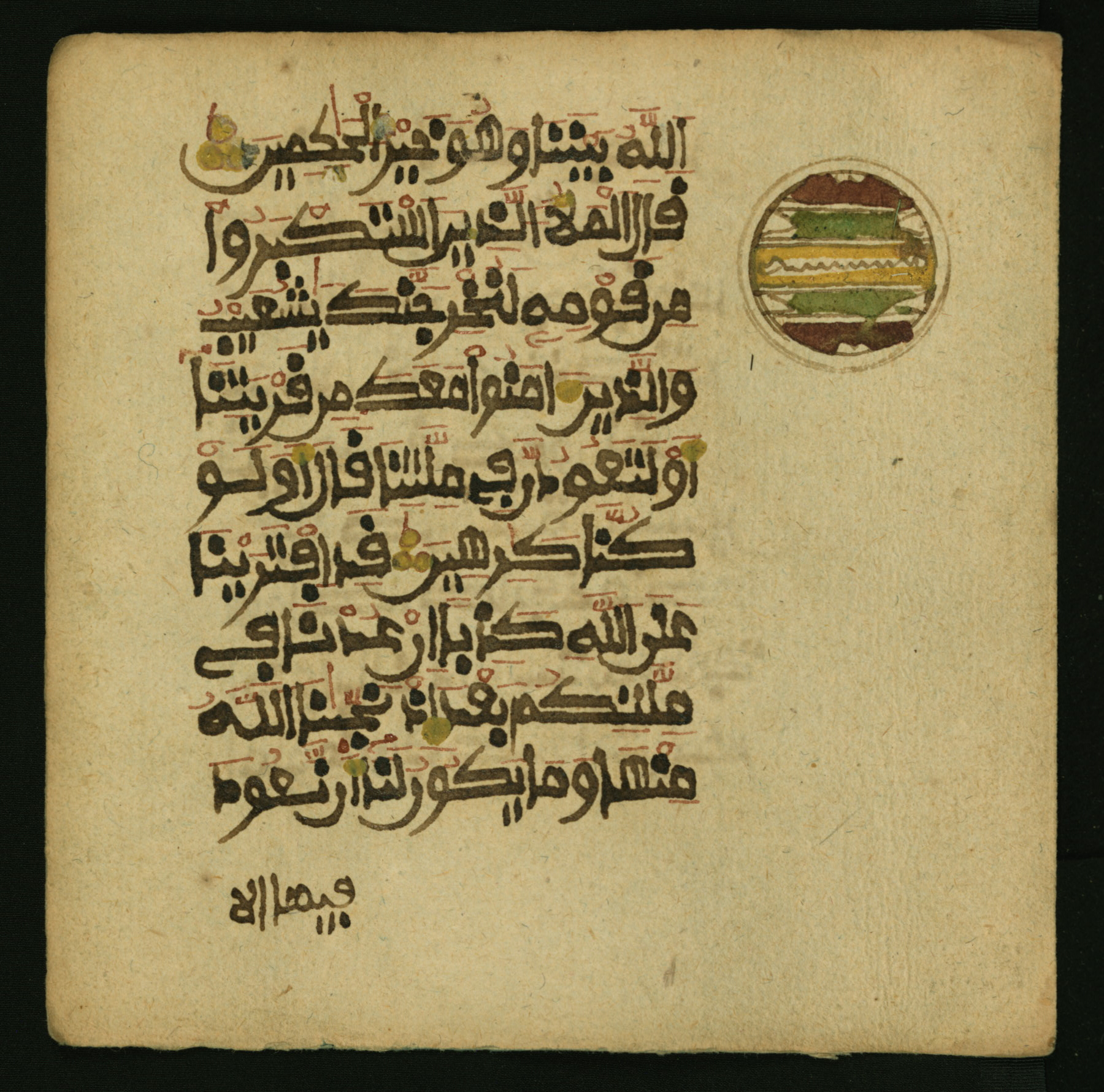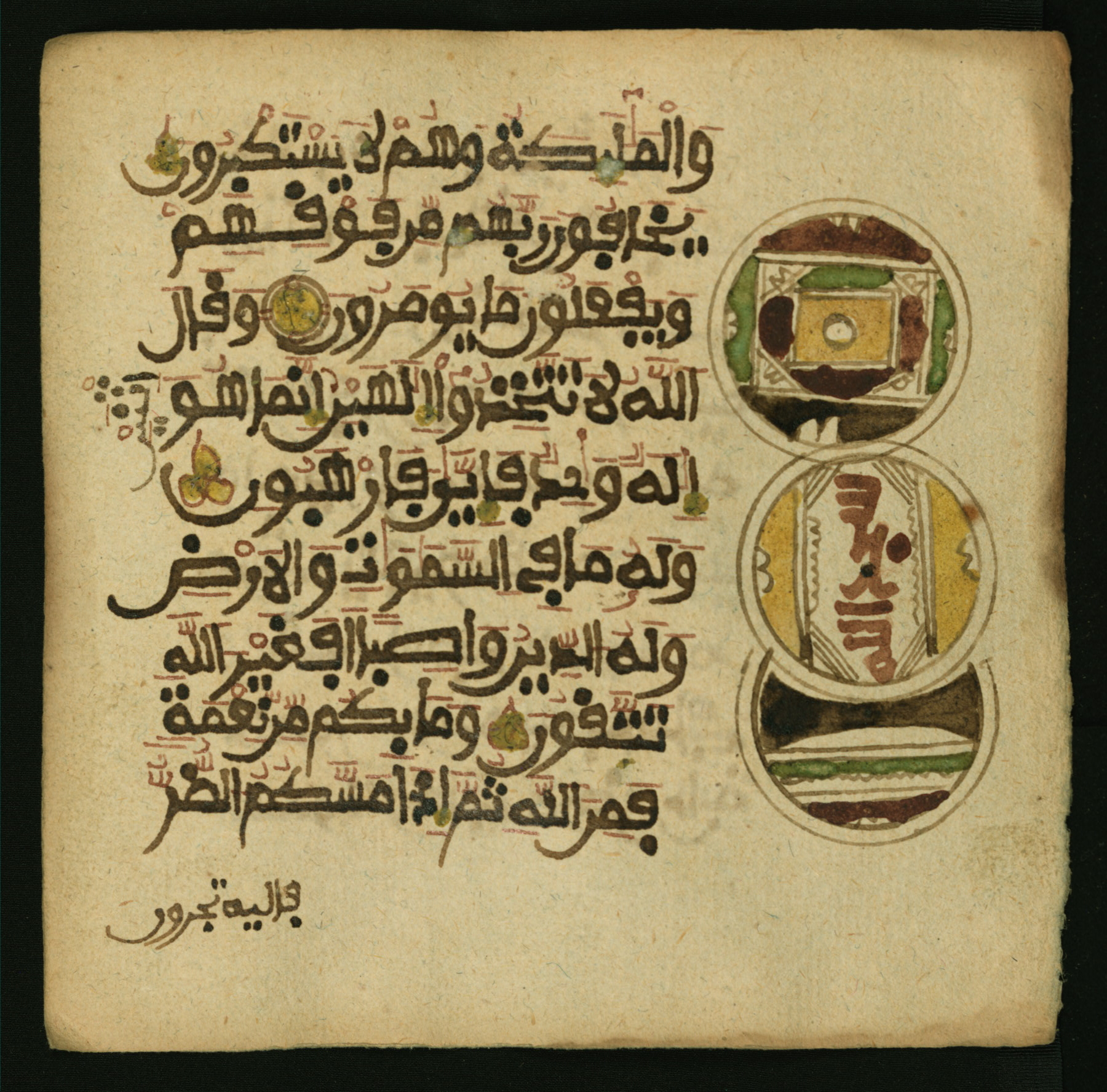 This square-format manuscript is volume 1, containing chapters 1-18 (Sūrat al-fātiḥah through Sūrat al-kahf), of an illuminated two-volume Qur'an produced in Sub-Saharan (West) Africa in the thirteenth century AH / nineteenth CE. The text is written in Sūdānī script in dark brown ink with vocalization in red on loose leaves. Chapter headings are in reddish-brown ink. Three yellow dots outlined in red arranged in a triangular form separate verses. Polychrome circular medallions as well as square and rectangular devices in a variety of patterns and colors mark textual divisions. The leaves of the text are organized between two decorated boards with geometric compositions. The pages and boards are housed in a leather pouch (satchel).