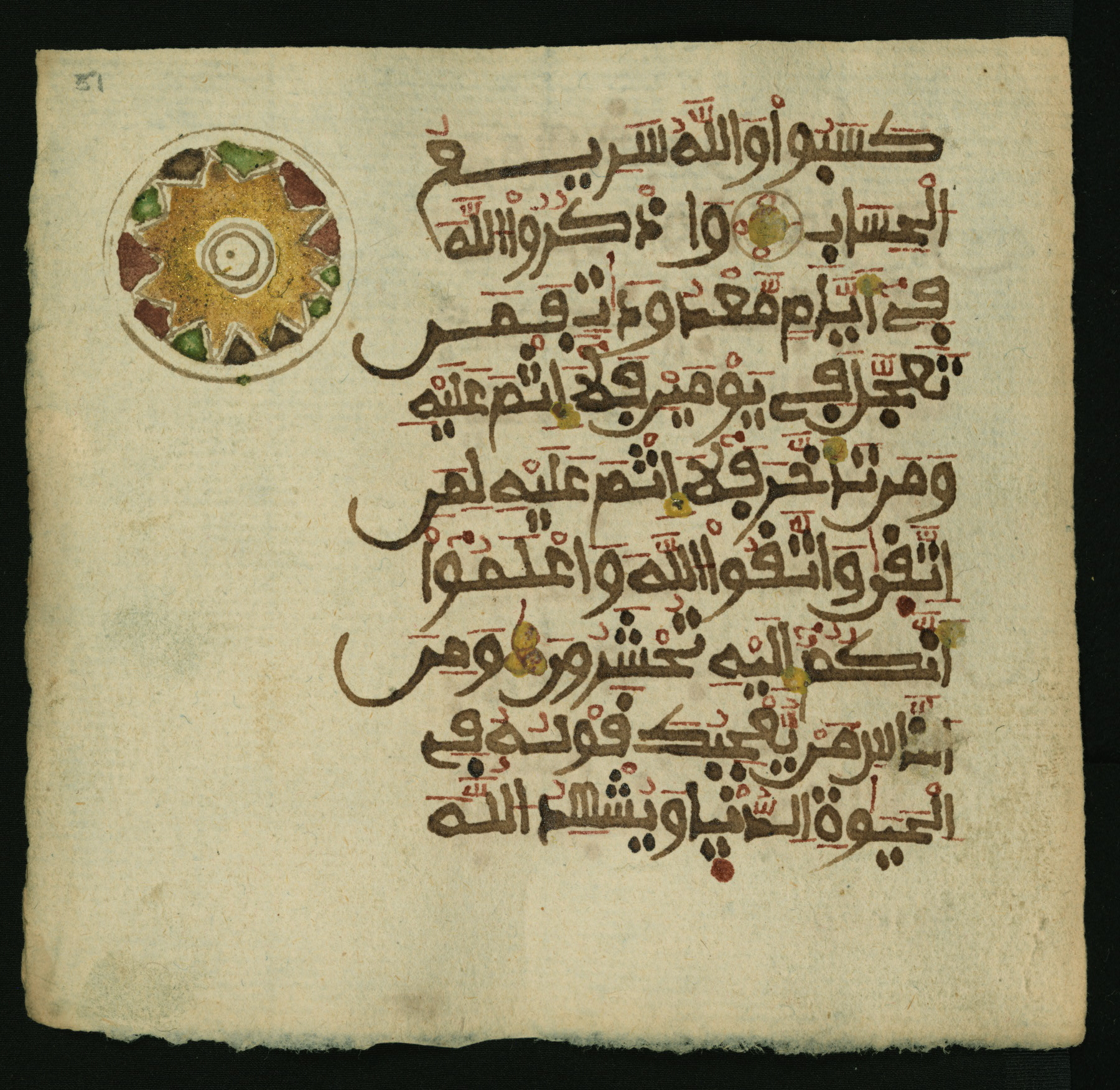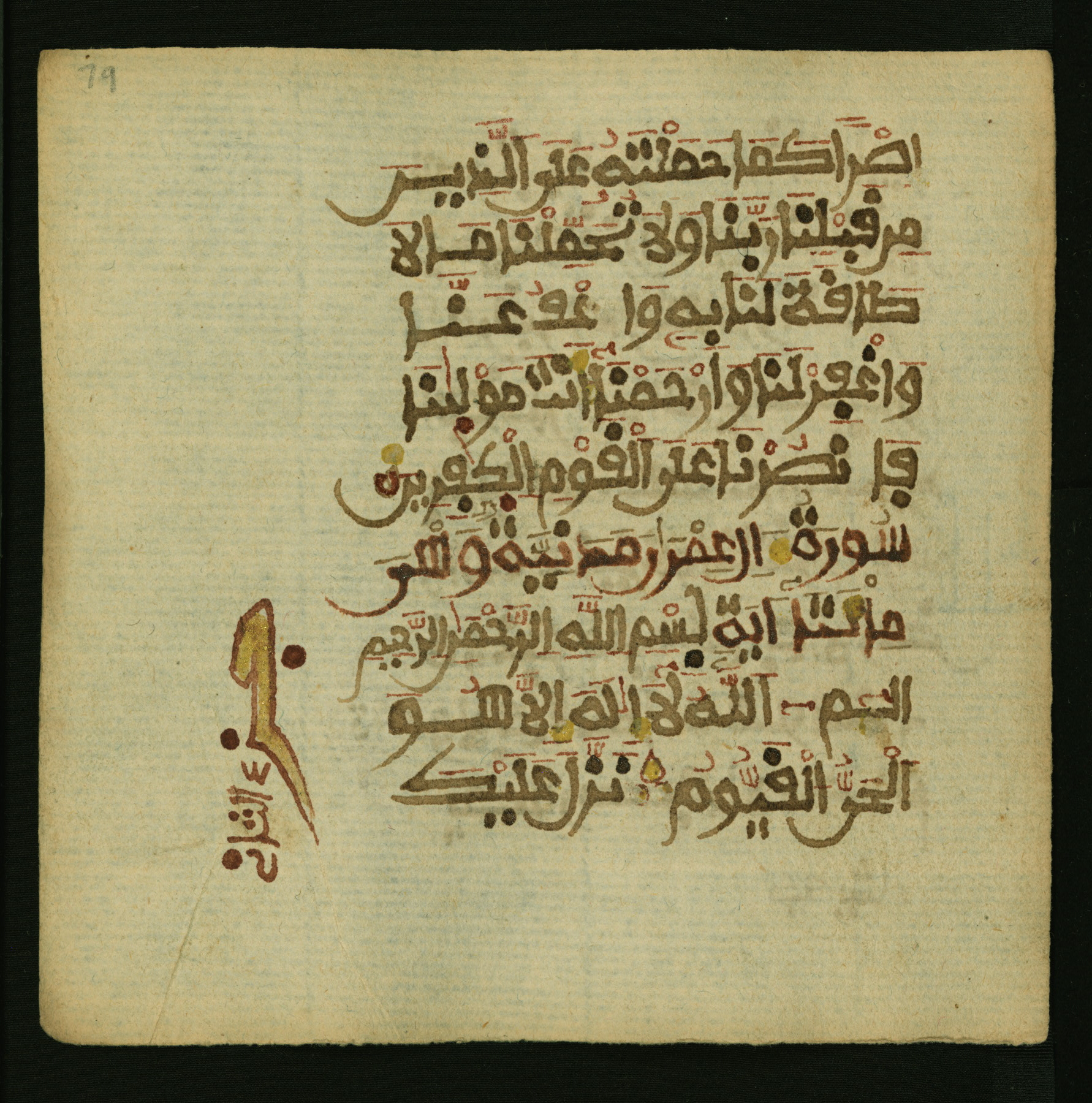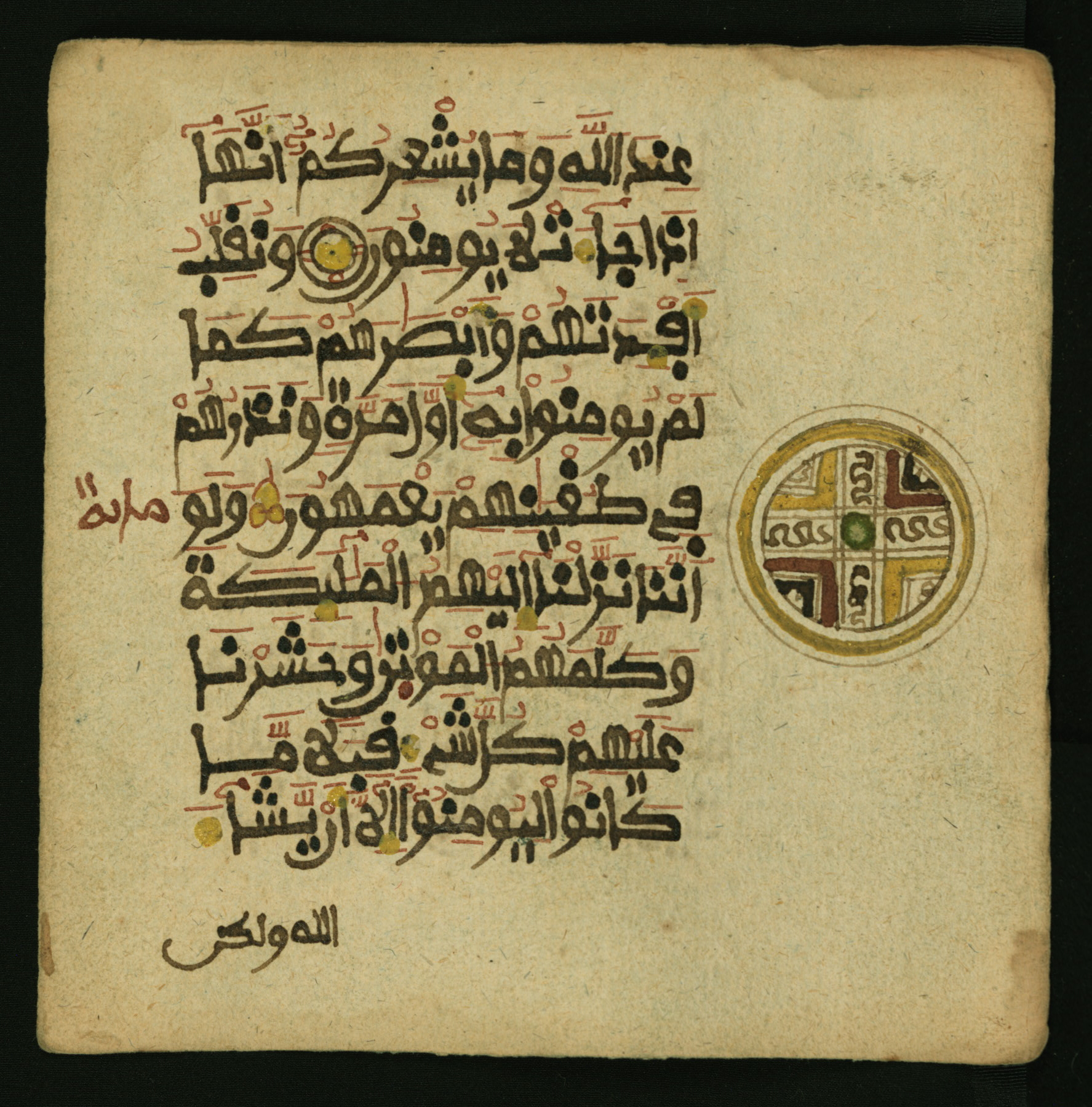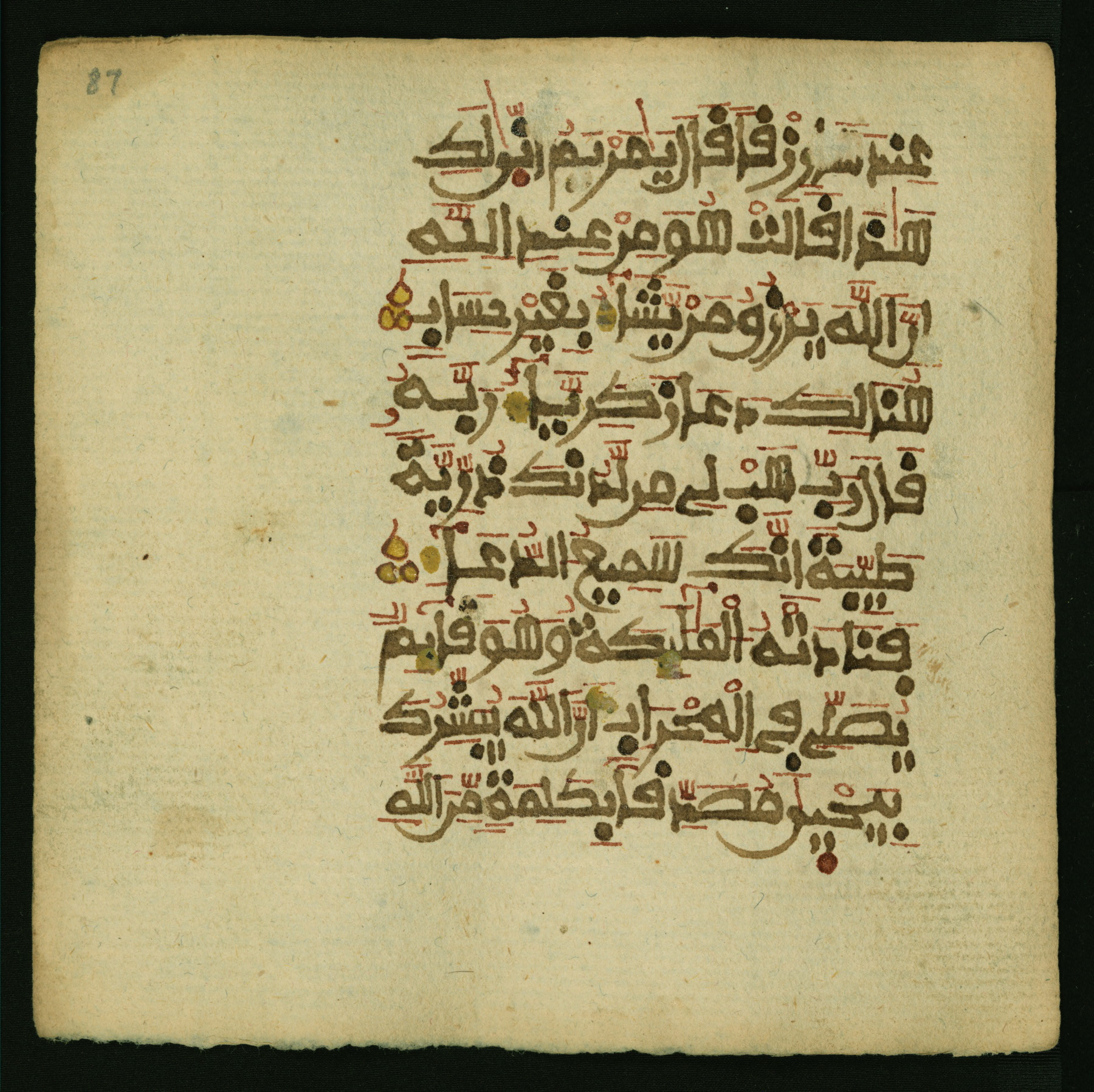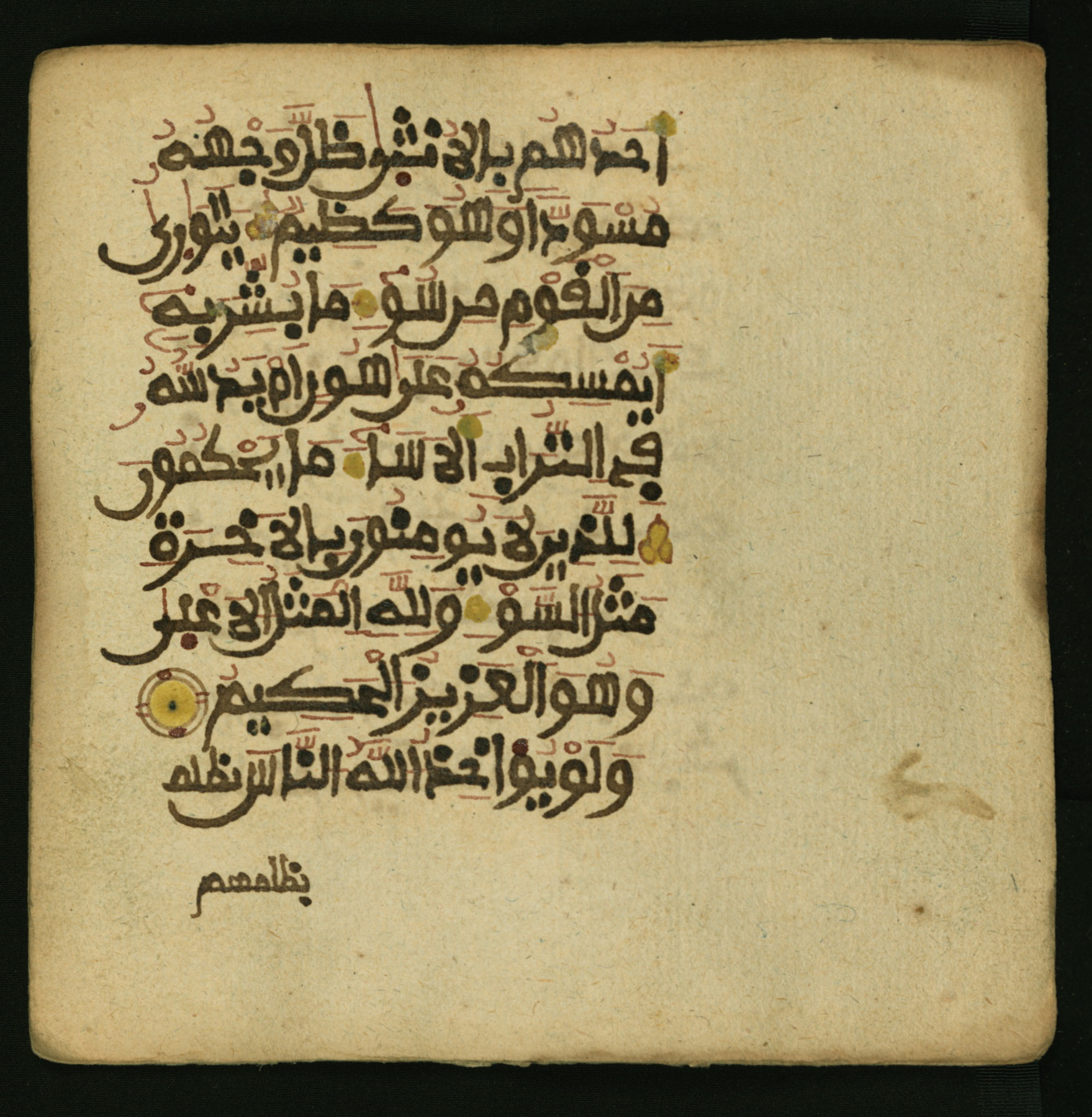 This square-format manuscript is volume 1, containing chapters 1-18 (Sūrat al-fātiḥah through Sūrat al-kahf), of an illuminated two-volume Qur'an produced in Sub-Saharan (West) Africa in the thirteenth century AH / nineteenth CE. The text is written in Sūdānī script in dark brown ink with vocalization in red on loose leaves. Chapter headings are in reddish-brown ink. Three yellow dots outlined in red arranged in a triangular form separate verses. Polychrome circular medallions as well as square and rectangular devices in a variety of patterns and colors mark textual divisions. The leaves of the text are organized between two decorated boards with geometric compositions. The pages and boards are housed in a leather pouch (satchel).
