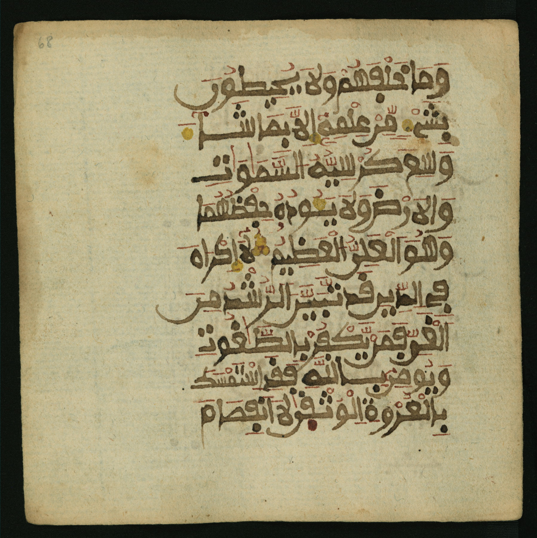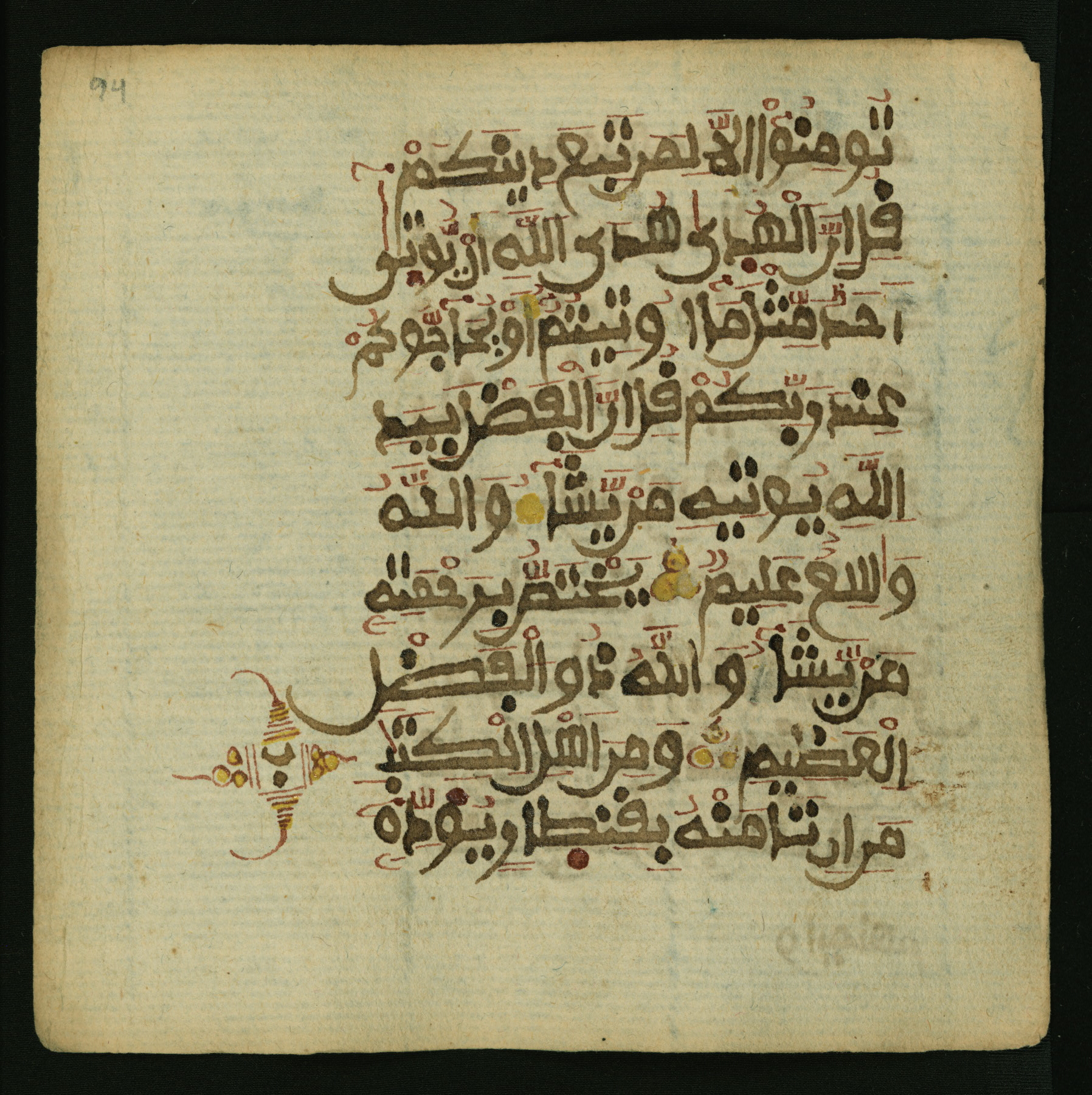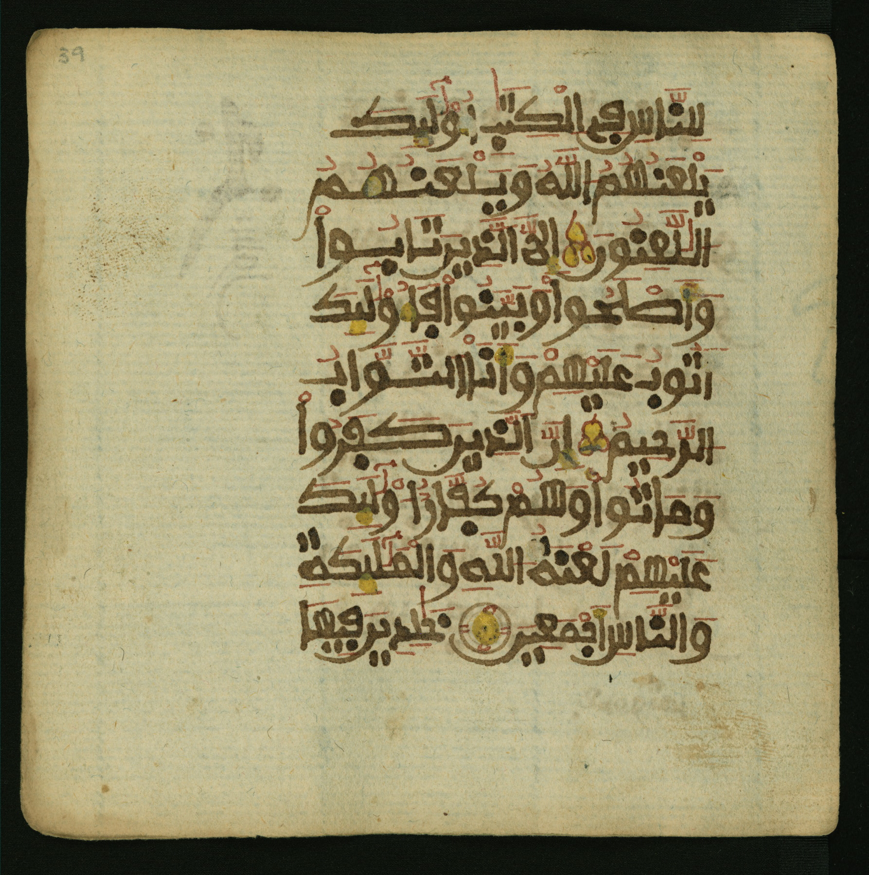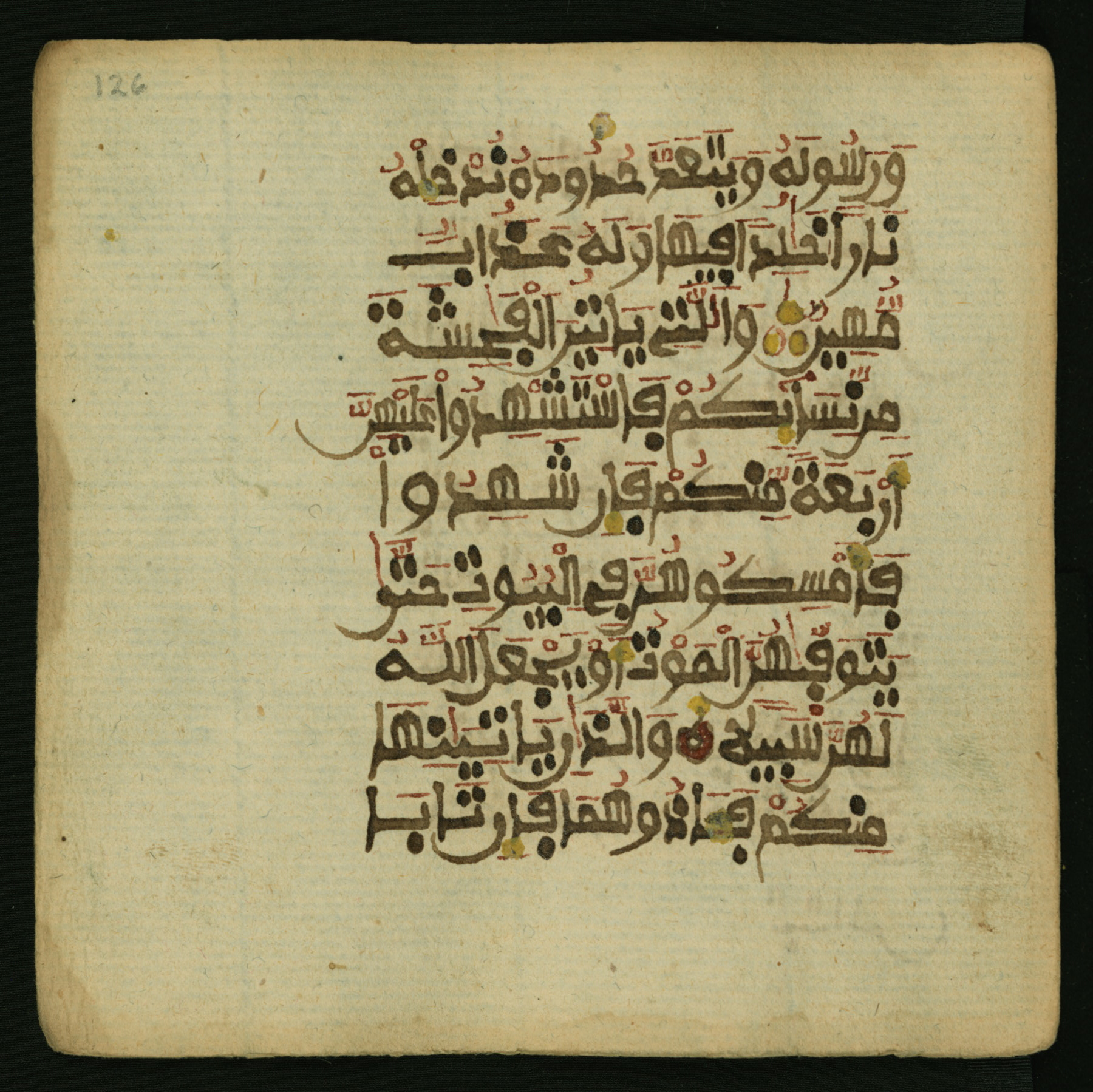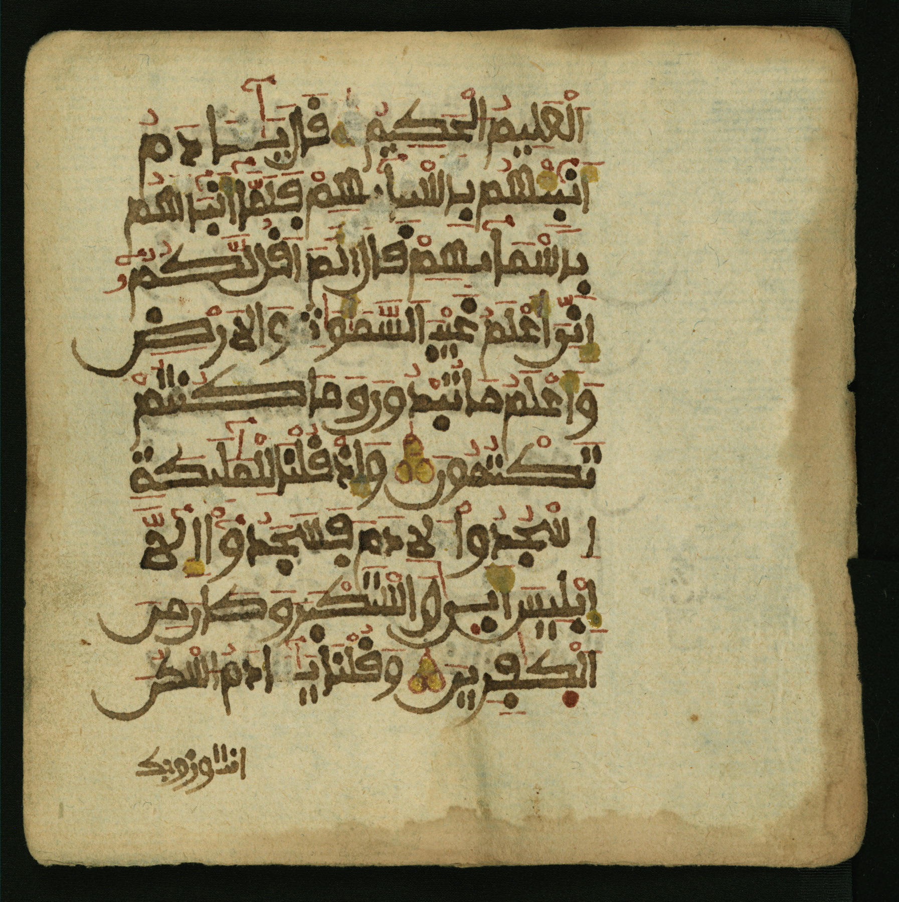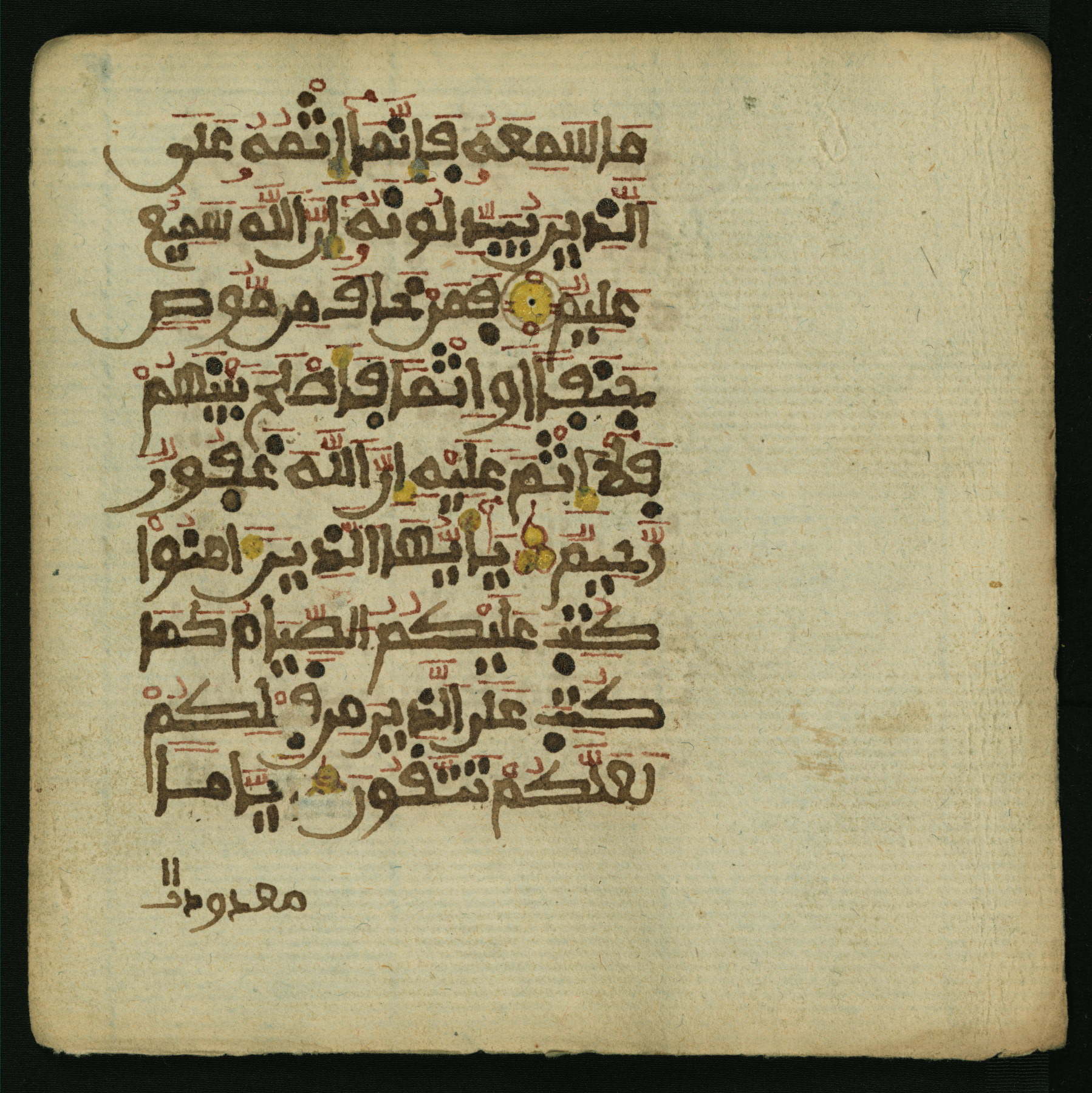 This square-format manuscript is volume 1, containing chapters 1-18 (Sūrat al-fātiḥah through Sūrat al-kahf), of an illuminated two-volume Qur'an produced in Sub-Saharan (West) Africa in the thirteenth century AH / nineteenth CE. The text is written in Sūdānī script in dark brown ink with vocalization in red on loose leaves. Chapter headings are in reddish-brown ink. Three yellow dots outlined in red arranged in a triangular form separate verses. Polychrome circular medallions as well as square and rectangular devices in a variety of patterns and colors mark textual divisions. The leaves of the text are organized between two decorated boards with geometric compositions. The pages and boards are housed in a leather pouch (satchel).