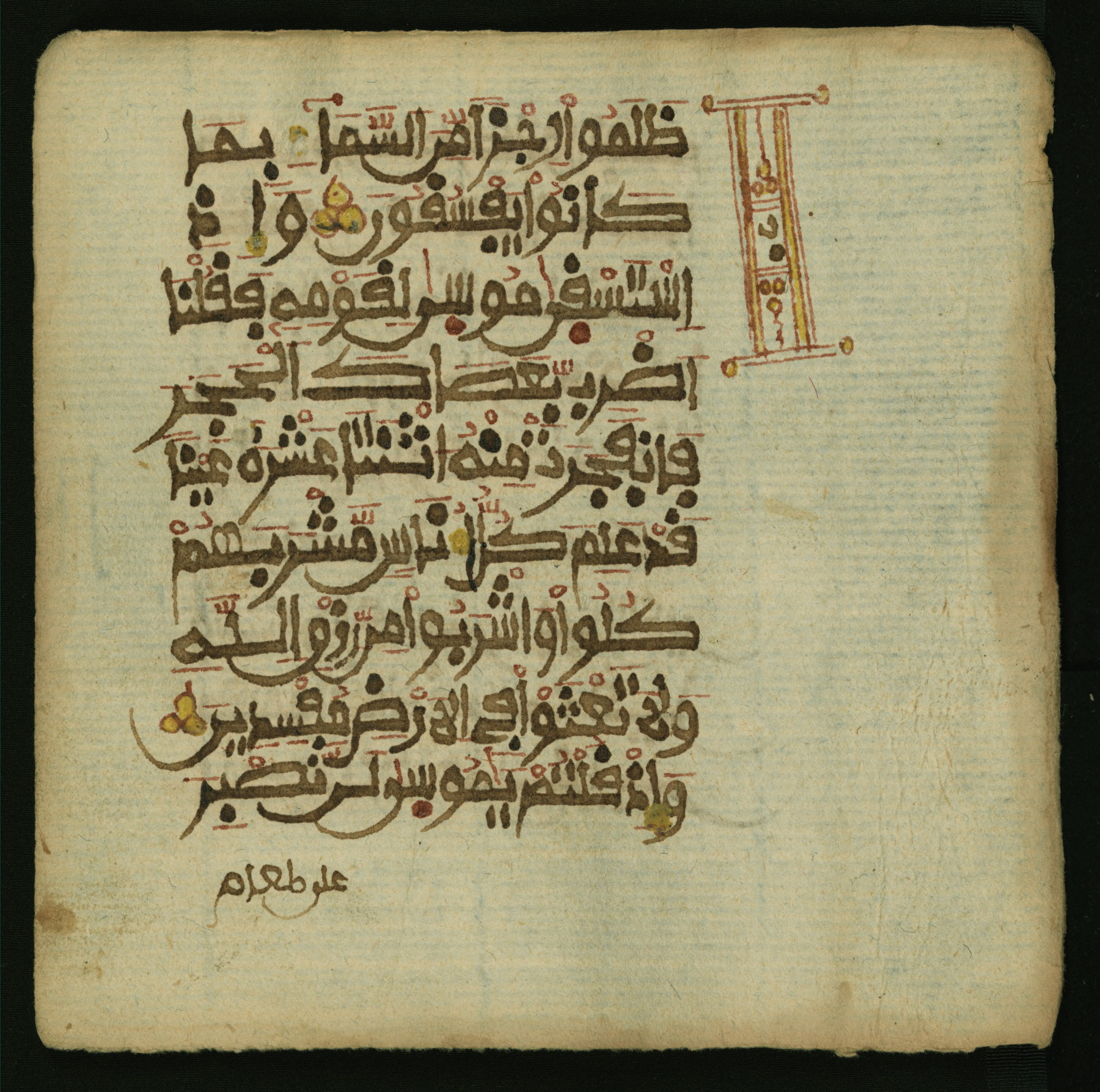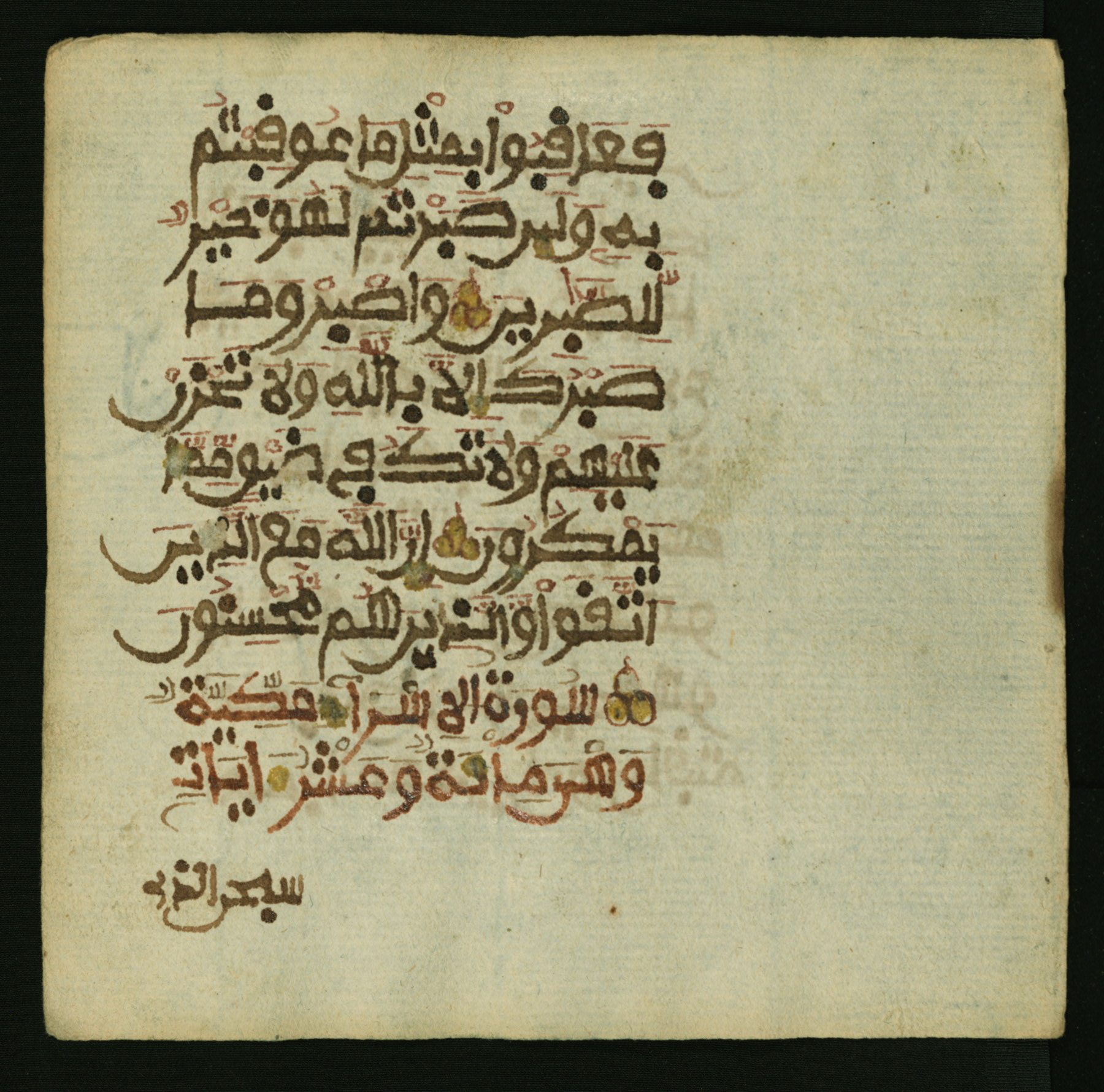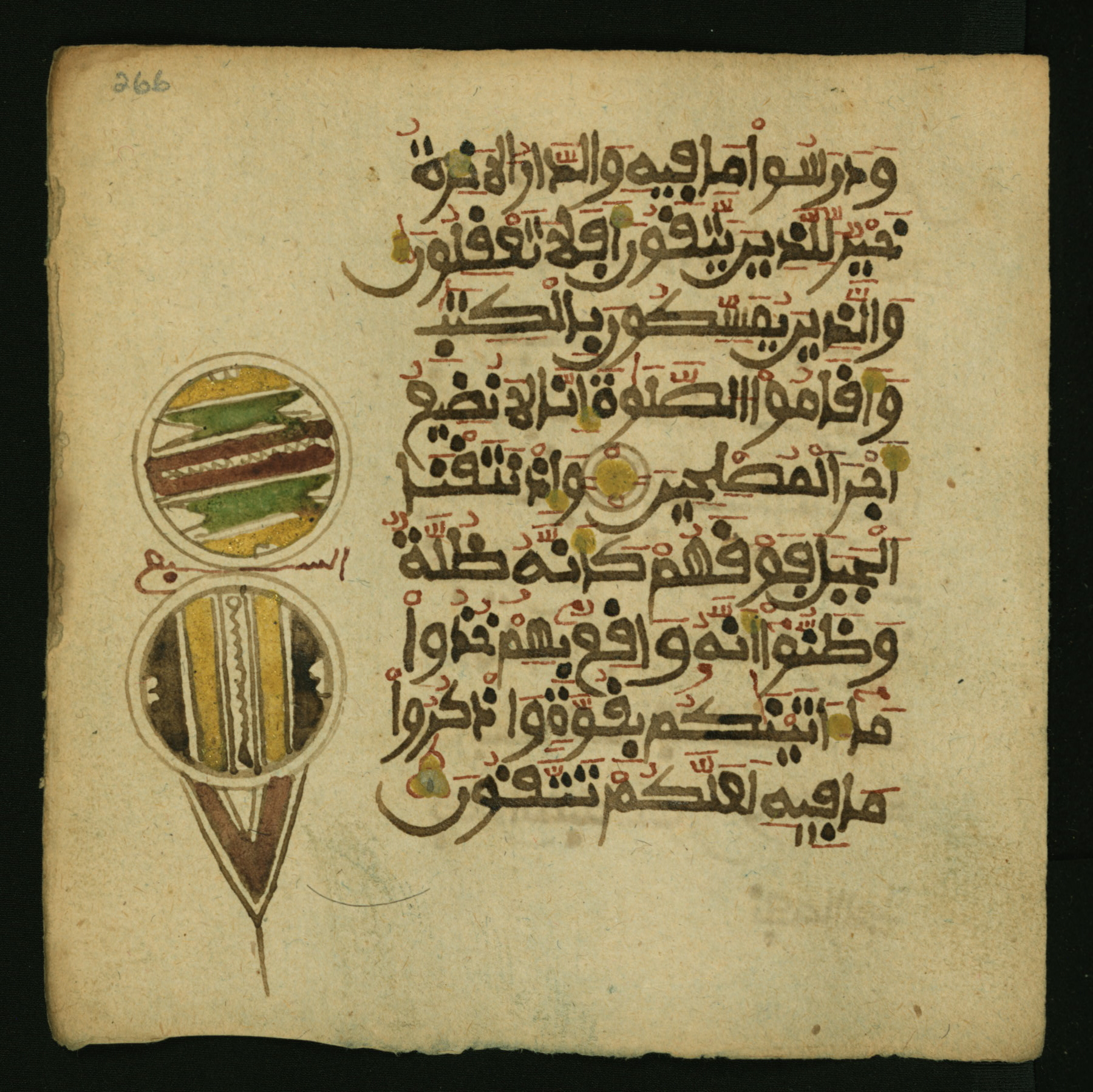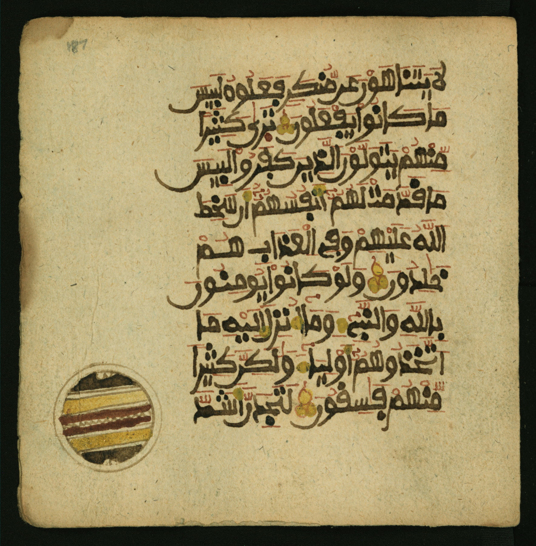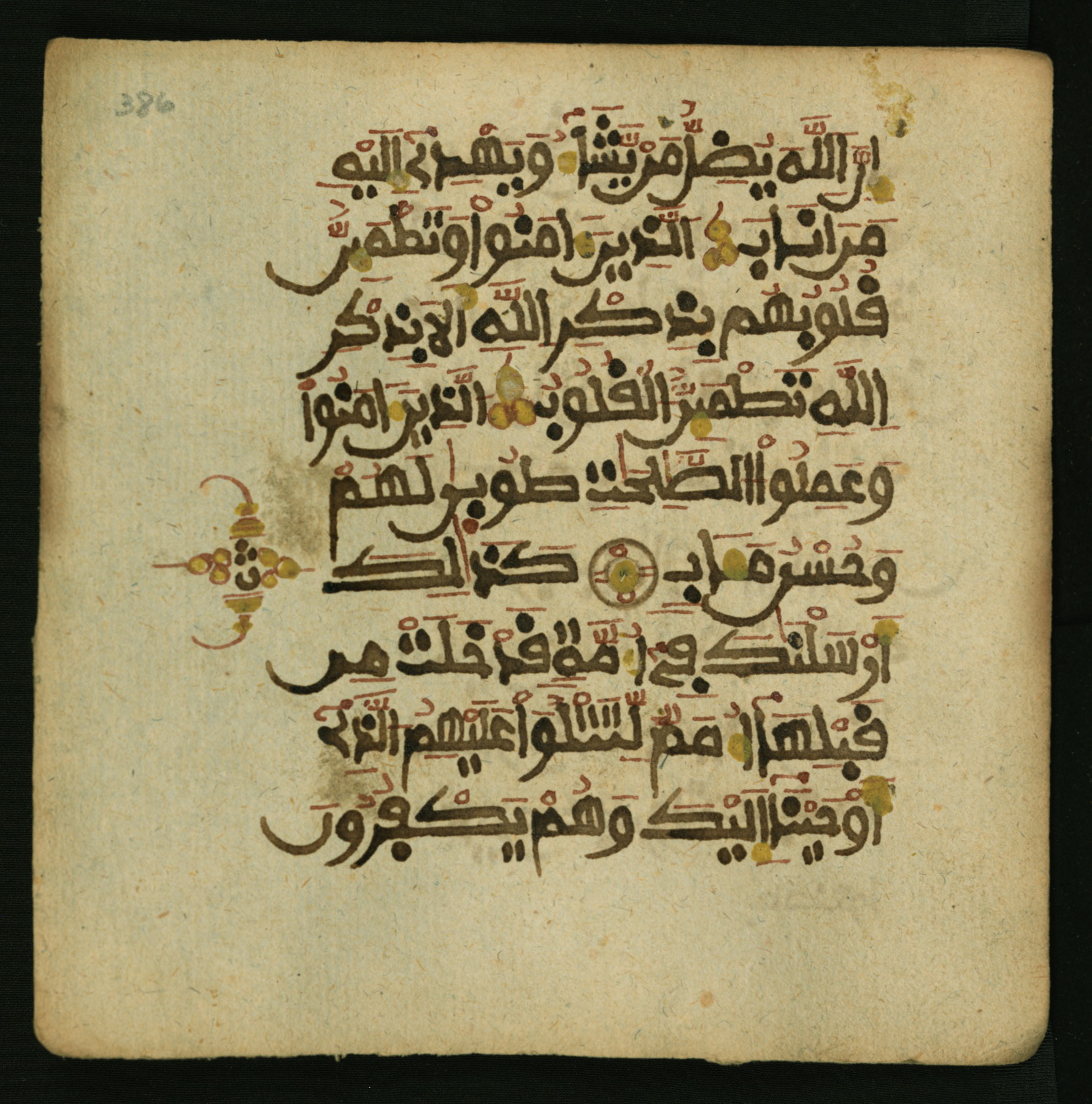 This square-format manuscript is volume 1, containing chapters 1-18 (Sūrat al-fātiḥah through Sūrat al-kahf), of an illuminated two-volume Qur'an produced in Sub-Saharan (West) Africa in the thirteenth century AH / nineteenth CE. The text is written in Sūdānī script in dark brown ink with vocalization in red on loose leaves. Chapter headings are in reddish-brown ink. Three yellow dots outlined in red arranged in a triangular form separate verses. Polychrome circular medallions as well as square and rectangular devices in a variety of patterns and colors mark textual divisions. The leaves of the text are organized between two decorated boards with geometric compositions. The pages and boards are housed in a leather pouch (satchel).
