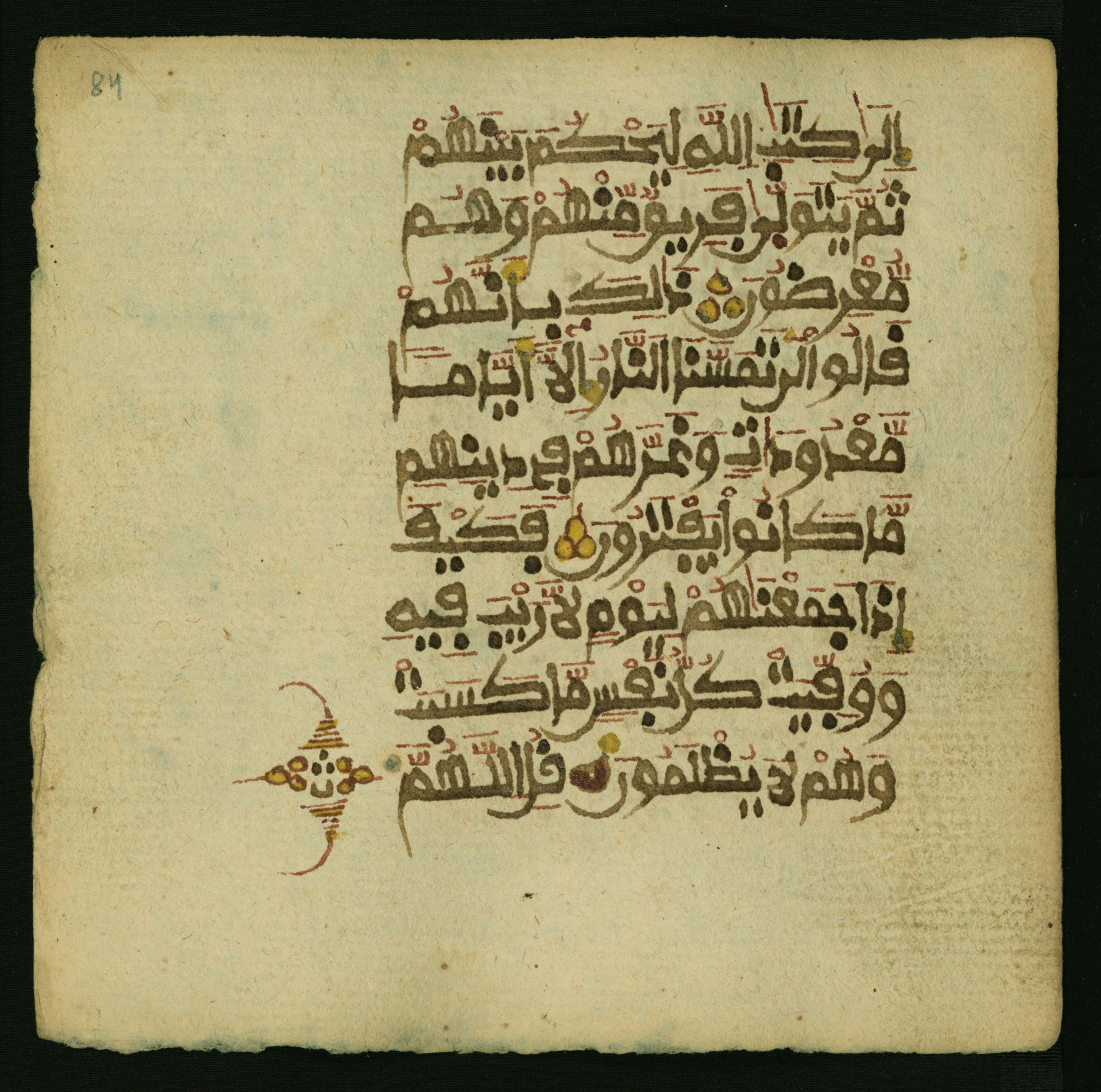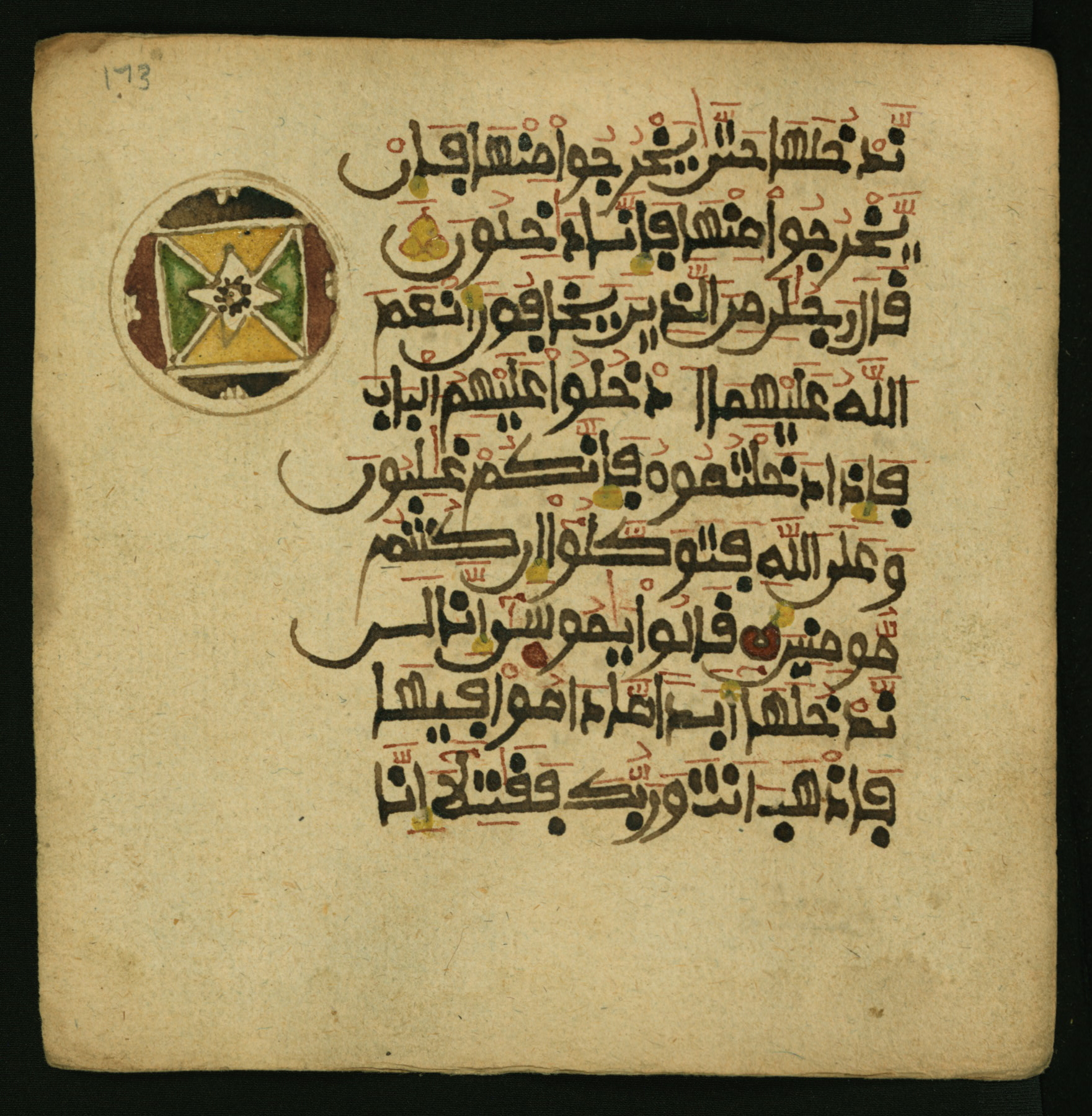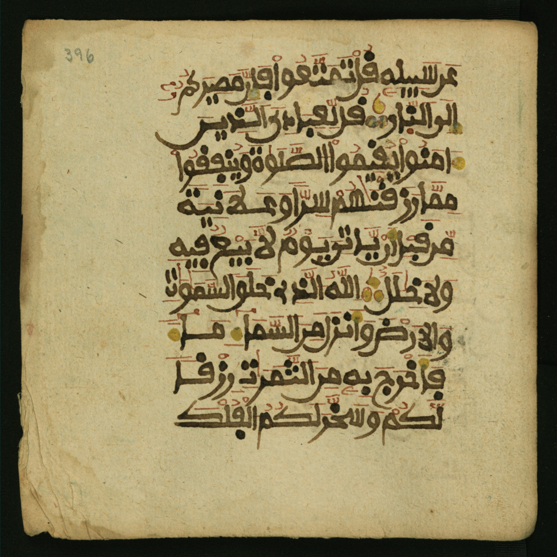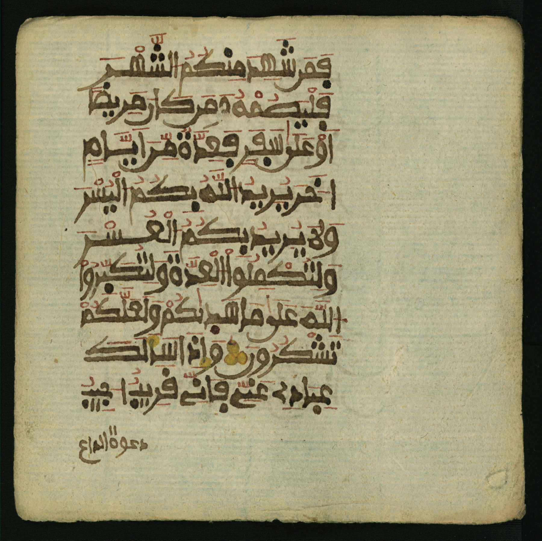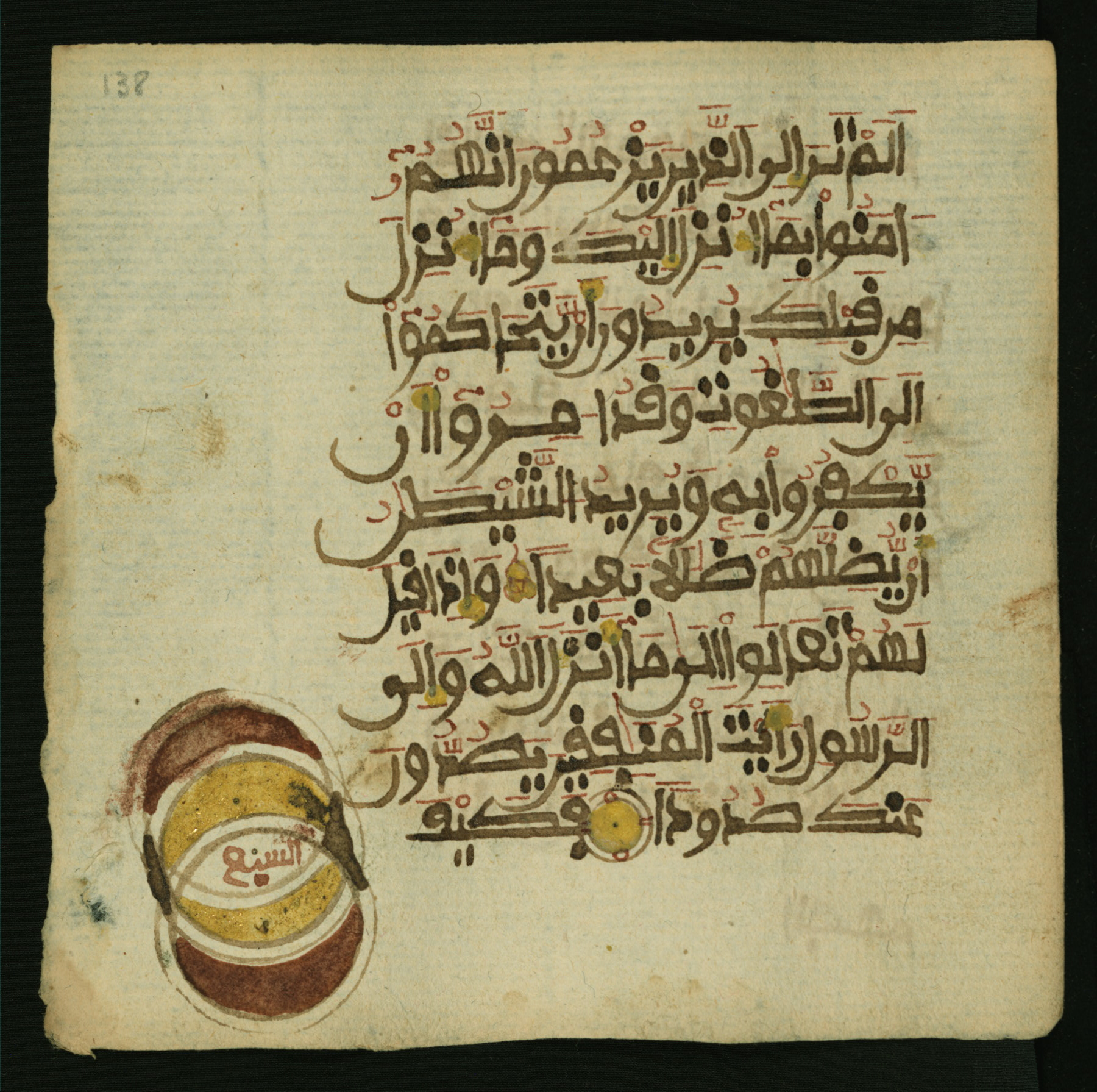 This square-format manuscript is volume 1, containing chapters 1-18 (Sūrat al-fātiḥah through Sūrat al-kahf), of an illuminated two-volume Qur'an produced in Sub-Saharan (West) Africa in the thirteenth century AH / nineteenth CE. The text is written in Sūdānī script in dark brown ink with vocalization in red on loose leaves. Chapter headings are in reddish-brown ink. Three yellow dots outlined in red arranged in a triangular form separate verses. Polychrome circular medallions as well as square and rectangular devices in a variety of patterns and colors mark textual divisions. The leaves of the text are organized between two decorated boards with geometric compositions. The pages and boards are housed in a leather pouch (satchel).