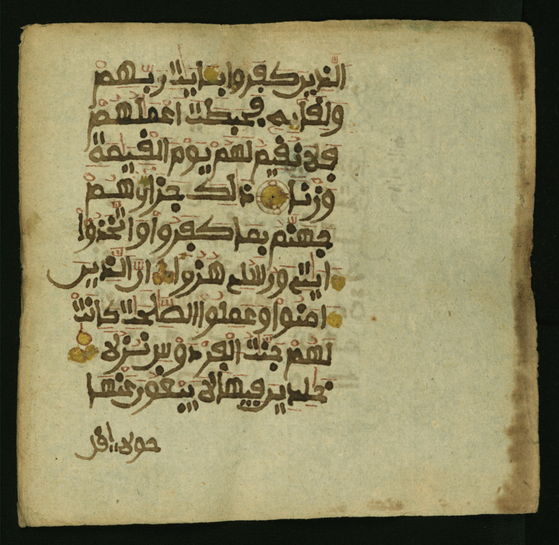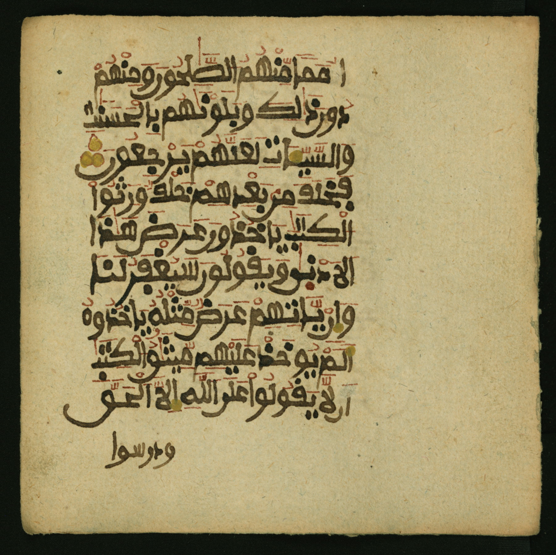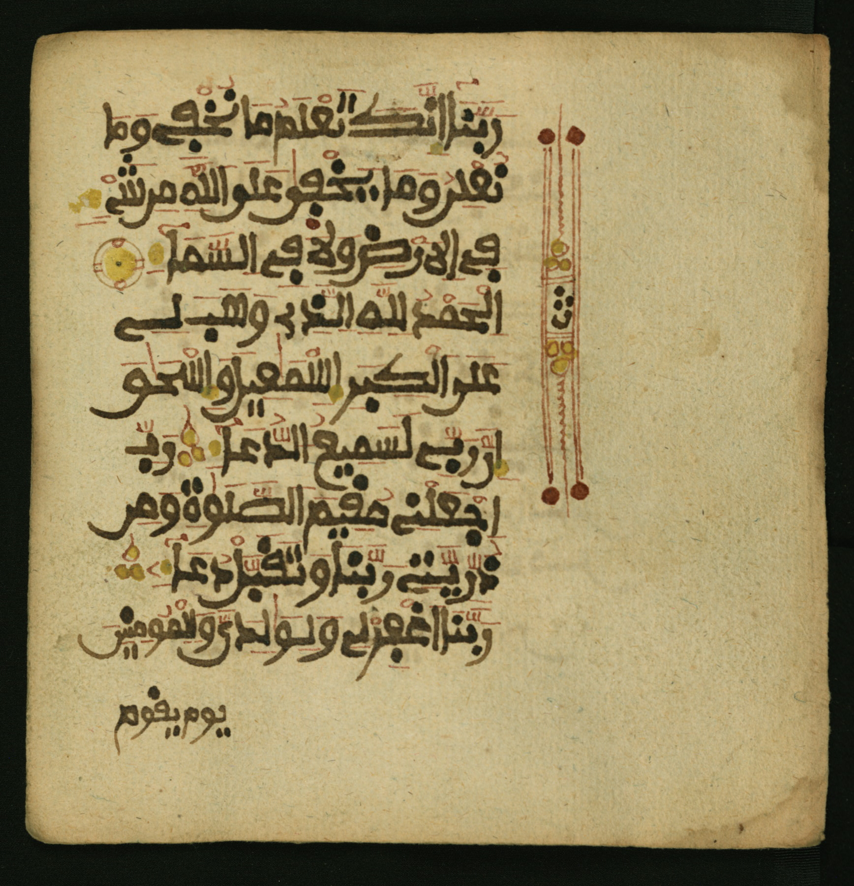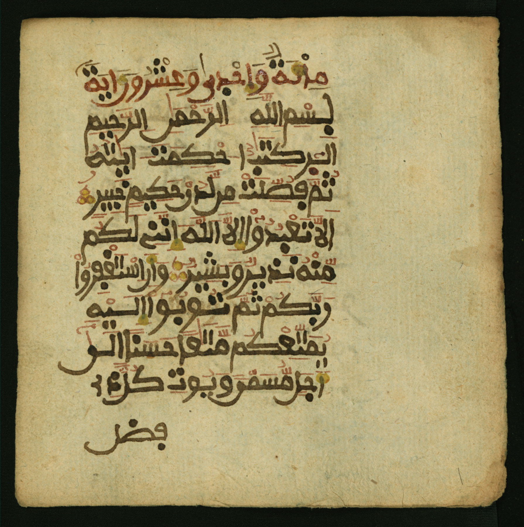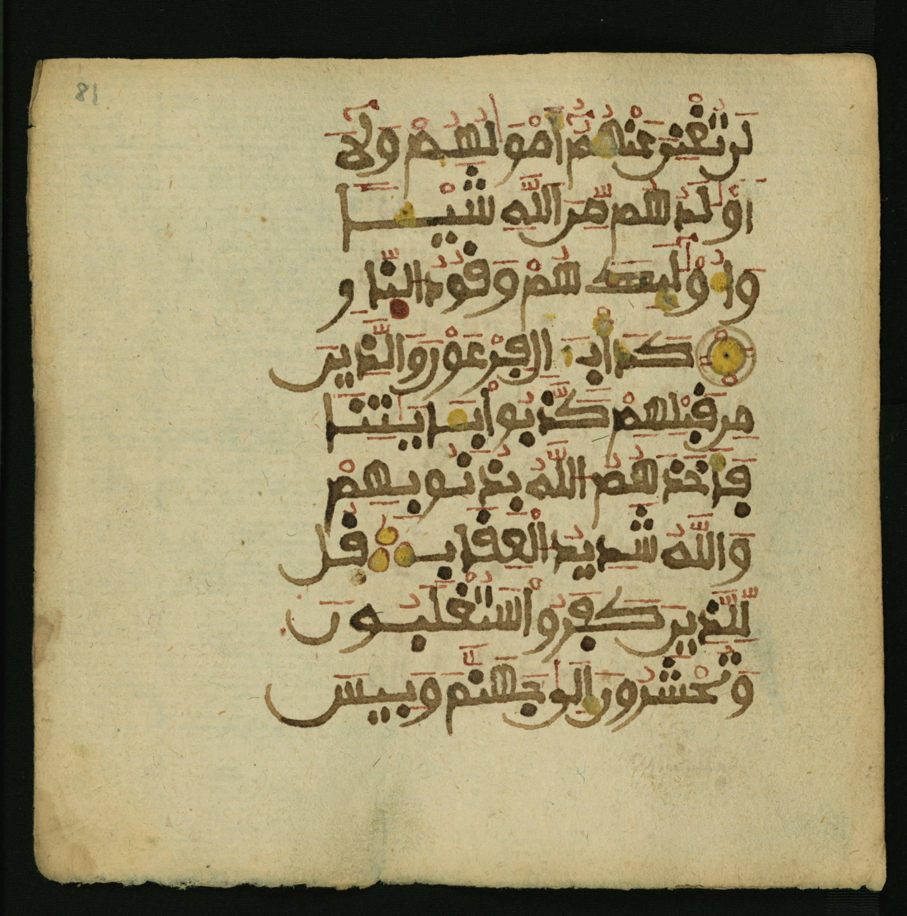 This square-format manuscript is volume 1, containing chapters 1-18 (Sūrat al-fātiḥah through Sūrat al-kahf), of an illuminated two-volume Qur'an produced in Sub-Saharan (West) Africa in the thirteenth century AH / nineteenth CE. The text is written in Sūdānī script in dark brown ink with vocalization in red on loose leaves. Chapter headings are in reddish-brown ink. Three yellow dots outlined in red arranged in a triangular form separate verses. Polychrome circular medallions as well as square and rectangular devices in a variety of patterns and colors mark textual divisions. The leaves of the text are organized between two decorated boards with geometric compositions. The pages and boards are housed in a leather pouch (satchel).