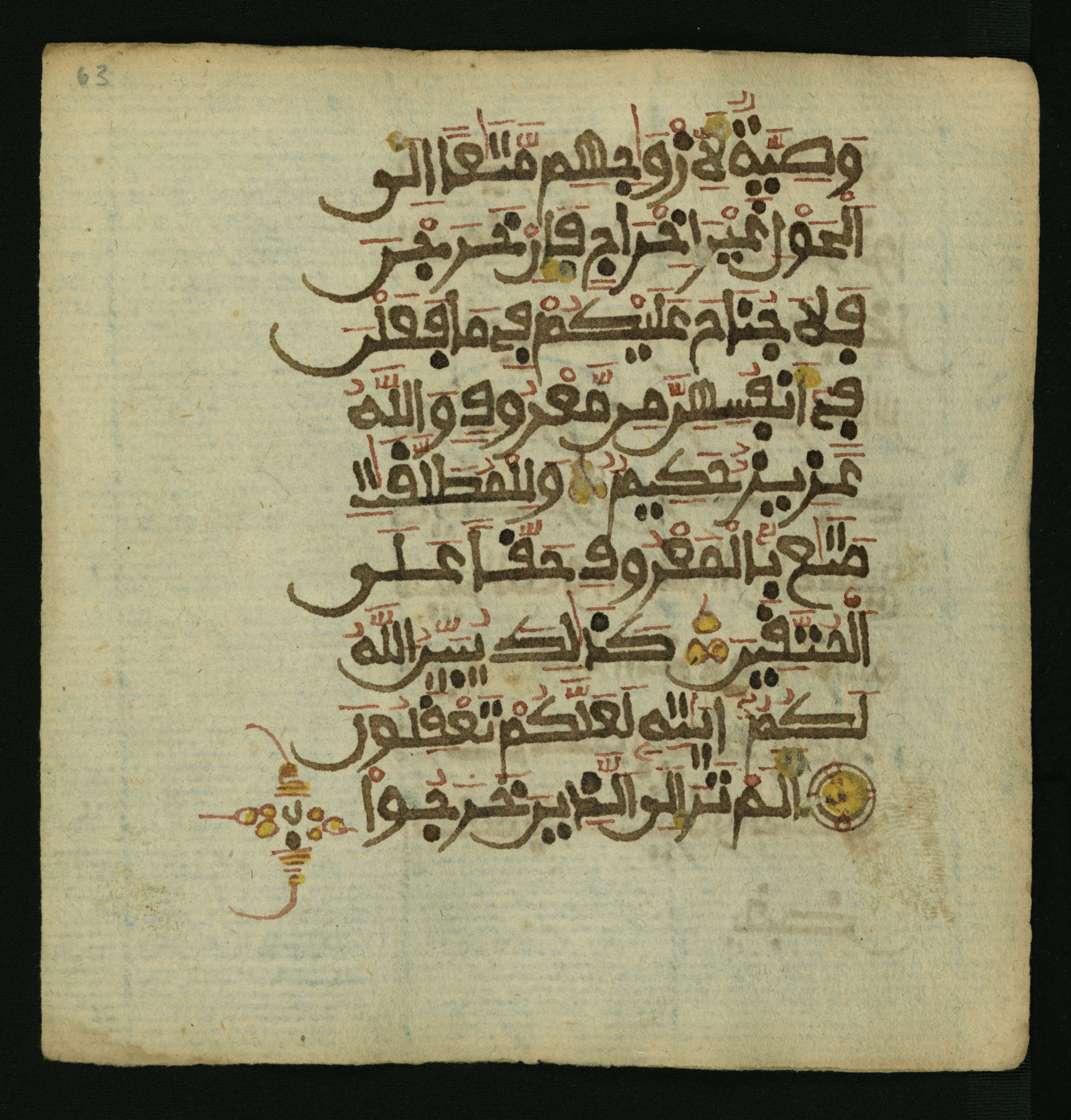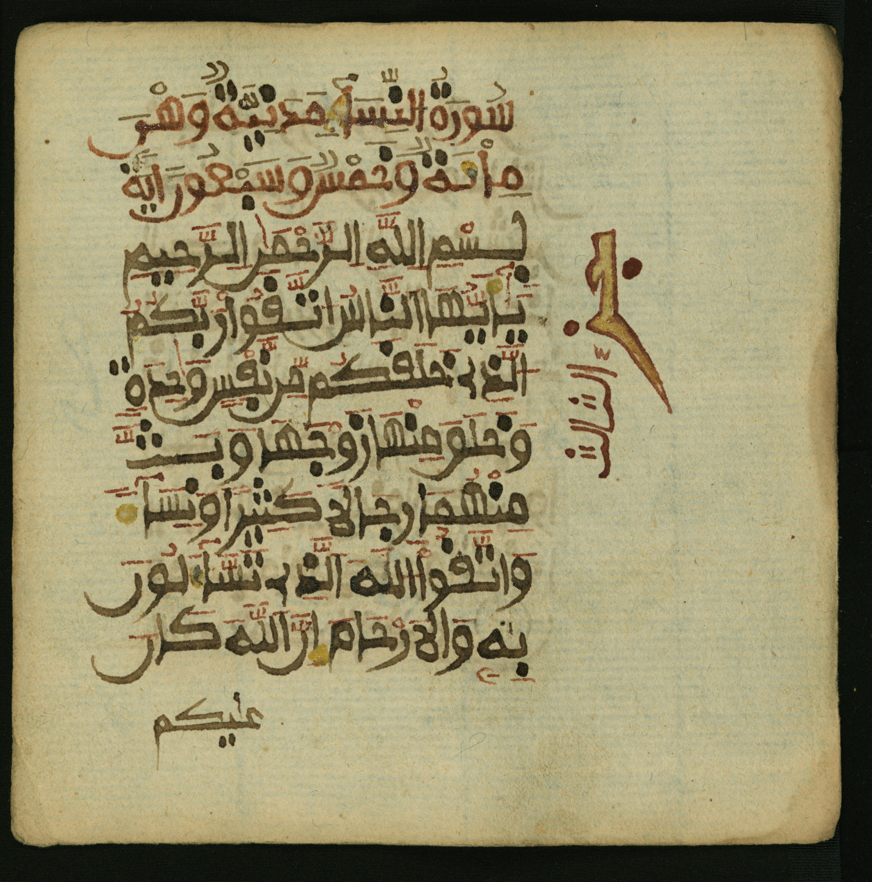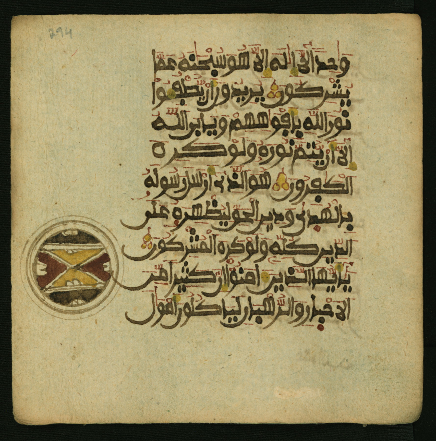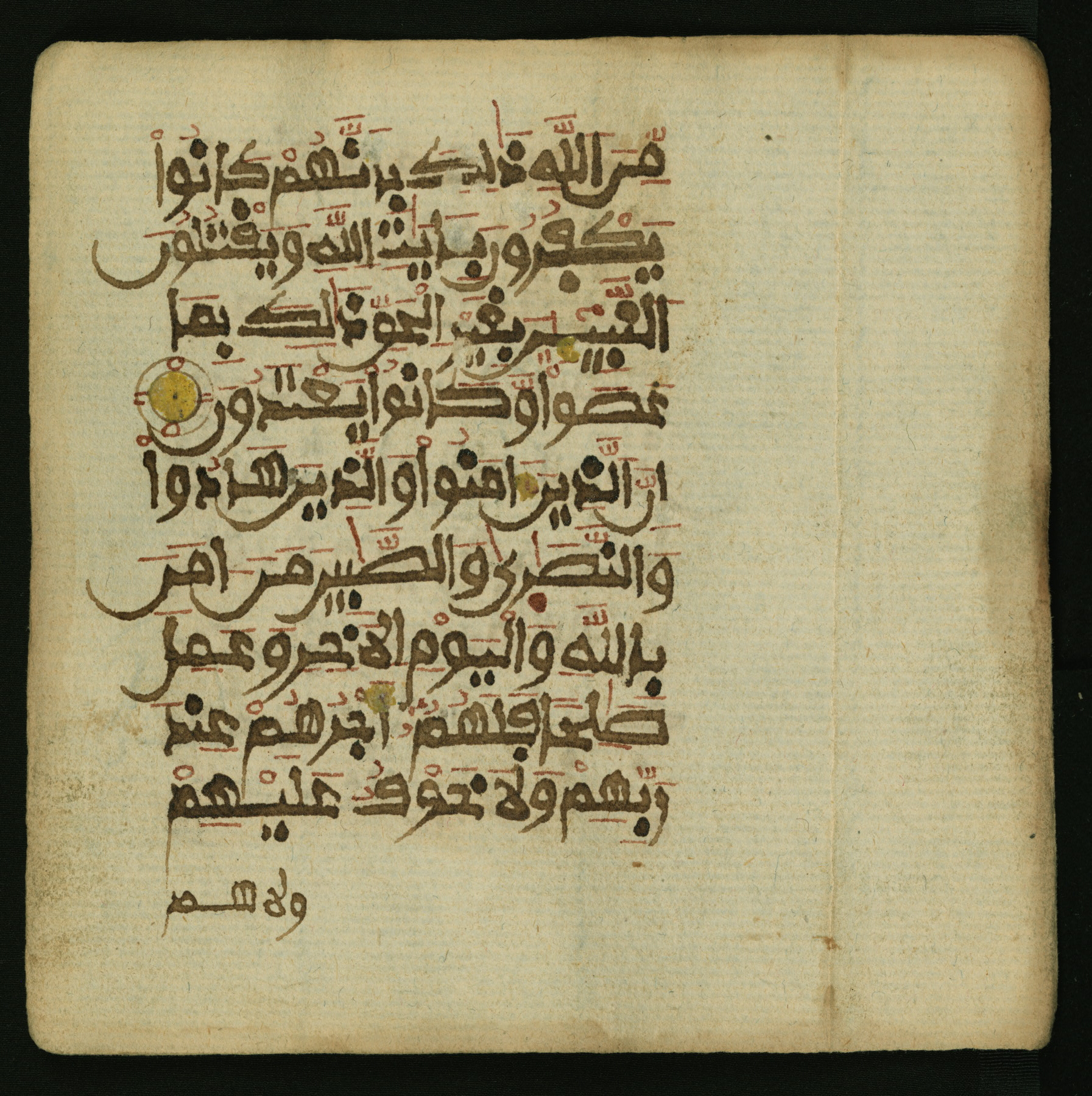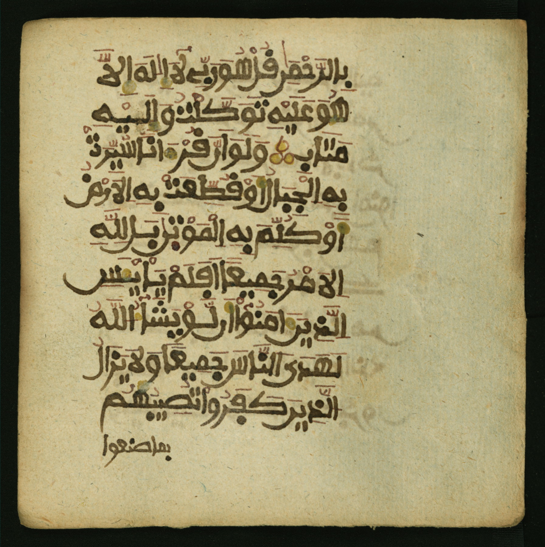 This square-format manuscript is volume 1, containing chapters 1-18 (Sūrat al-fātiḥah through Sūrat al-kahf), of an illuminated two-volume Qur'an produced in Sub-Saharan (West) Africa in the thirteenth century AH / nineteenth CE. The text is written in Sūdānī script in dark brown ink with vocalization in red on loose leaves. Chapter headings are in reddish-brown ink. Three yellow dots outlined in red arranged in a triangular form separate verses. Polychrome circular medallions as well as square and rectangular devices in a variety of patterns and colors mark textual divisions. The leaves of the text are organized between two decorated boards with geometric compositions. The pages and boards are housed in a leather pouch (satchel).