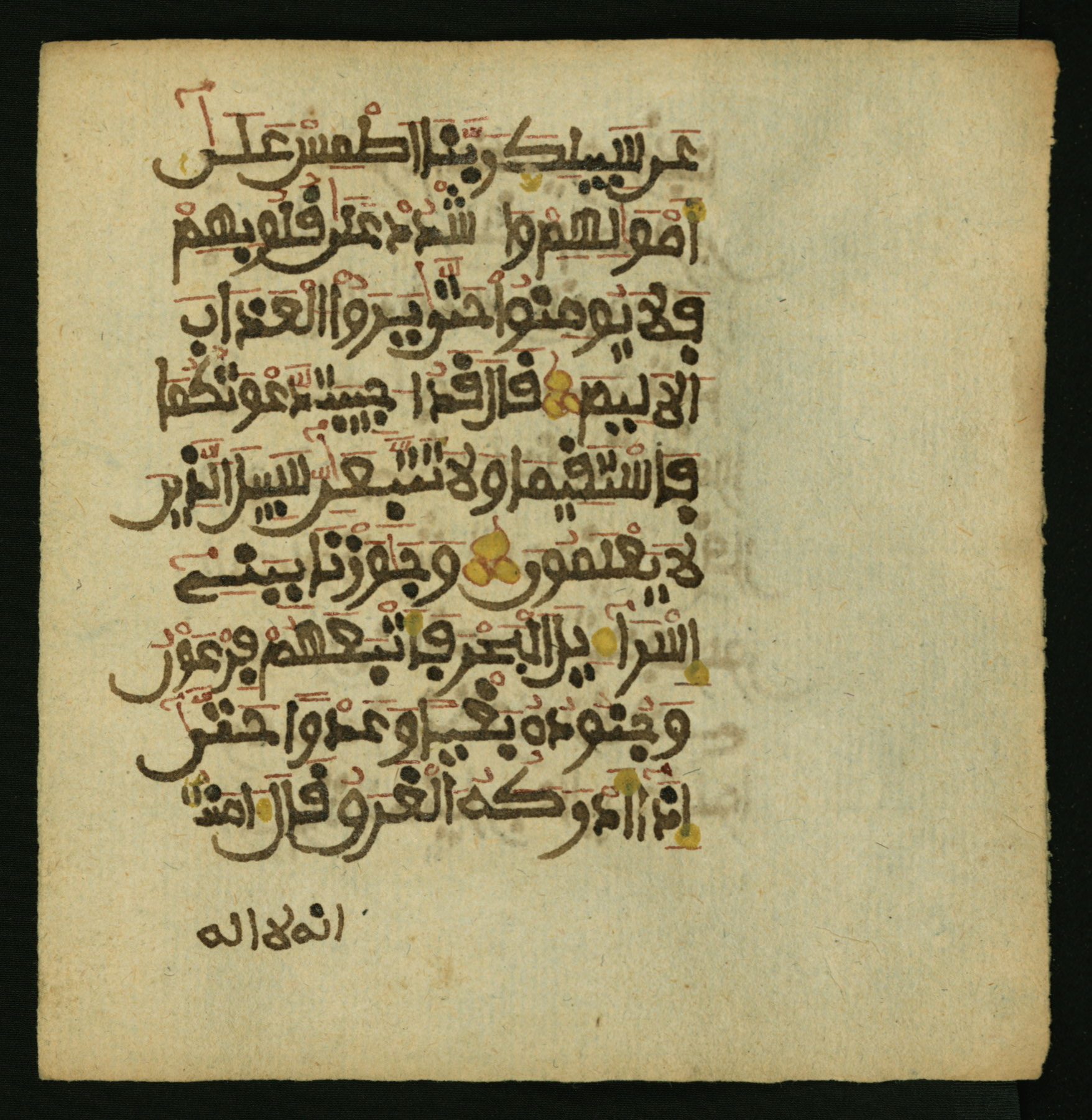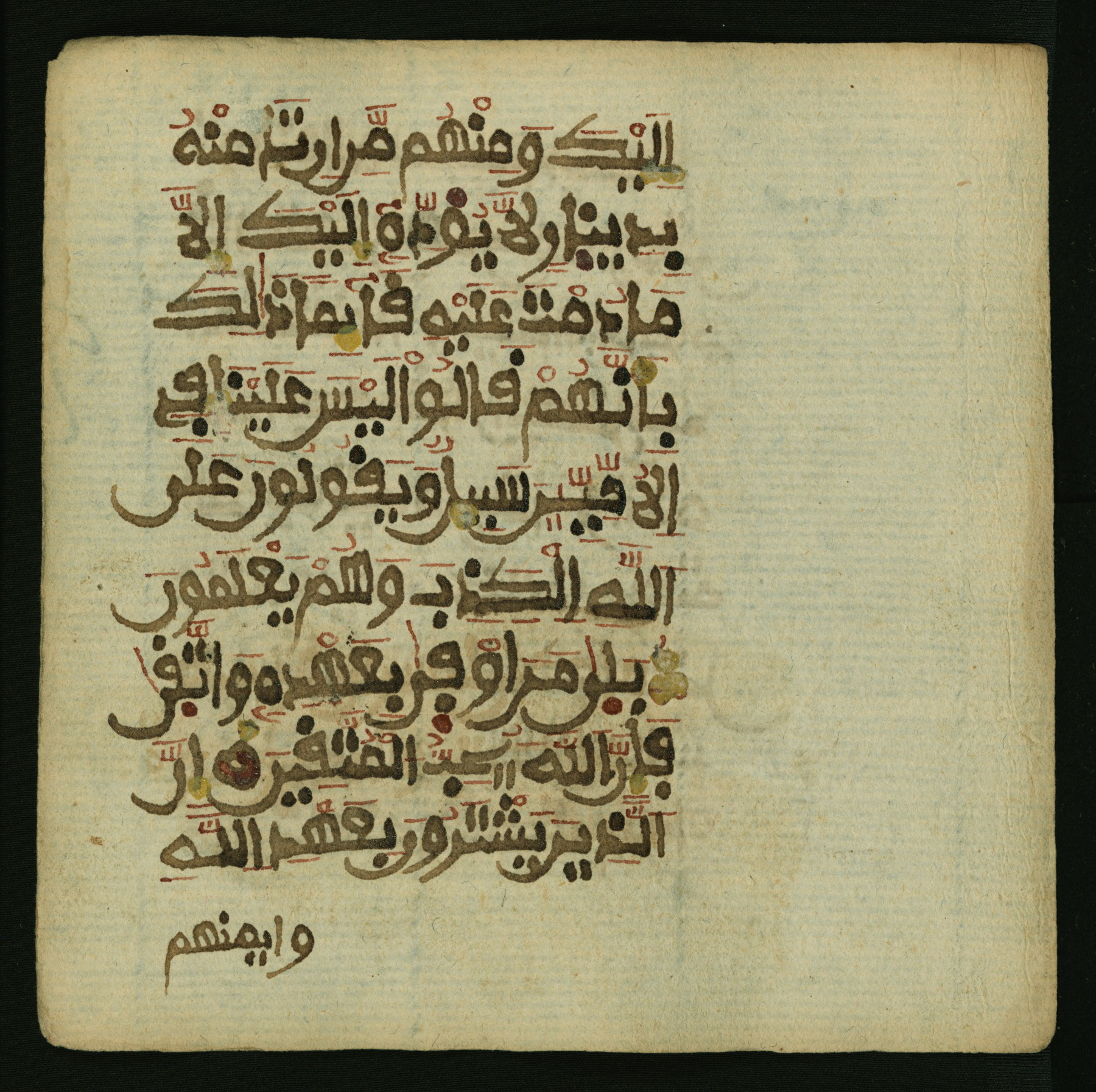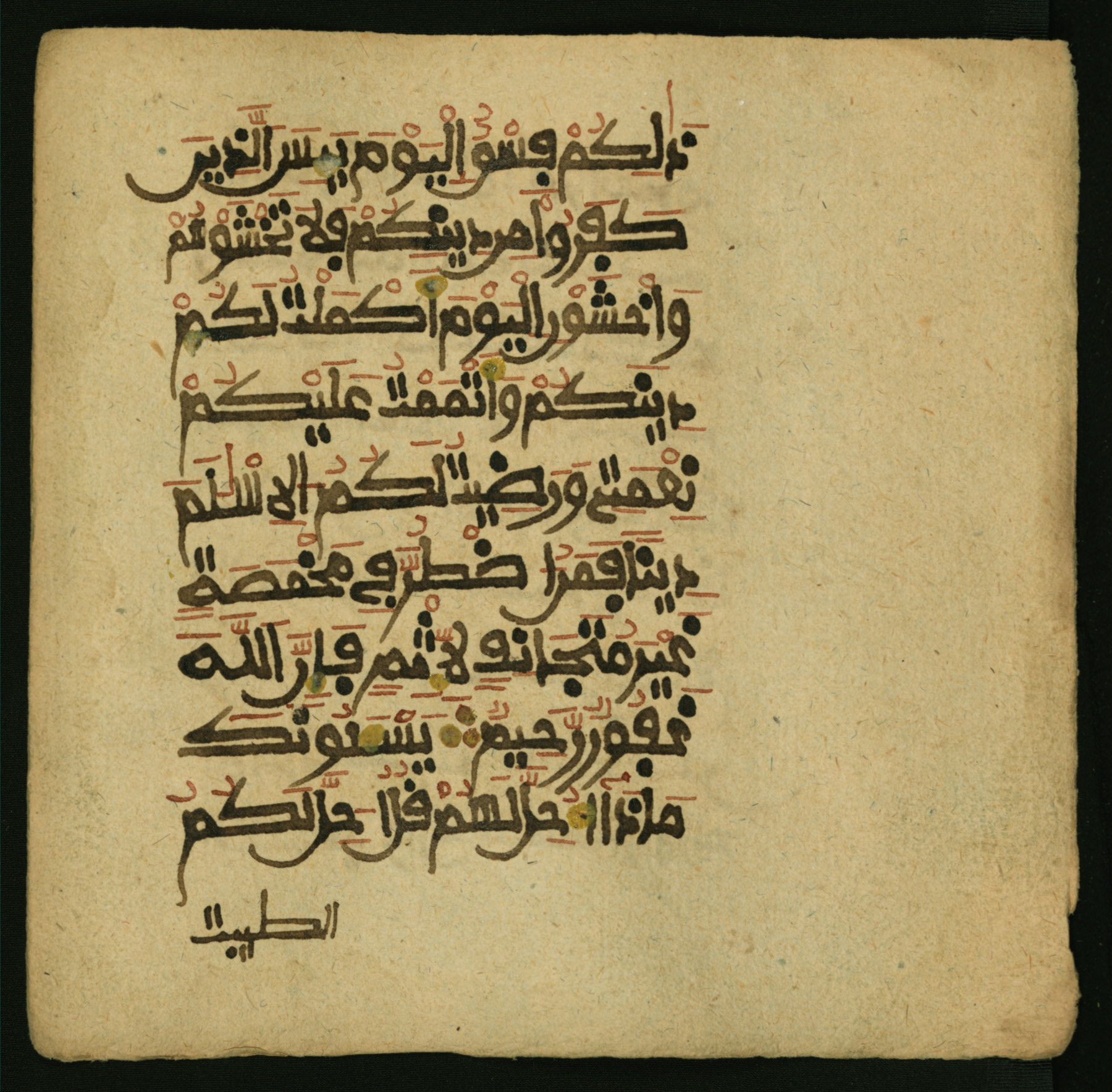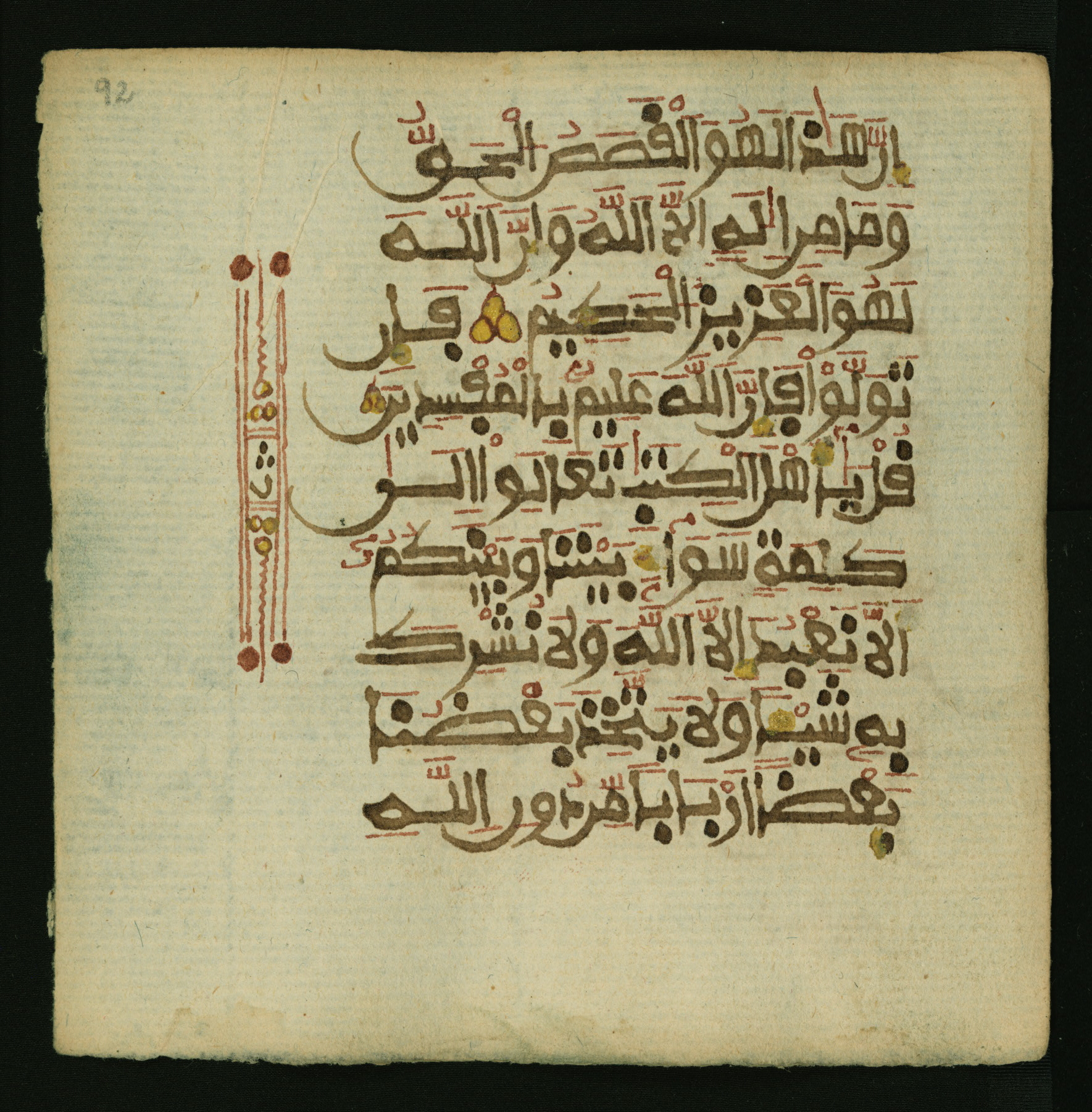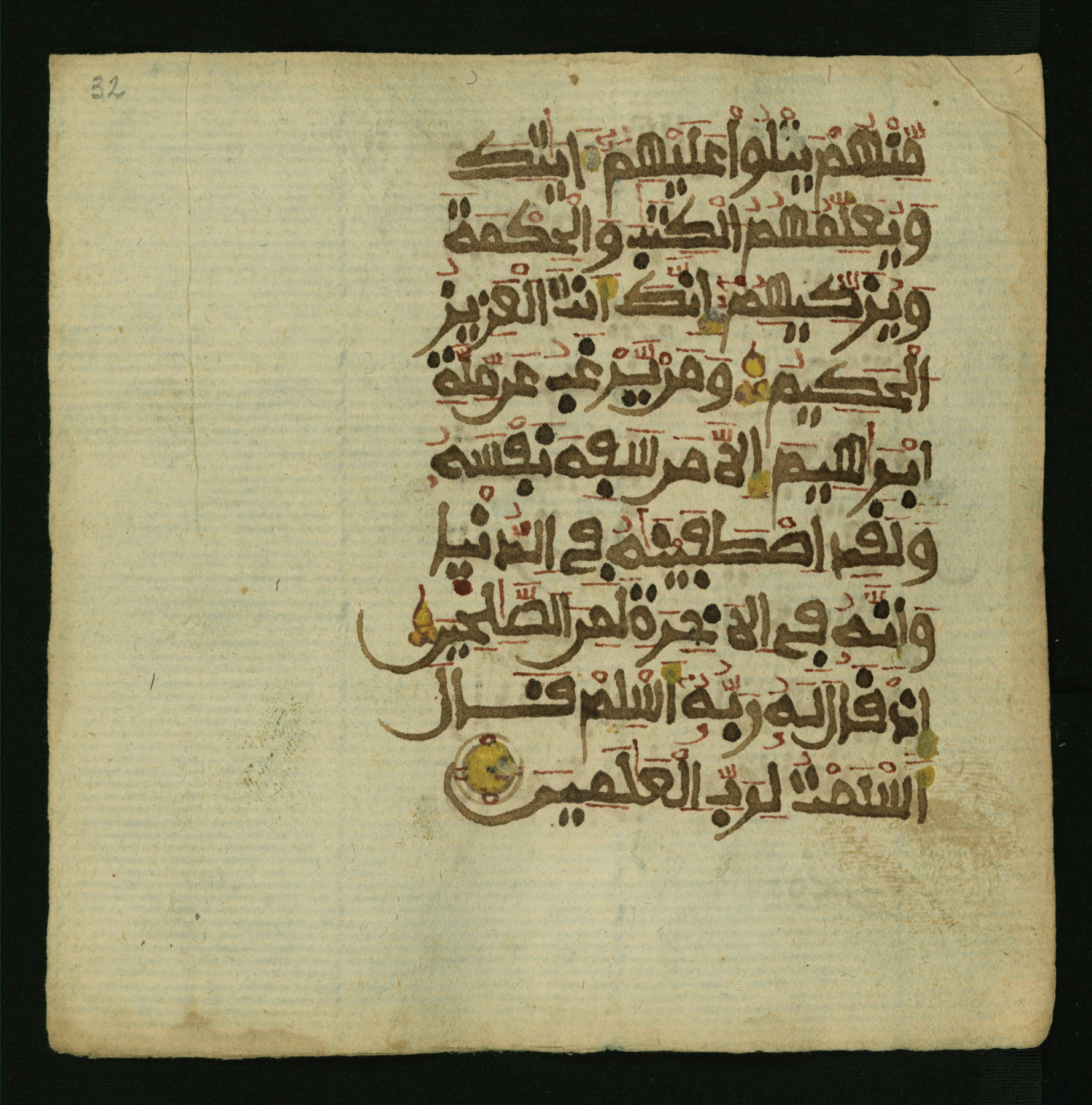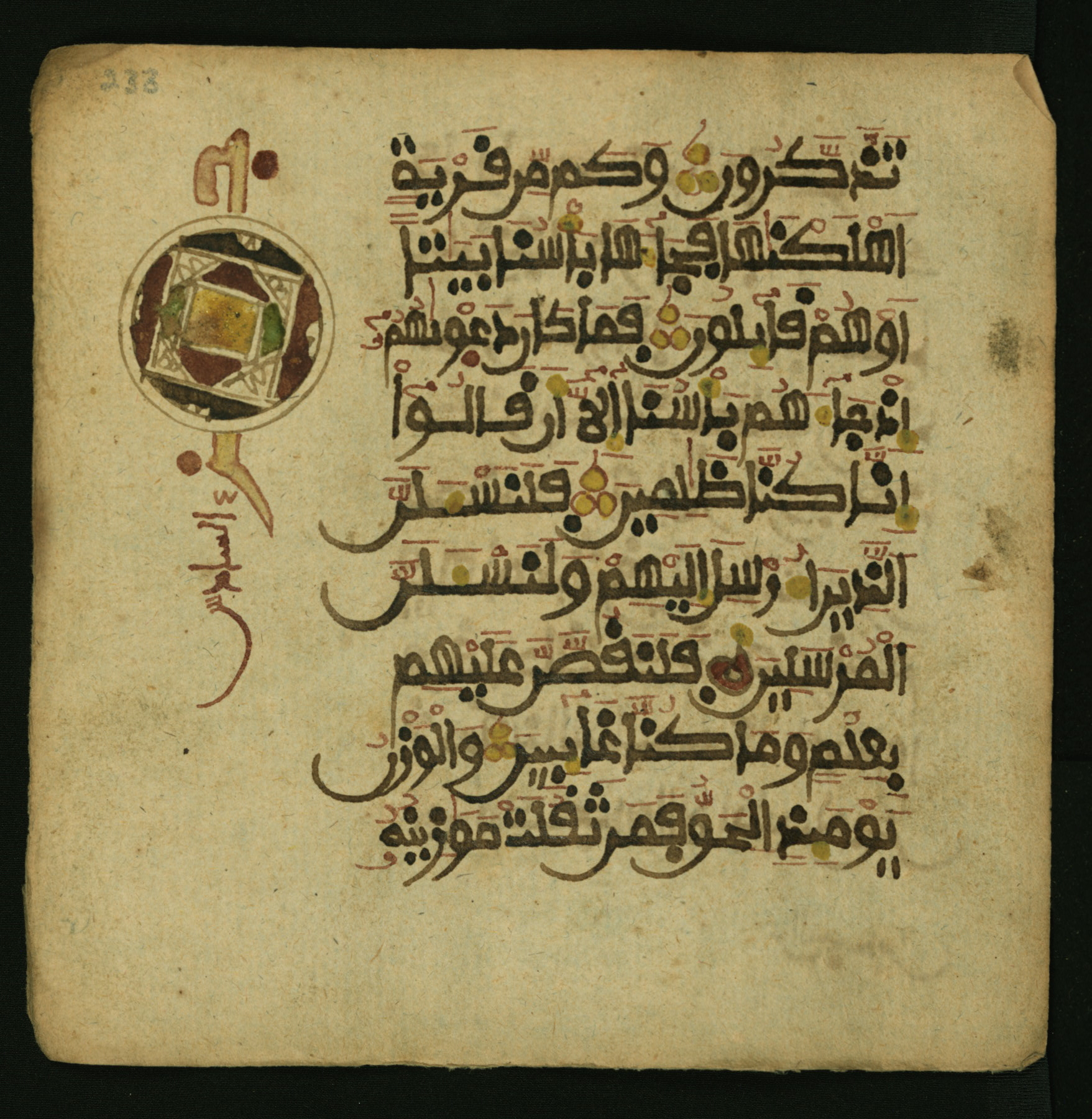 This square-format manuscript is volume 1, containing chapters 1-18 (Sūrat al-fātiḥah through Sūrat al-kahf), of an illuminated two-volume Qur'an produced in Sub-Saharan (West) Africa in the thirteenth century AH / nineteenth CE. The text is written in Sūdānī script in dark brown ink with vocalization in red on loose leaves. Chapter headings are in reddish-brown ink. Three yellow dots outlined in red arranged in a triangular form separate verses. Polychrome circular medallions as well as square and rectangular devices in a variety of patterns and colors mark textual divisions. The leaves of the text are organized between two decorated boards with geometric compositions. The pages and boards are housed in a leather pouch (satchel).