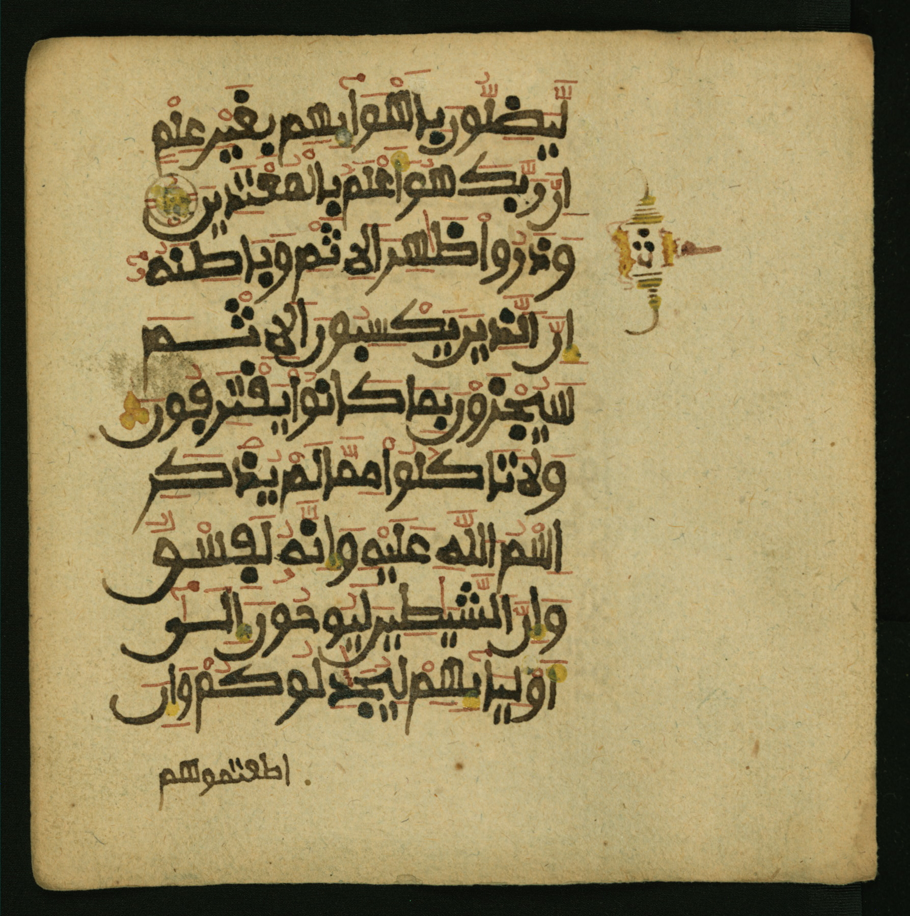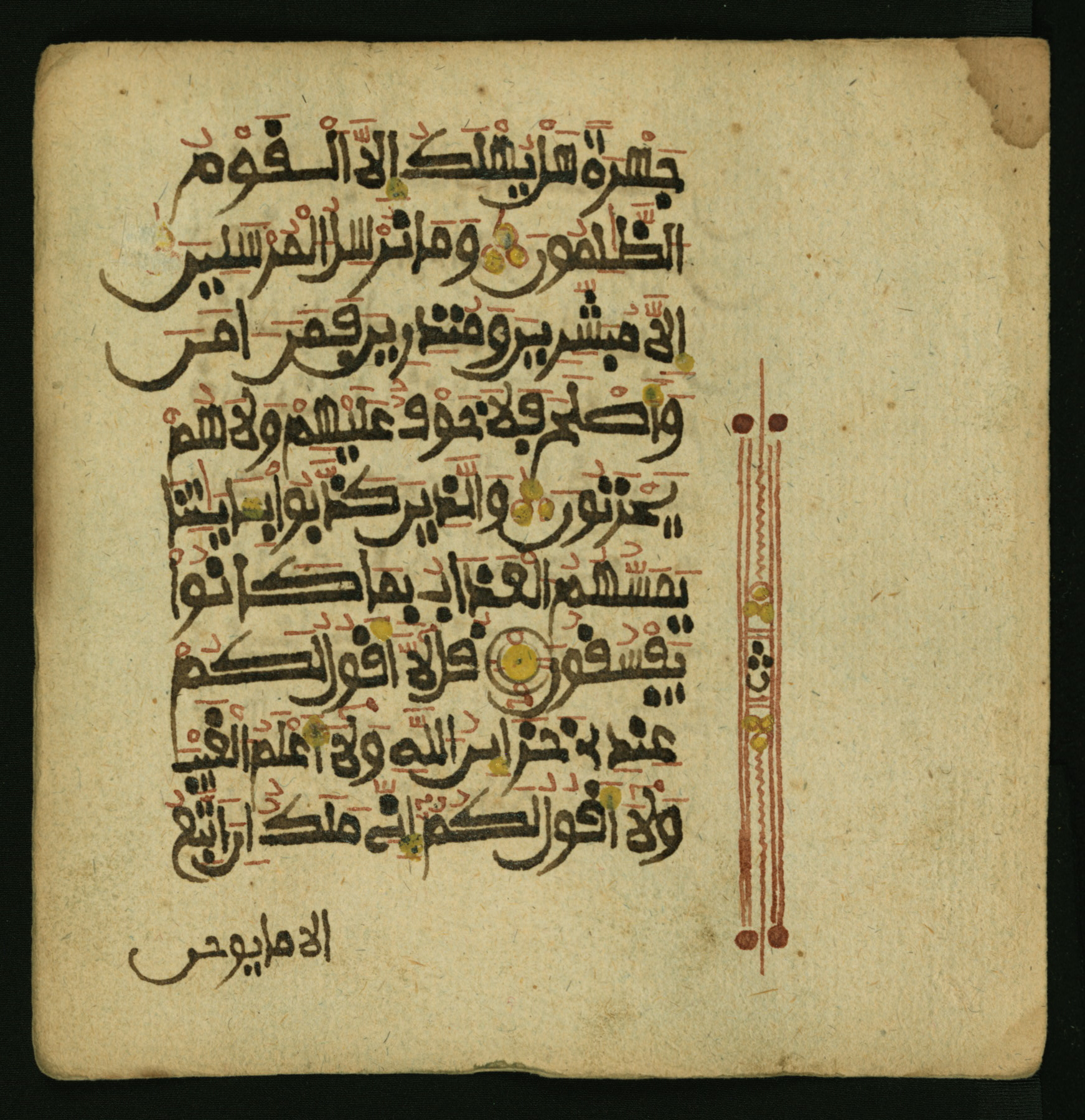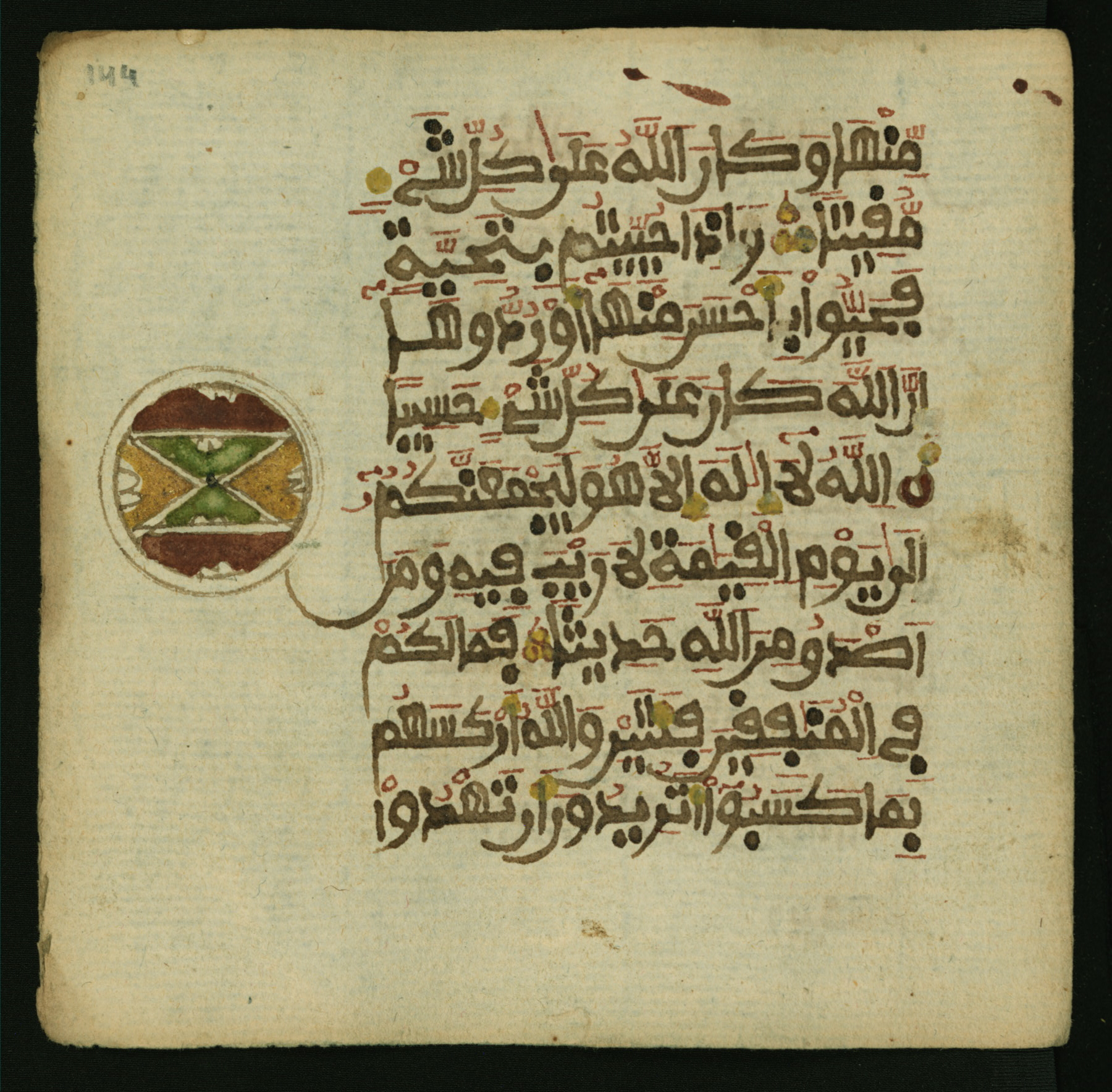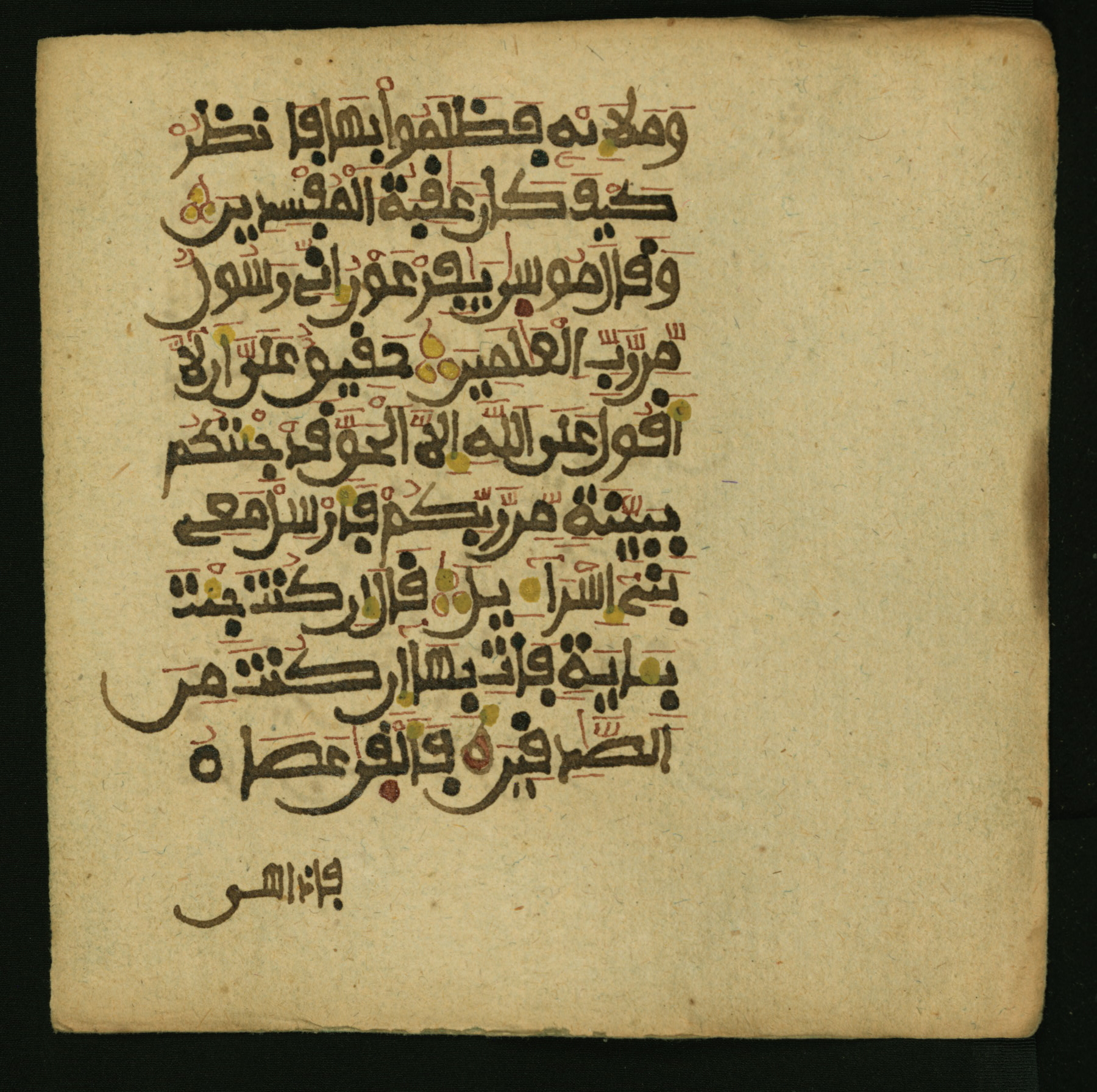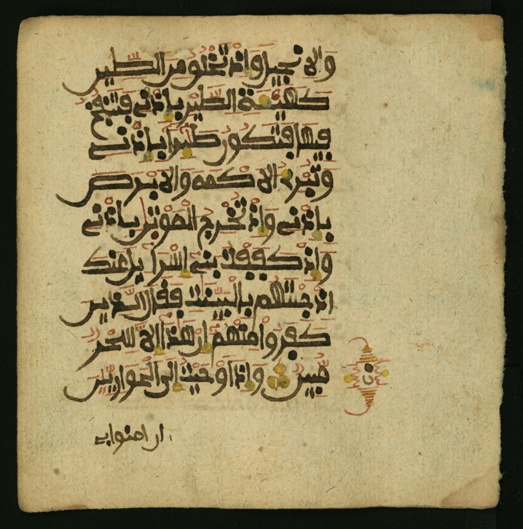 This square-format manuscript is volume 1, containing chapters 1-18 (Sūrat al-fātiḥah through Sūrat al-kahf), of an illuminated two-volume Qur'an produced in Sub-Saharan (West) Africa in the thirteenth century AH / nineteenth CE. The text is written in Sūdānī script in dark brown ink with vocalization in red on loose leaves. Chapter headings are in reddish-brown ink. Three yellow dots outlined in red arranged in a triangular form separate verses. Polychrome circular medallions as well as square and rectangular devices in a variety of patterns and colors mark textual divisions. The leaves of the text are organized between two decorated boards with geometric compositions. The pages and boards are housed in a leather pouch (satchel).