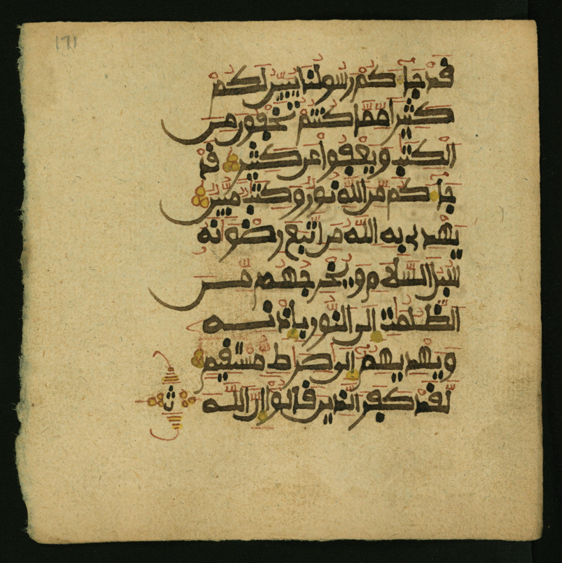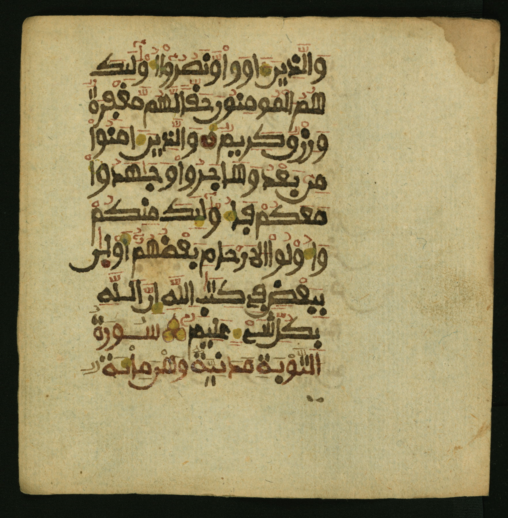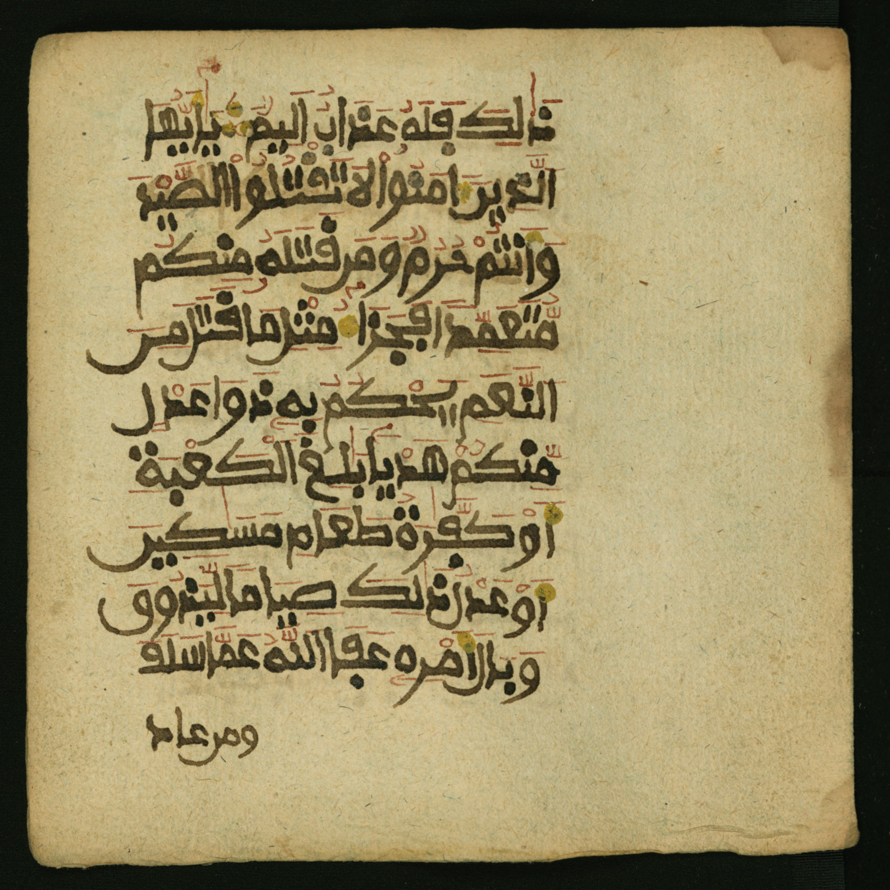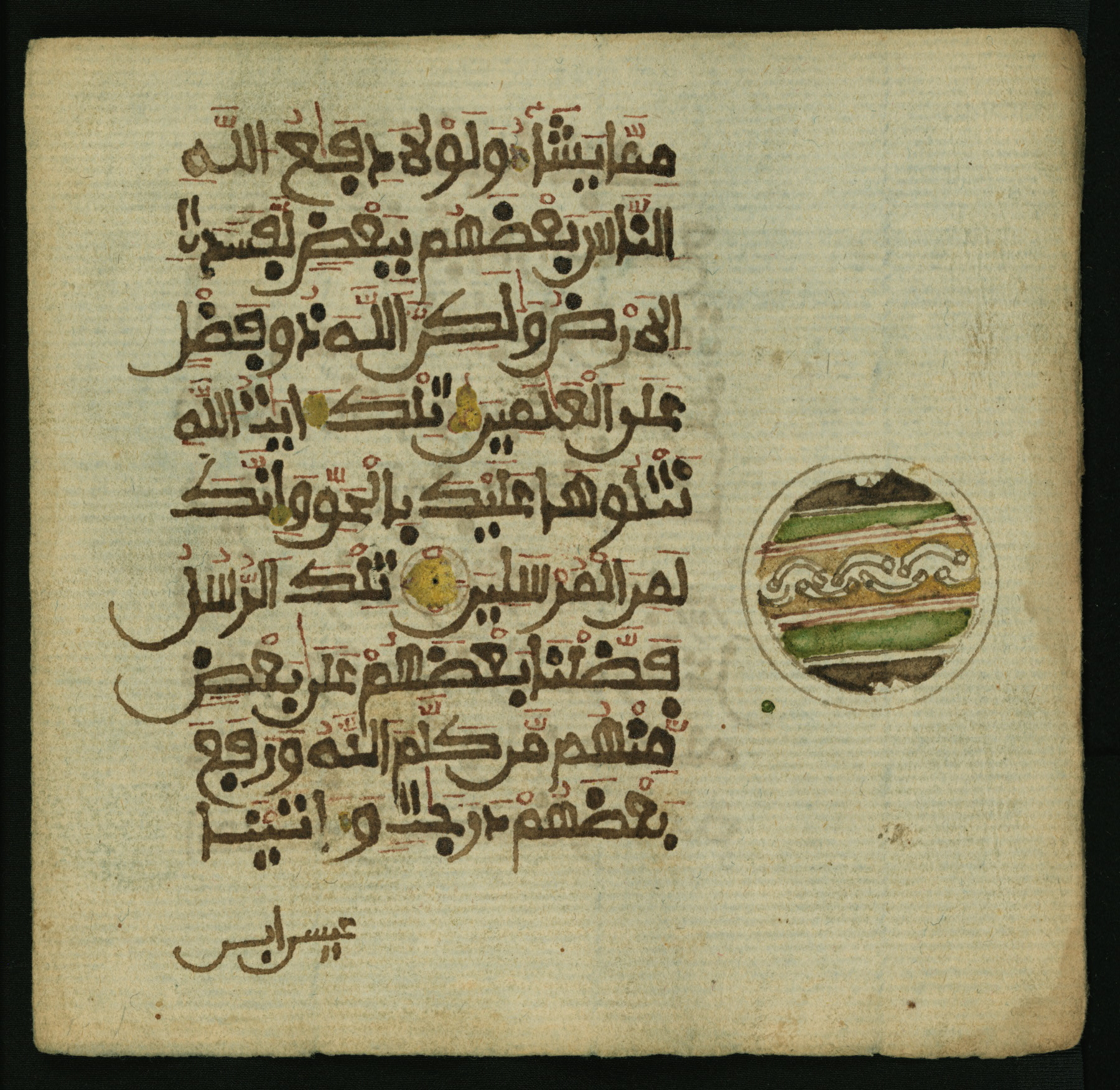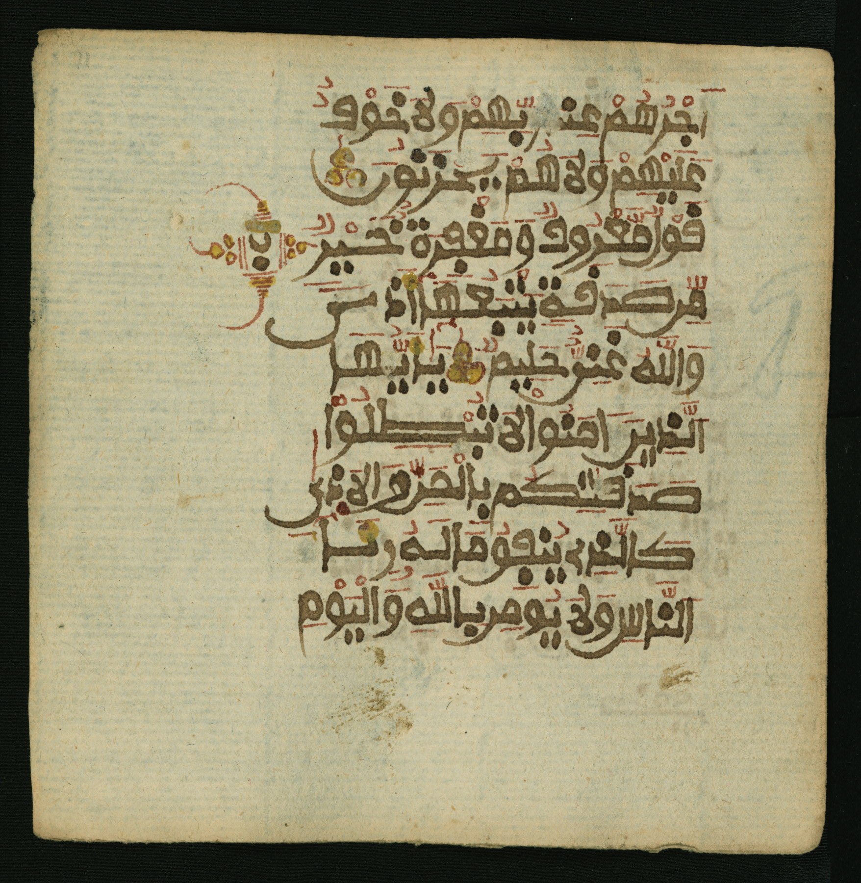 This square-format manuscript is volume 1, containing chapters 1-18 (Sūrat al-fātiḥah through Sūrat al-kahf), of an illuminated two-volume Qur'an produced in Sub-Saharan (West) Africa in the thirteenth century AH / nineteenth CE. The text is written in Sūdānī script in dark brown ink with vocalization in red on loose leaves. Chapter headings are in reddish-brown ink. Three yellow dots outlined in red arranged in a triangular form separate verses. Polychrome circular medallions as well as square and rectangular devices in a variety of patterns and colors mark textual divisions. The leaves of the text are organized between two decorated boards with geometric compositions. The pages and boards are housed in a leather pouch (satchel).