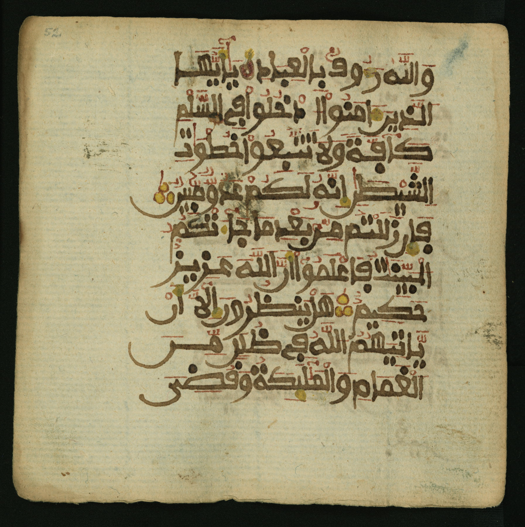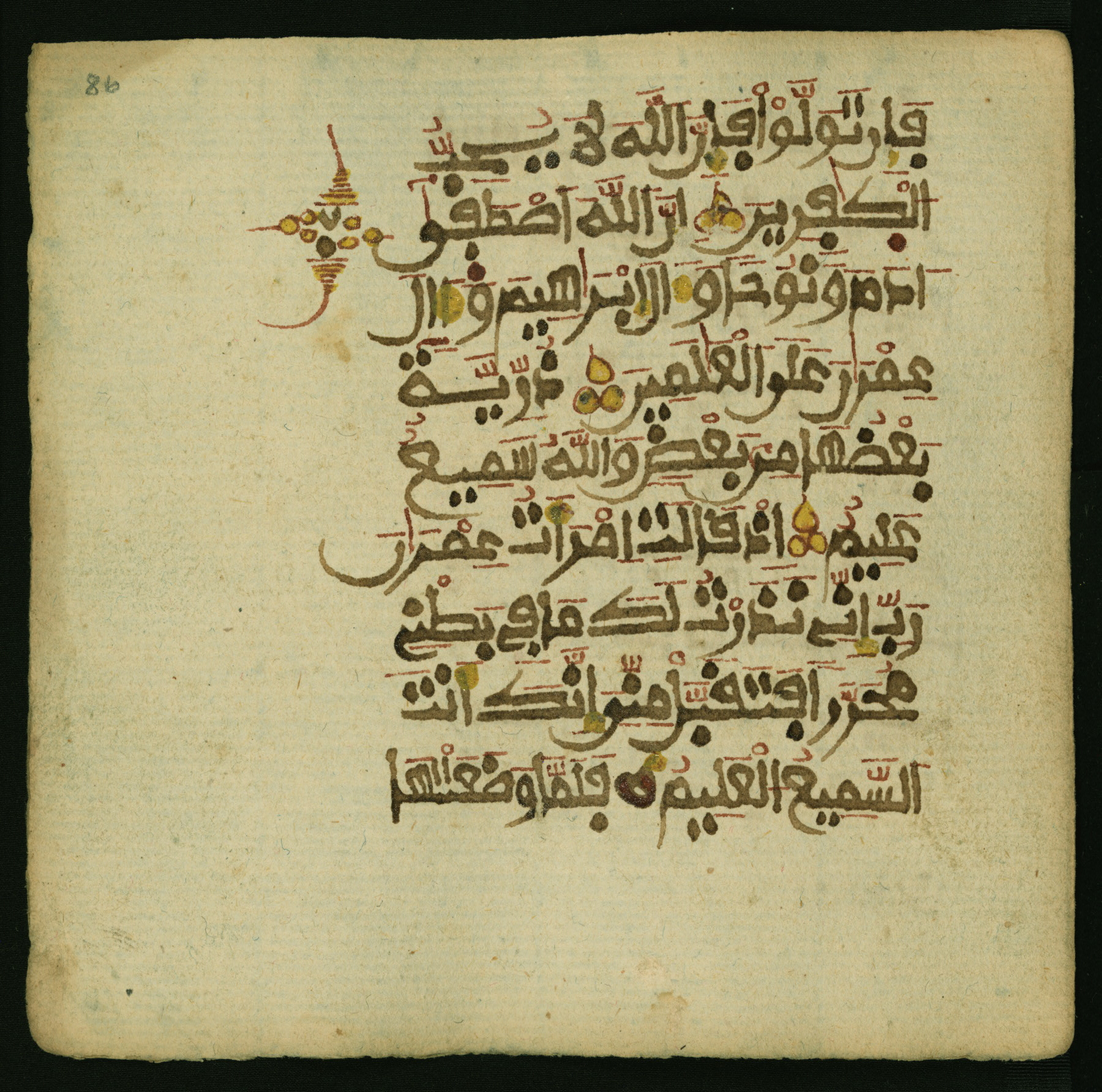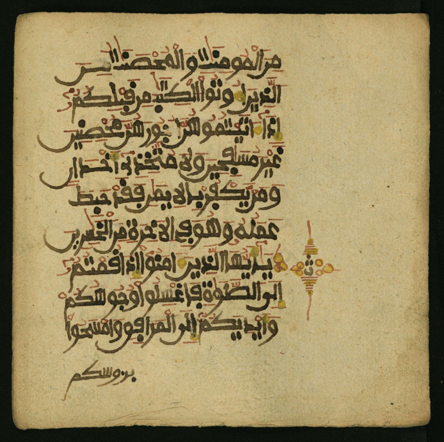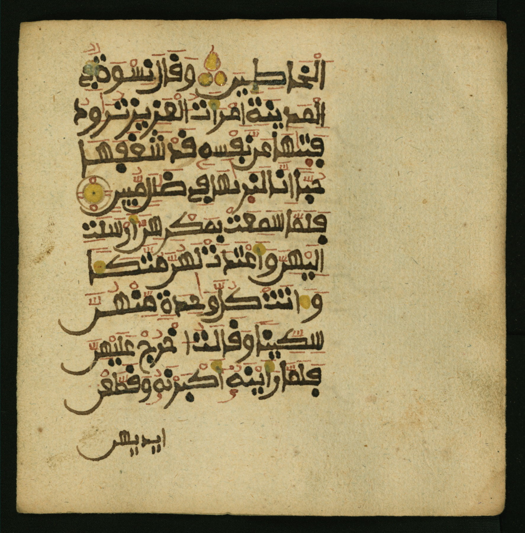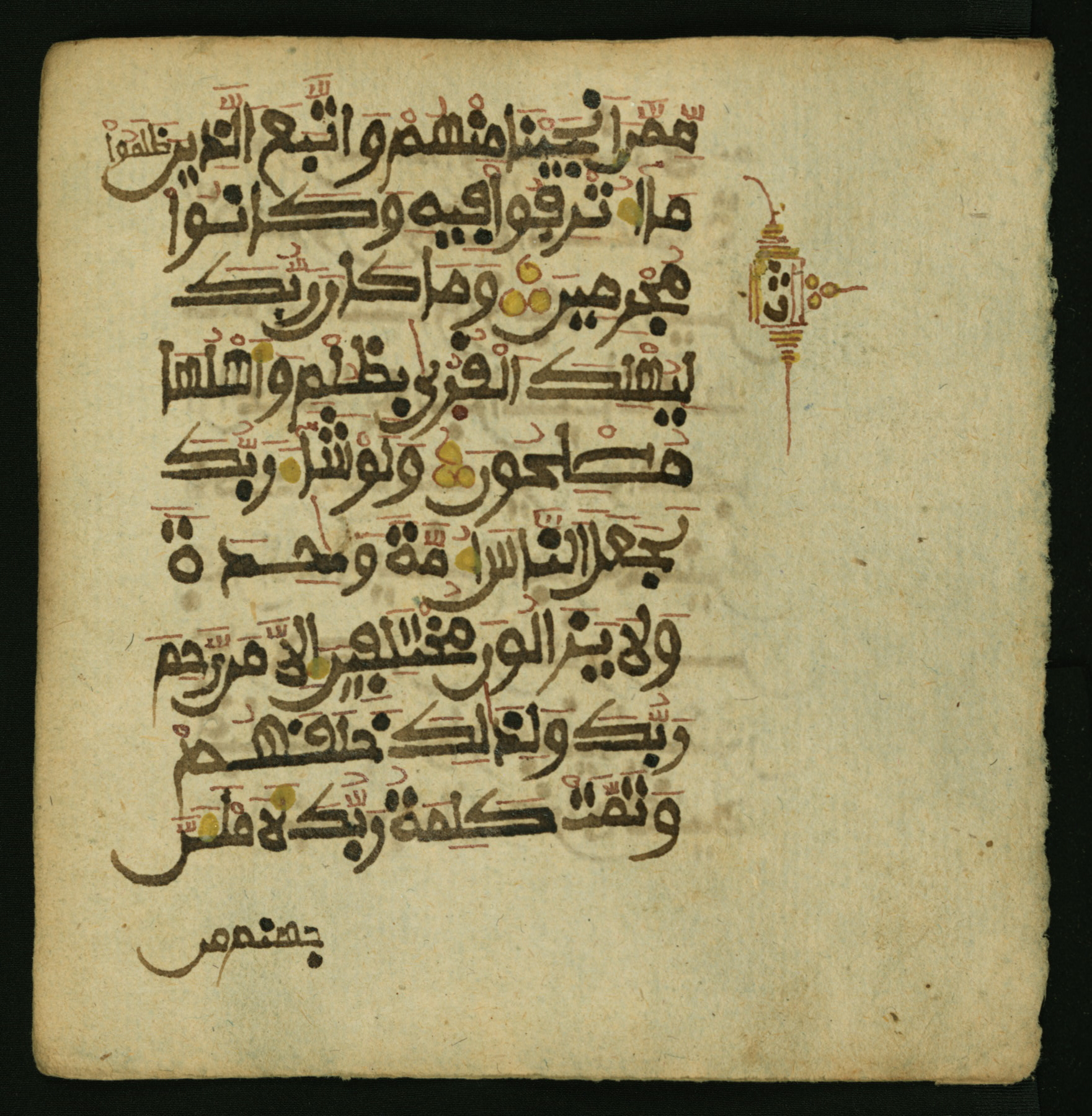 This square-format manuscript is volume 1, containing chapters 1-18 (Sūrat al-fātiḥah through Sūrat al-kahf), of an illuminated two-volume Qur'an produced in Sub-Saharan (West) Africa in the thirteenth century AH / nineteenth CE. The text is written in Sūdānī script in dark brown ink with vocalization in red on loose leaves. Chapter headings are in reddish-brown ink. Three yellow dots outlined in red arranged in a triangular form separate verses. Polychrome circular medallions as well as square and rectangular devices in a variety of patterns and colors mark textual divisions. The leaves of the text are organized between two decorated boards with geometric compositions. The pages and boards are housed in a leather pouch (satchel).