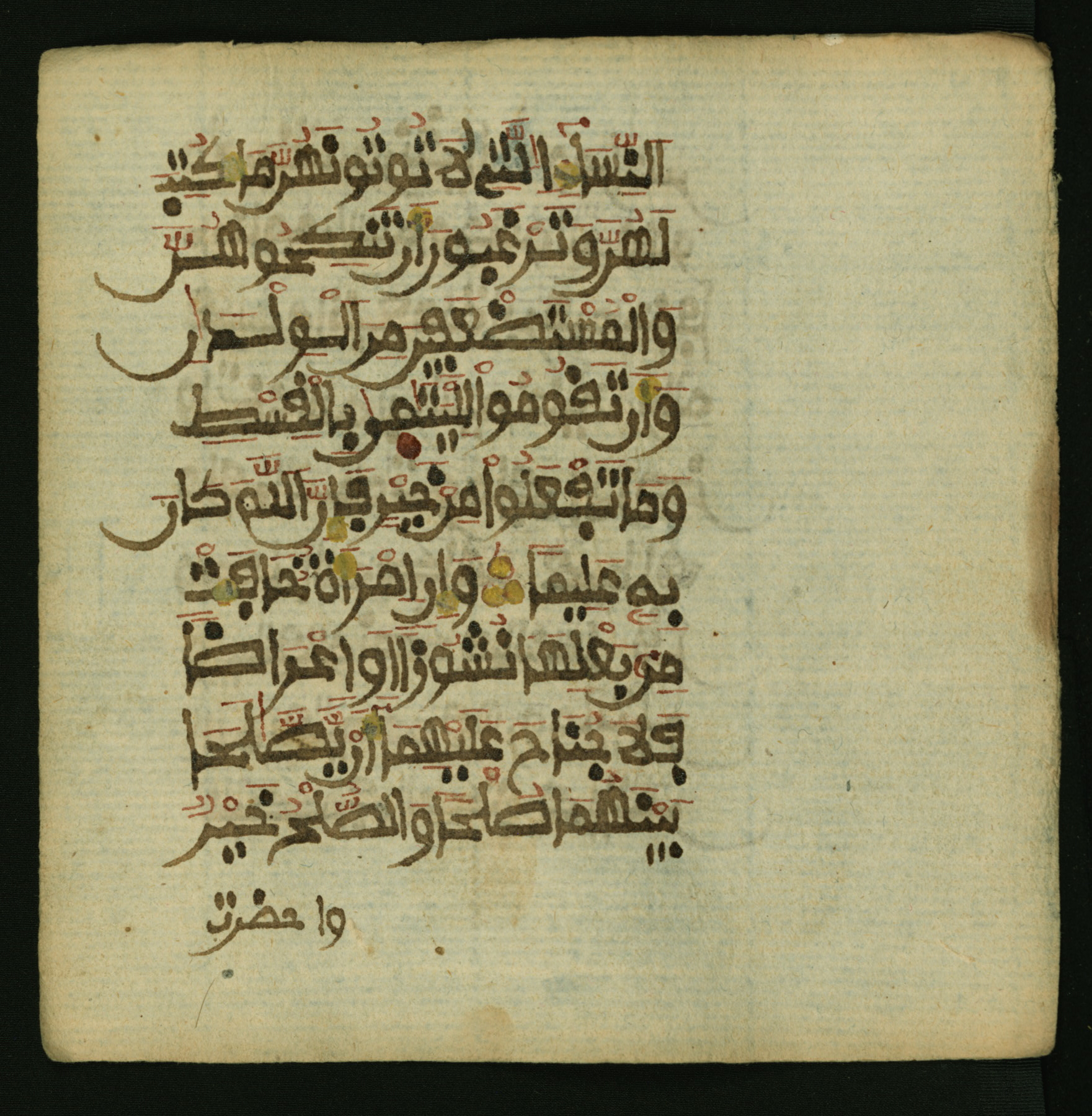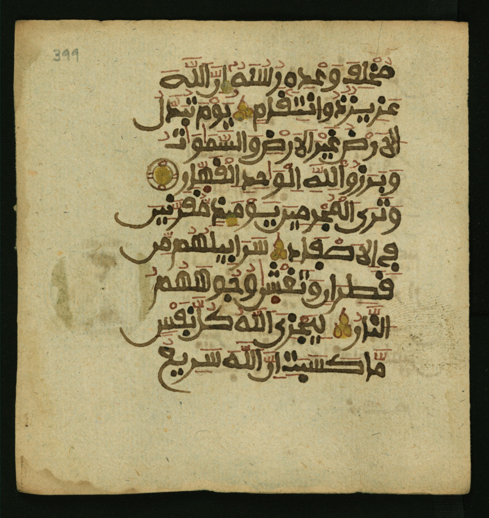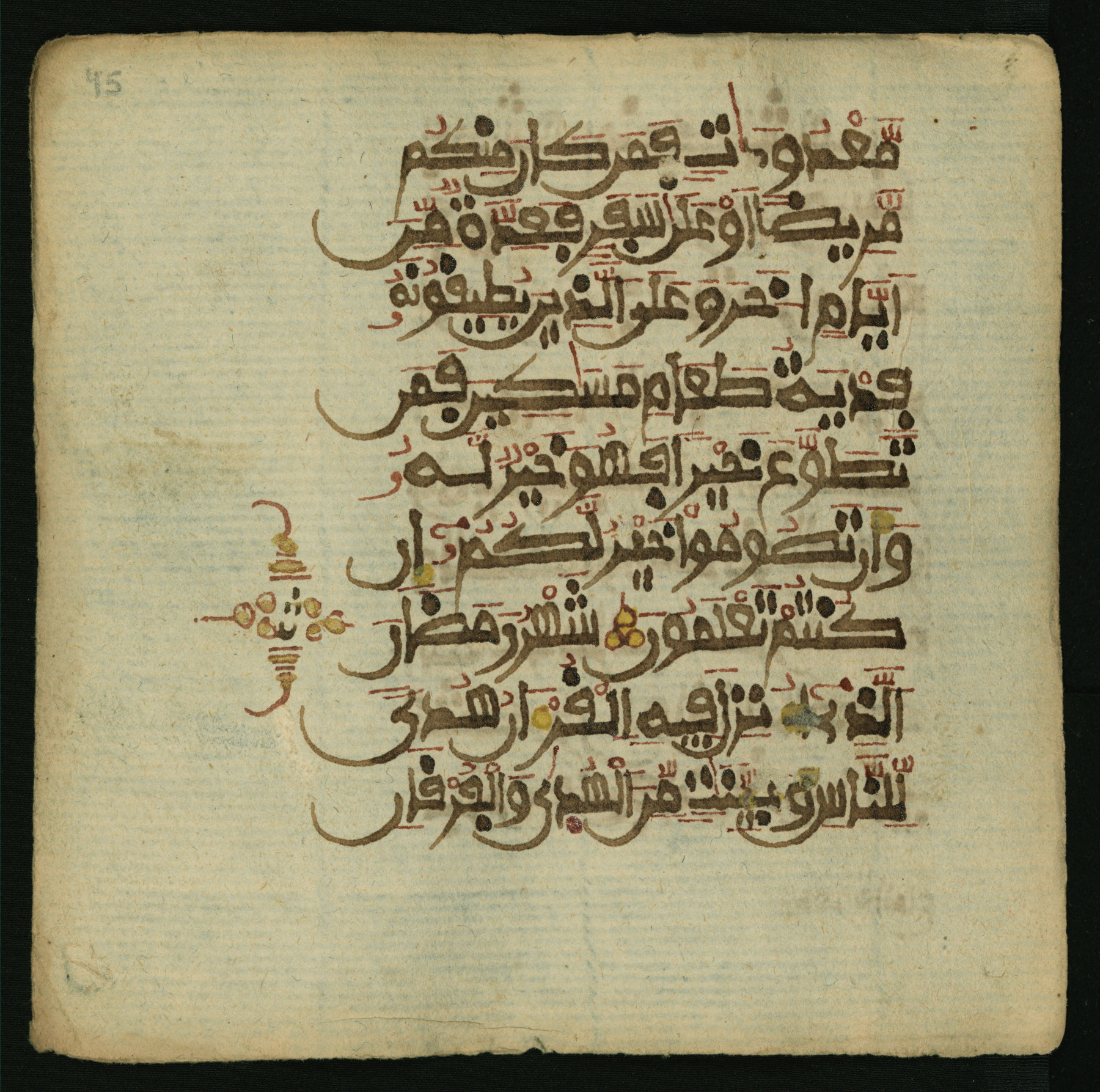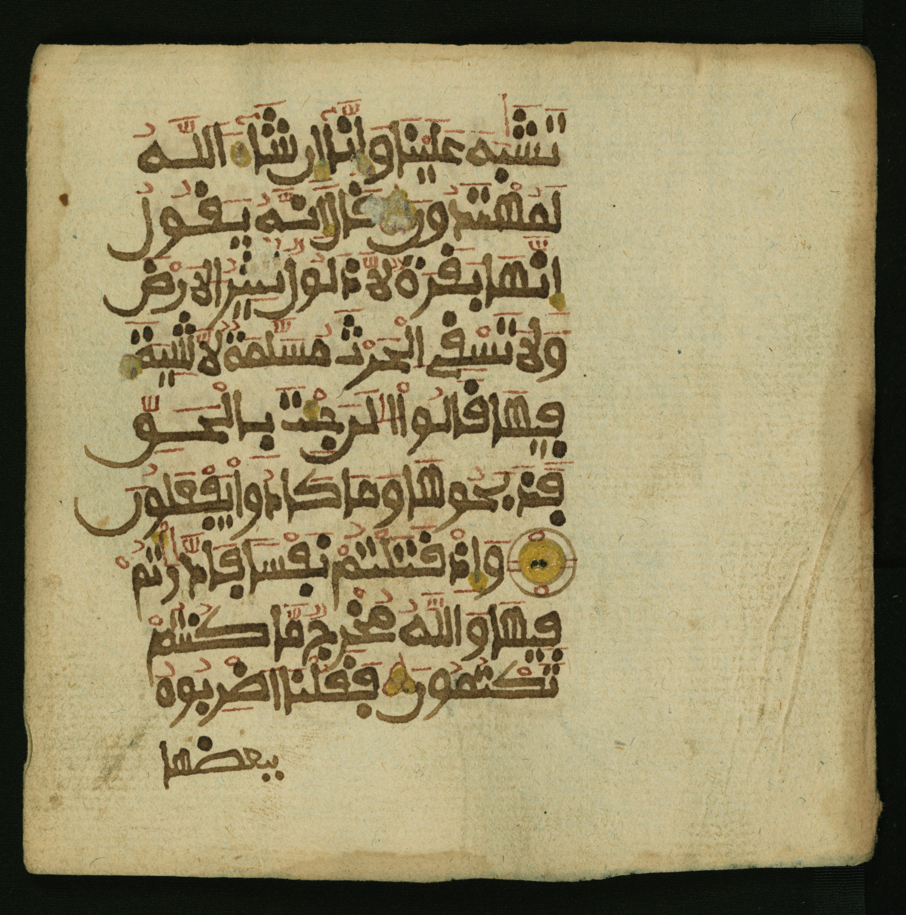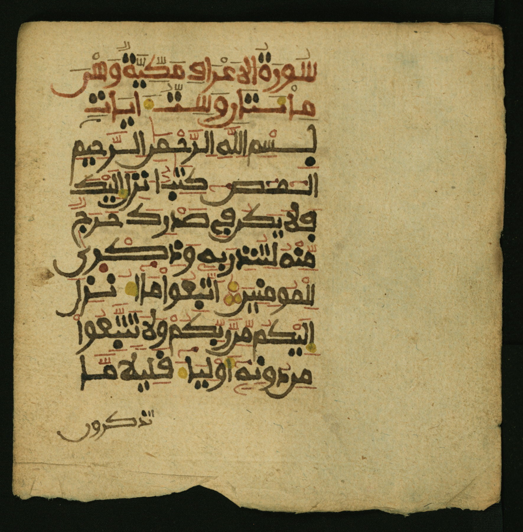 This square-format manuscript is volume 1, containing chapters 1-18 (Sūrat al-fātiḥah through Sūrat al-kahf), of an illuminated two-volume Qur'an produced in Sub-Saharan (West) Africa in the thirteenth century AH / nineteenth CE. The text is written in Sūdānī script in dark brown ink with vocalization in red on loose leaves. Chapter headings are in reddish-brown ink. Three yellow dots outlined in red arranged in a triangular form separate verses. Polychrome circular medallions as well as square and rectangular devices in a variety of patterns and colors mark textual divisions. The leaves of the text are organized between two decorated boards with geometric compositions. The pages and boards are housed in a leather pouch (satchel).
