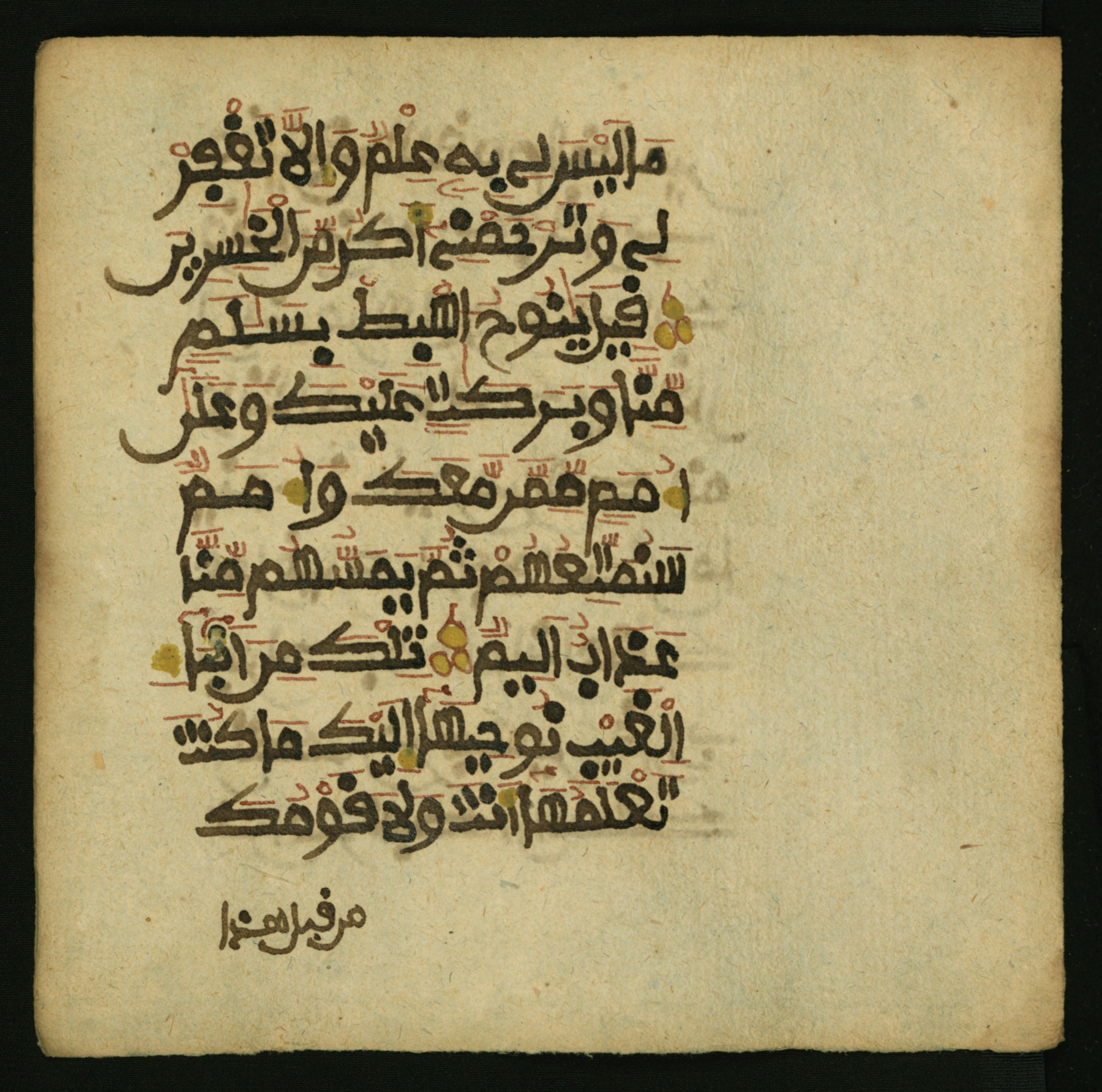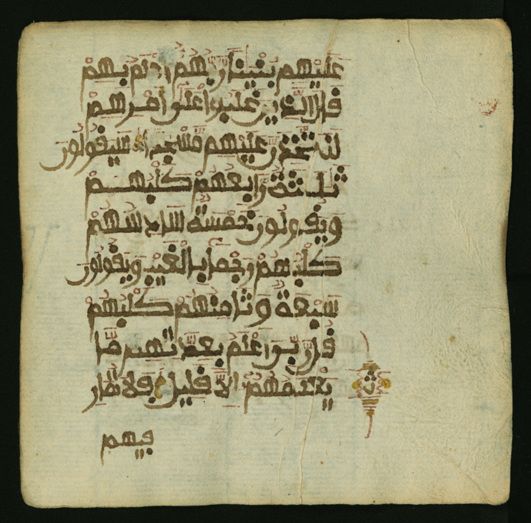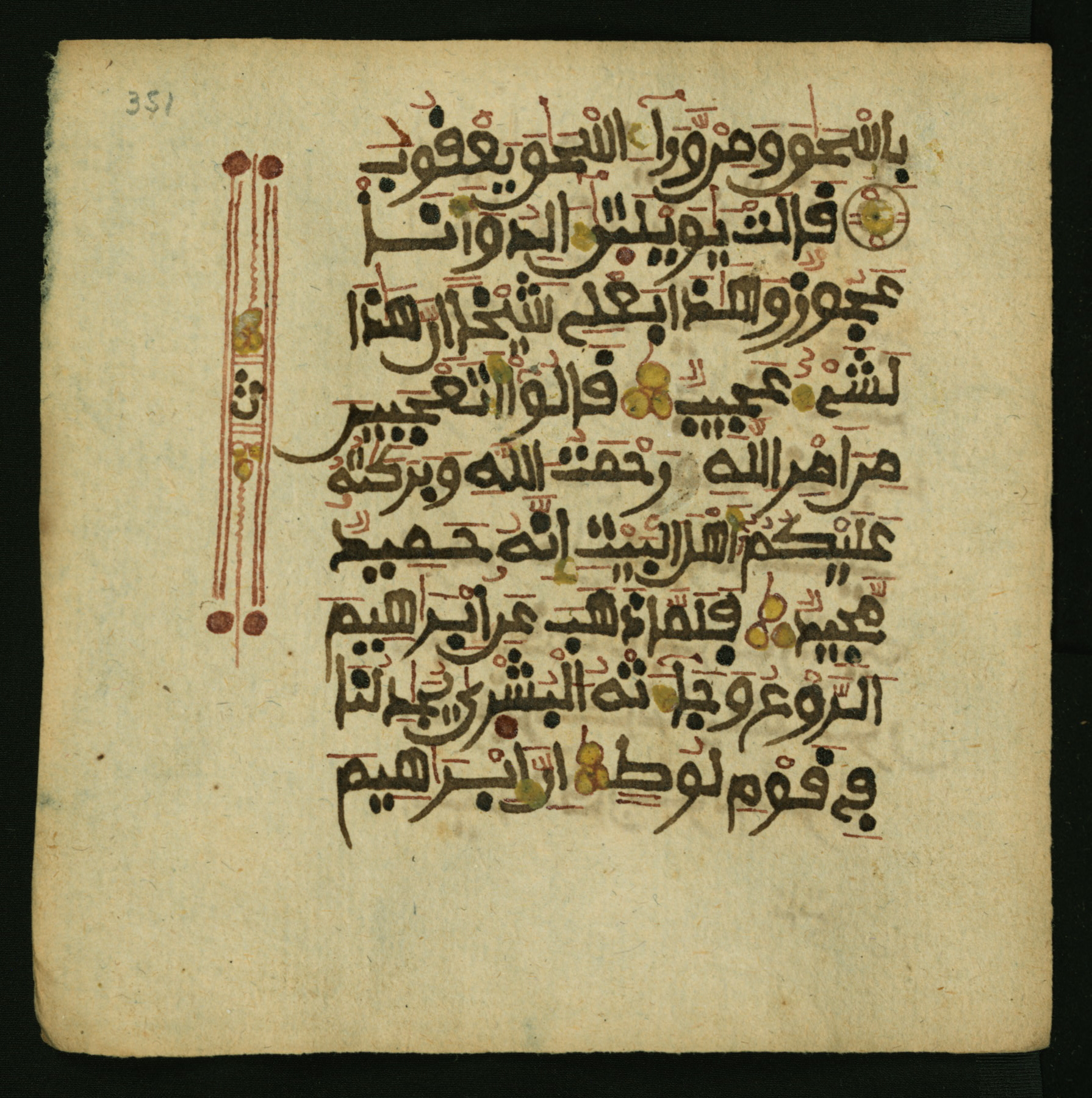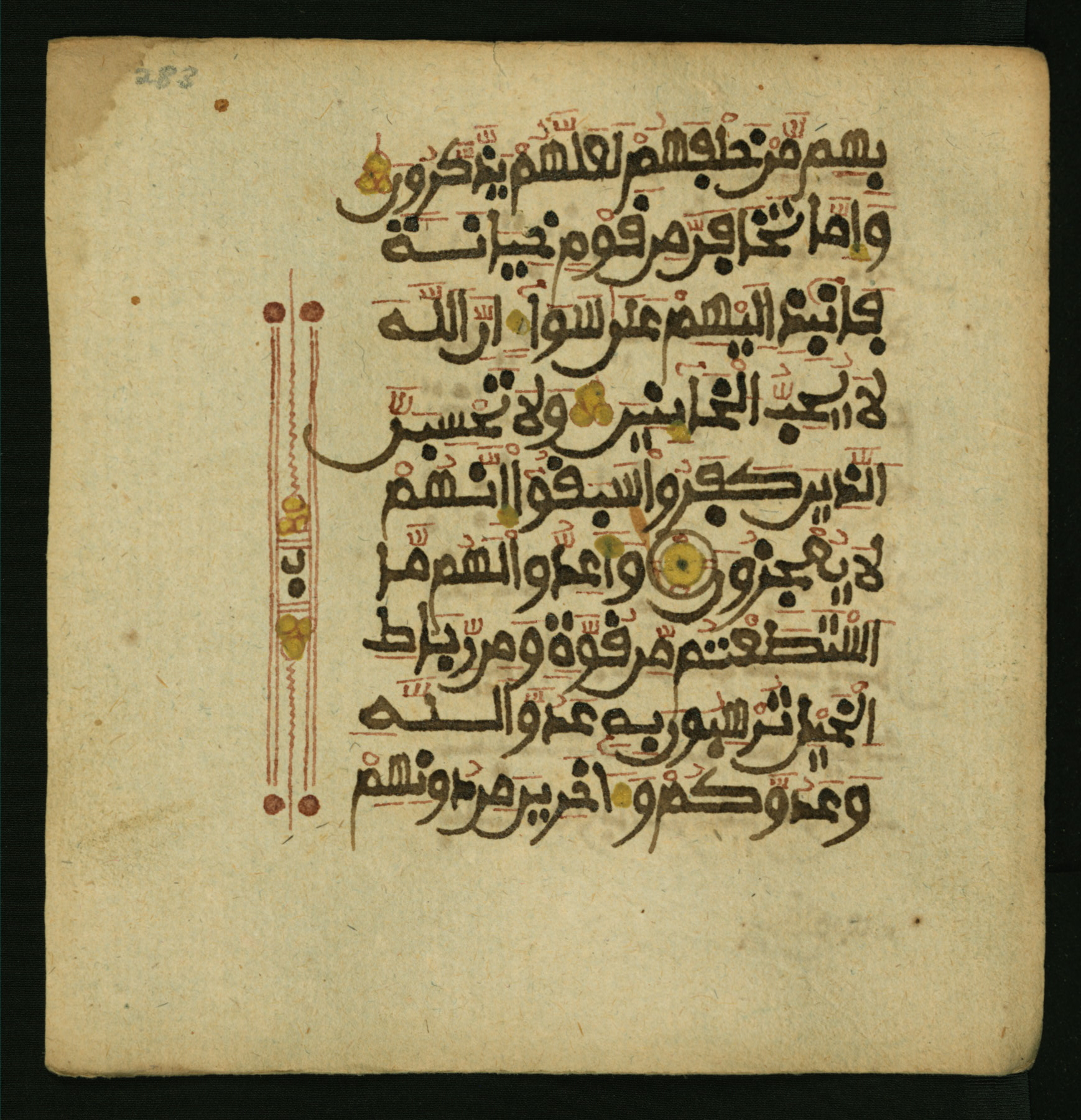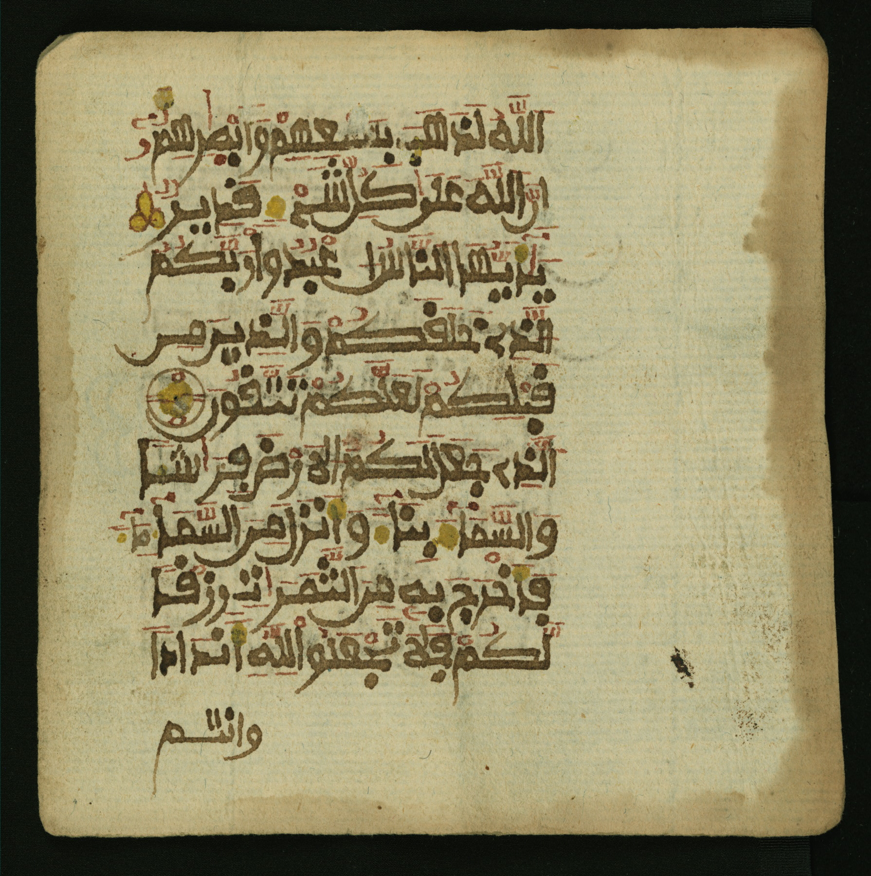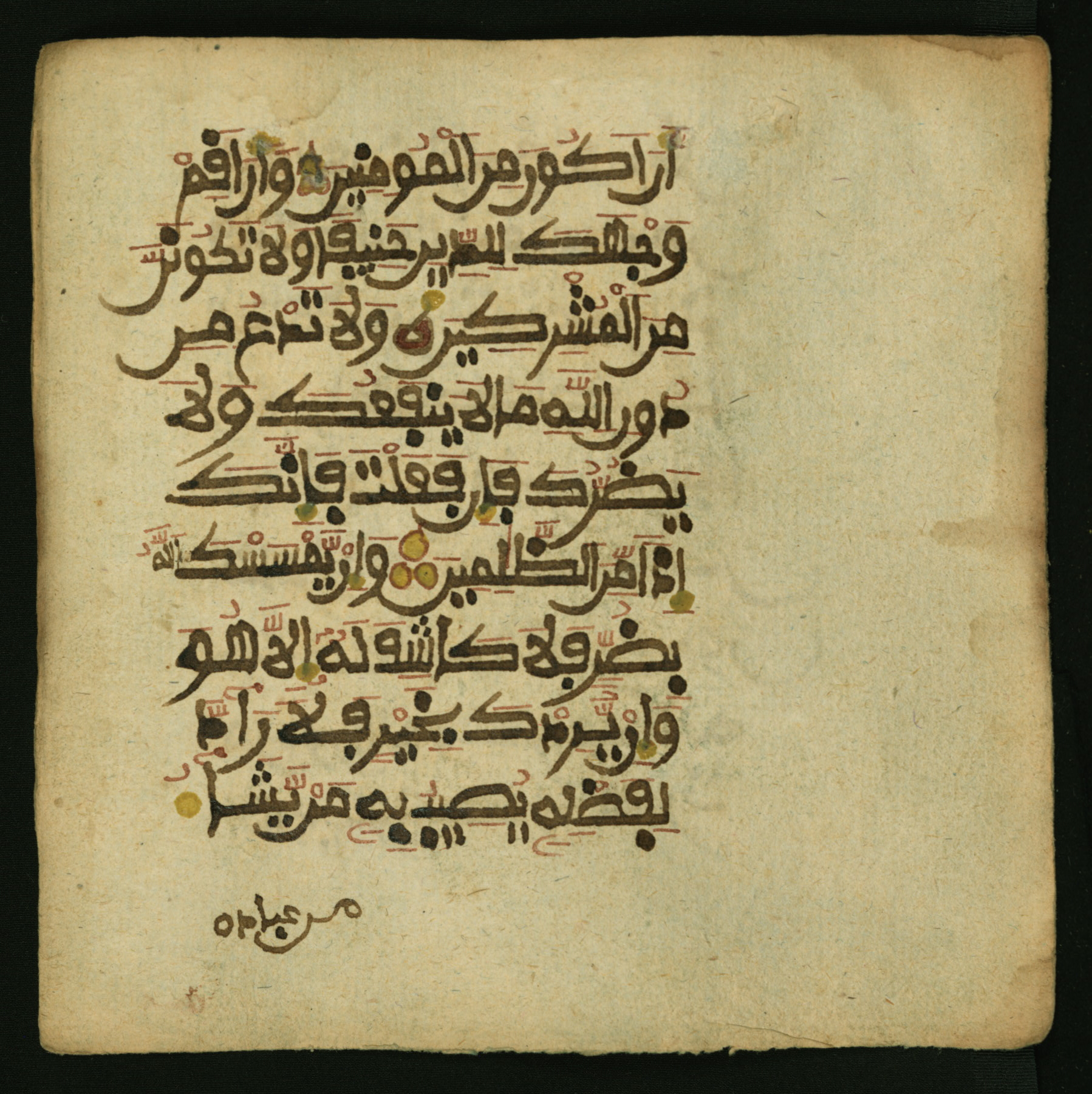 This square-format manuscript is volume 1, containing chapters 1-18 (Sūrat al-fātiḥah through Sūrat al-kahf), of an illuminated two-volume Qur'an produced in Sub-Saharan (West) Africa in the thirteenth century AH / nineteenth CE. The text is written in Sūdānī script in dark brown ink with vocalization in red on loose leaves. Chapter headings are in reddish-brown ink. Three yellow dots outlined in red arranged in a triangular form separate verses. Polychrome circular medallions as well as square and rectangular devices in a variety of patterns and colors mark textual divisions. The leaves of the text are organized between two decorated boards with geometric compositions. The pages and boards are housed in a leather pouch (satchel).