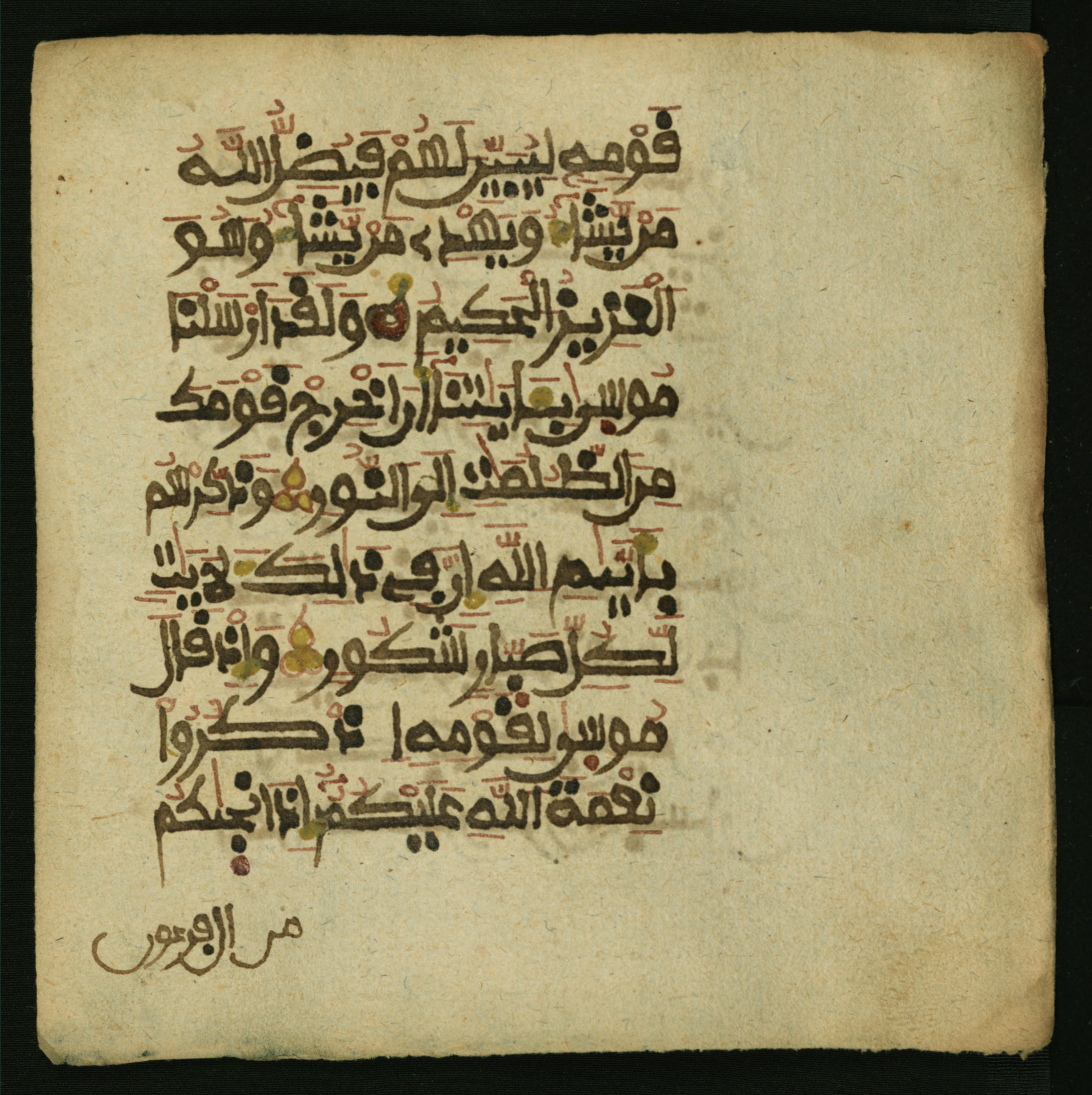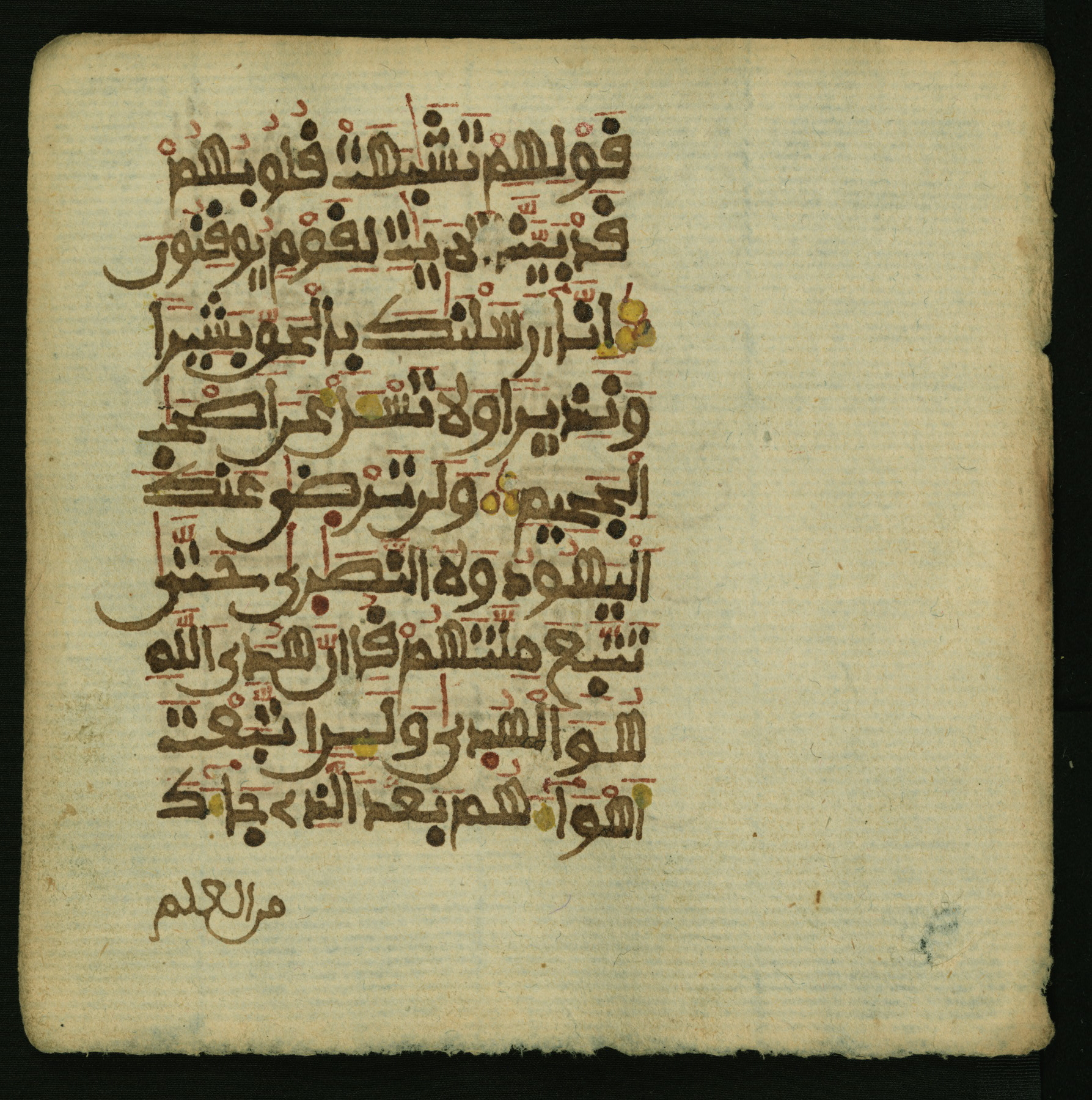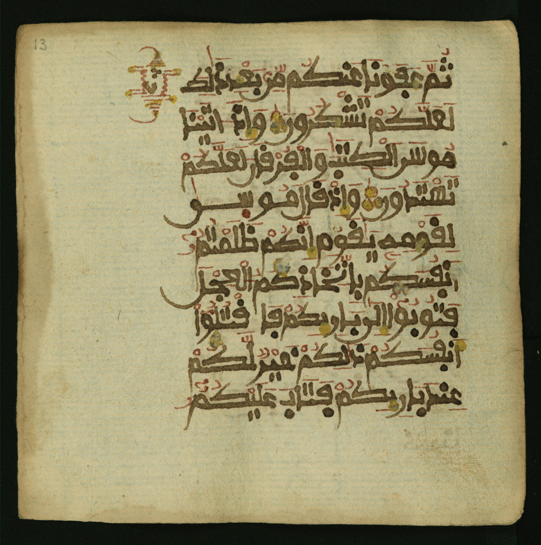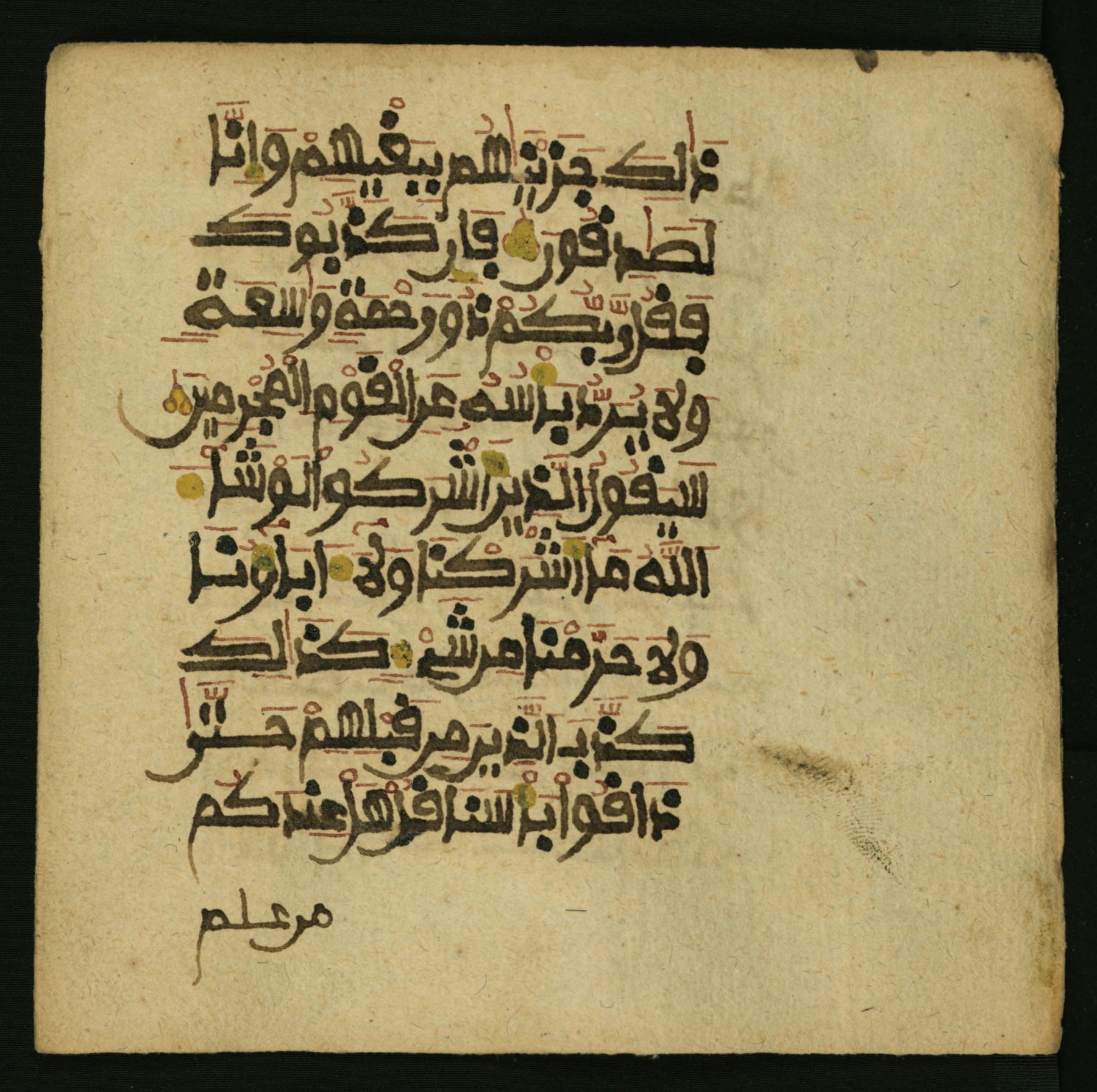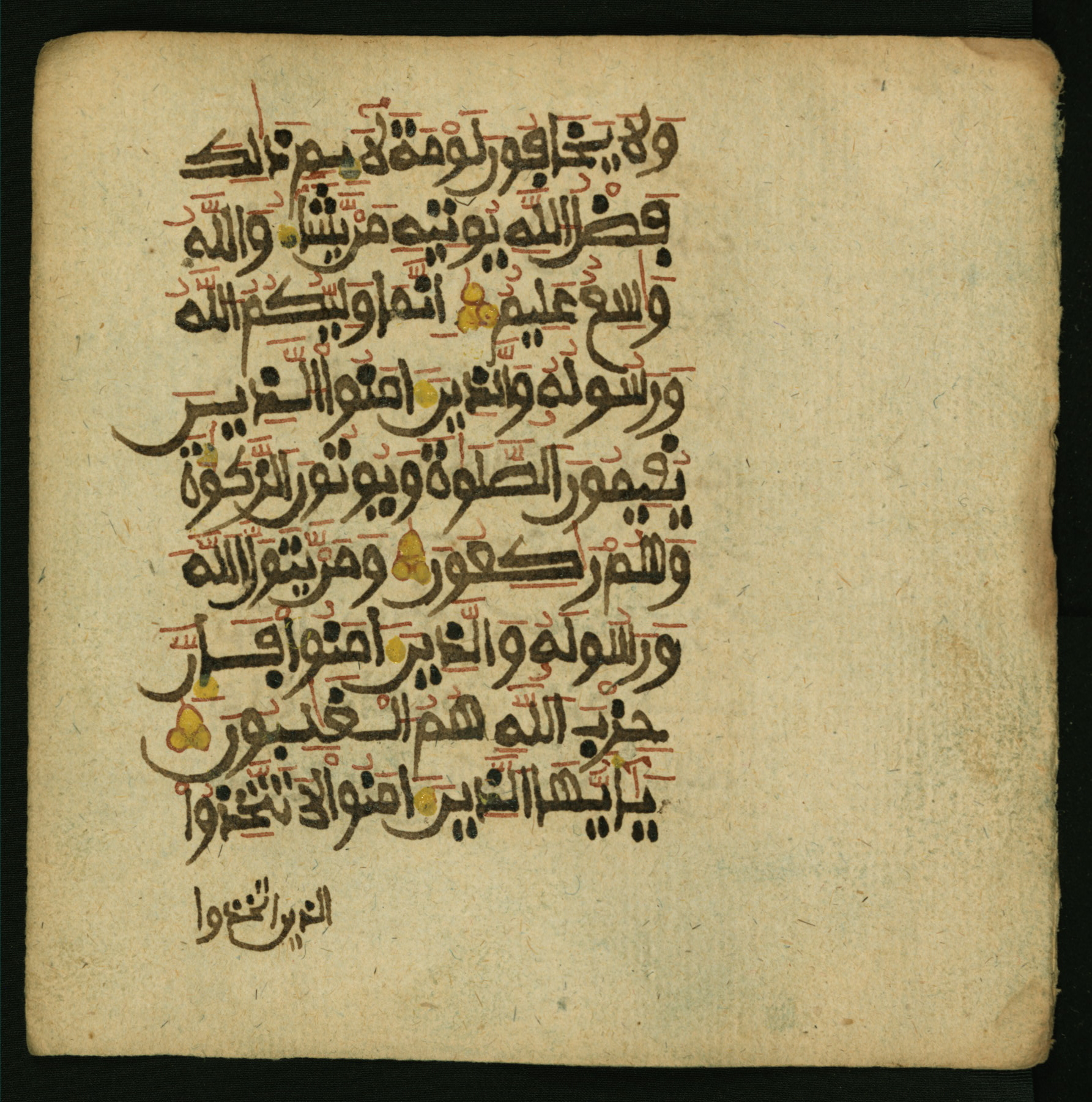 This square-format manuscript is volume 1, containing chapters 1-18 (Sūrat al-fātiḥah through Sūrat al-kahf), of an illuminated two-volume Qur'an produced in Sub-Saharan (West) Africa in the thirteenth century AH / nineteenth CE. The text is written in Sūdānī script in dark brown ink with vocalization in red on loose leaves. Chapter headings are in reddish-brown ink. Three yellow dots outlined in red arranged in a triangular form separate verses. Polychrome circular medallions as well as square and rectangular devices in a variety of patterns and colors mark textual divisions. The leaves of the text are organized between two decorated boards with geometric compositions. The pages and boards are housed in a leather pouch (satchel).