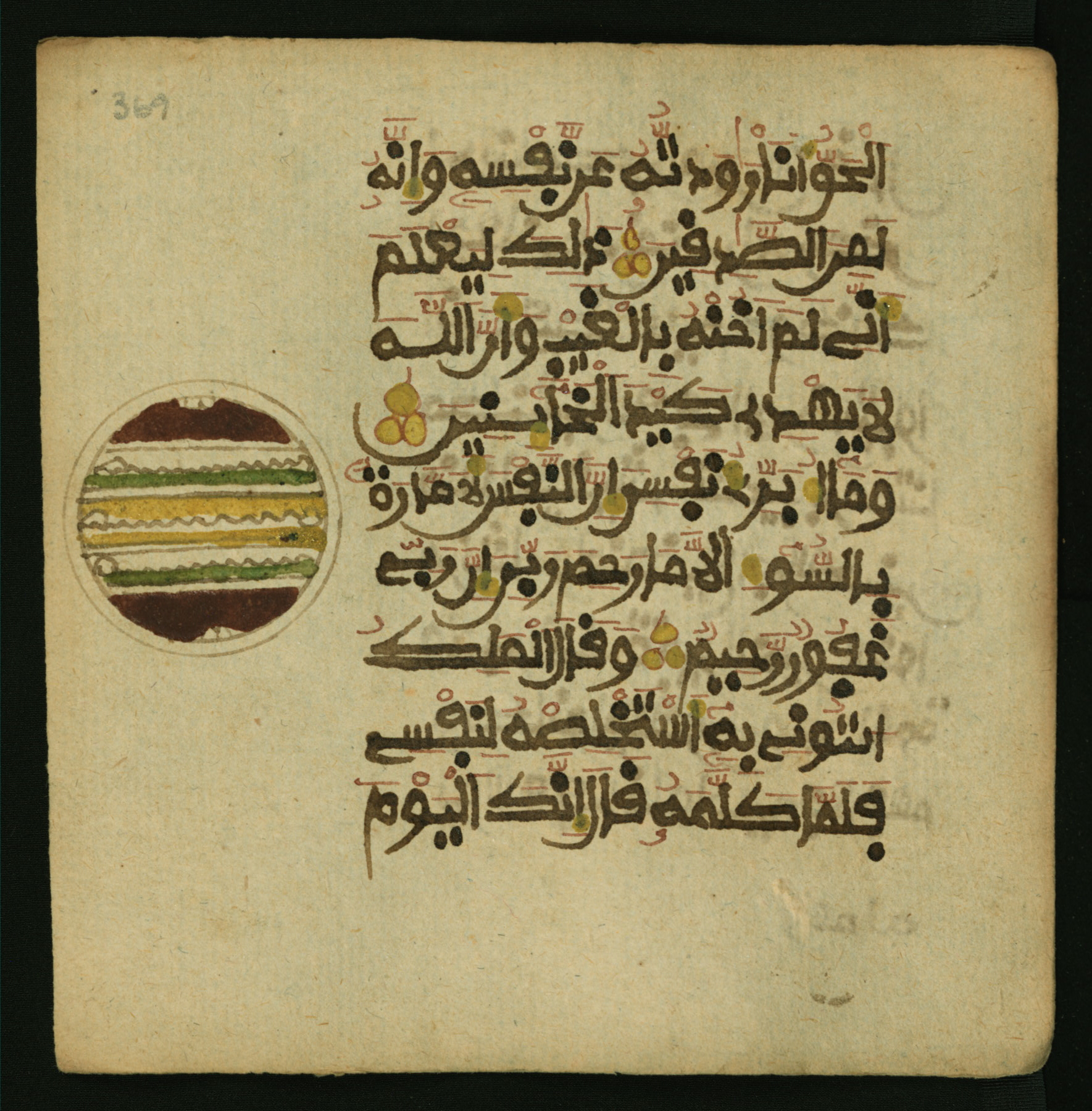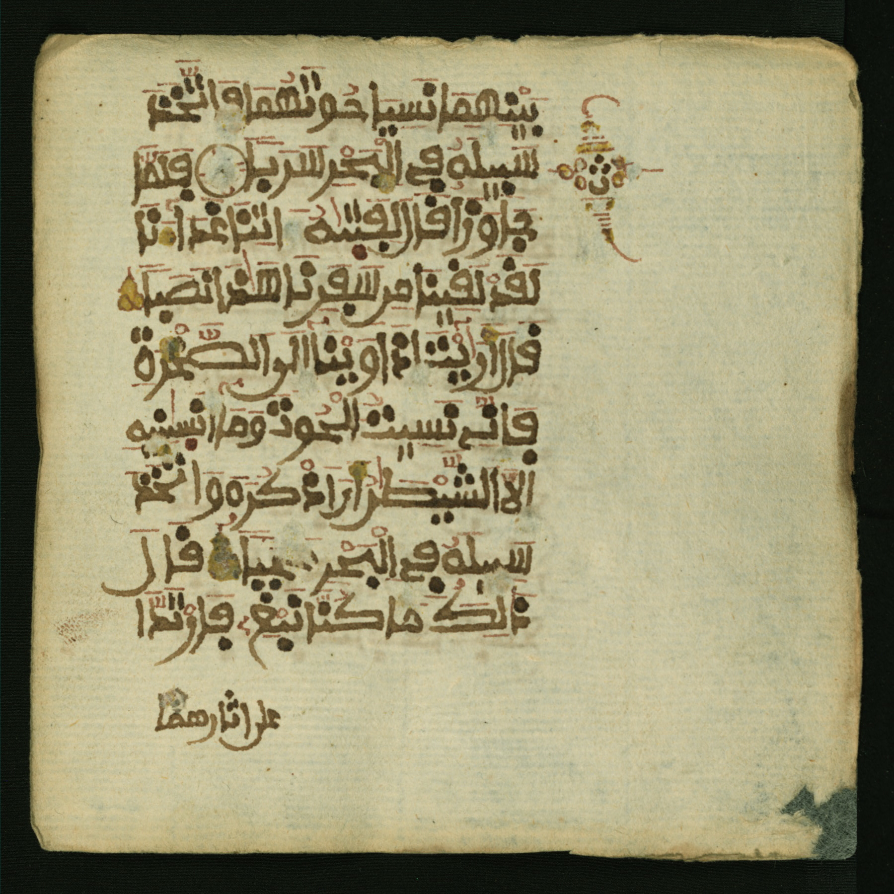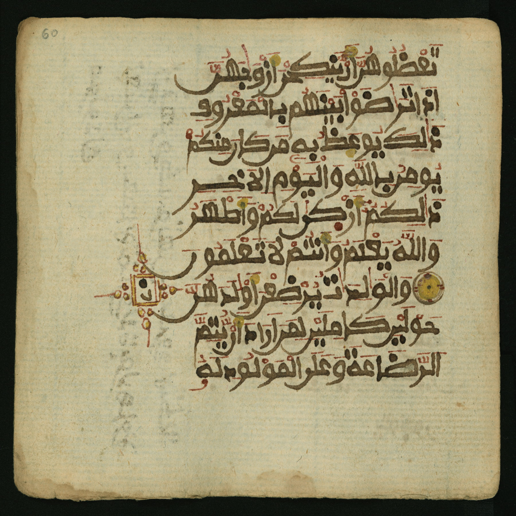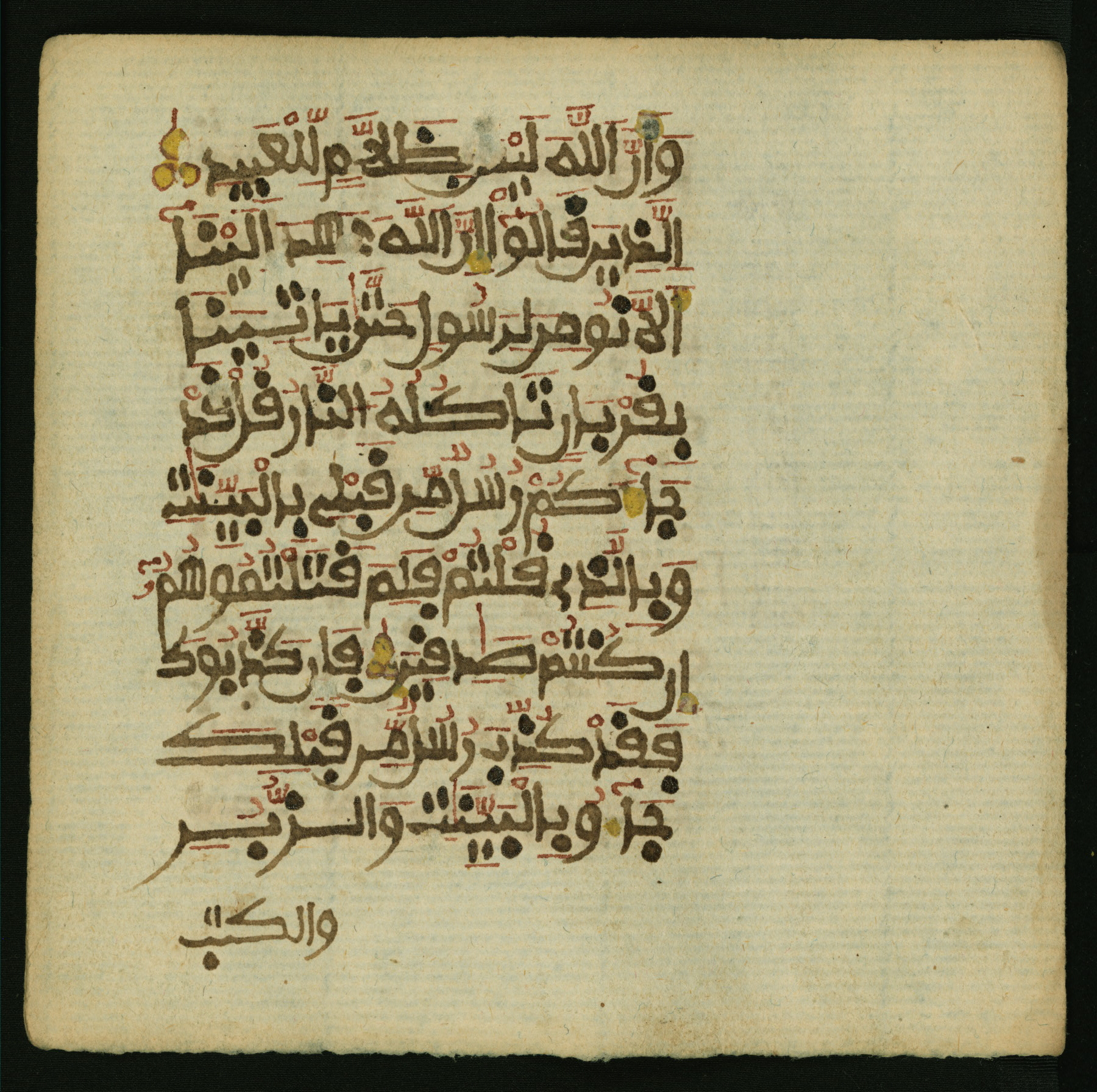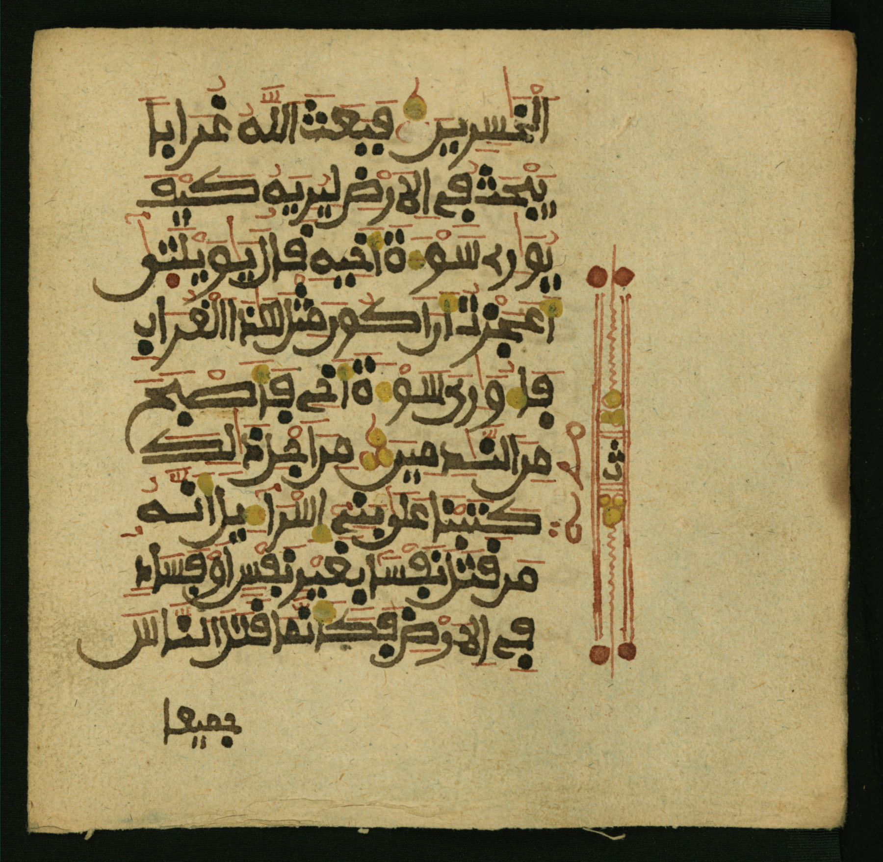 This square-format manuscript is volume 1, containing chapters 1-18 (Sūrat al-fātiḥah through Sūrat al-kahf), of an illuminated two-volume Qur'an produced in Sub-Saharan (West) Africa in the thirteenth century AH / nineteenth CE. The text is written in Sūdānī script in dark brown ink with vocalization in red on loose leaves. Chapter headings are in reddish-brown ink. Three yellow dots outlined in red arranged in a triangular form separate verses. Polychrome circular medallions as well as square and rectangular devices in a variety of patterns and colors mark textual divisions. The leaves of the text are organized between two decorated boards with geometric compositions. The pages and boards are housed in a leather pouch (satchel).