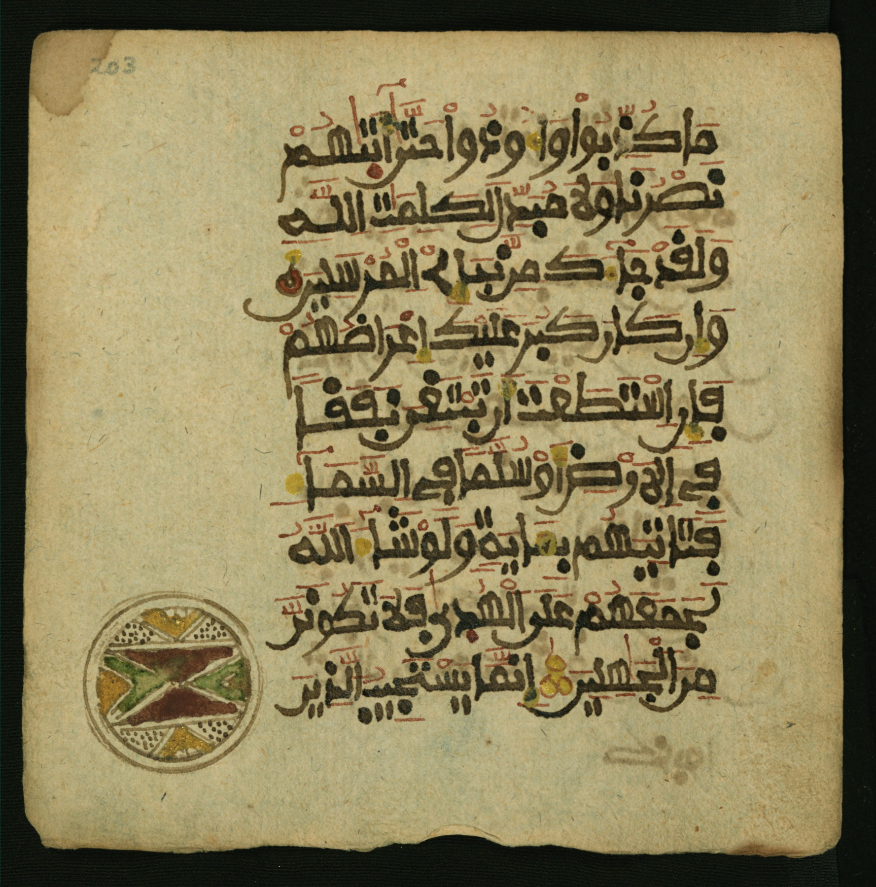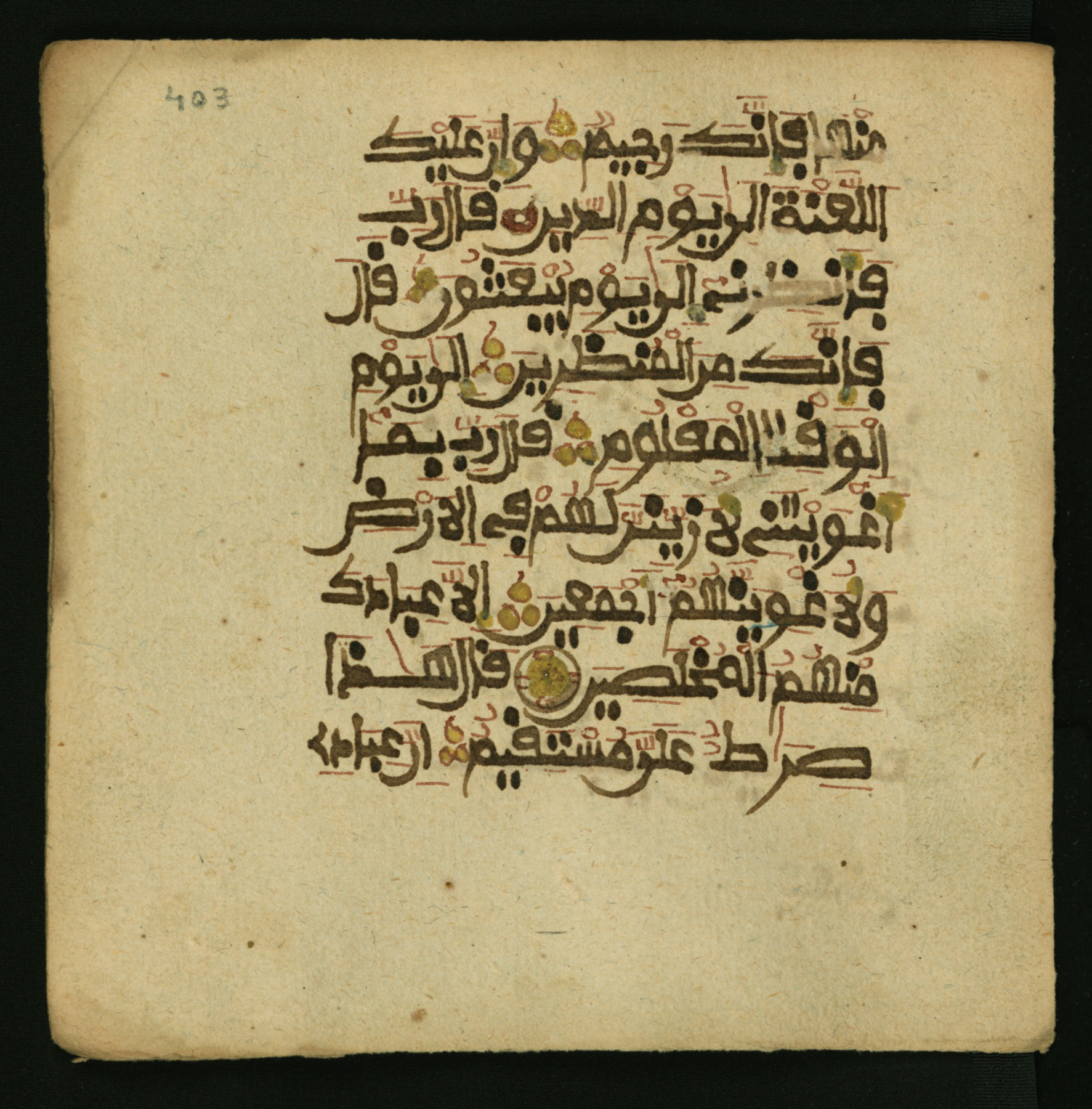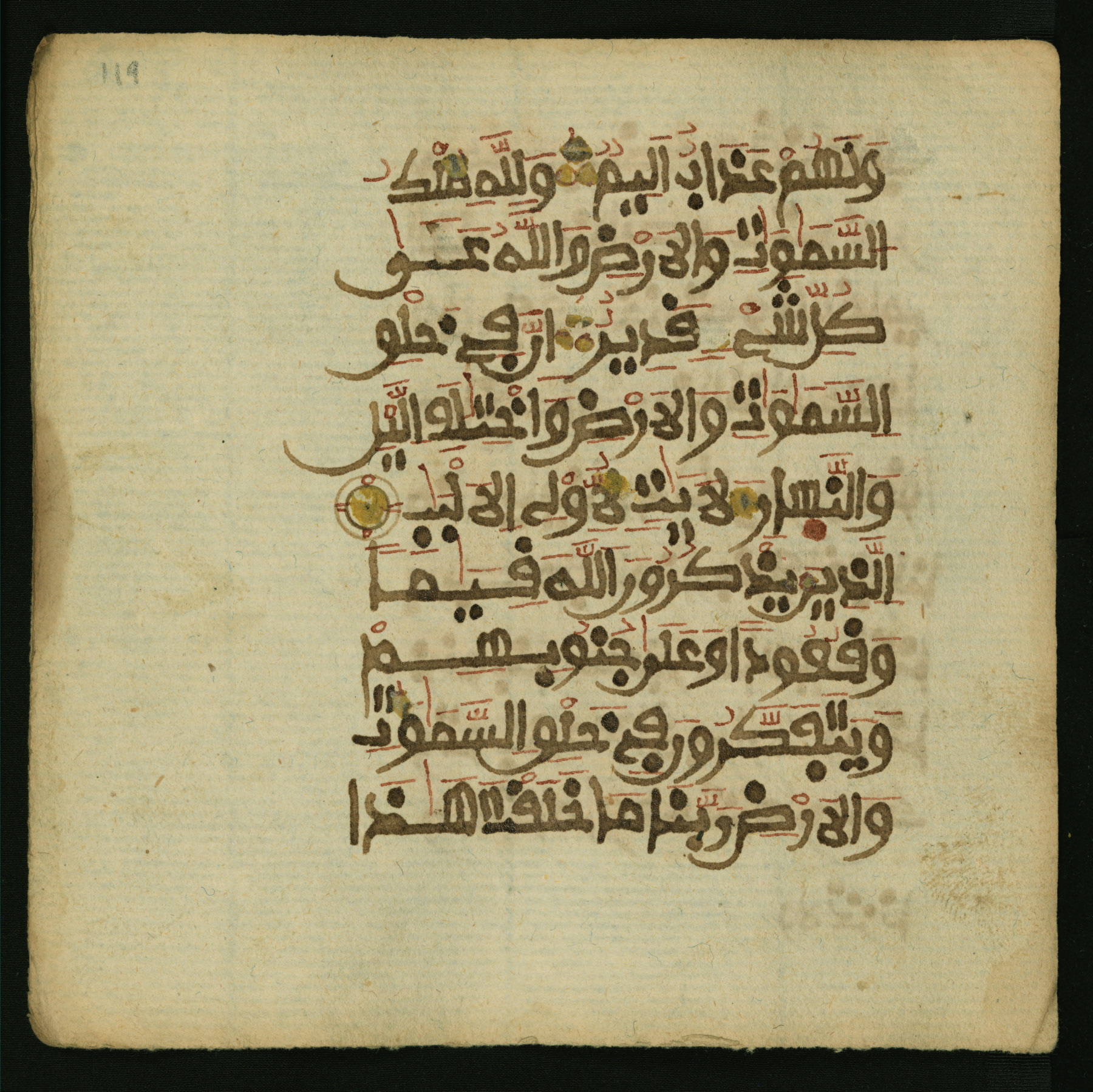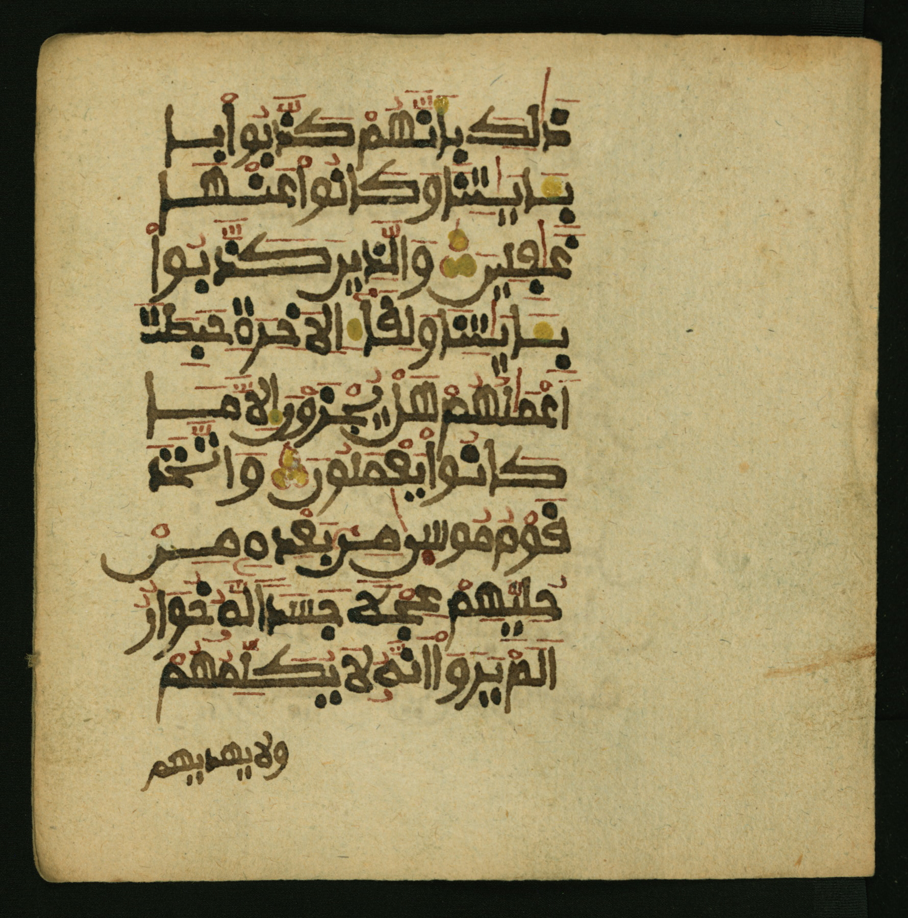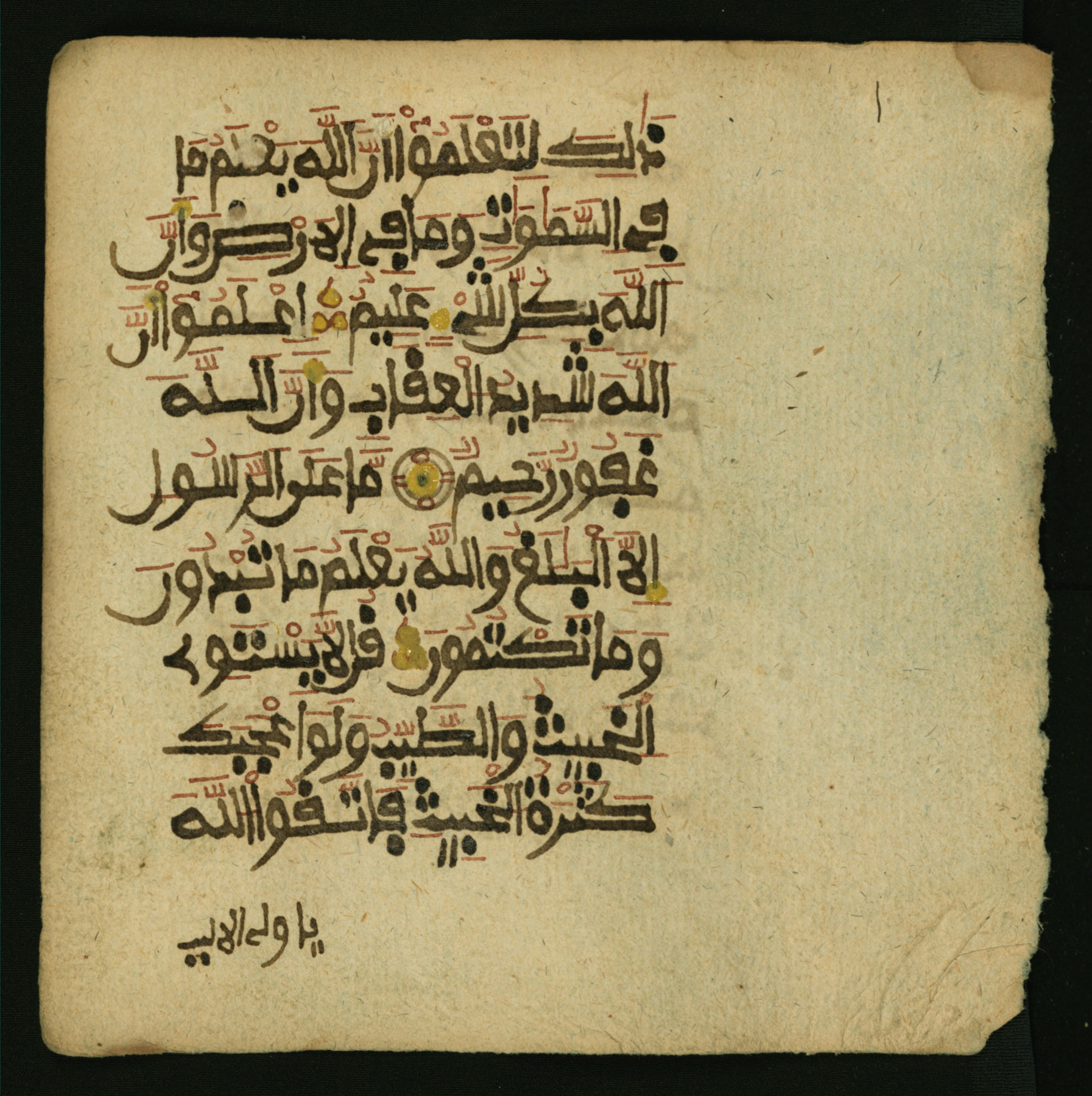 This square-format manuscript is volume 1, containing chapters 1-18 (Sūrat al-fātiḥah through Sūrat al-kahf), of an illuminated two-volume Qur'an produced in Sub-Saharan (West) Africa in the thirteenth century AH / nineteenth CE. The text is written in Sūdānī script in dark brown ink with vocalization in red on loose leaves. Chapter headings are in reddish-brown ink. Three yellow dots outlined in red arranged in a triangular form separate verses. Polychrome circular medallions as well as square and rectangular devices in a variety of patterns and colors mark textual divisions. The leaves of the text are organized between two decorated boards with geometric compositions. The pages and boards are housed in a leather pouch (satchel).