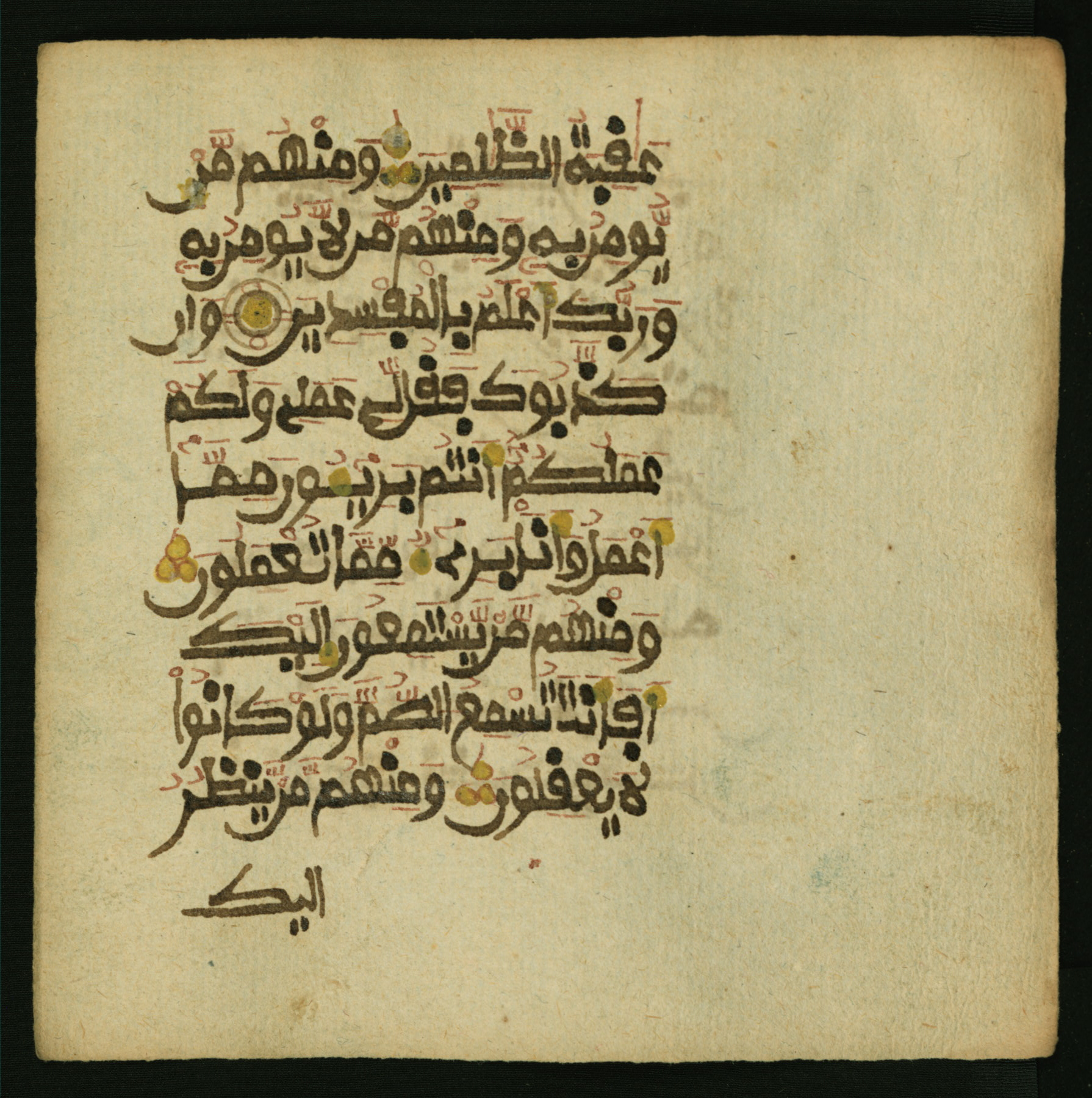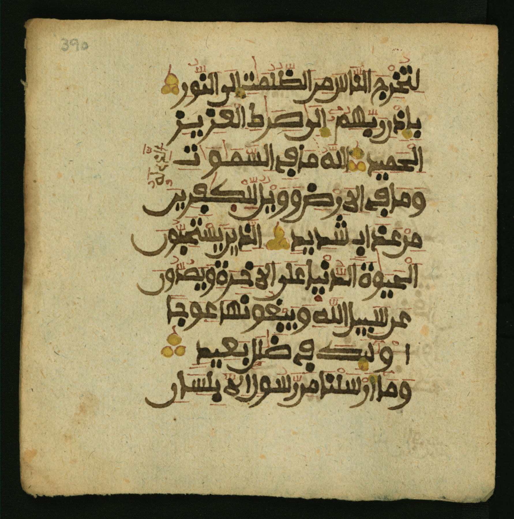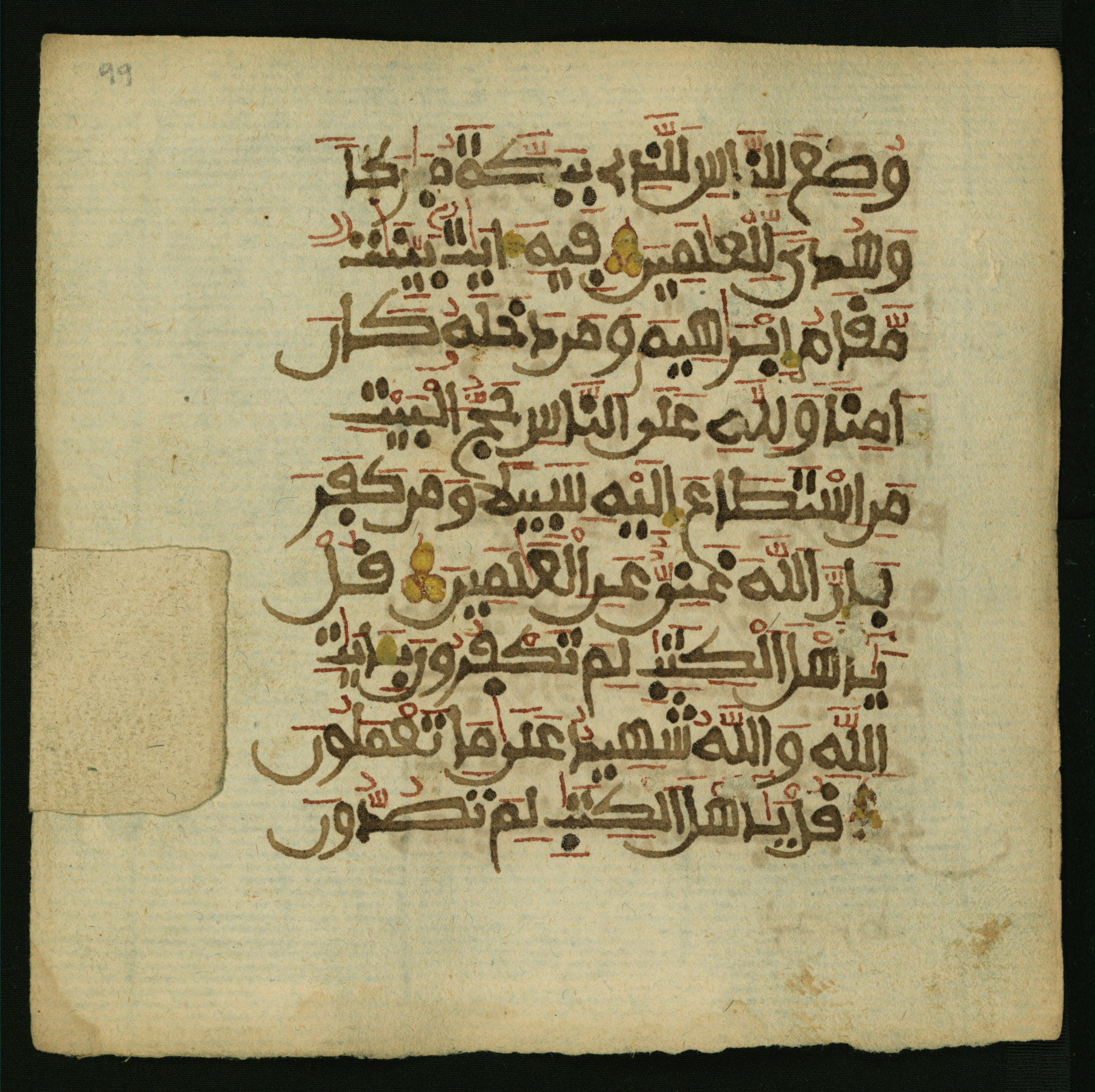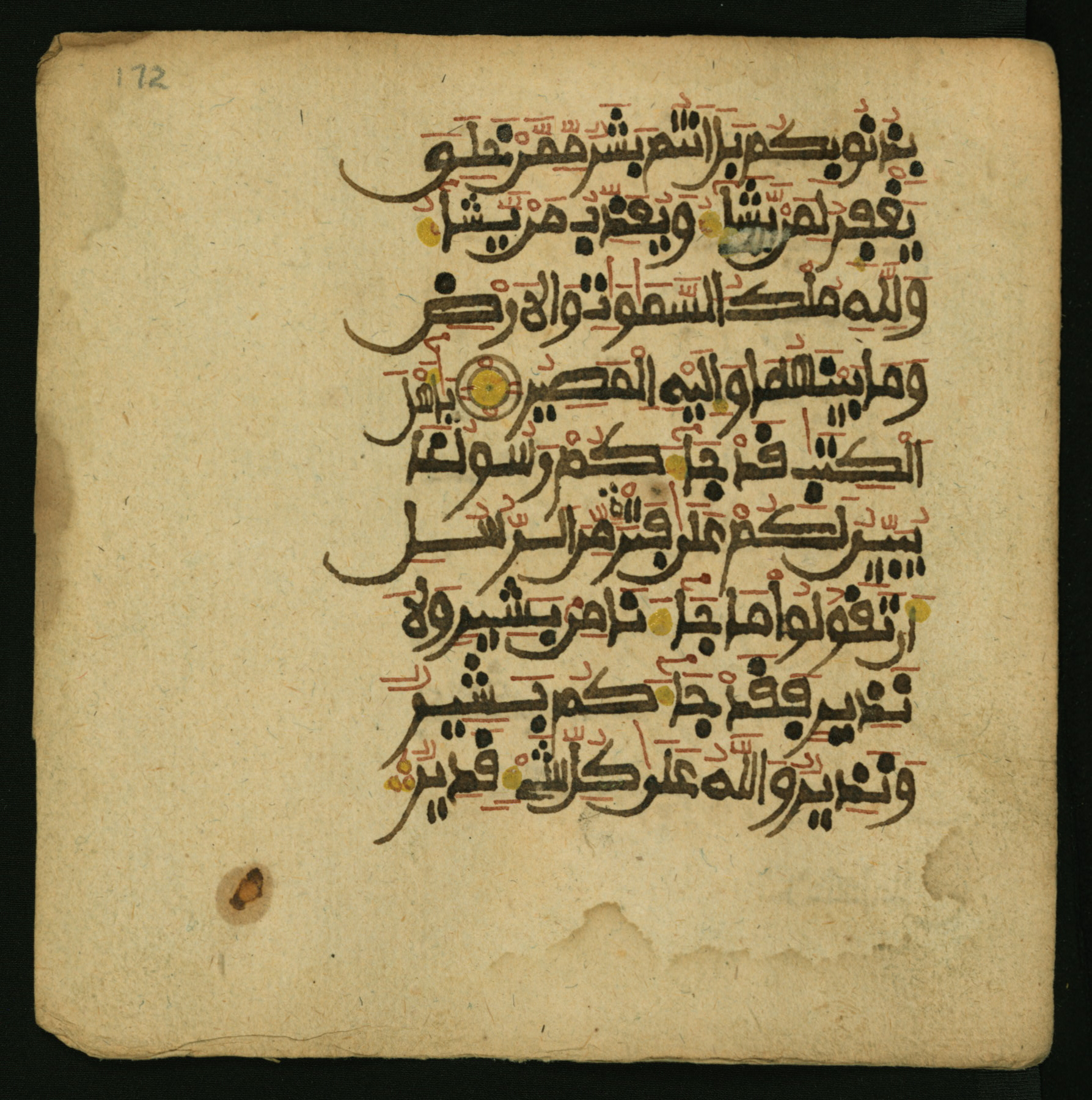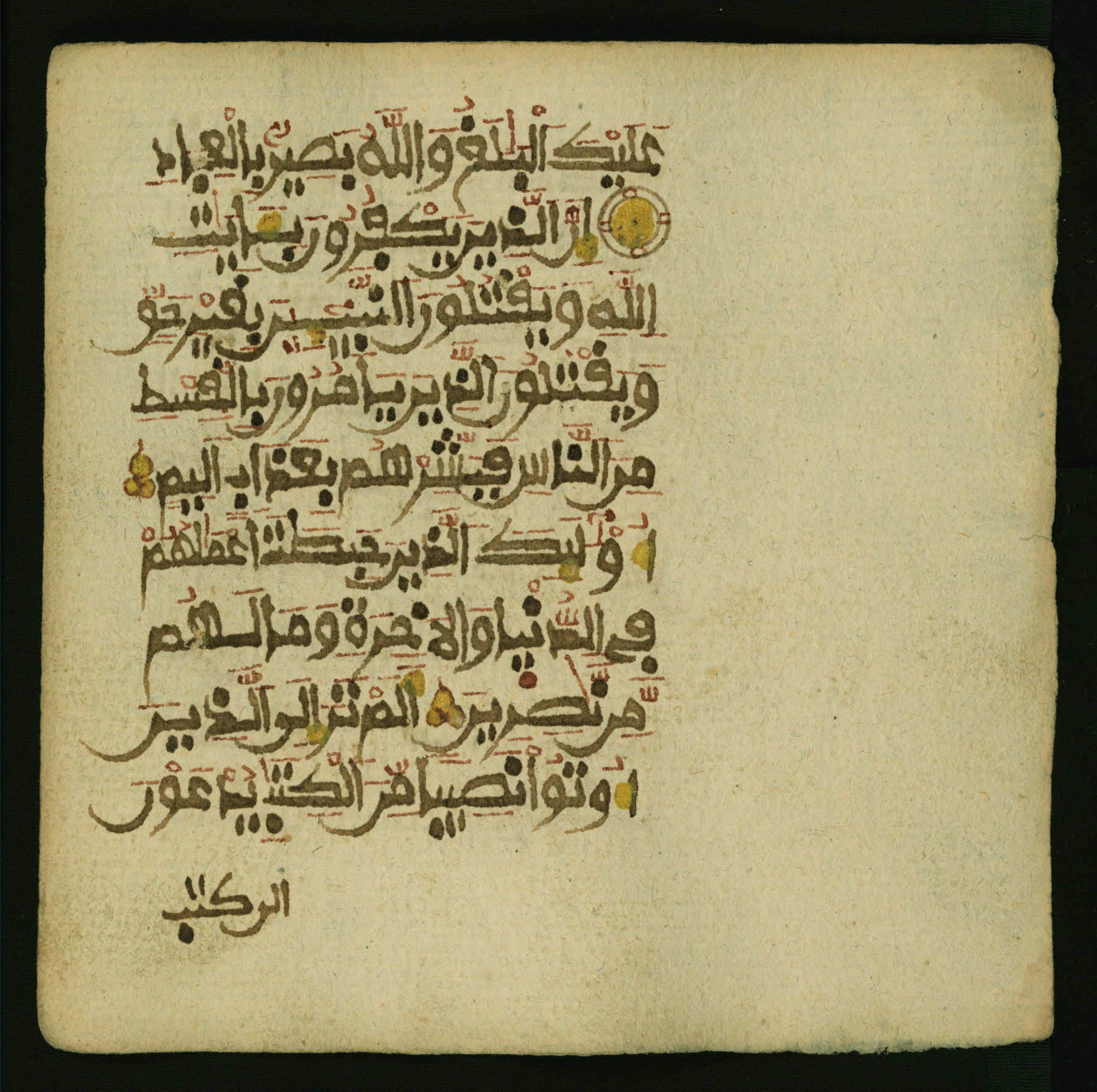 This square-format manuscript is volume 1, containing chapters 1-18 (Sūrat al-fātiḥah through Sūrat al-kahf), of an illuminated two-volume Qur'an produced in Sub-Saharan (West) Africa in the thirteenth century AH / nineteenth CE. The text is written in Sūdānī script in dark brown ink with vocalization in red on loose leaves. Chapter headings are in reddish-brown ink. Three yellow dots outlined in red arranged in a triangular form separate verses. Polychrome circular medallions as well as square and rectangular devices in a variety of patterns and colors mark textual divisions. The leaves of the text are organized between two decorated boards with geometric compositions. The pages and boards are housed in a leather pouch (satchel).