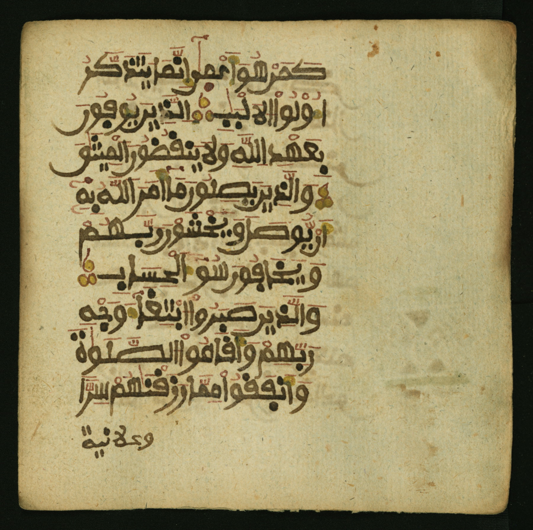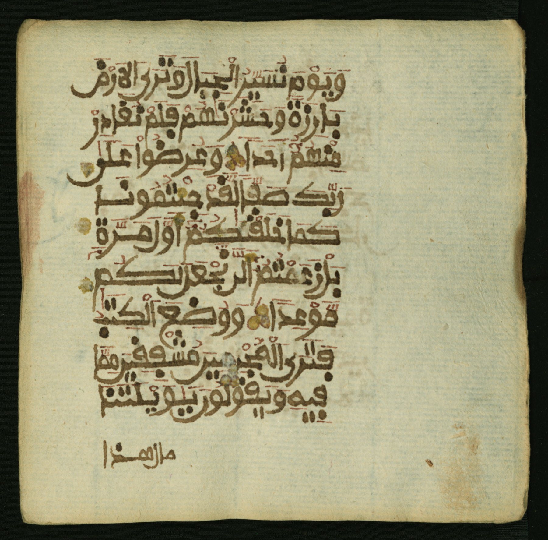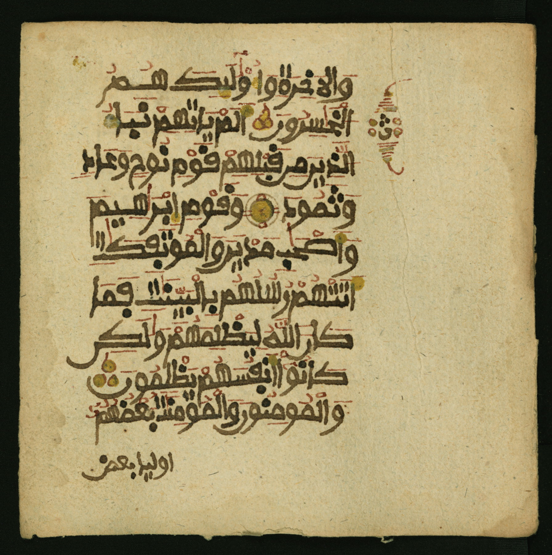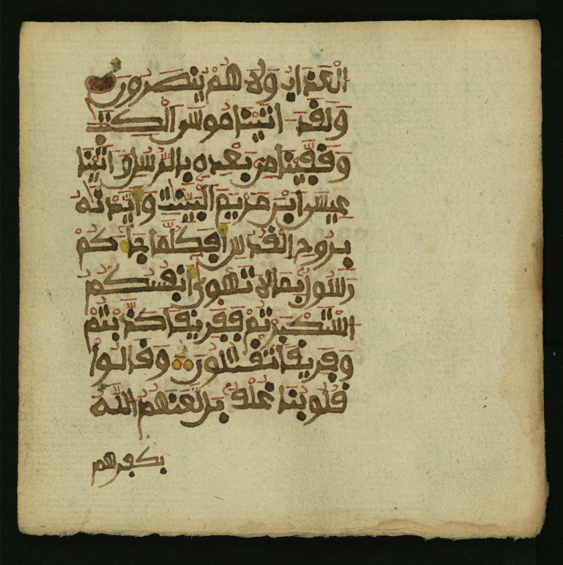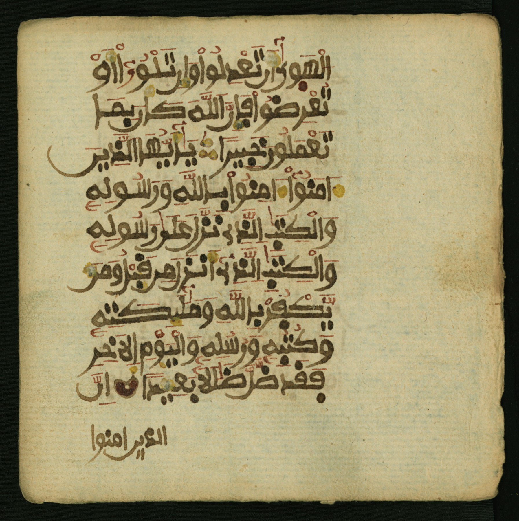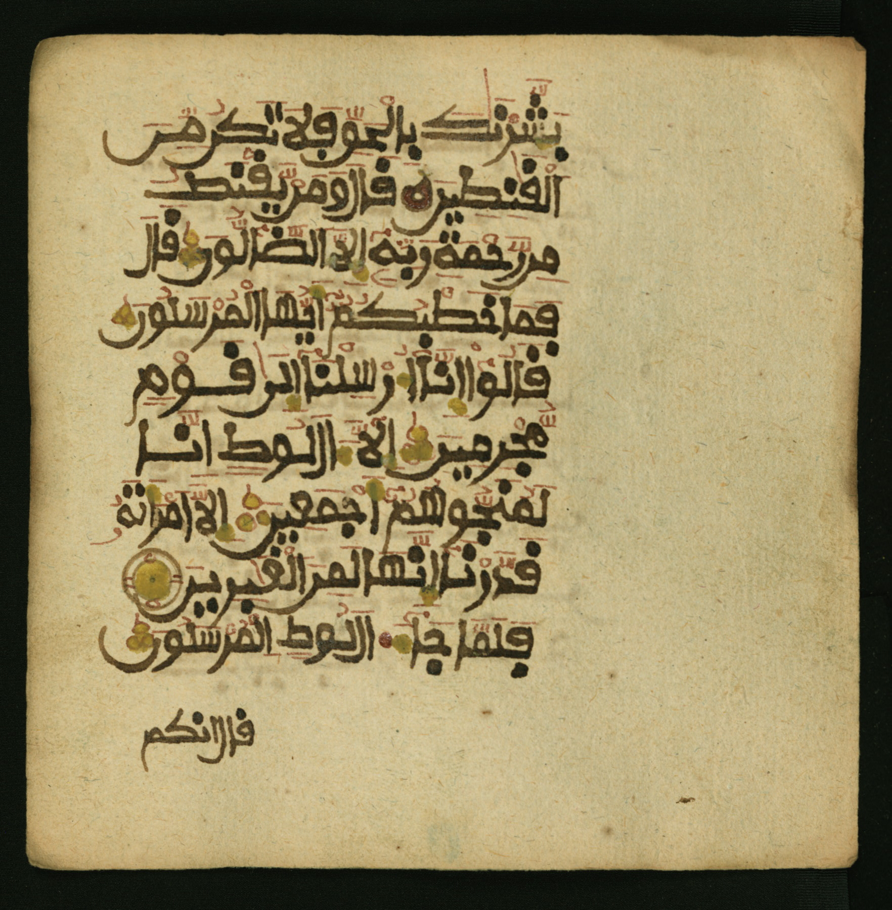 This square-format manuscript is volume 1, containing chapters 1-18 (Sūrat al-fātiḥah through Sūrat al-kahf), of an illuminated two-volume Qur'an produced in Sub-Saharan (West) Africa in the thirteenth century AH / nineteenth CE. The text is written in Sūdānī script in dark brown ink with vocalization in red on loose leaves. Chapter headings are in reddish-brown ink. Three yellow dots outlined in red arranged in a triangular form separate verses. Polychrome circular medallions as well as square and rectangular devices in a variety of patterns and colors mark textual divisions. The leaves of the text are organized between two decorated boards with geometric compositions. The pages and boards are housed in a leather pouch (satchel).