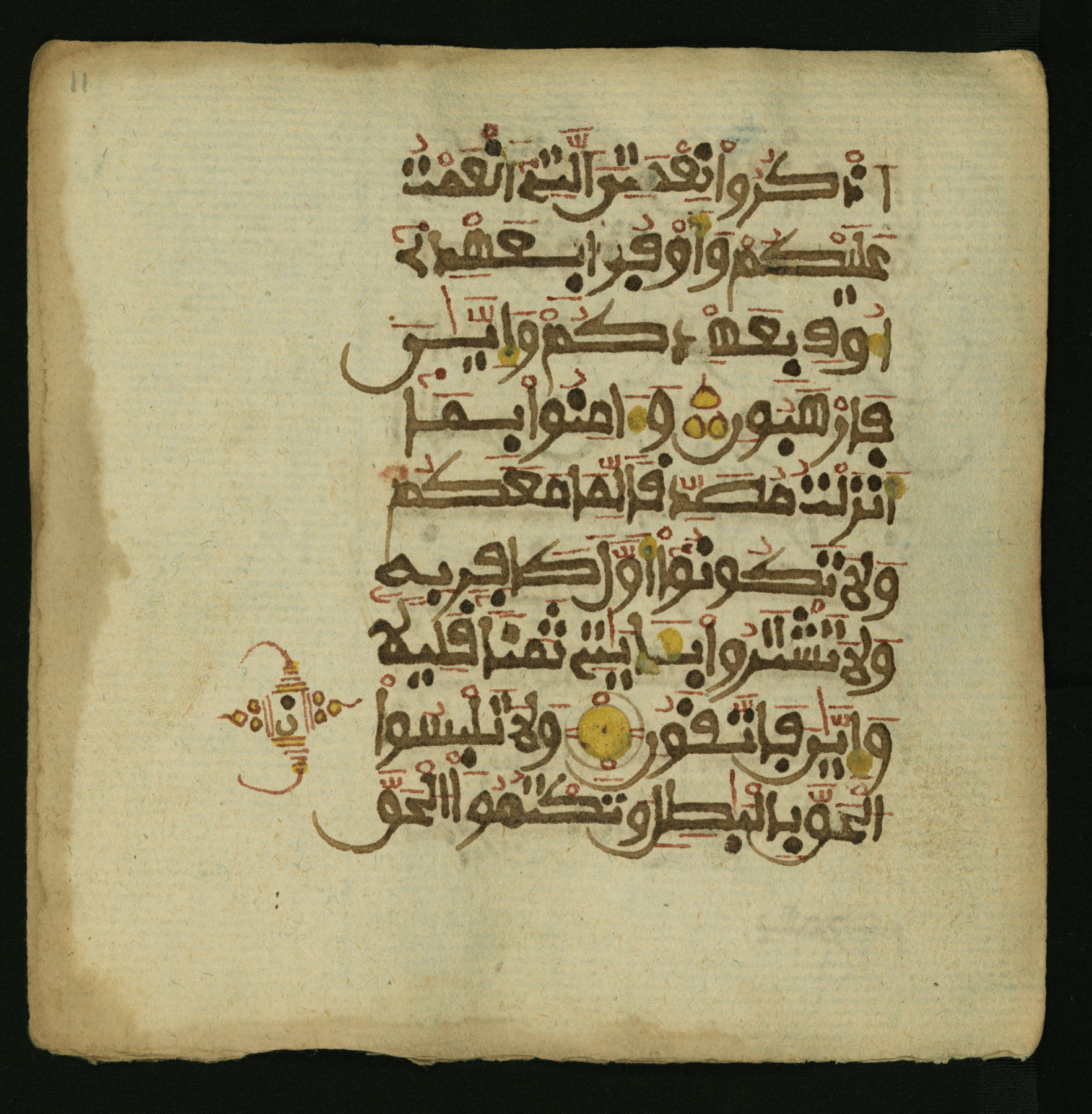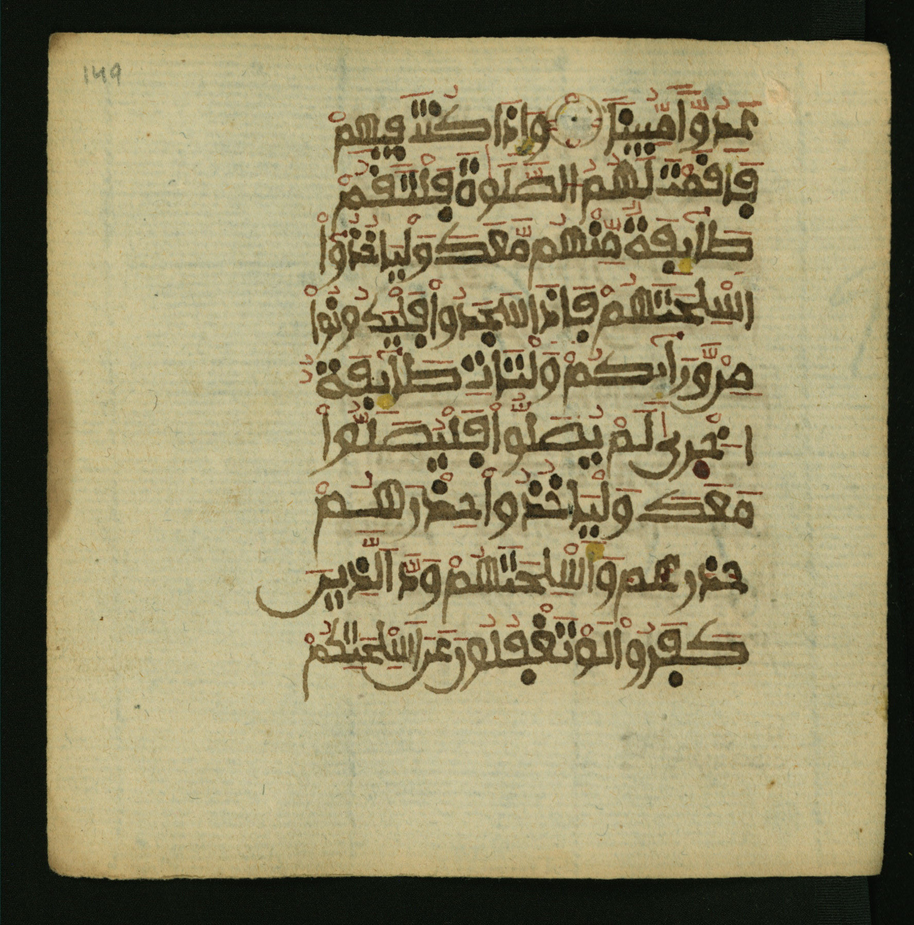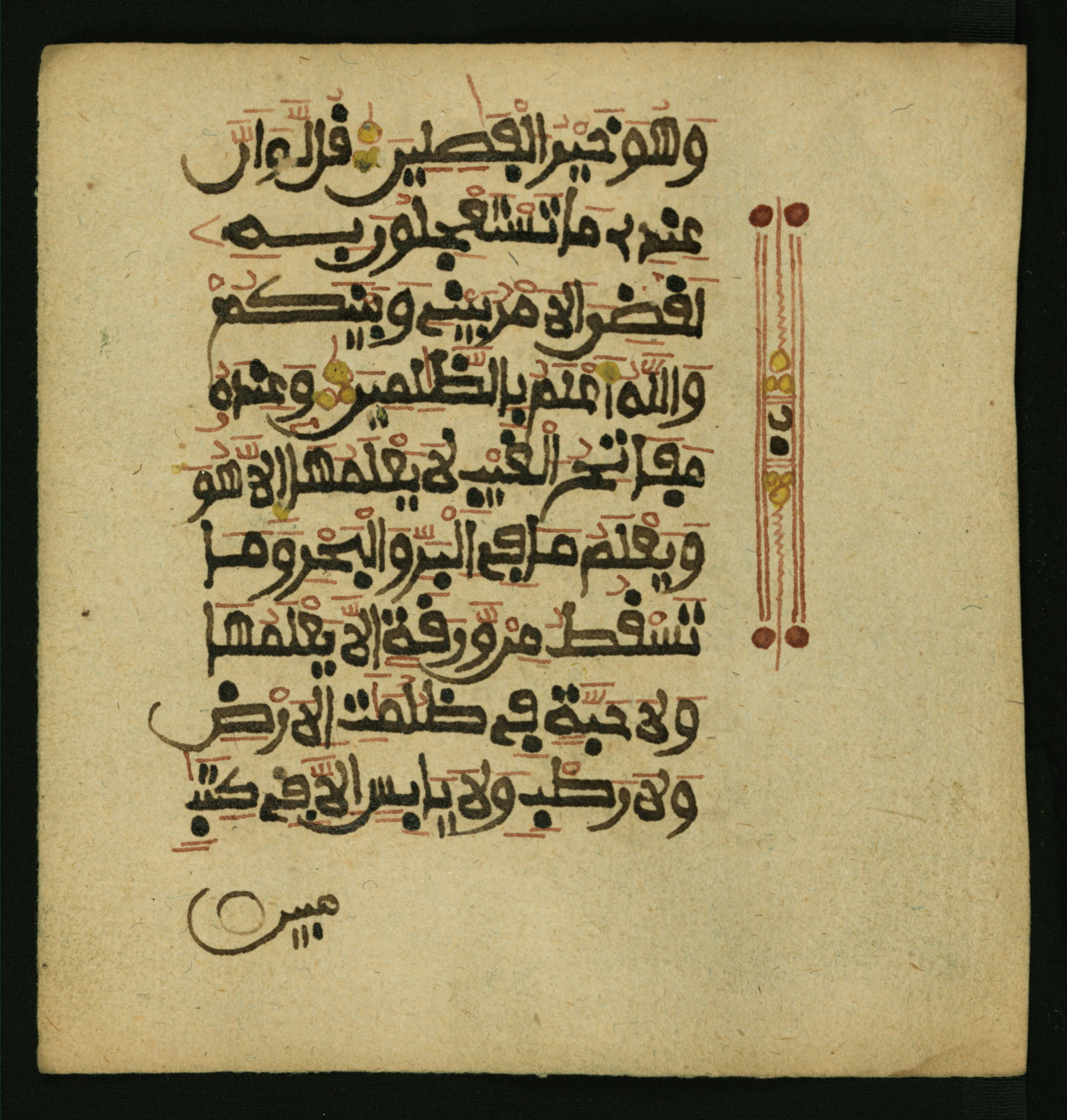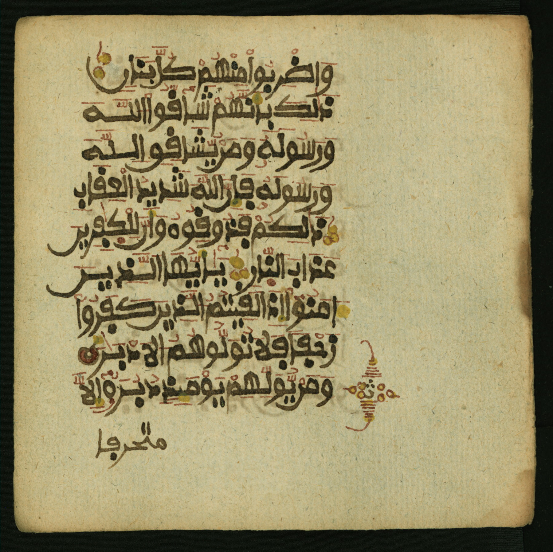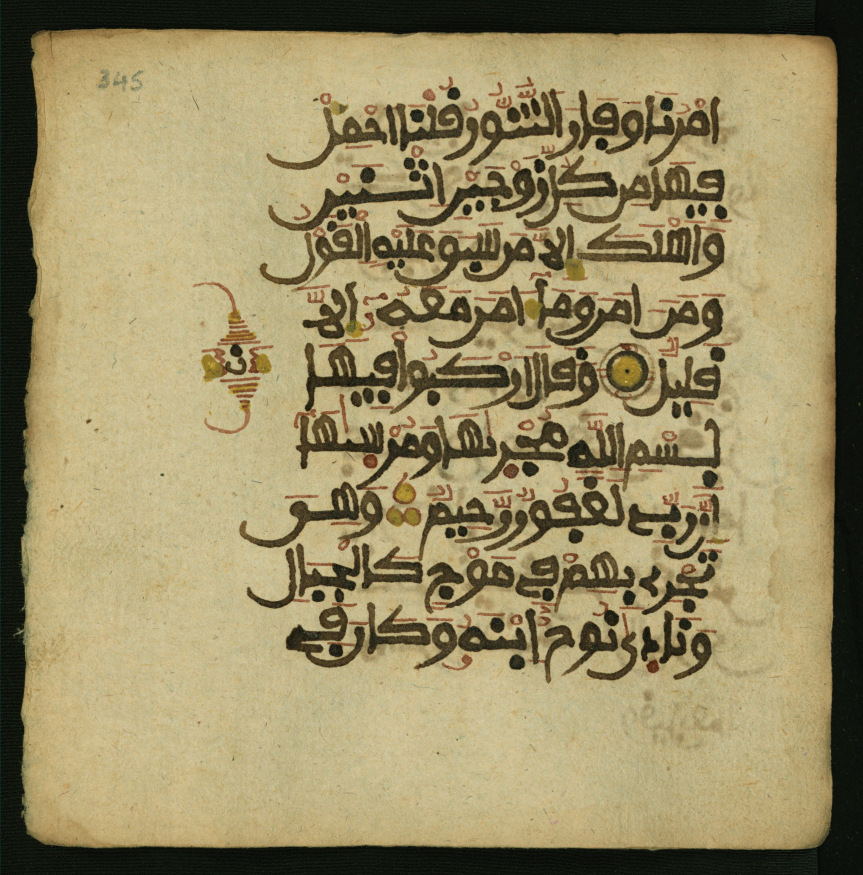 This square-format manuscript is volume 1, containing chapters 1-18 (Sūrat al-fātiḥah through Sūrat al-kahf), of an illuminated two-volume Qur'an produced in Sub-Saharan (West) Africa in the thirteenth century AH / nineteenth CE. The text is written in Sūdānī script in dark brown ink with vocalization in red on loose leaves. Chapter headings are in reddish-brown ink. Three yellow dots outlined in red arranged in a triangular form separate verses. Polychrome circular medallions as well as square and rectangular devices in a variety of patterns and colors mark textual divisions. The leaves of the text are organized between two decorated boards with geometric compositions. The pages and boards are housed in a leather pouch (satchel).
