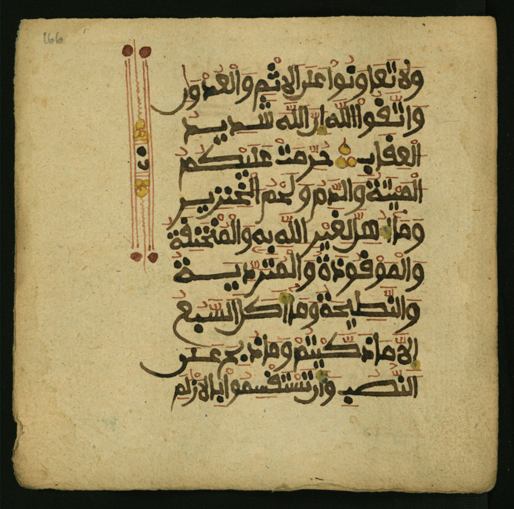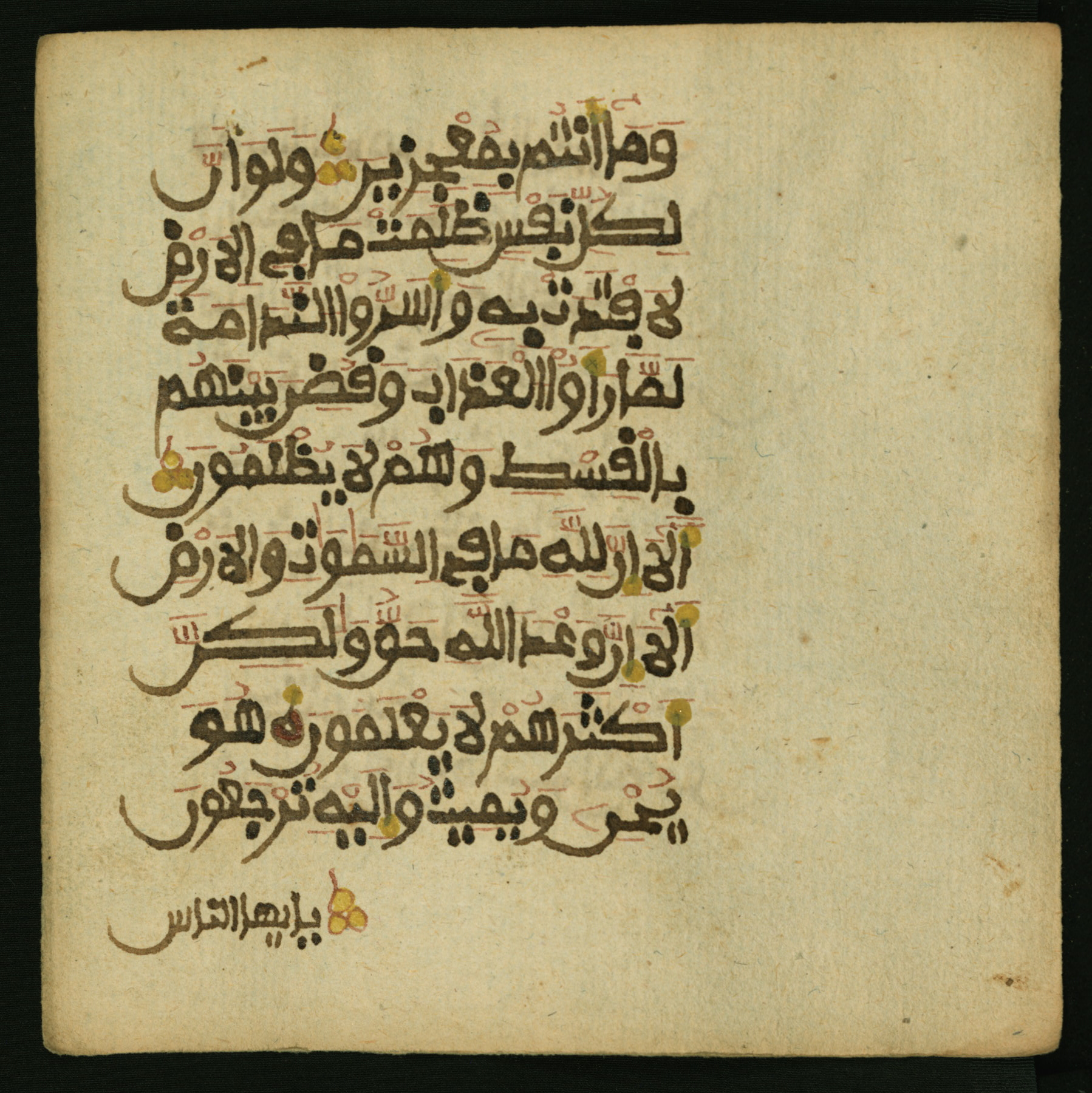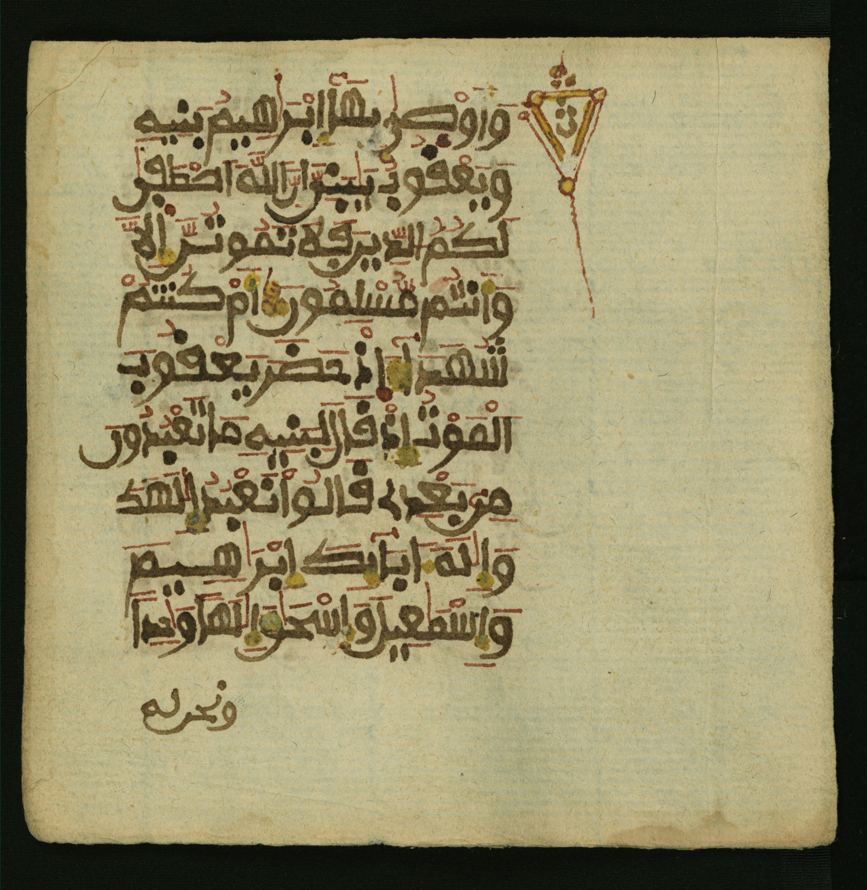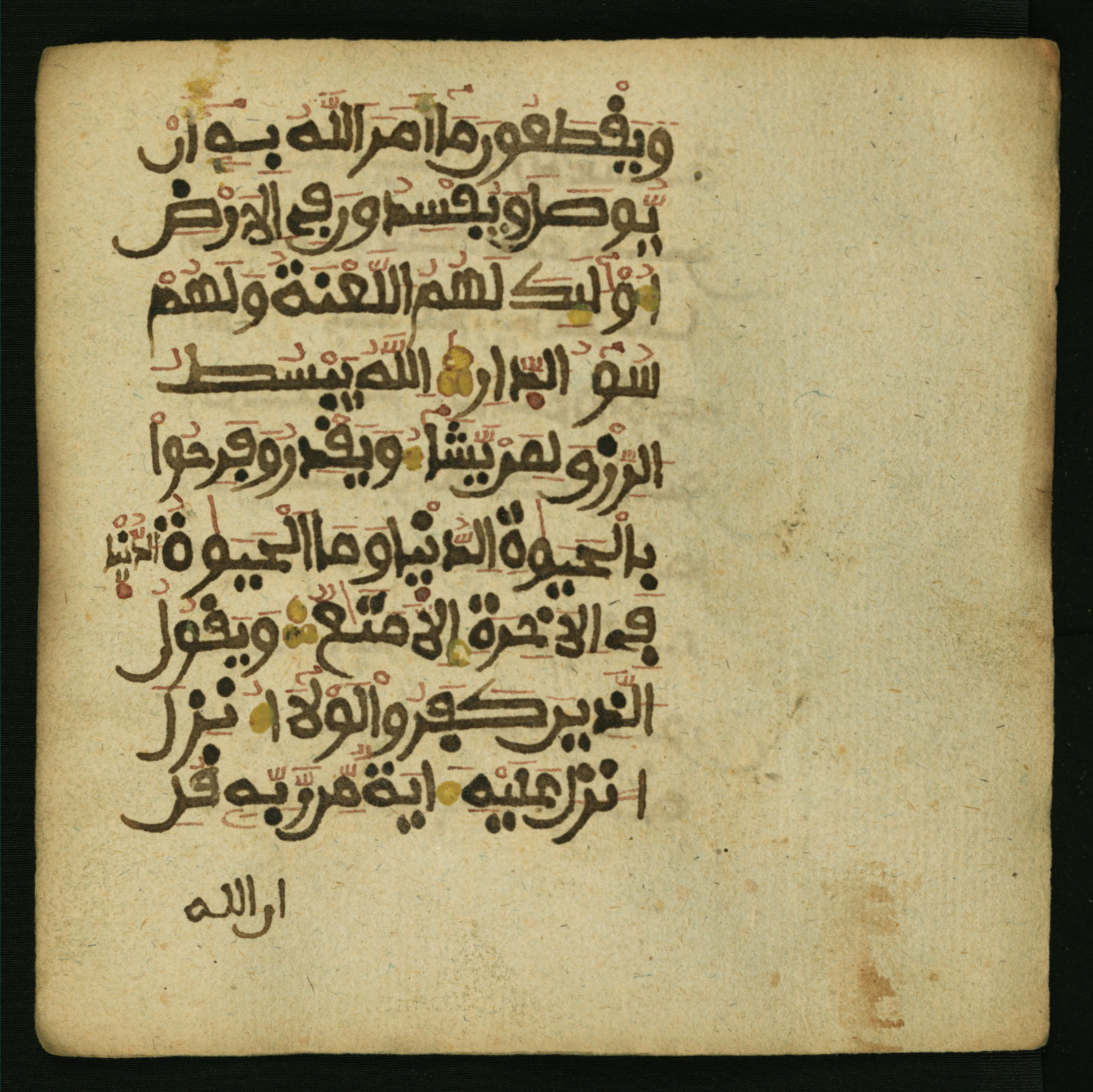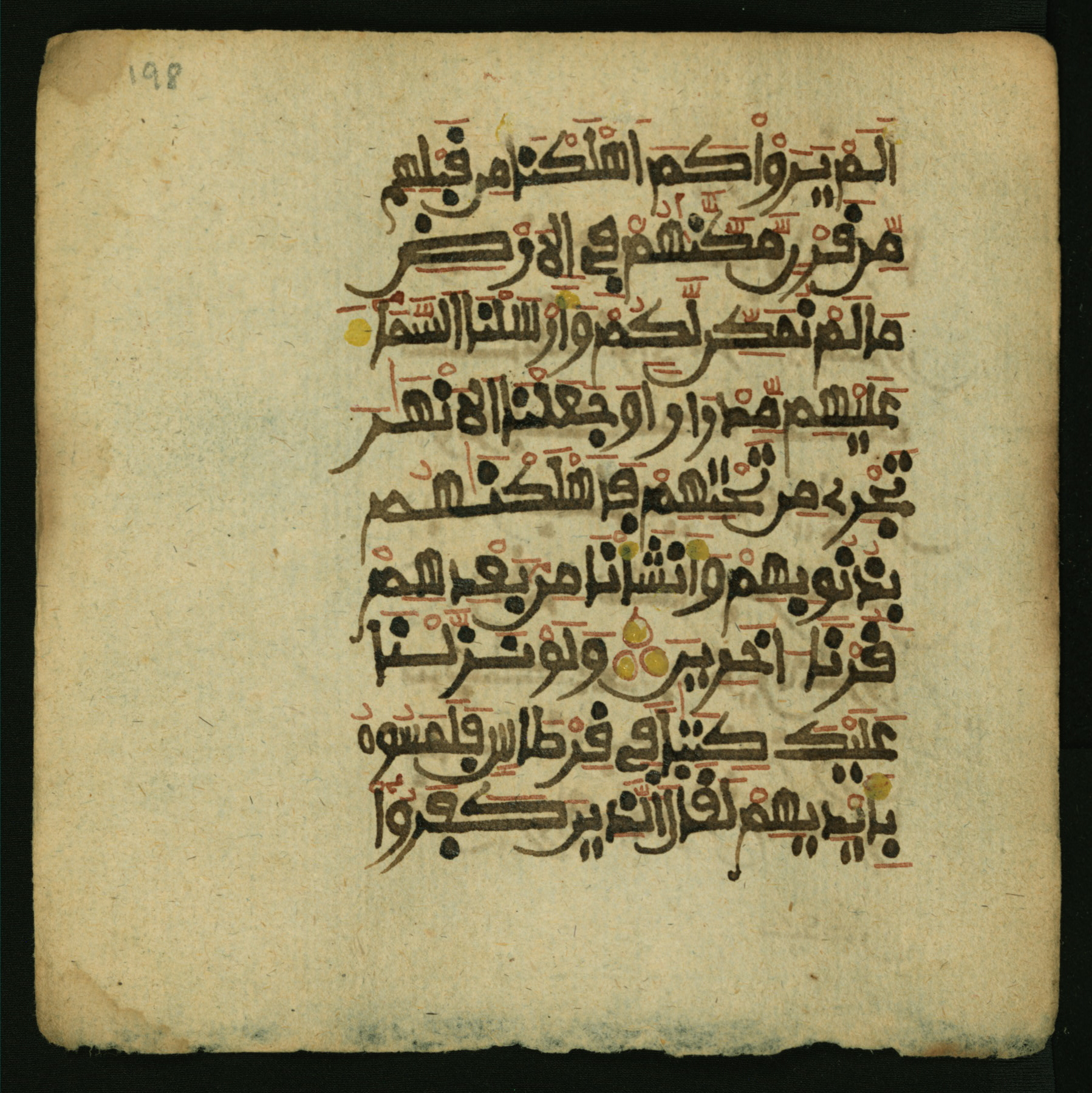 This square-format manuscript is volume 1, containing chapters 1-18 (Sūrat al-fātiḥah through Sūrat al-kahf), of an illuminated two-volume Qur'an produced in Sub-Saharan (West) Africa in the thirteenth century AH / nineteenth CE. The text is written in Sūdānī script in dark brown ink with vocalization in red on loose leaves. Chapter headings are in reddish-brown ink. Three yellow dots outlined in red arranged in a triangular form separate verses. Polychrome circular medallions as well as square and rectangular devices in a variety of patterns and colors mark textual divisions. The leaves of the text are organized between two decorated boards with geometric compositions. The pages and boards are housed in a leather pouch (satchel).