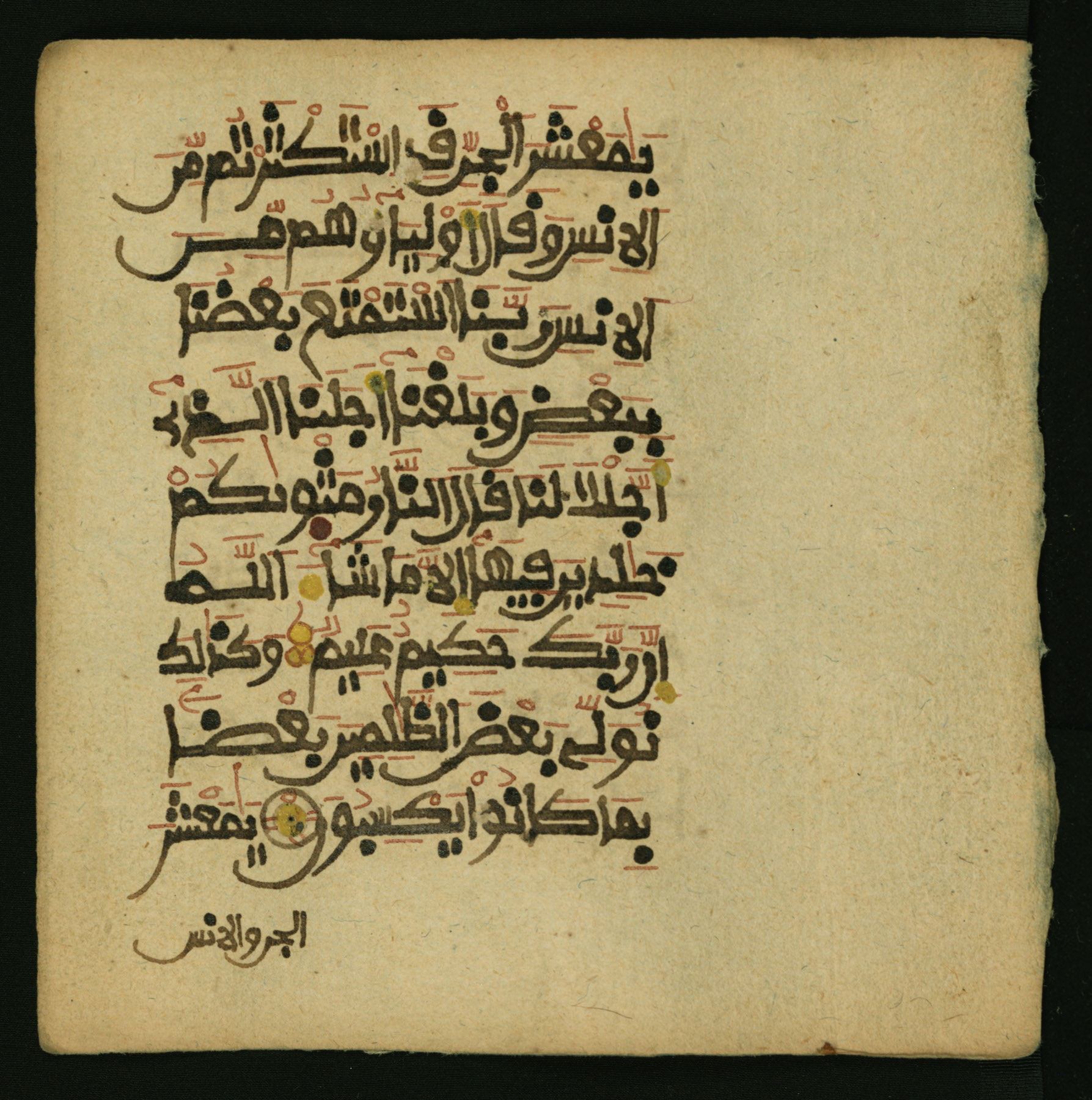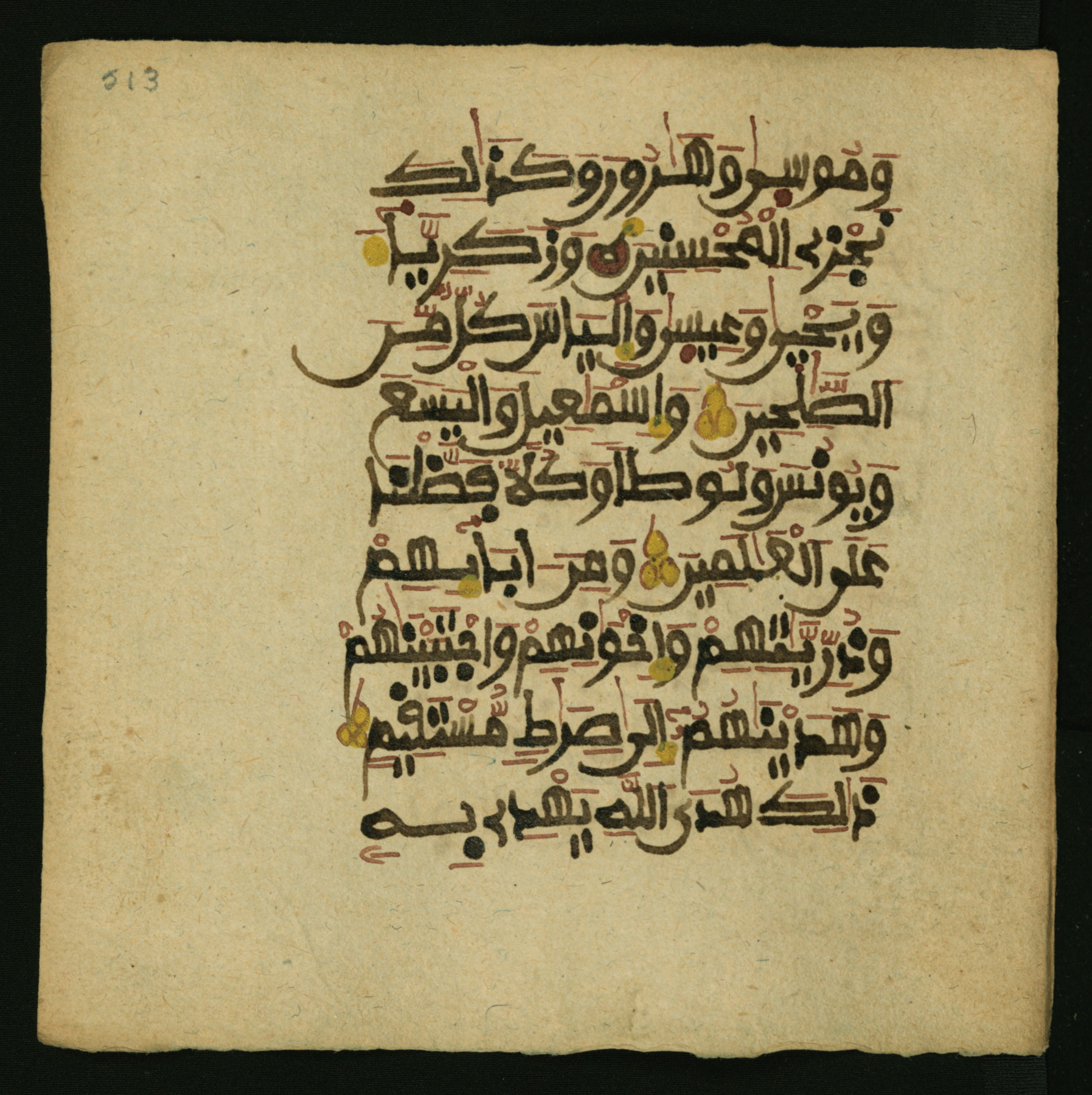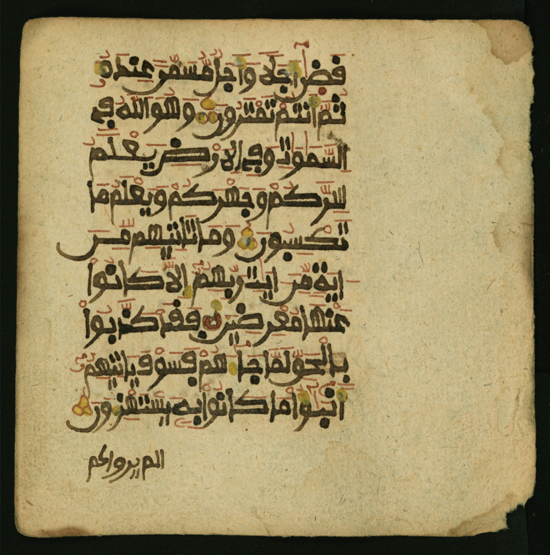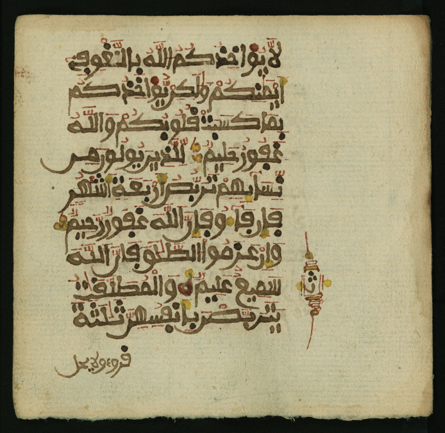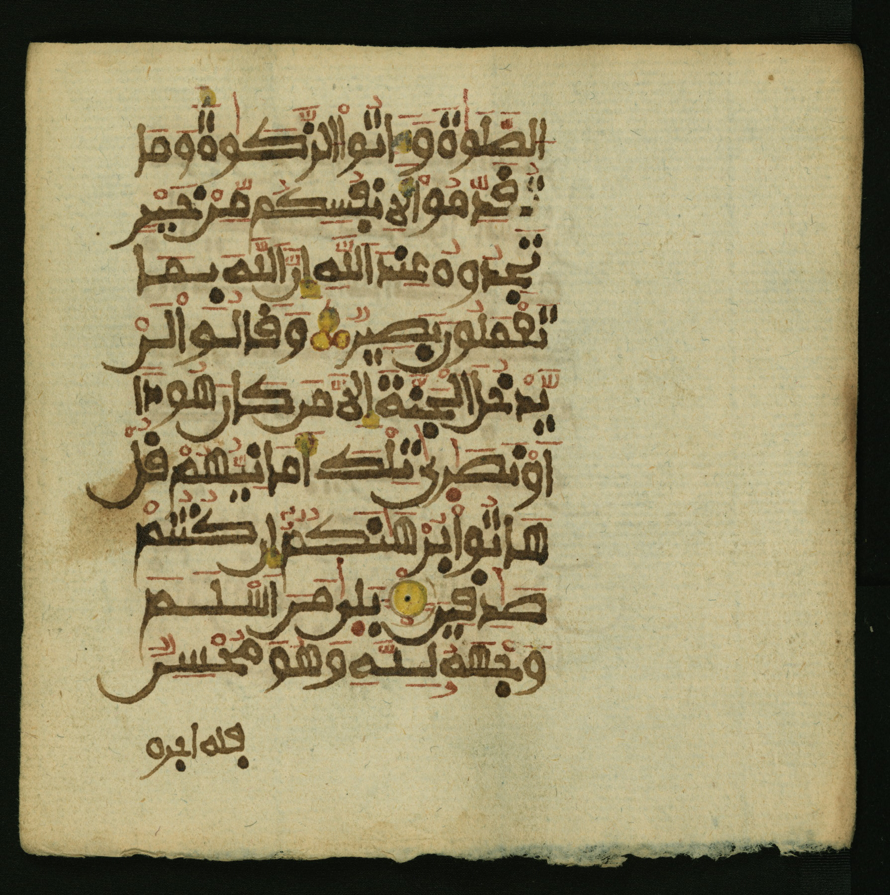 This square-format manuscript is volume 1, containing chapters 1-18 (Sūrat al-fātiḥah through Sūrat al-kahf), of an illuminated two-volume Qur'an produced in Sub-Saharan (West) Africa in the thirteenth century AH / nineteenth CE. The text is written in Sūdānī script in dark brown ink with vocalization in red on loose leaves. Chapter headings are in reddish-brown ink. Three yellow dots outlined in red arranged in a triangular form separate verses. Polychrome circular medallions as well as square and rectangular devices in a variety of patterns and colors mark textual divisions. The leaves of the text are organized between two decorated boards with geometric compositions. The pages and boards are housed in a leather pouch (satchel).