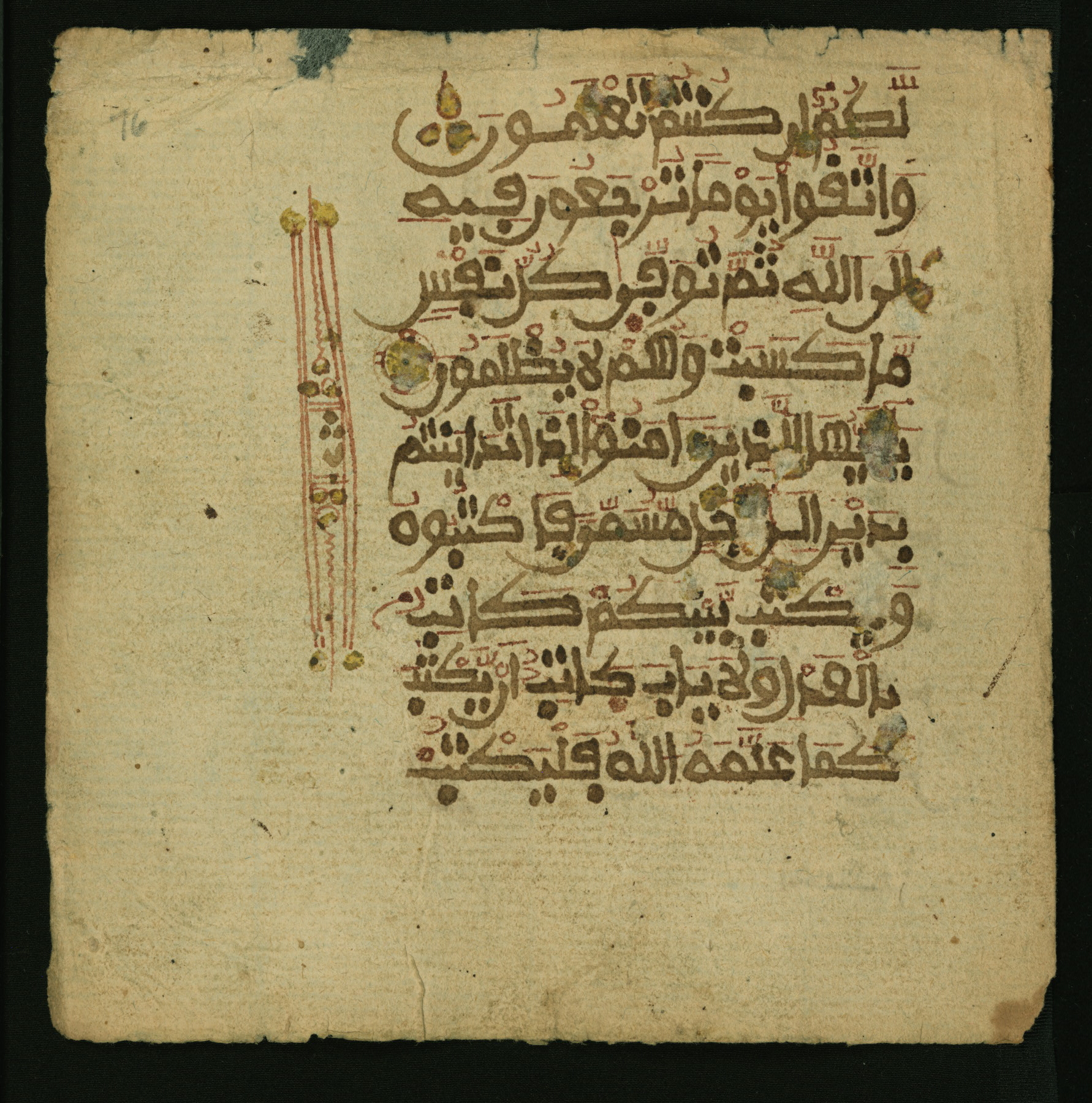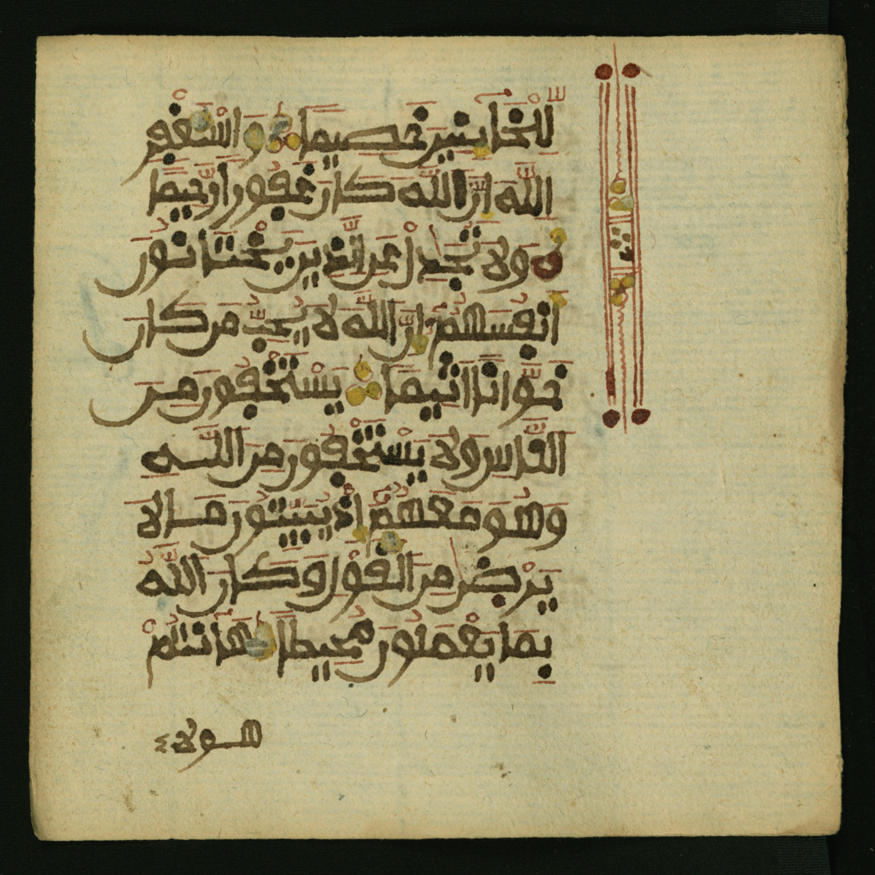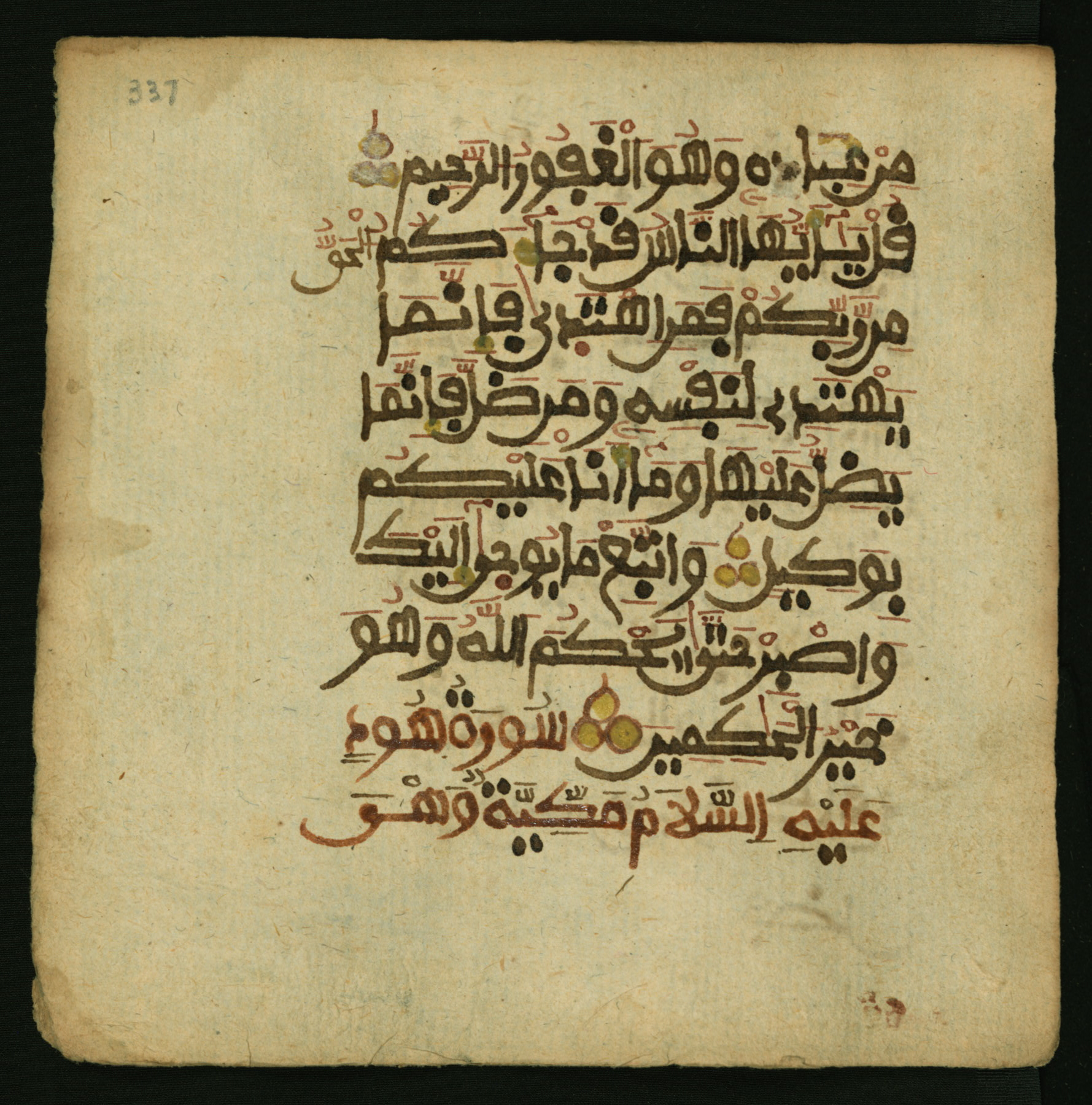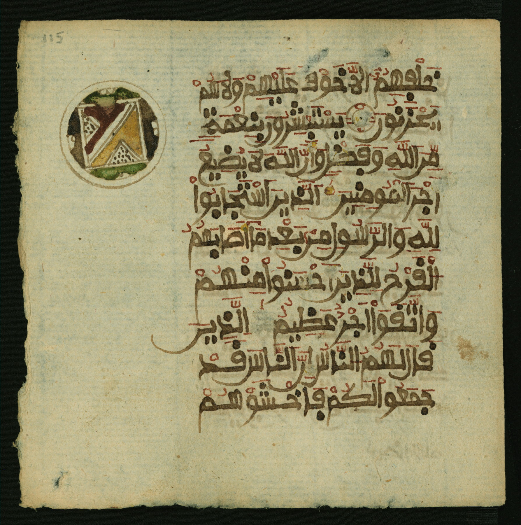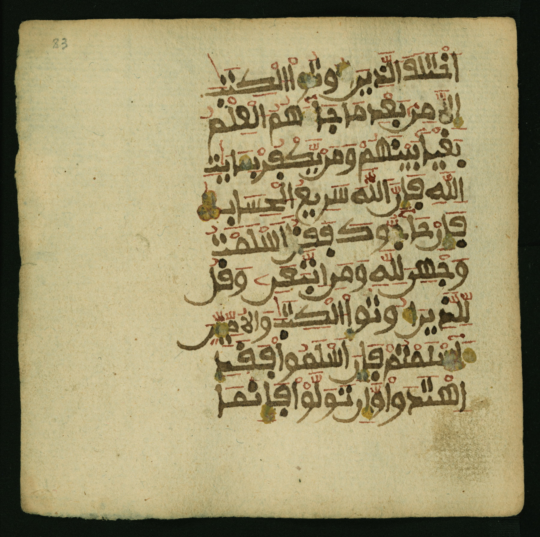 This square-format manuscript is volume 1, containing chapters 1-18 (Sūrat al-fātiḥah through Sūrat al-kahf), of an illuminated two-volume Qur'an produced in Sub-Saharan (West) Africa in the thirteenth century AH / nineteenth CE. The text is written in Sūdānī script in dark brown ink with vocalization in red on loose leaves. Chapter headings are in reddish-brown ink. Three yellow dots outlined in red arranged in a triangular form separate verses. Polychrome circular medallions as well as square and rectangular devices in a variety of patterns and colors mark textual divisions. The leaves of the text are organized between two decorated boards with geometric compositions. The pages and boards are housed in a leather pouch (satchel).