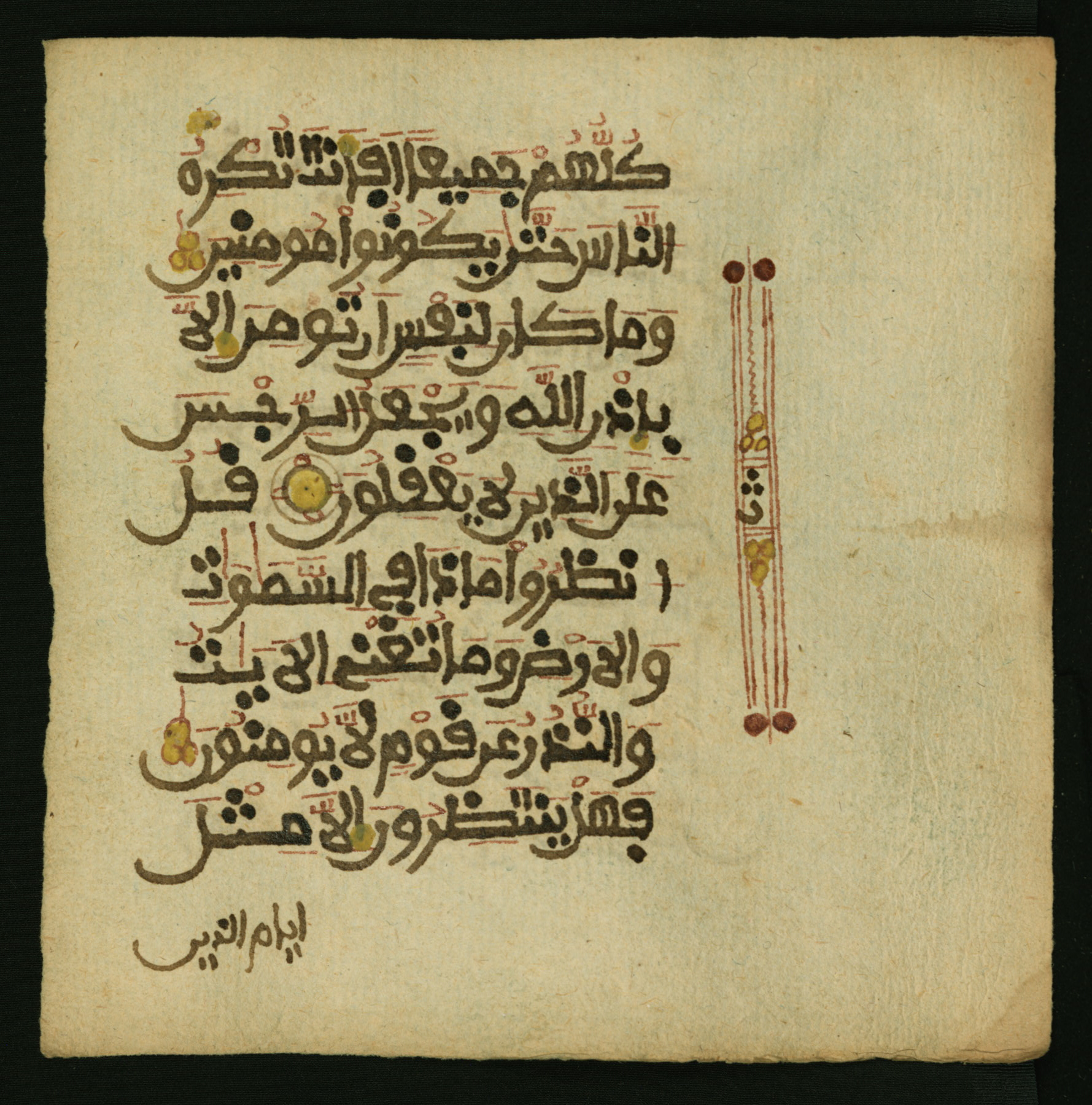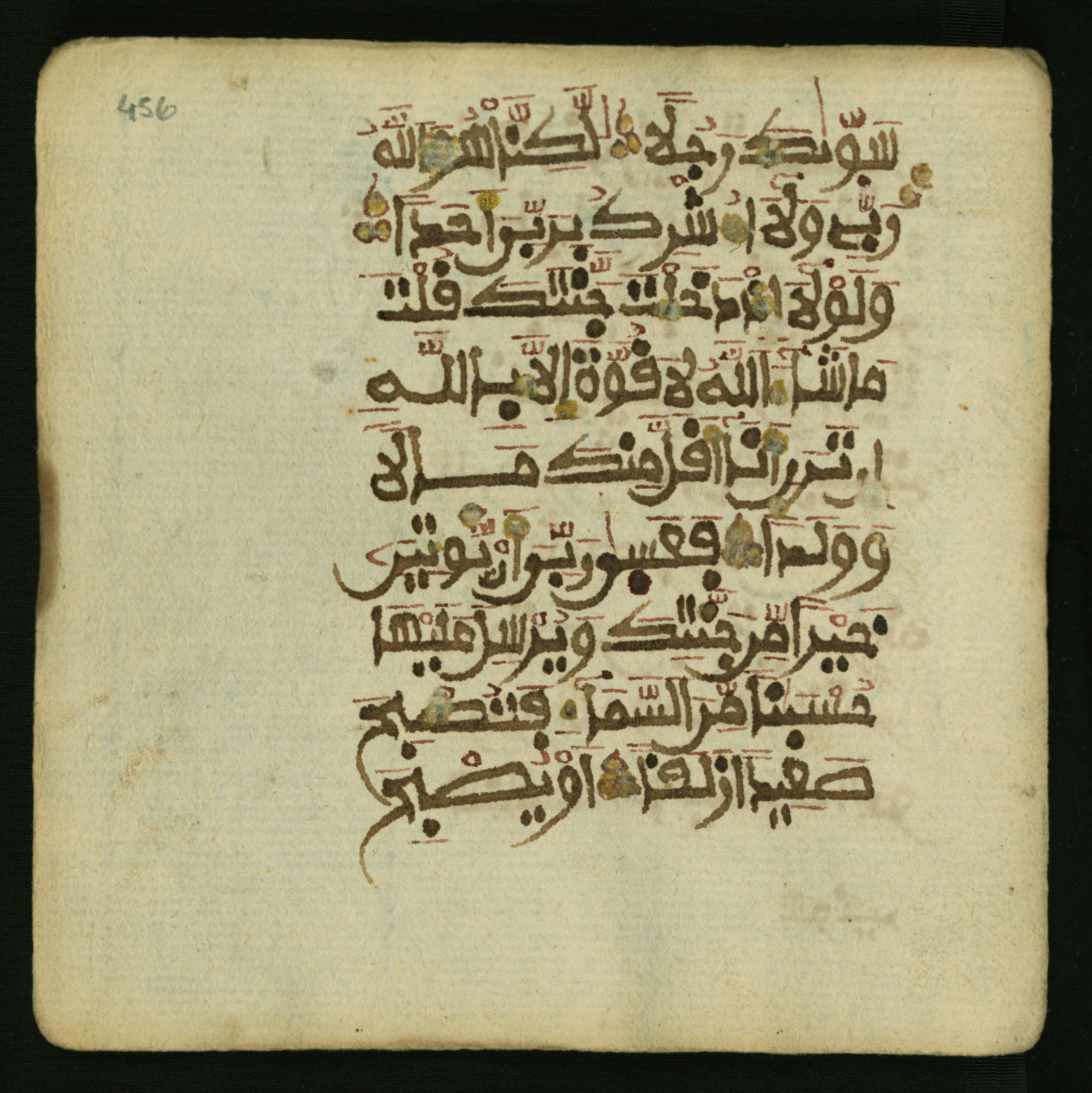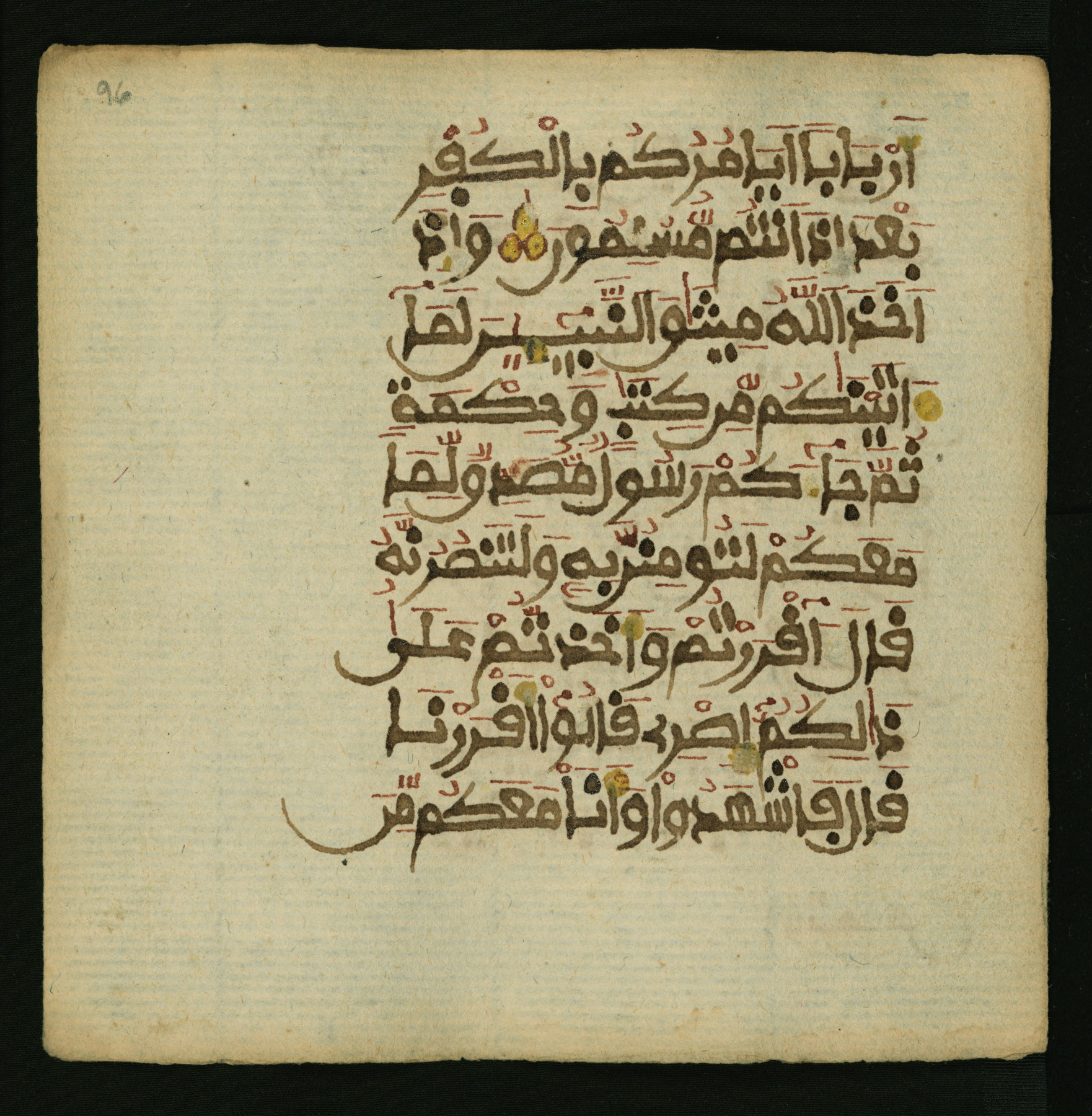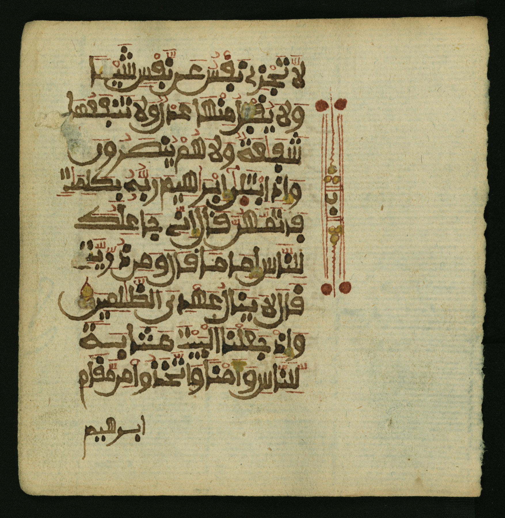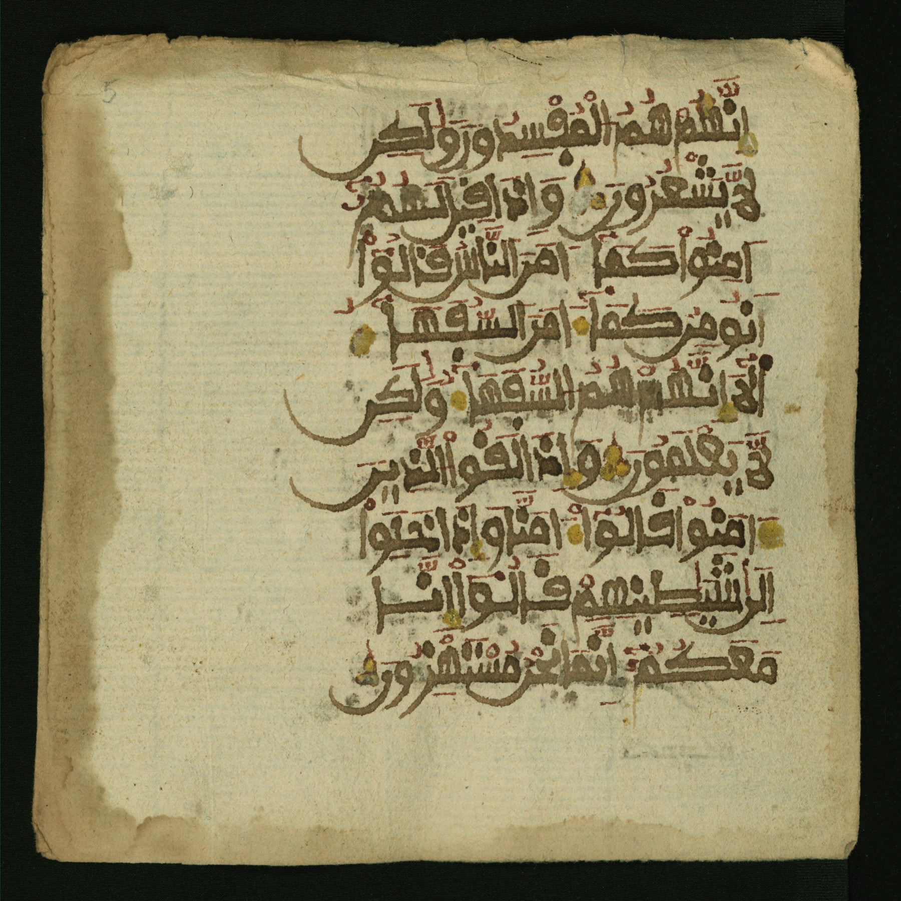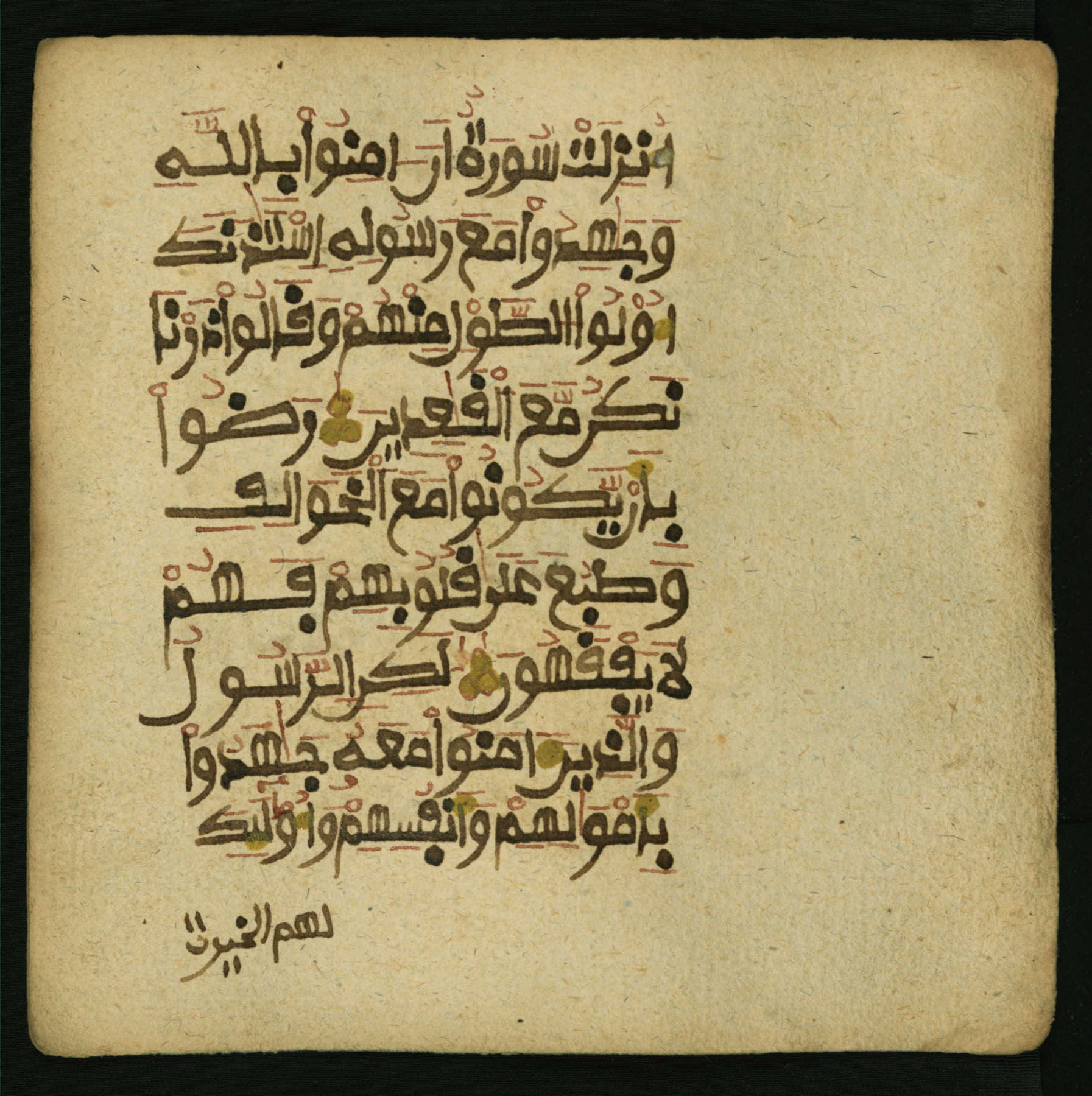This square-format manuscript is volume 1, containing chapters 1-18 (Sūrat al-fātiḥah through Sūrat al-kahf), of an illuminated two-volume Qur'an produced in Sub-Saharan (West) Africa in the thirteenth century AH / nineteenth CE. The text is written in Sūdānī script in dark brown ink with vocalization in red on loose leaves. Chapter headings are in reddish-brown ink. Three yellow dots outlined in red arranged in a triangular form separate verses. Polychrome circular medallions as well as square and rectangular devices in a variety of patterns and colors mark textual divisions. The leaves of the text are organized between two decorated boards with geometric compositions. The pages and boards are housed in a leather pouch (satchel).