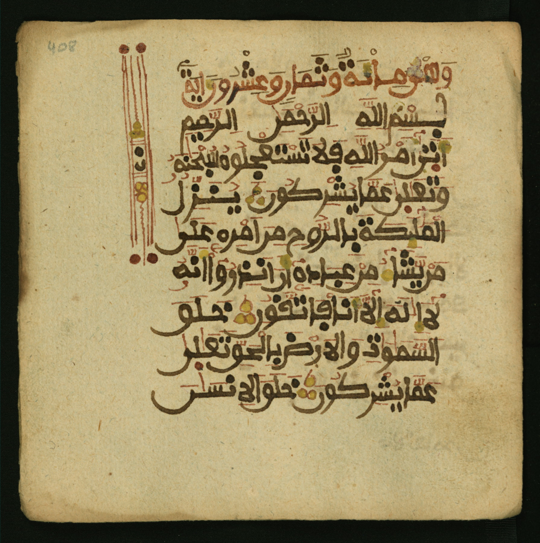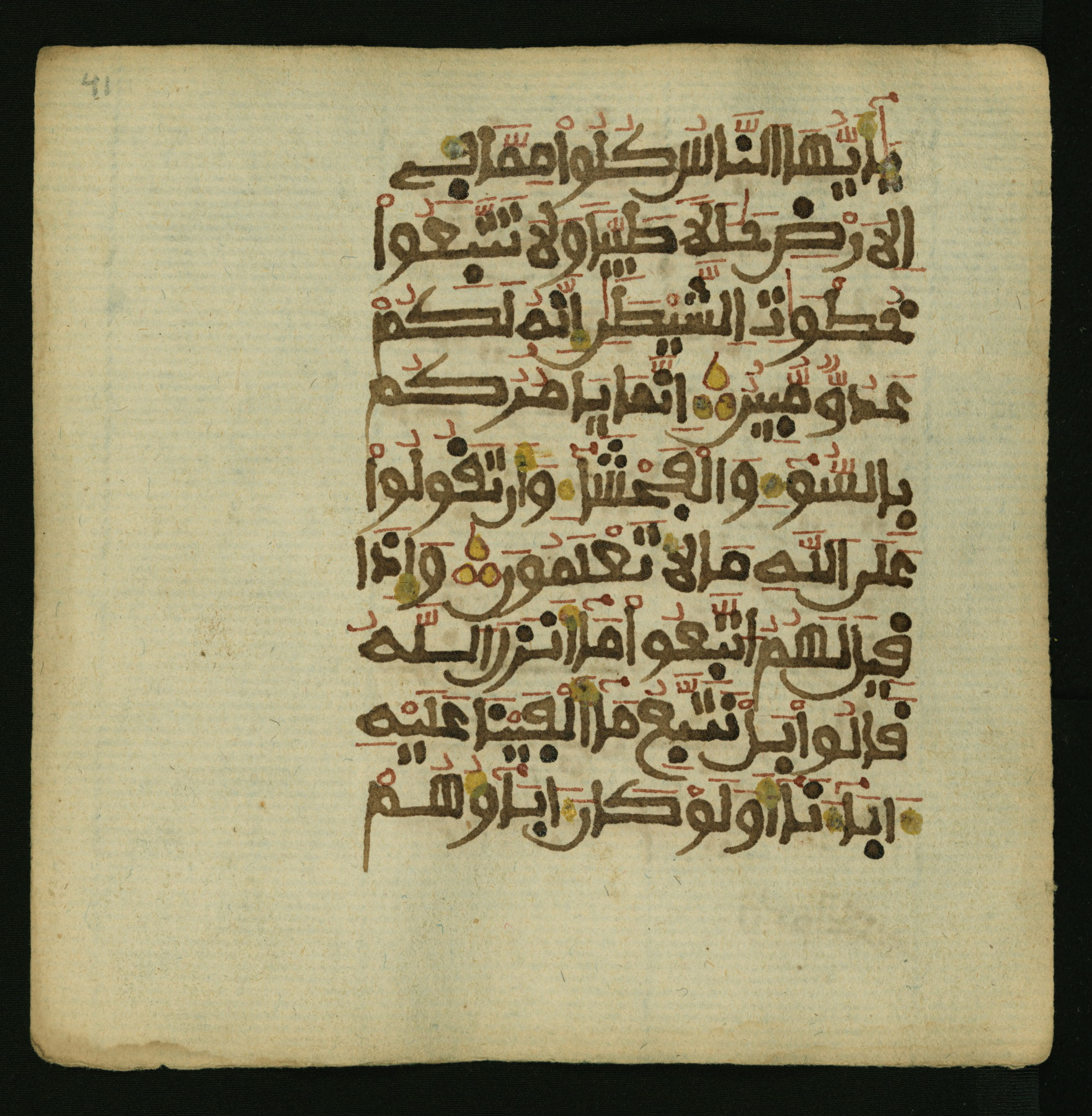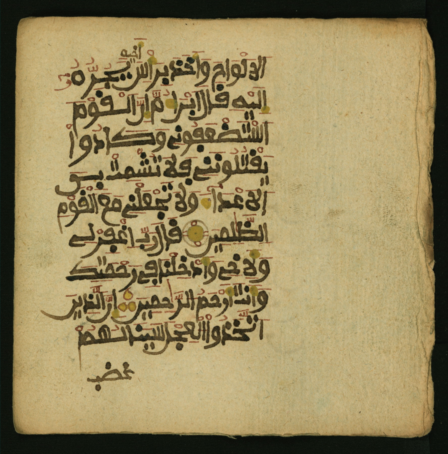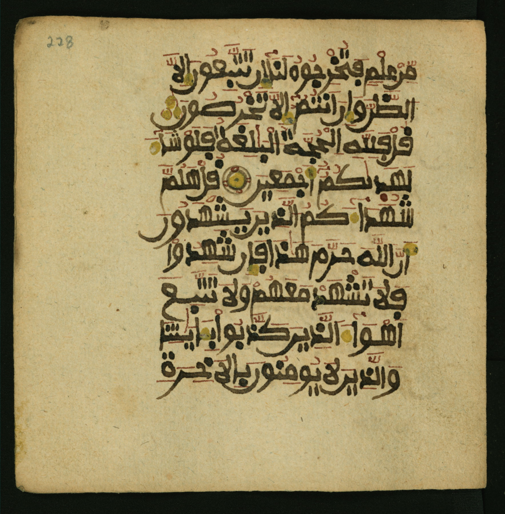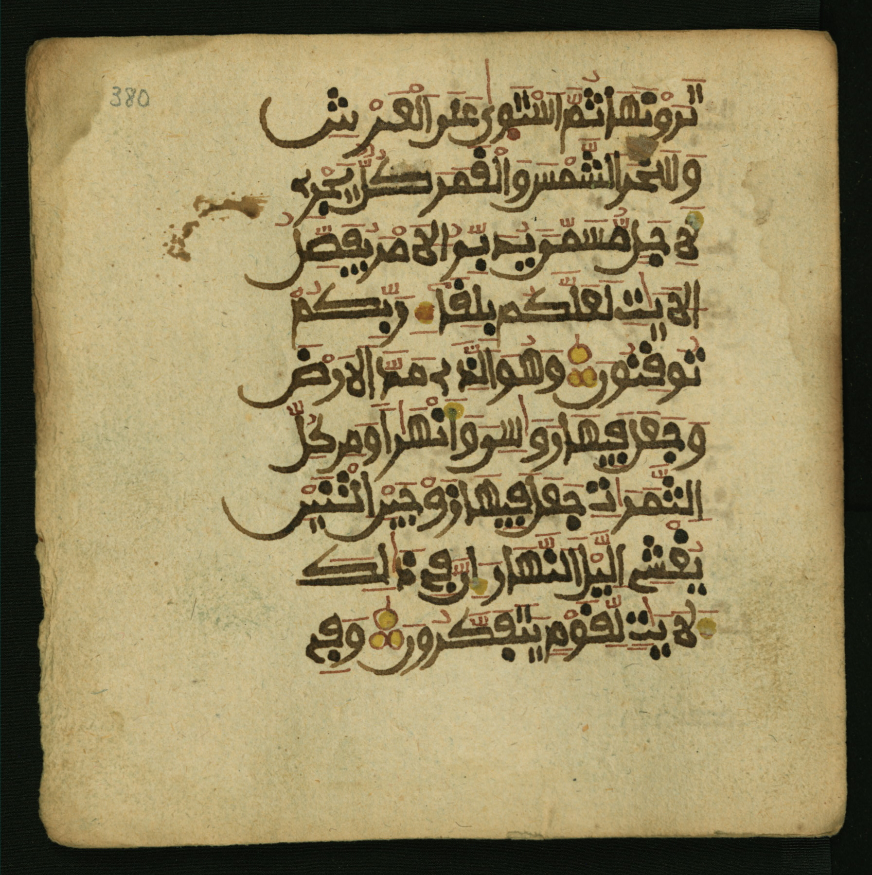 This square-format manuscript is volume 1, containing chapters 1-18 (Sūrat al-fātiḥah through Sūrat al-kahf), of an illuminated two-volume Qur'an produced in Sub-Saharan (West) Africa in the thirteenth century AH / nineteenth CE. The text is written in Sūdānī script in dark brown ink with vocalization in red on loose leaves. Chapter headings are in reddish-brown ink. Three yellow dots outlined in red arranged in a triangular form separate verses. Polychrome circular medallions as well as square and rectangular devices in a variety of patterns and colors mark textual divisions. The leaves of the text are organized between two decorated boards with geometric compositions. The pages and boards are housed in a leather pouch (satchel).