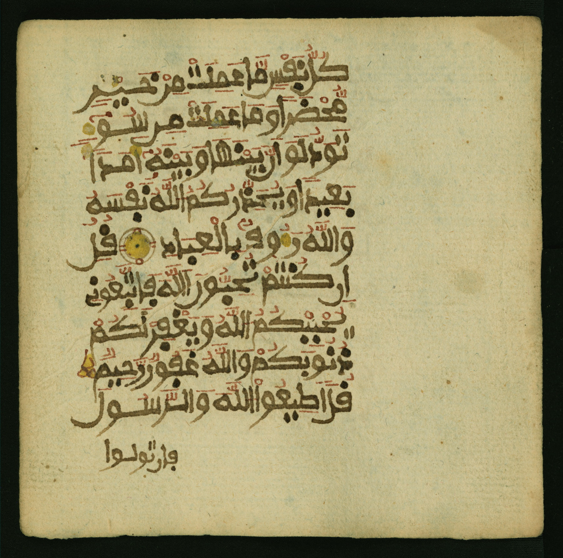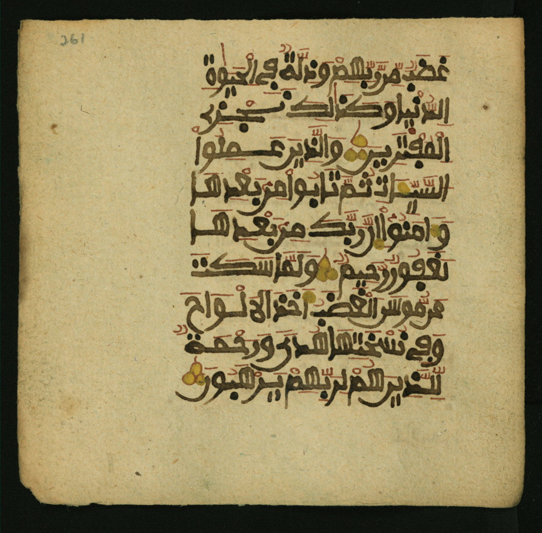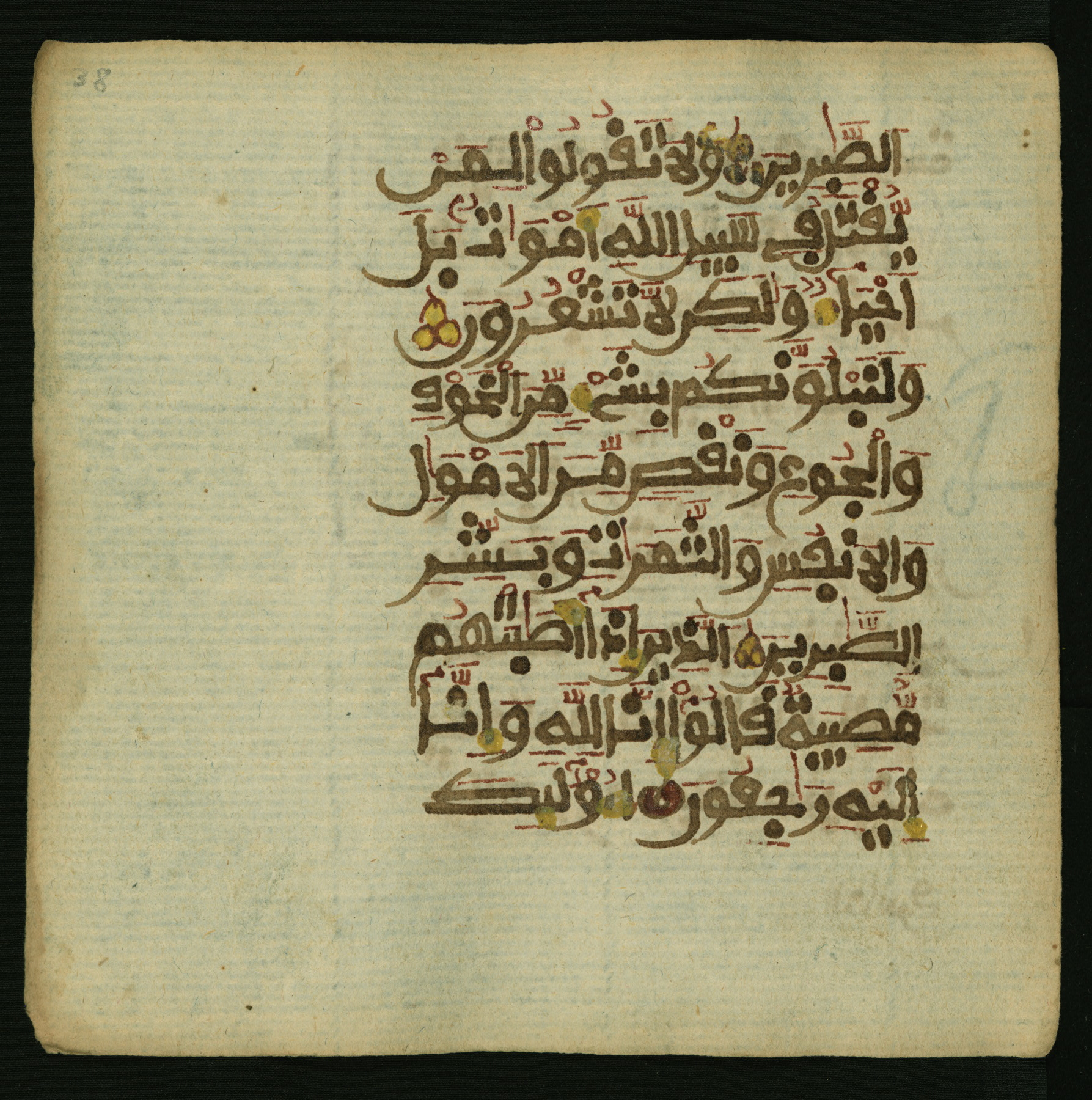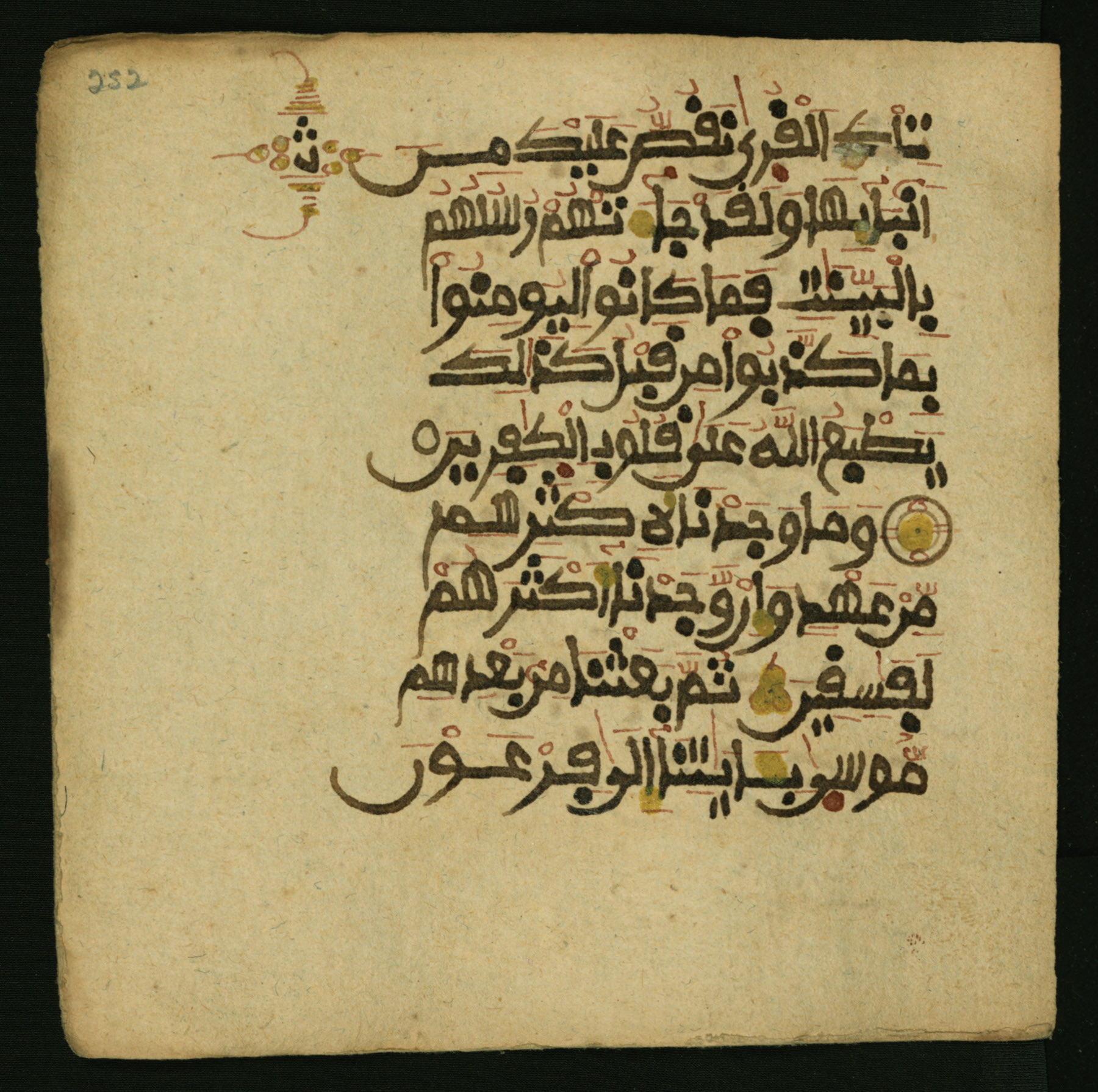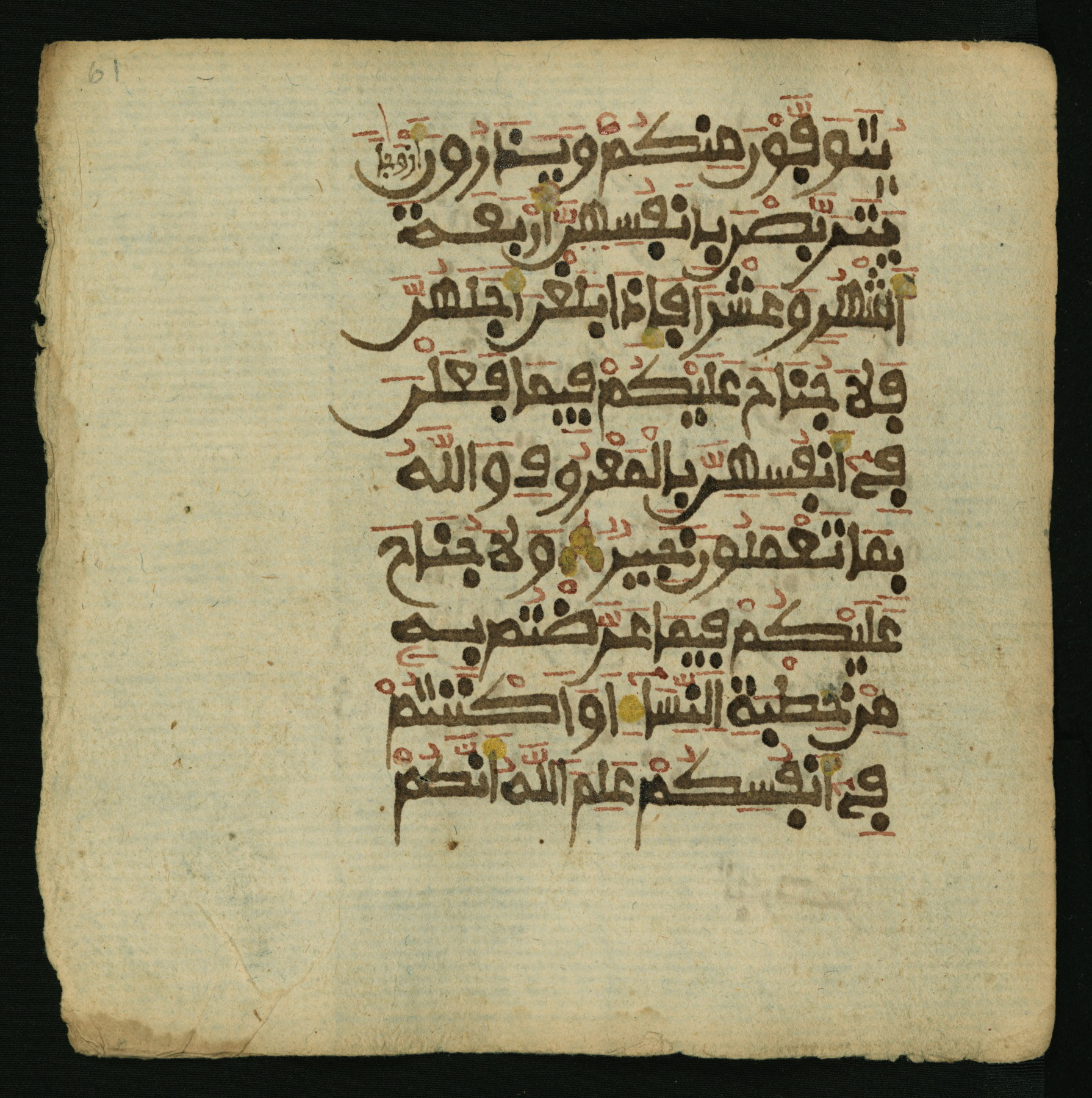 This square-format manuscript is volume 1, containing chapters 1-18 (Sūrat al-fātiḥah through Sūrat al-kahf), of an illuminated two-volume Qur'an produced in Sub-Saharan (West) Africa in the thirteenth century AH / nineteenth CE. The text is written in Sūdānī script in dark brown ink with vocalization in red on loose leaves. Chapter headings are in reddish-brown ink. Three yellow dots outlined in red arranged in a triangular form separate verses. Polychrome circular medallions as well as square and rectangular devices in a variety of patterns and colors mark textual divisions. The leaves of the text are organized between two decorated boards with geometric compositions. The pages and boards are housed in a leather pouch (satchel).