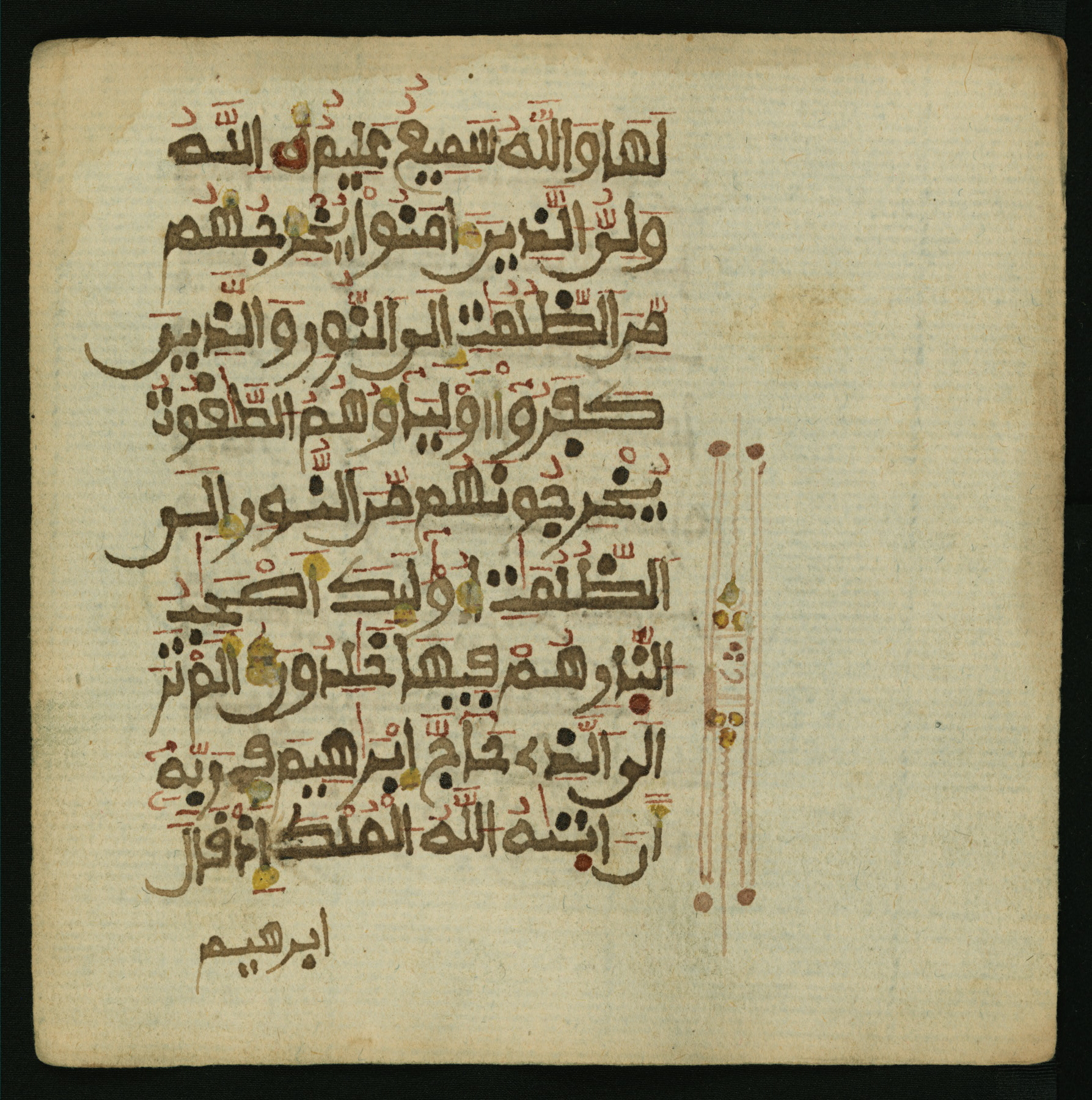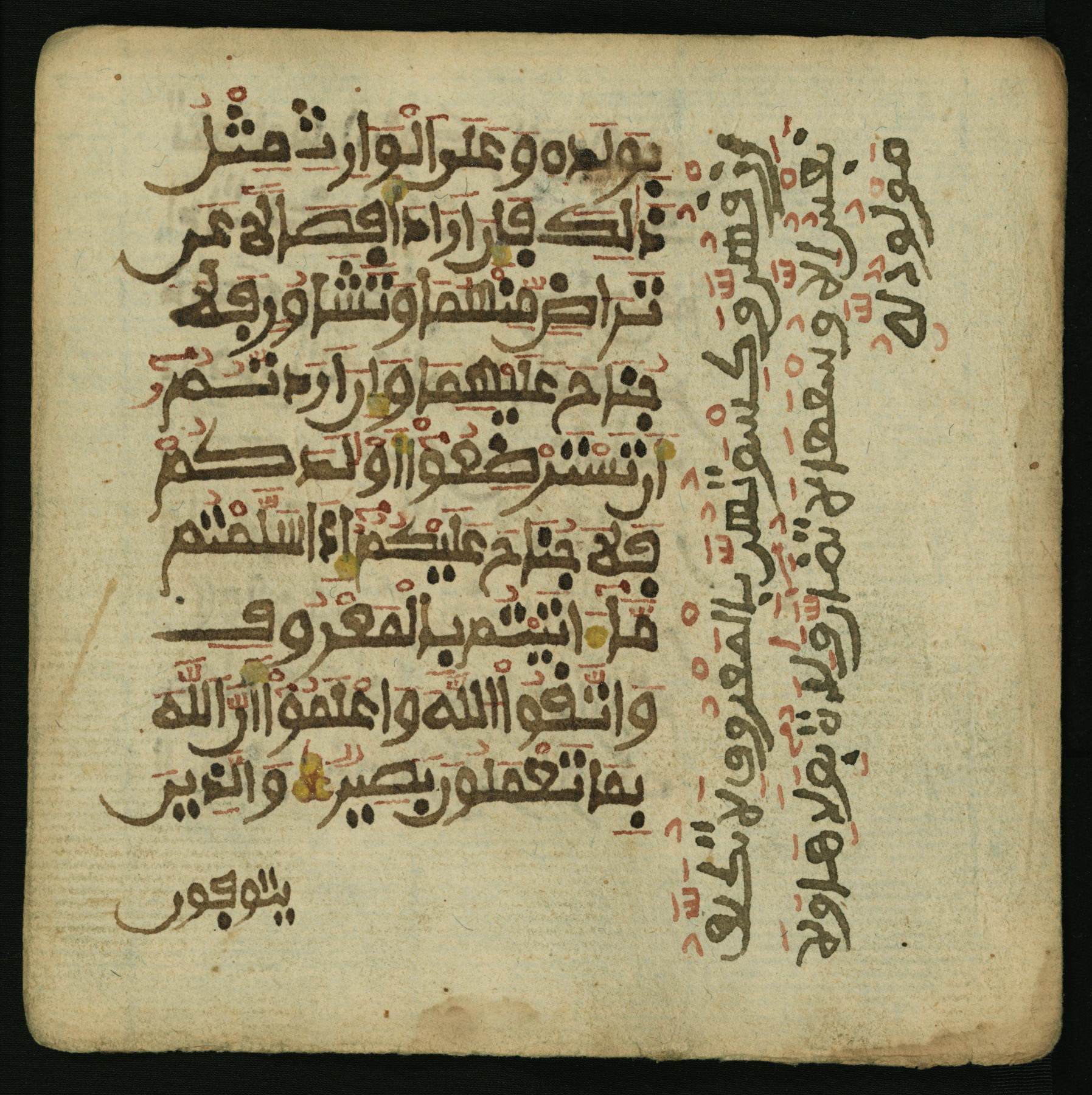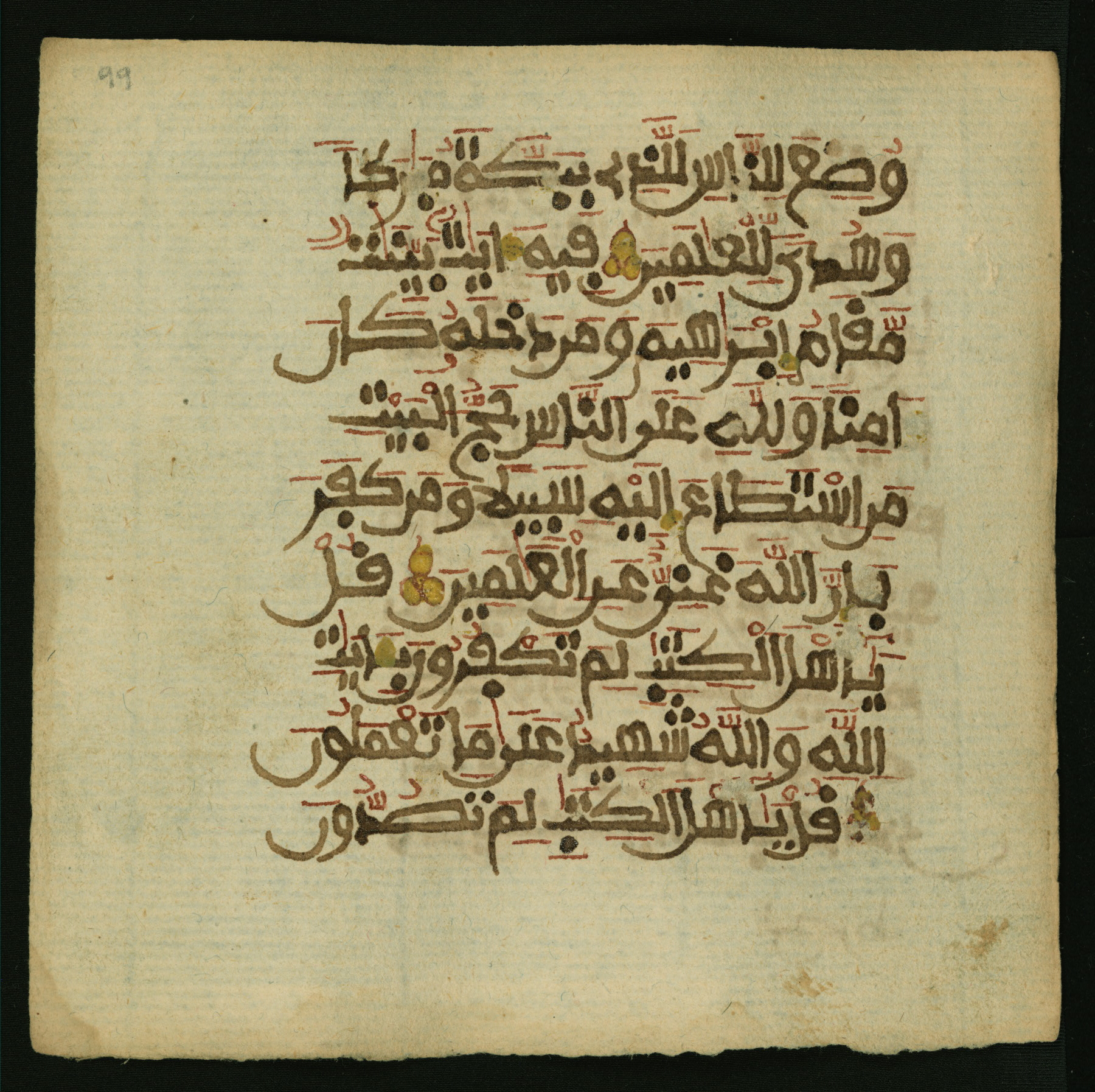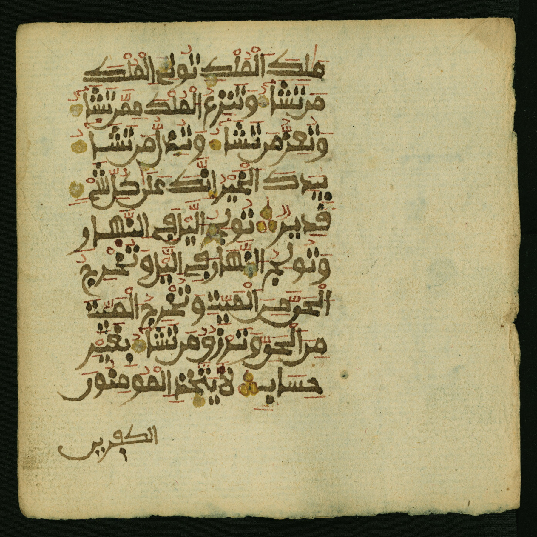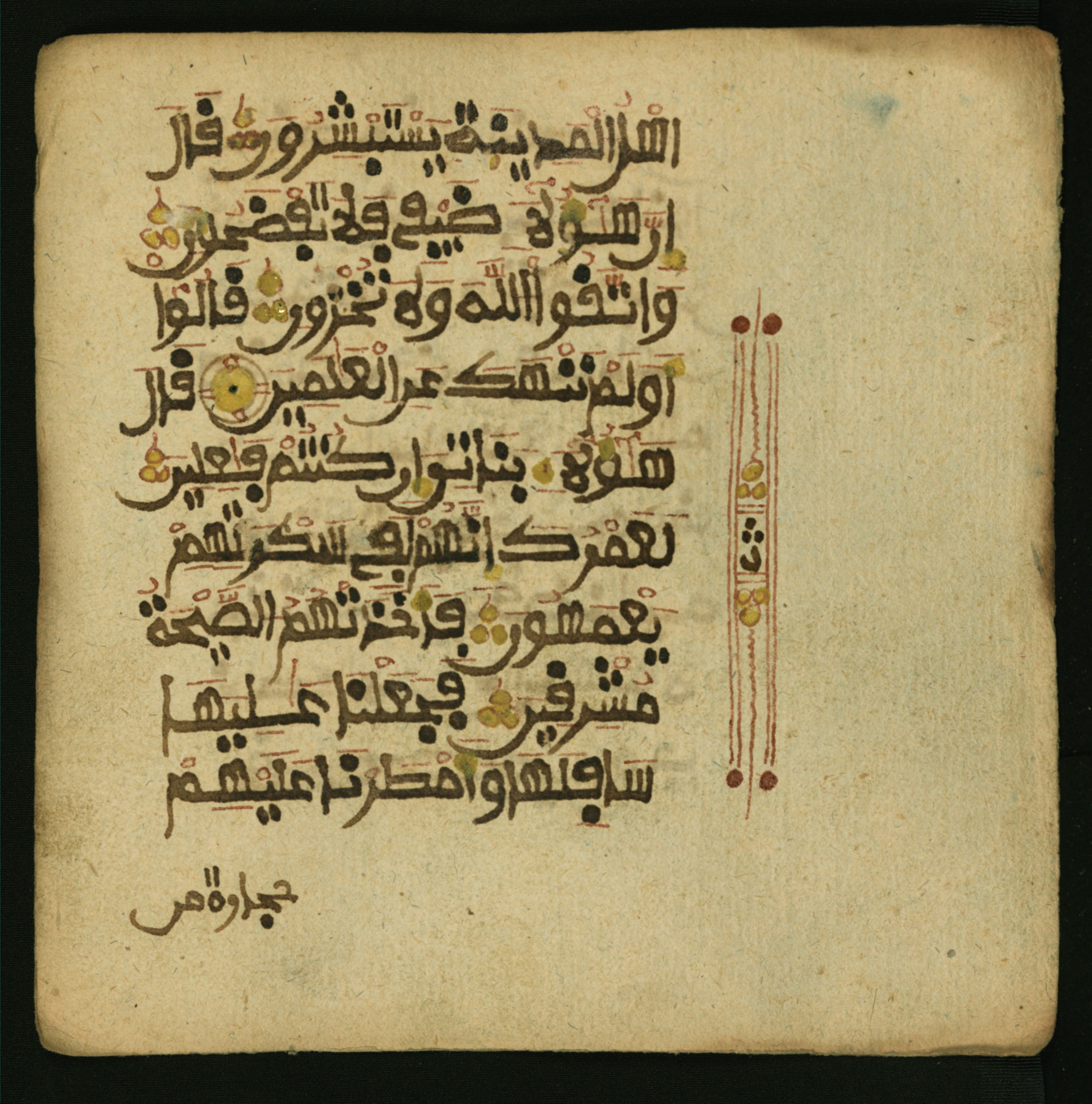 This square-format manuscript is volume 1, containing chapters 1-18 (Sūrat al-fātiḥah through Sūrat al-kahf), of an illuminated two-volume Qur'an produced in Sub-Saharan (West) Africa in the thirteenth century AH / nineteenth CE. The text is written in Sūdānī script in dark brown ink with vocalization in red on loose leaves. Chapter headings are in reddish-brown ink. Three yellow dots outlined in red arranged in a triangular form separate verses. Polychrome circular medallions as well as square and rectangular devices in a variety of patterns and colors mark textual divisions. The leaves of the text are organized between two decorated boards with geometric compositions. The pages and boards are housed in a leather pouch (satchel).