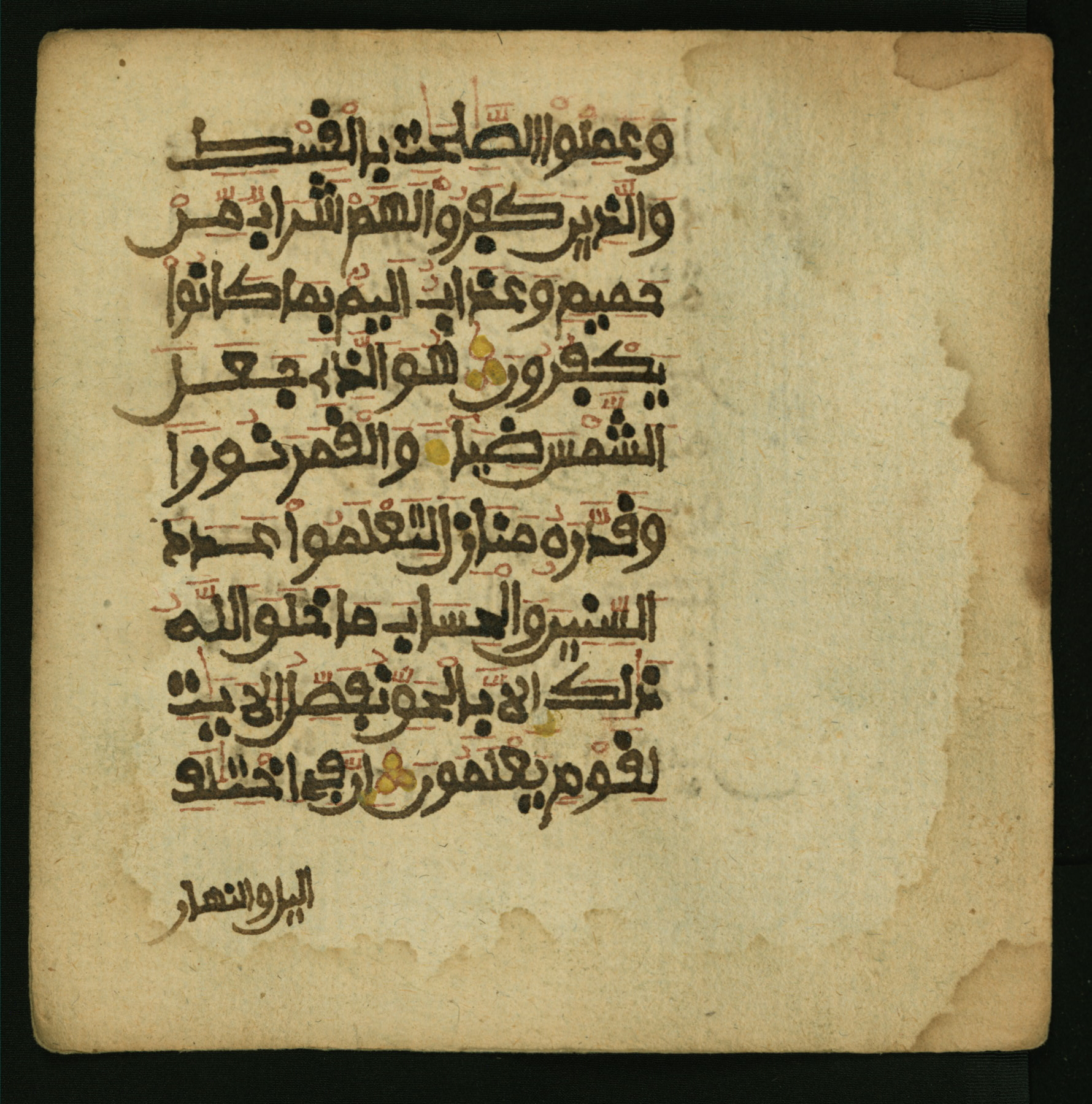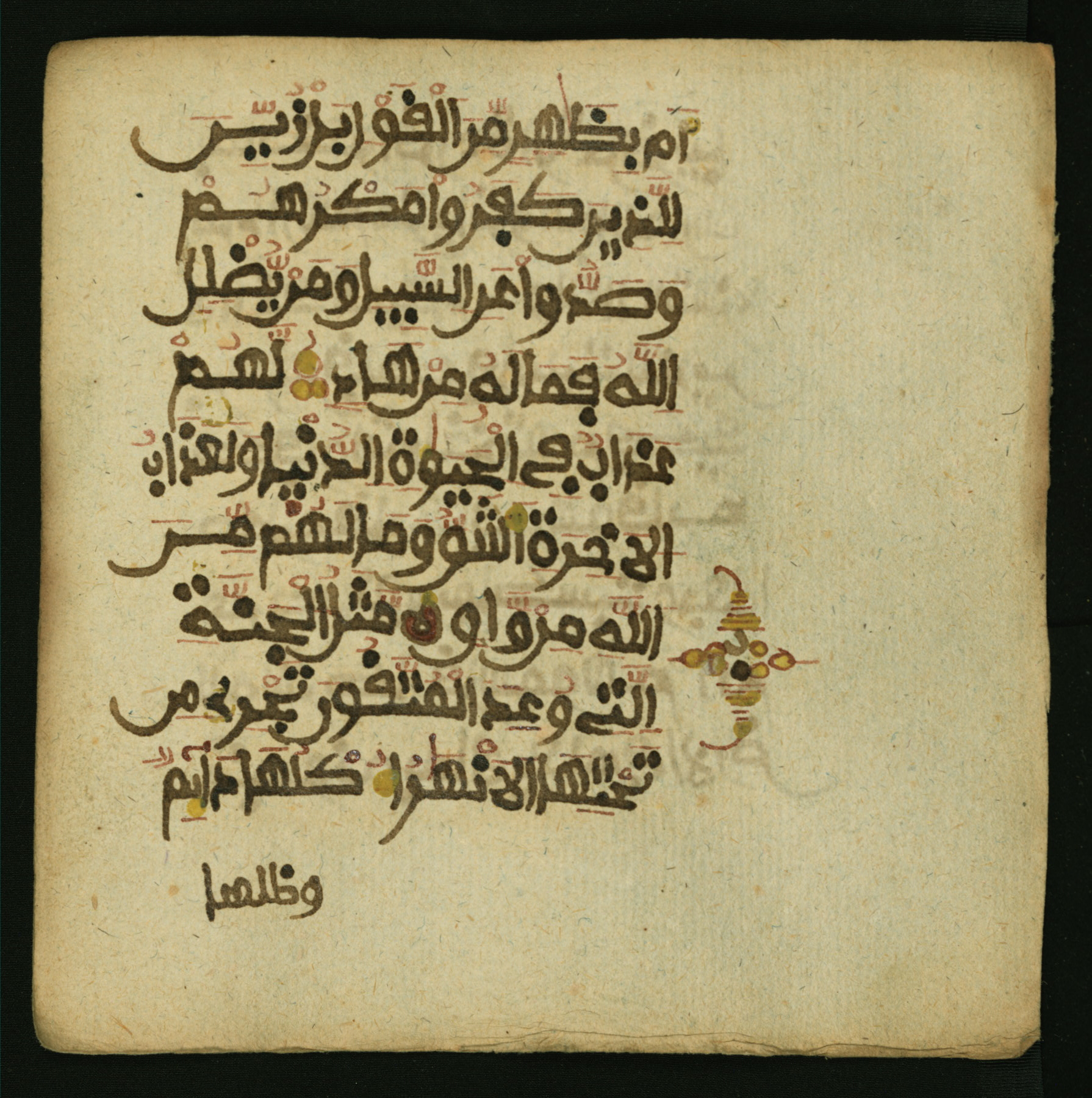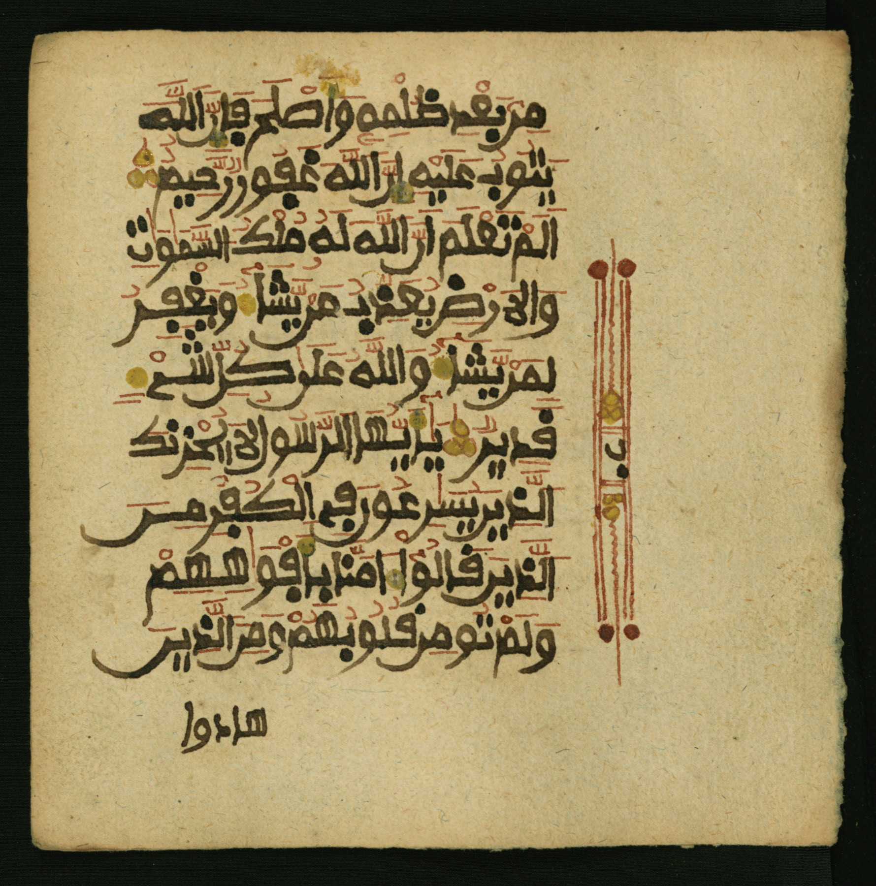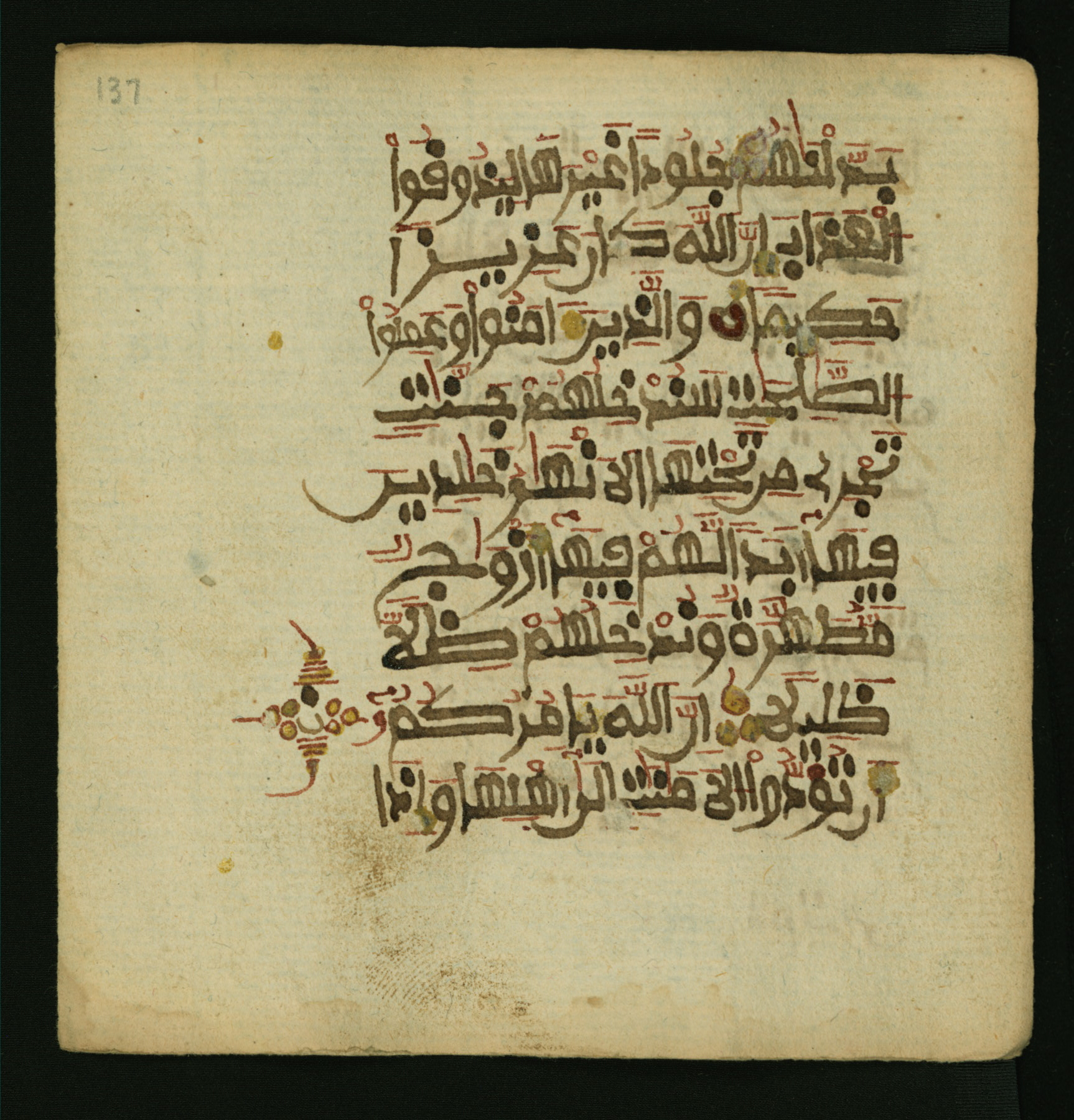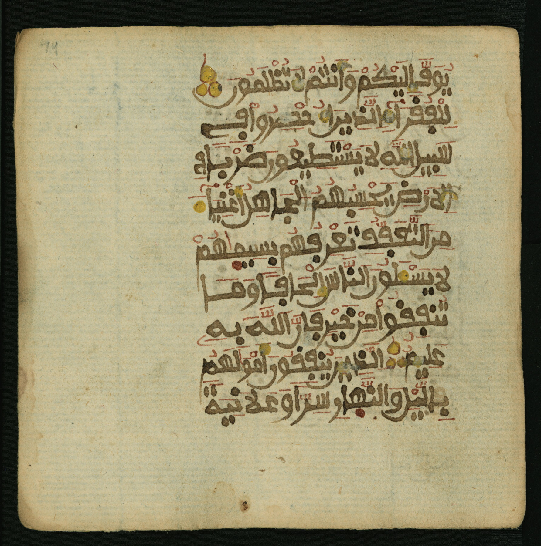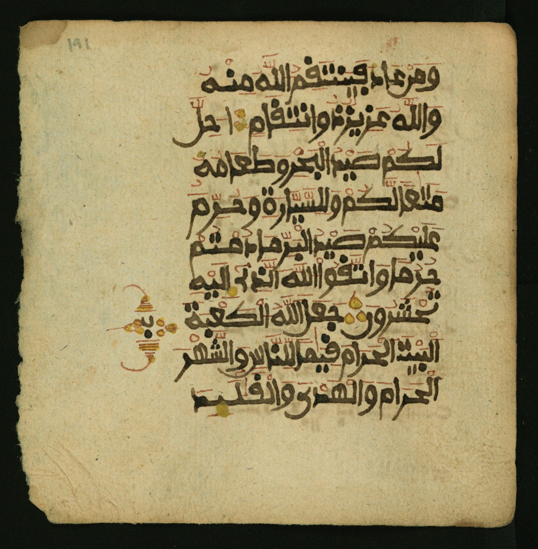 This square-format manuscript is volume 1, containing chapters 1-18 (Sūrat al-fātiḥah through Sūrat al-kahf), of an illuminated two-volume Qur'an produced in Sub-Saharan (West) Africa in the thirteenth century AH / nineteenth CE. The text is written in Sūdānī script in dark brown ink with vocalization in red on loose leaves. Chapter headings are in reddish-brown ink. Three yellow dots outlined in red arranged in a triangular form separate verses. Polychrome circular medallions as well as square and rectangular devices in a variety of patterns and colors mark textual divisions. The leaves of the text are organized between two decorated boards with geometric compositions. The pages and boards are housed in a leather pouch (satchel).