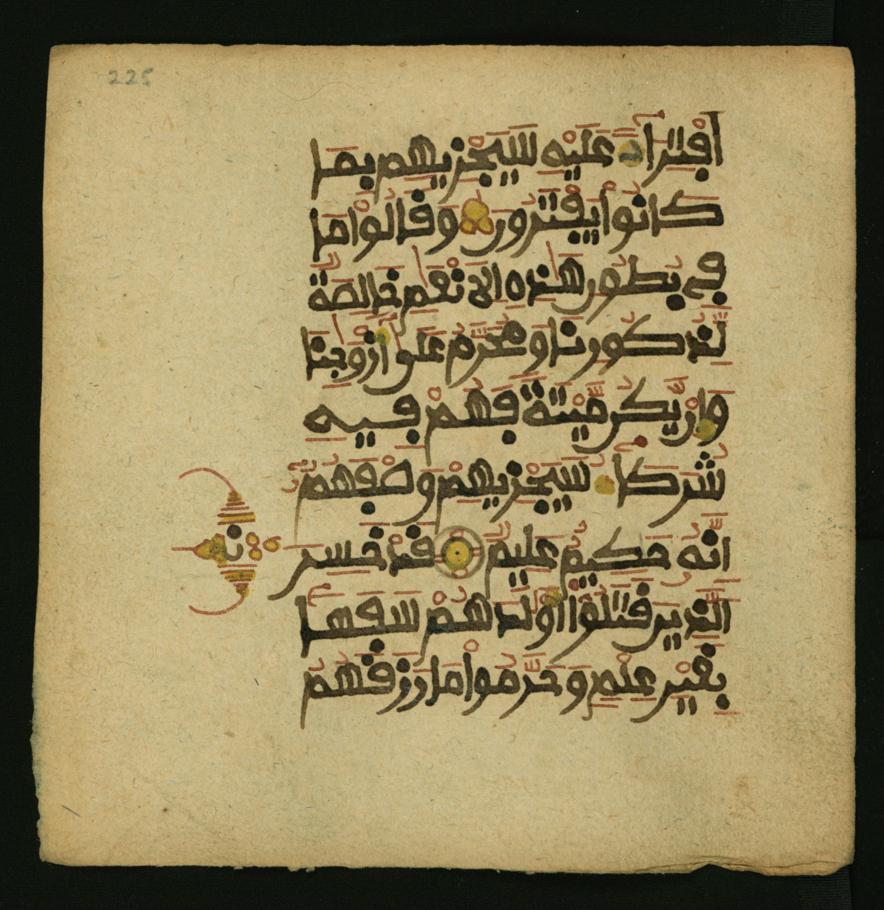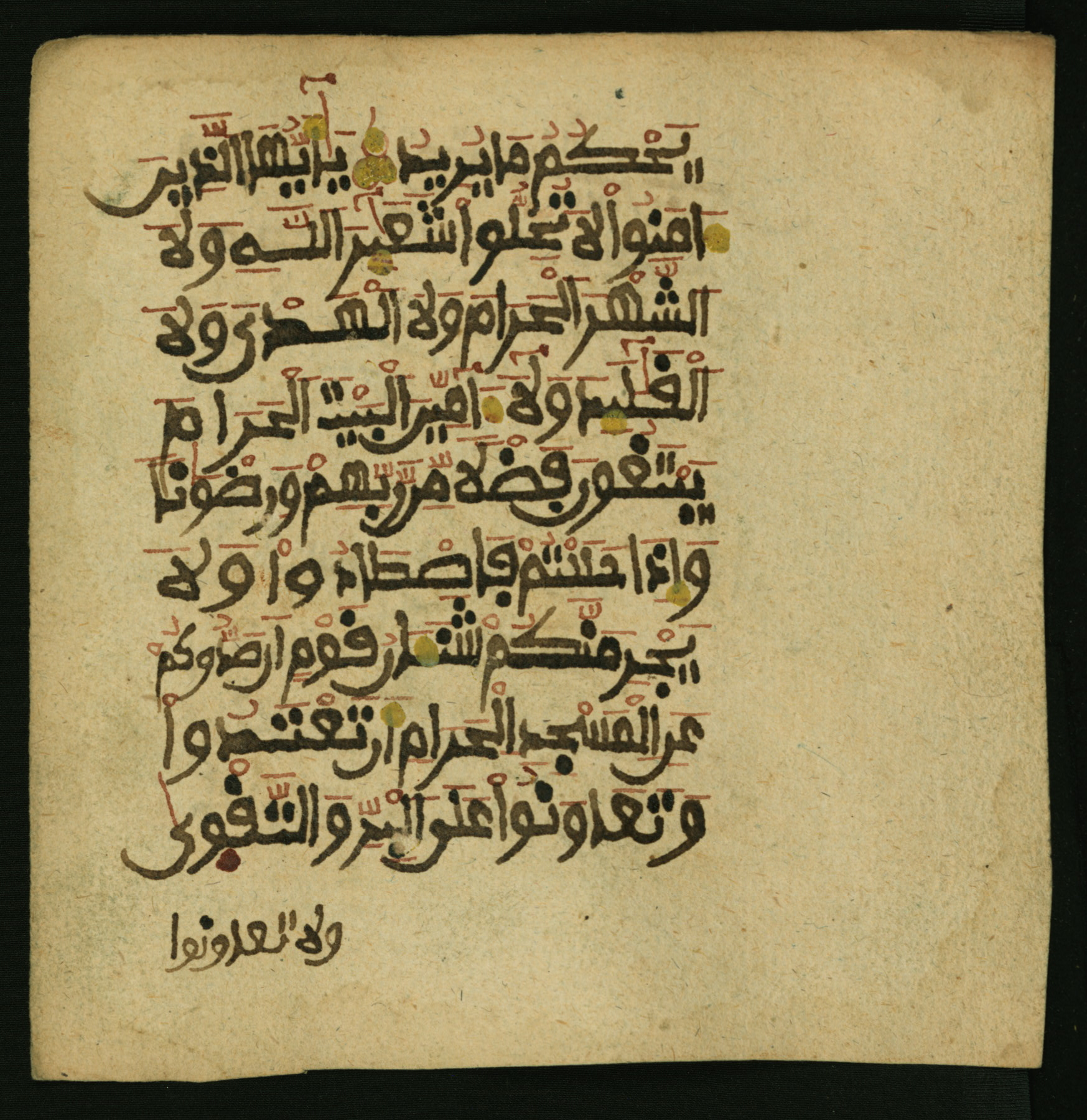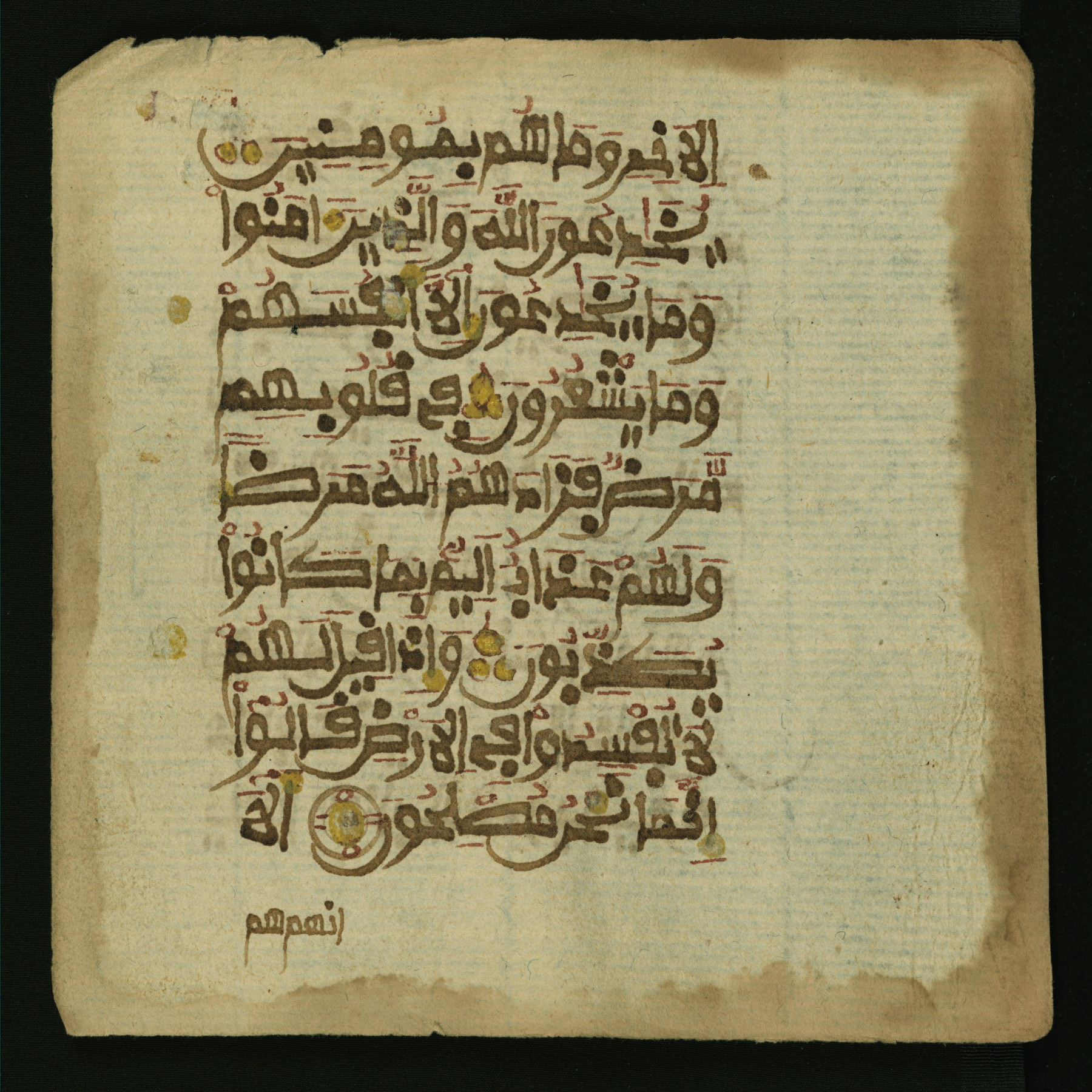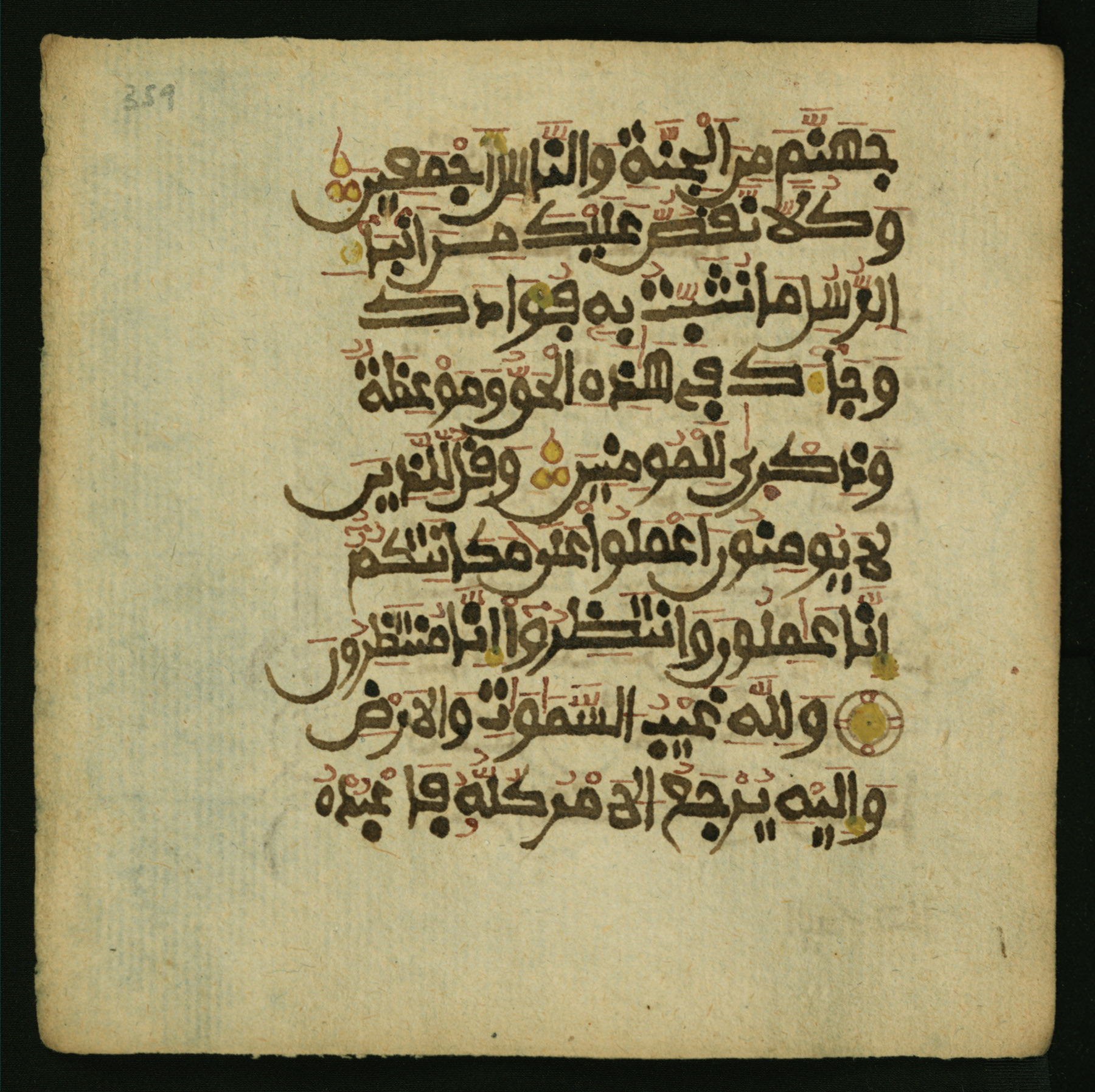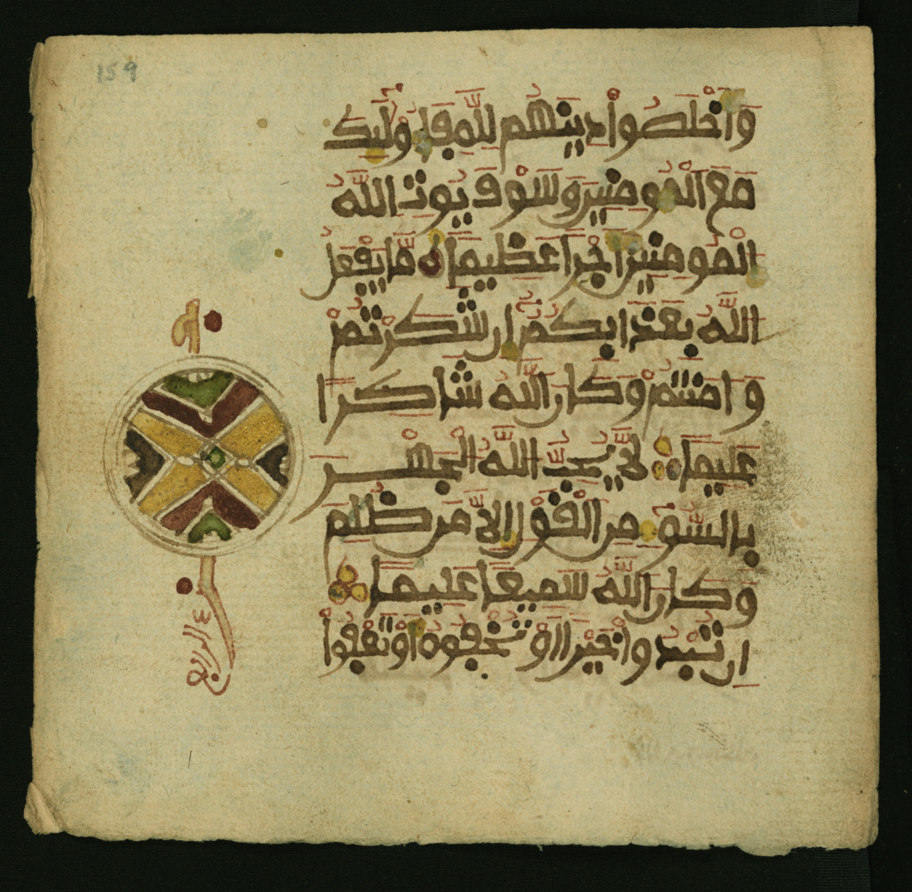 This square-format manuscript is volume 1, containing chapters 1-18 (Sūrat al-fātiḥah through Sūrat al-kahf), of an illuminated two-volume Qur'an produced in Sub-Saharan (West) Africa in the thirteenth century AH / nineteenth CE. The text is written in Sūdānī script in dark brown ink with vocalization in red on loose leaves. Chapter headings are in reddish-brown ink. Three yellow dots outlined in red arranged in a triangular form separate verses. Polychrome circular medallions as well as square and rectangular devices in a variety of patterns and colors mark textual divisions. The leaves of the text are organized between two decorated boards with geometric compositions. The pages and boards are housed in a leather pouch (satchel).