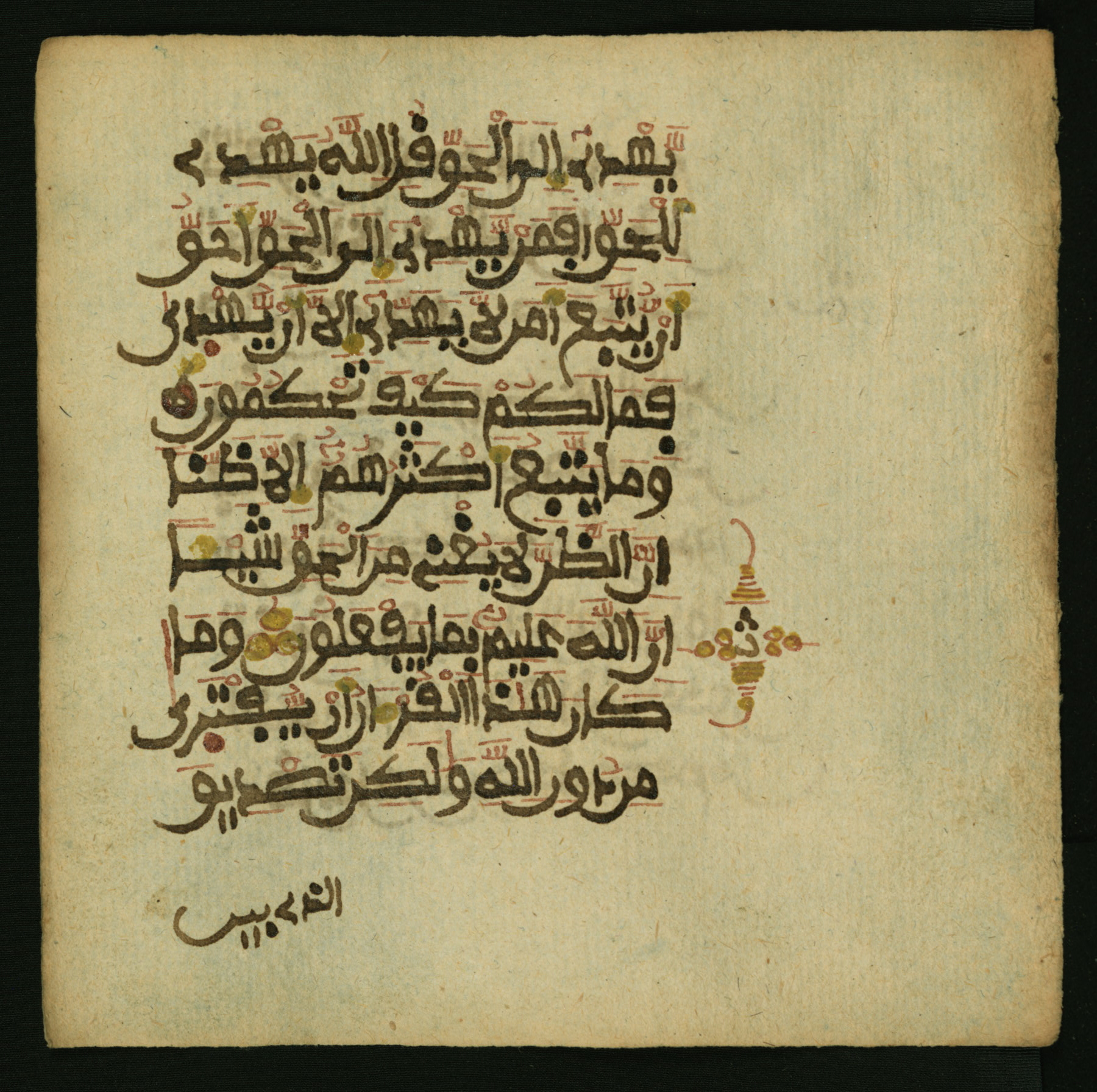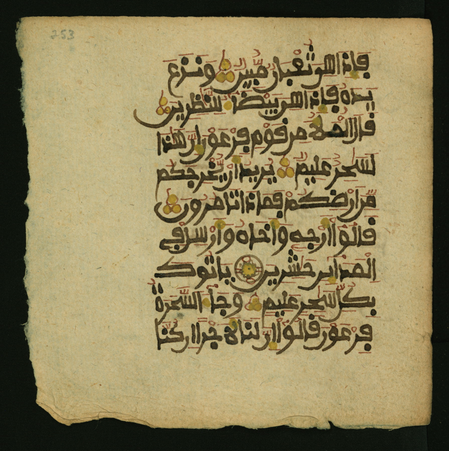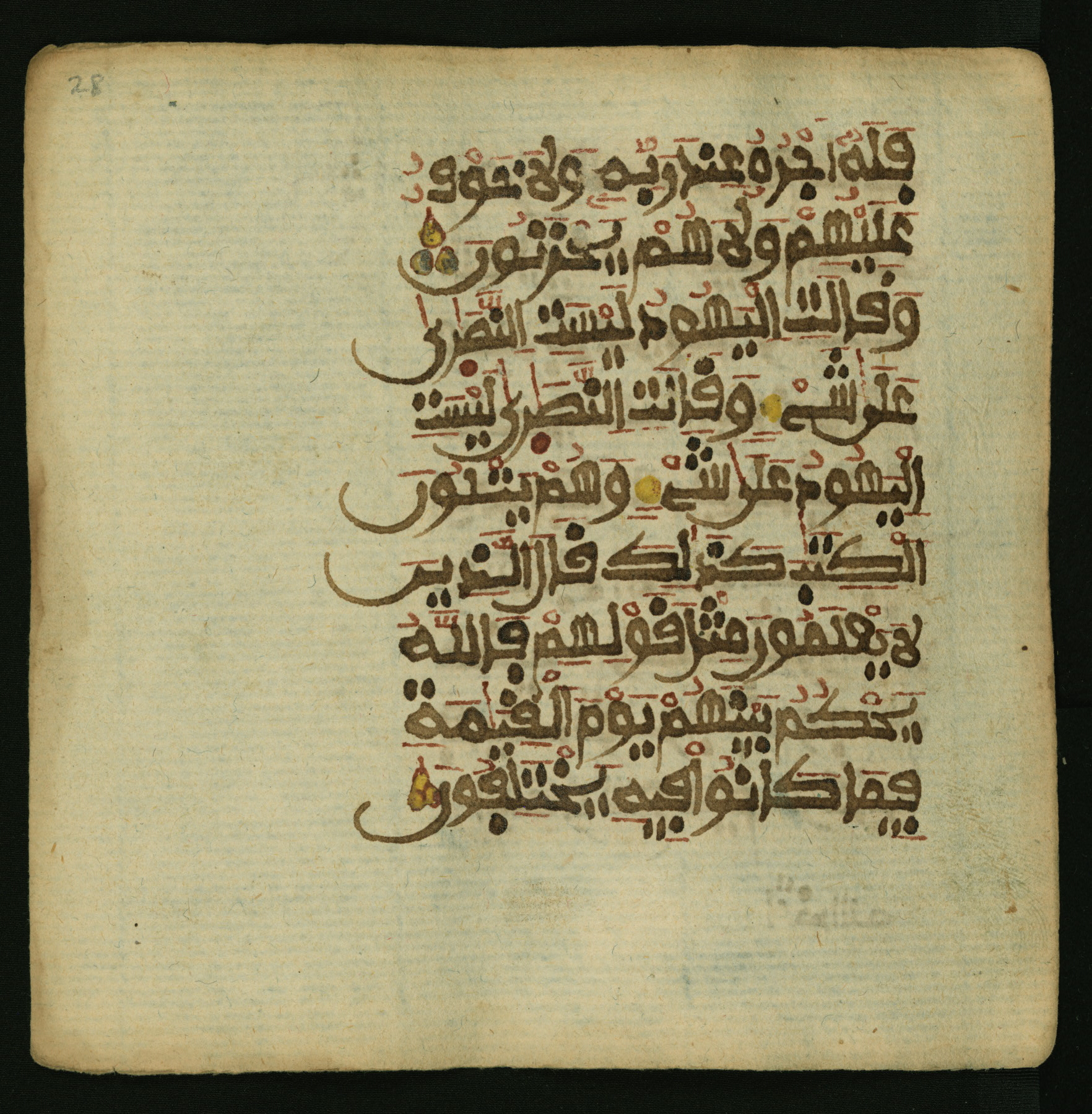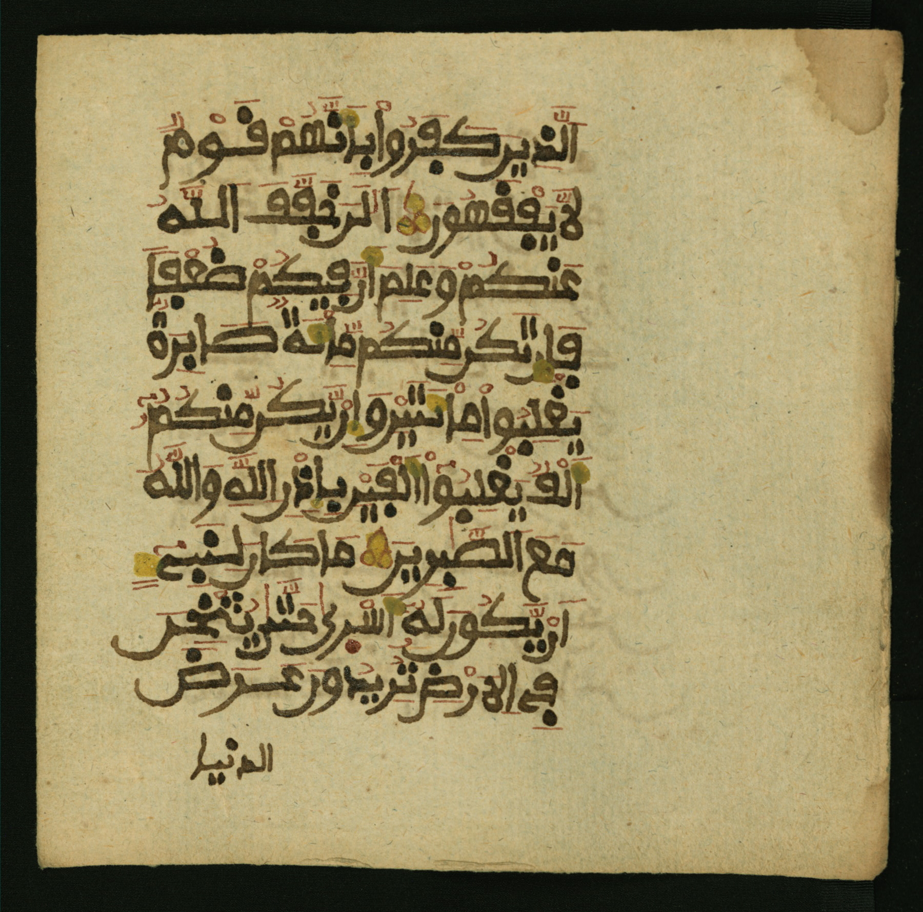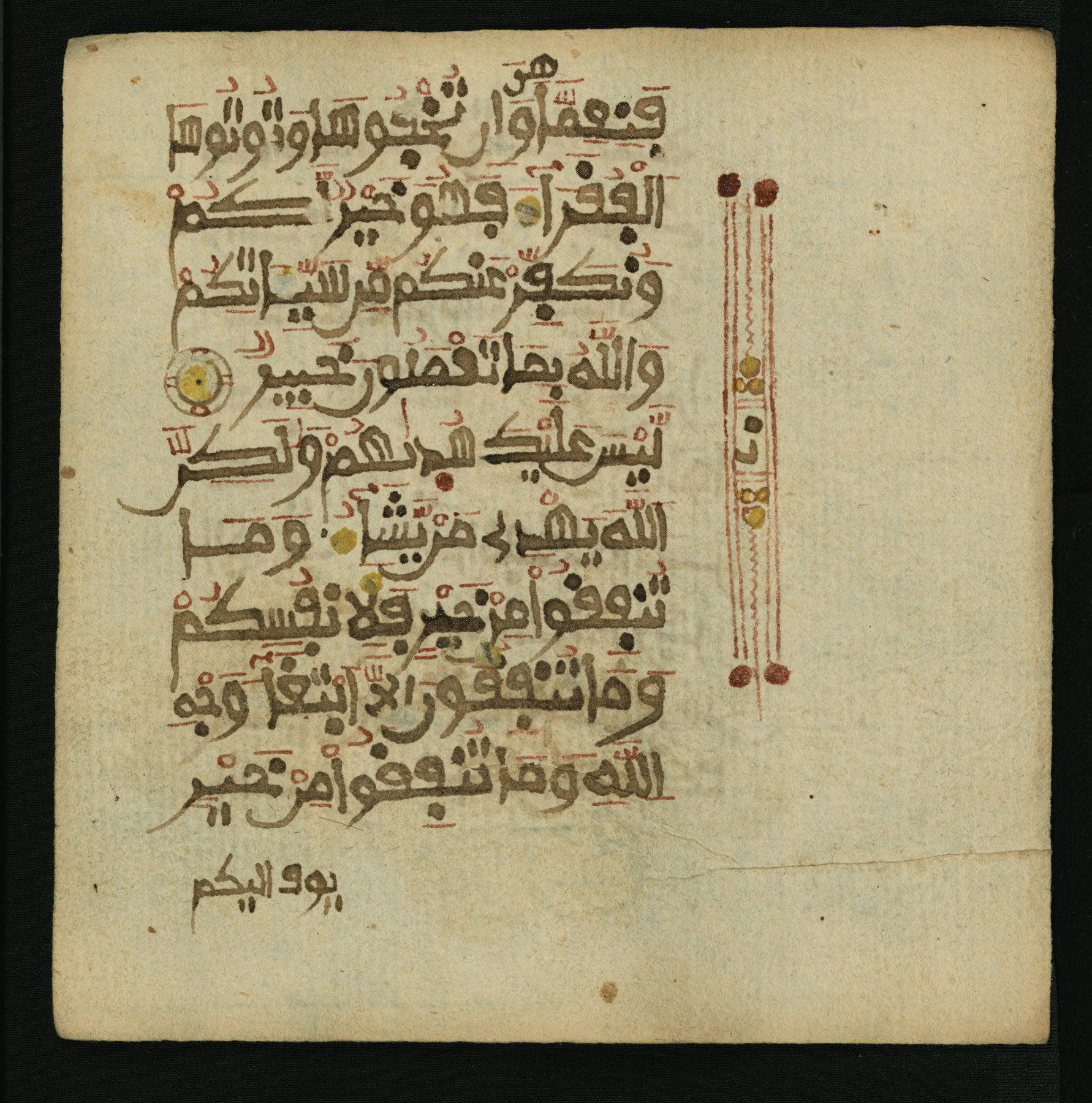 This square-format manuscript is volume 1, containing chapters 1-18 (Sūrat al-fātiḥah through Sūrat al-kahf), of an illuminated two-volume Qur'an produced in Sub-Saharan (West) Africa in the thirteenth century AH / nineteenth CE. The text is written in Sūdānī script in dark brown ink with vocalization in red on loose leaves. Chapter headings are in reddish-brown ink. Three yellow dots outlined in red arranged in a triangular form separate verses. Polychrome circular medallions as well as square and rectangular devices in a variety of patterns and colors mark textual divisions. The leaves of the text are organized between two decorated boards with geometric compositions. The pages and boards are housed in a leather pouch (satchel).