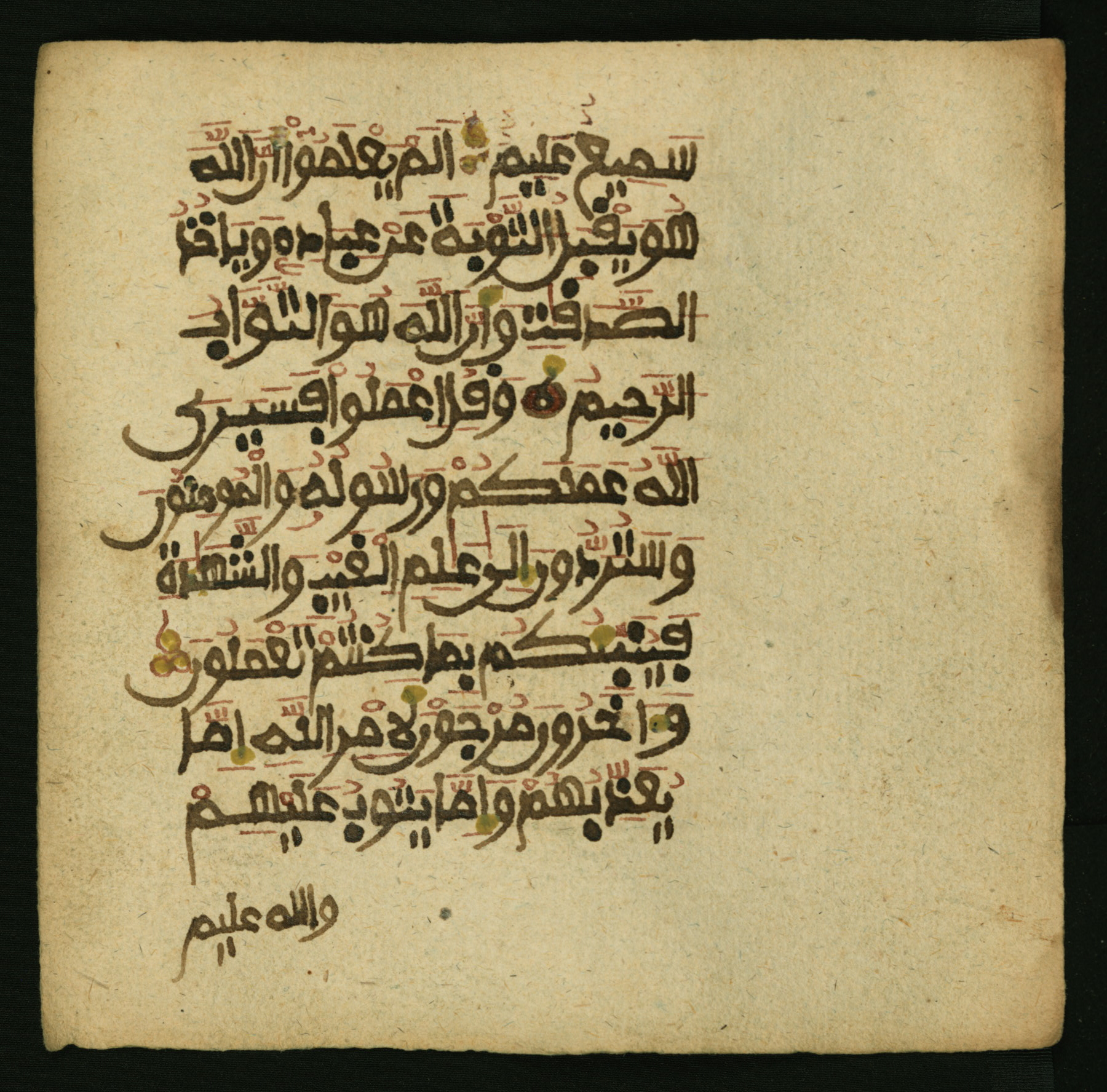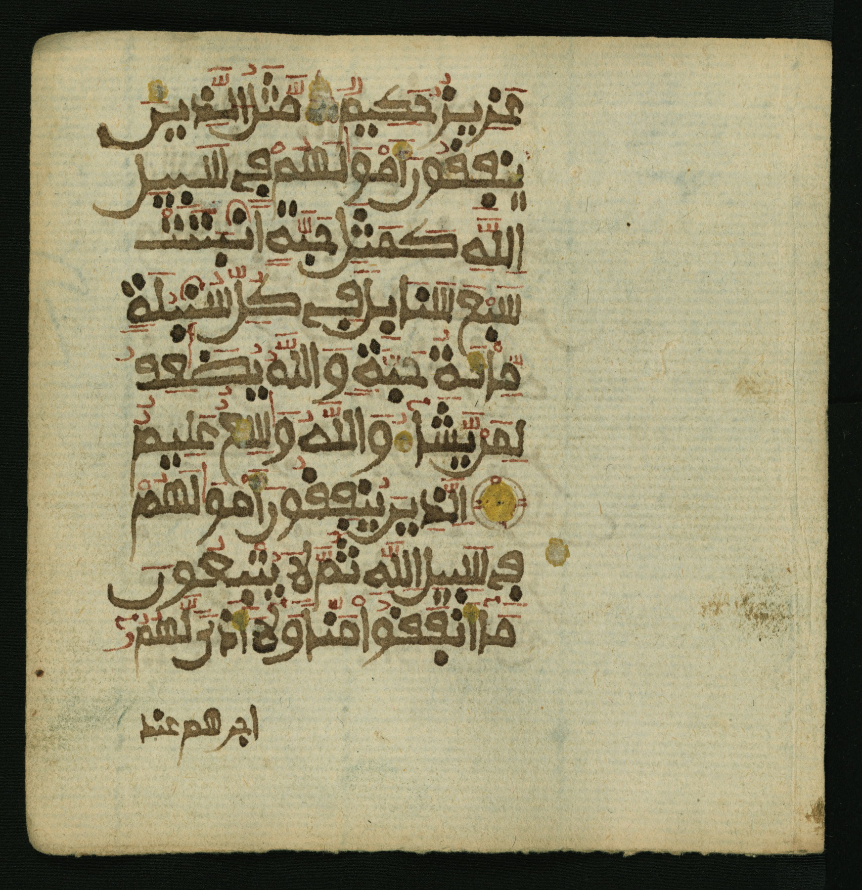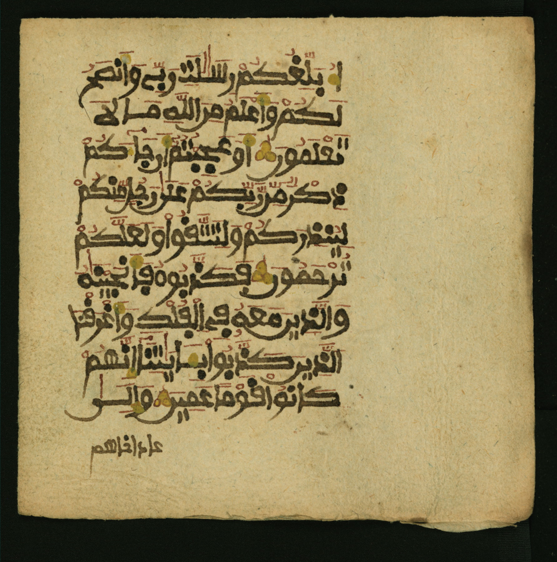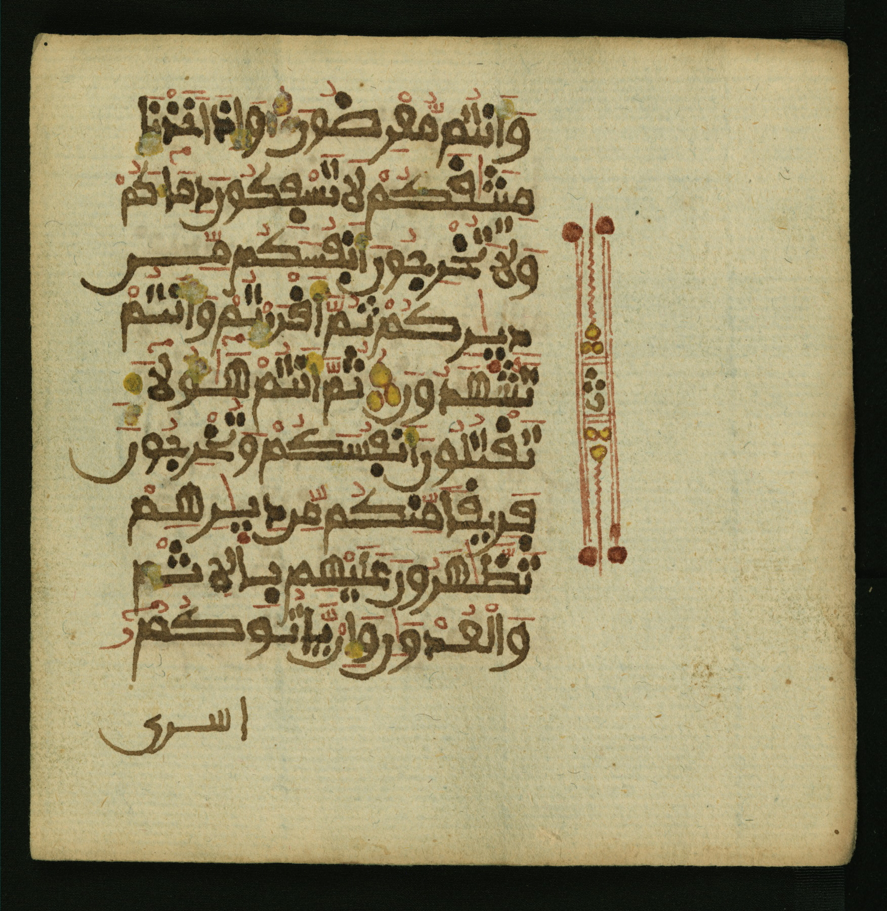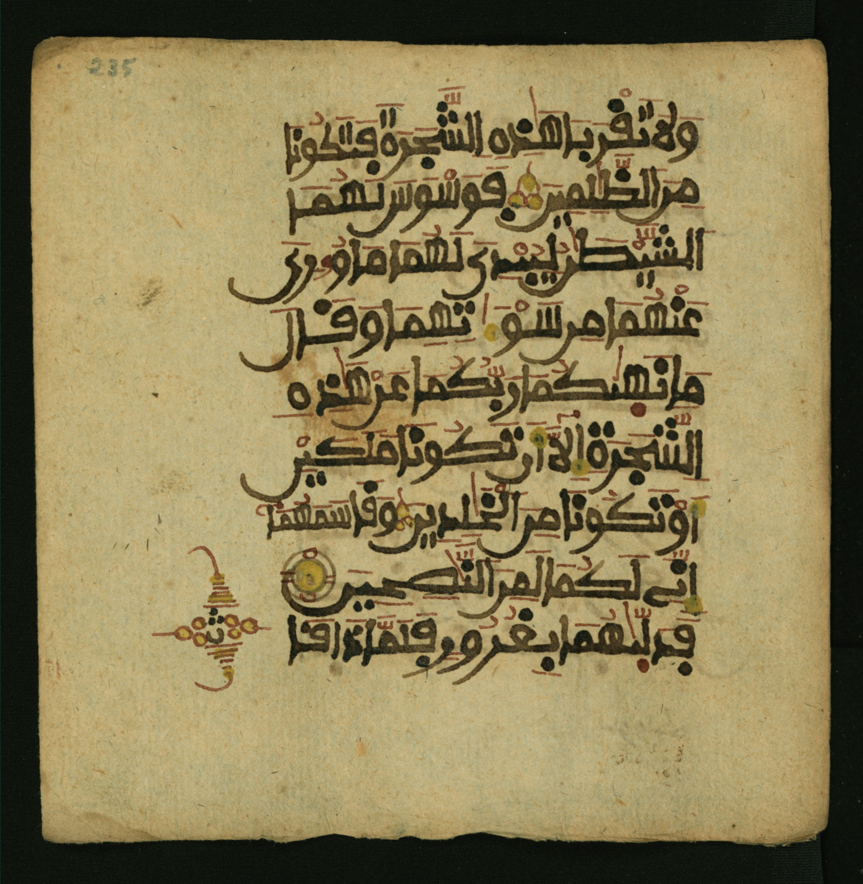 This square-format manuscript is volume 1, containing chapters 1-18 (Sūrat al-fātiḥah through Sūrat al-kahf), of an illuminated two-volume Qur'an produced in Sub-Saharan (West) Africa in the thirteenth century AH / nineteenth CE. The text is written in Sūdānī script in dark brown ink with vocalization in red on loose leaves. Chapter headings are in reddish-brown ink. Three yellow dots outlined in red arranged in a triangular form separate verses. Polychrome circular medallions as well as square and rectangular devices in a variety of patterns and colors mark textual divisions. The leaves of the text are organized between two decorated boards with geometric compositions. The pages and boards are housed in a leather pouch (satchel).