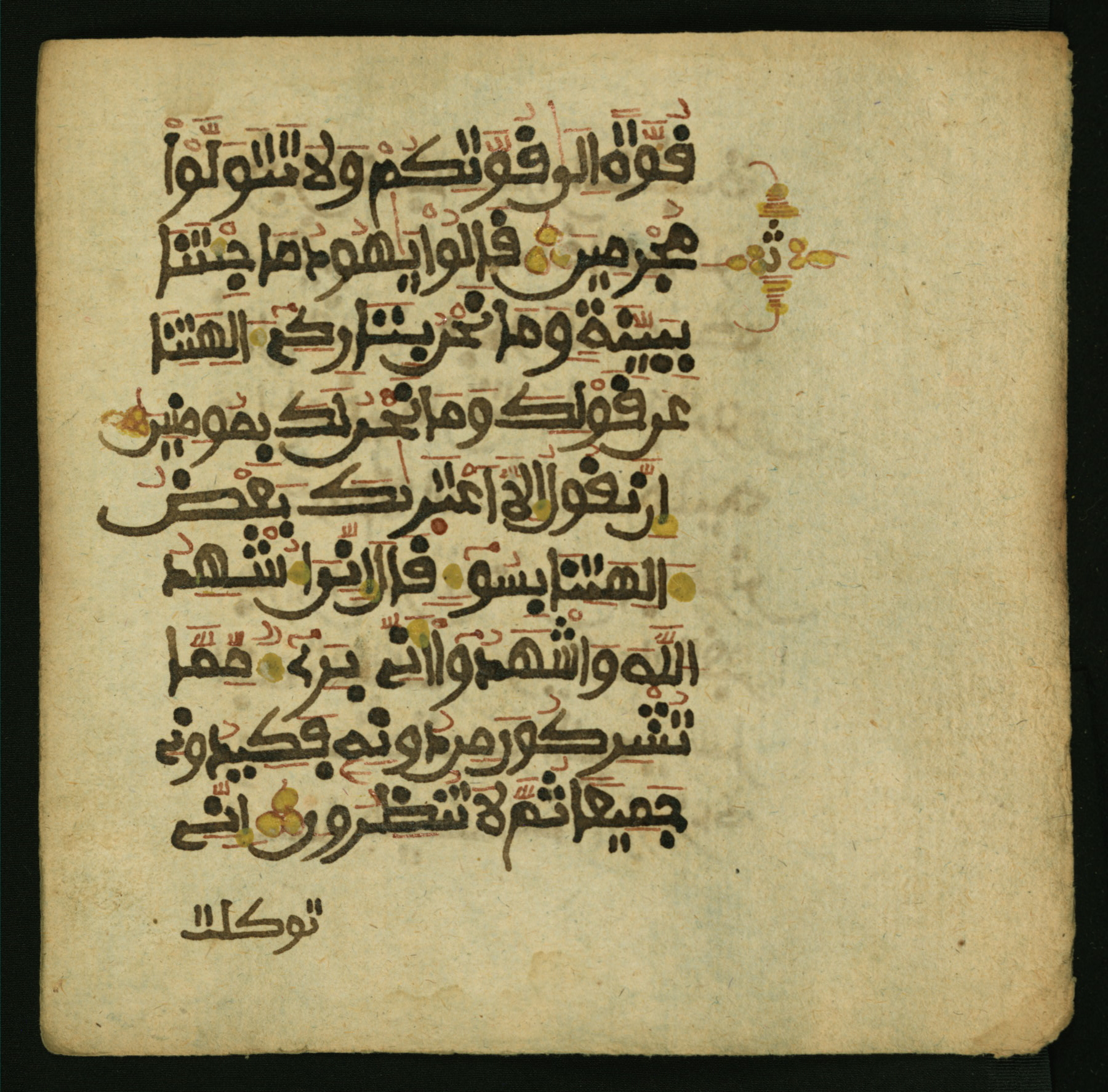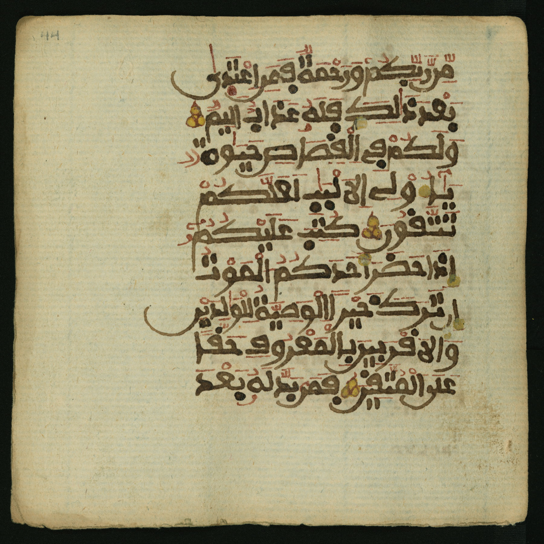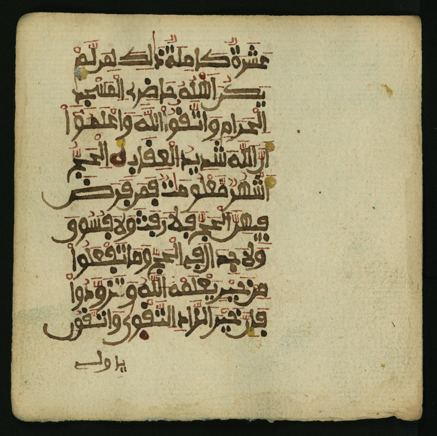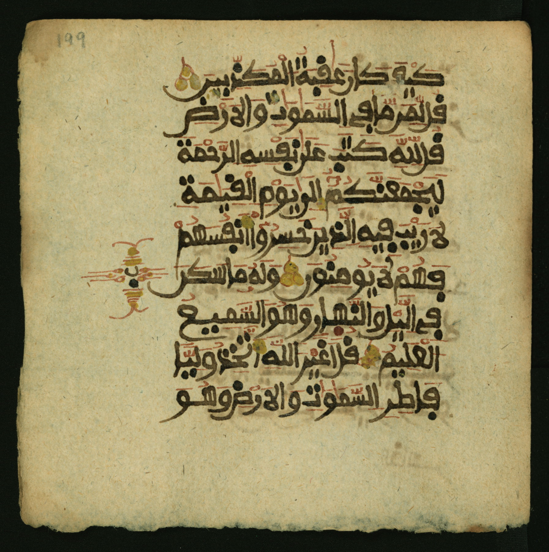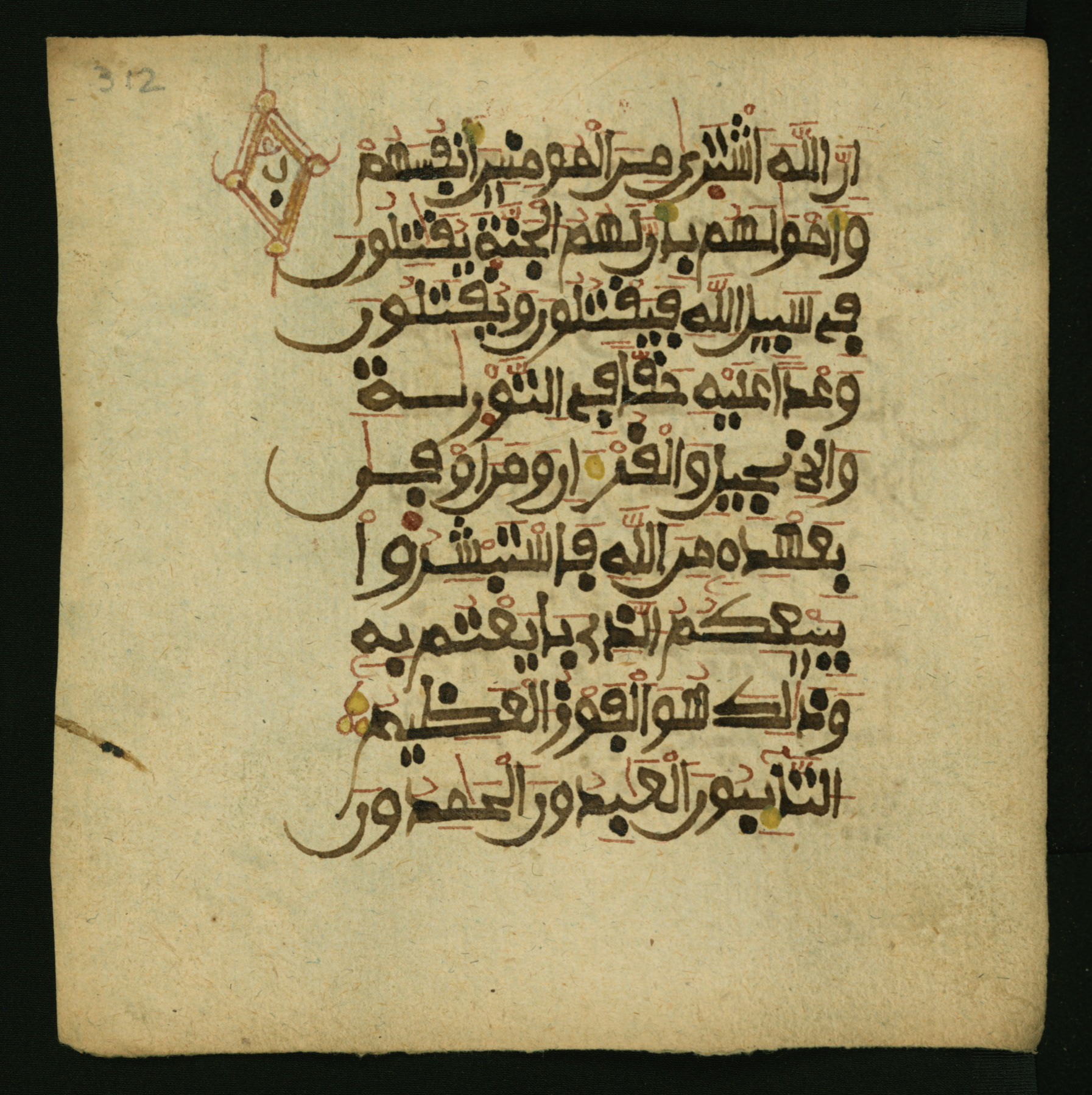 This square-format manuscript is volume 1, containing chapters 1-18 (Sūrat al-fātiḥah through Sūrat al-kahf), of an illuminated two-volume Qur'an produced in Sub-Saharan (West) Africa in the thirteenth century AH / nineteenth CE. The text is written in Sūdānī script in dark brown ink with vocalization in red on loose leaves. Chapter headings are in reddish-brown ink. Three yellow dots outlined in red arranged in a triangular form separate verses. Polychrome circular medallions as well as square and rectangular devices in a variety of patterns and colors mark textual divisions. The leaves of the text are organized between two decorated boards with geometric compositions. The pages and boards are housed in a leather pouch (satchel).