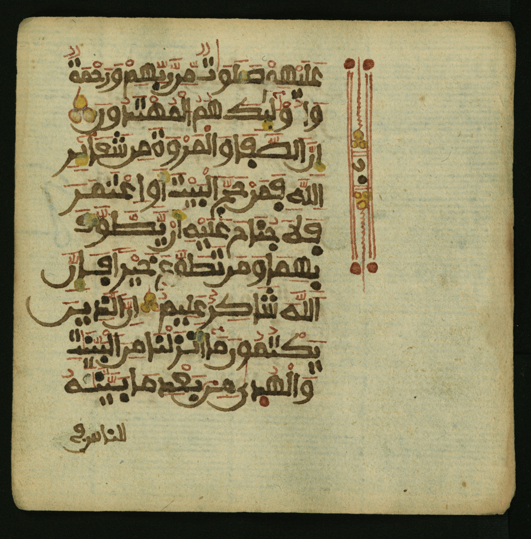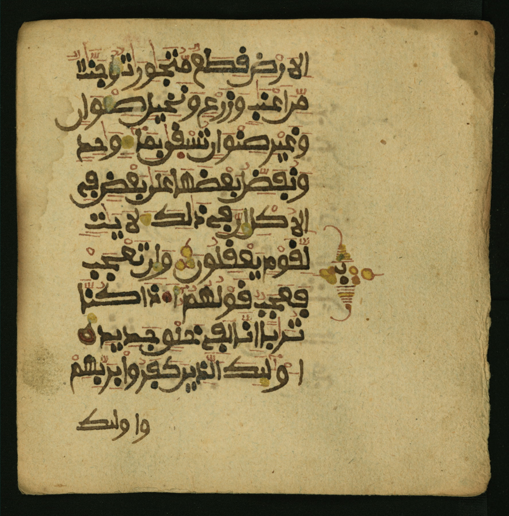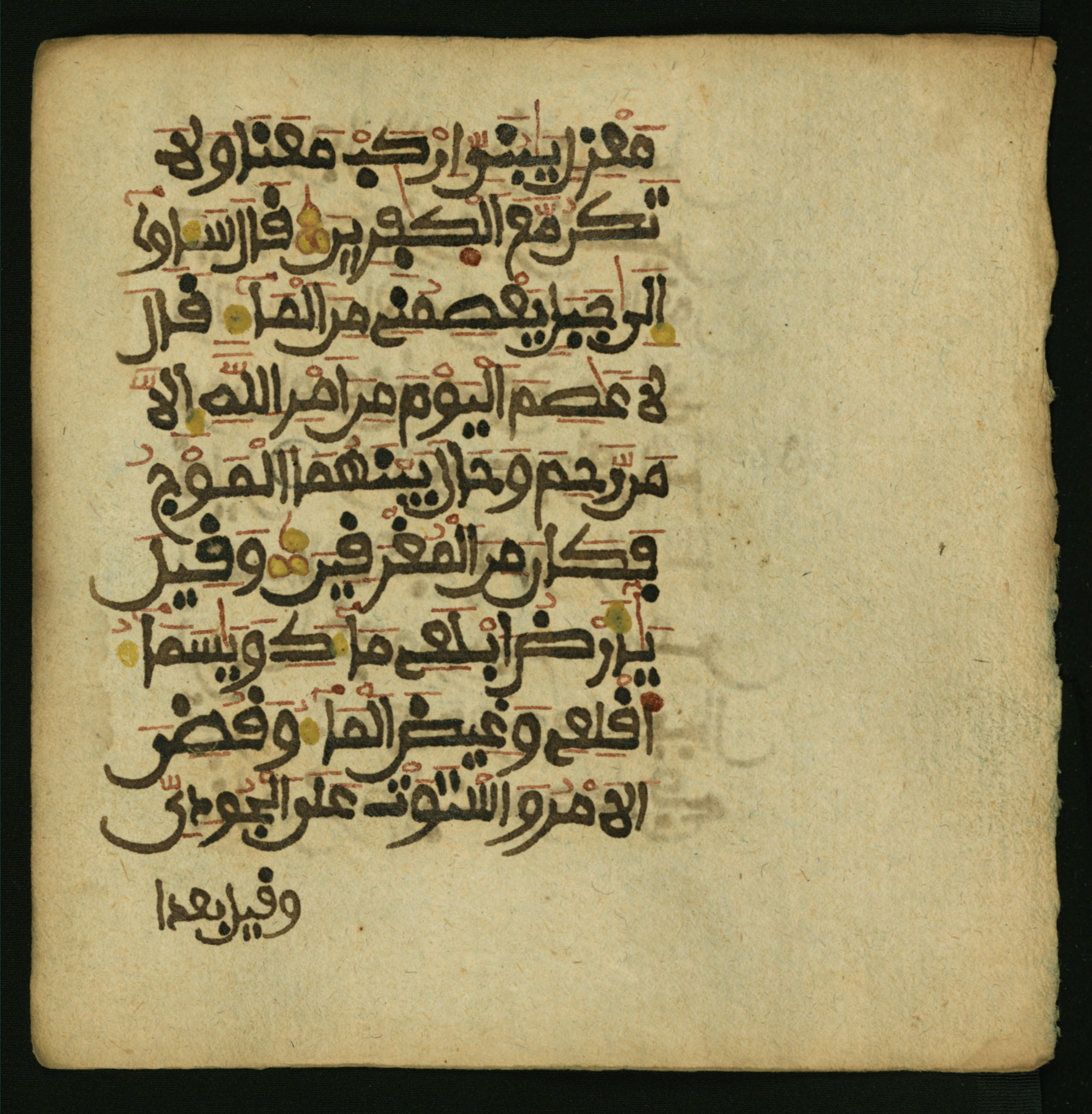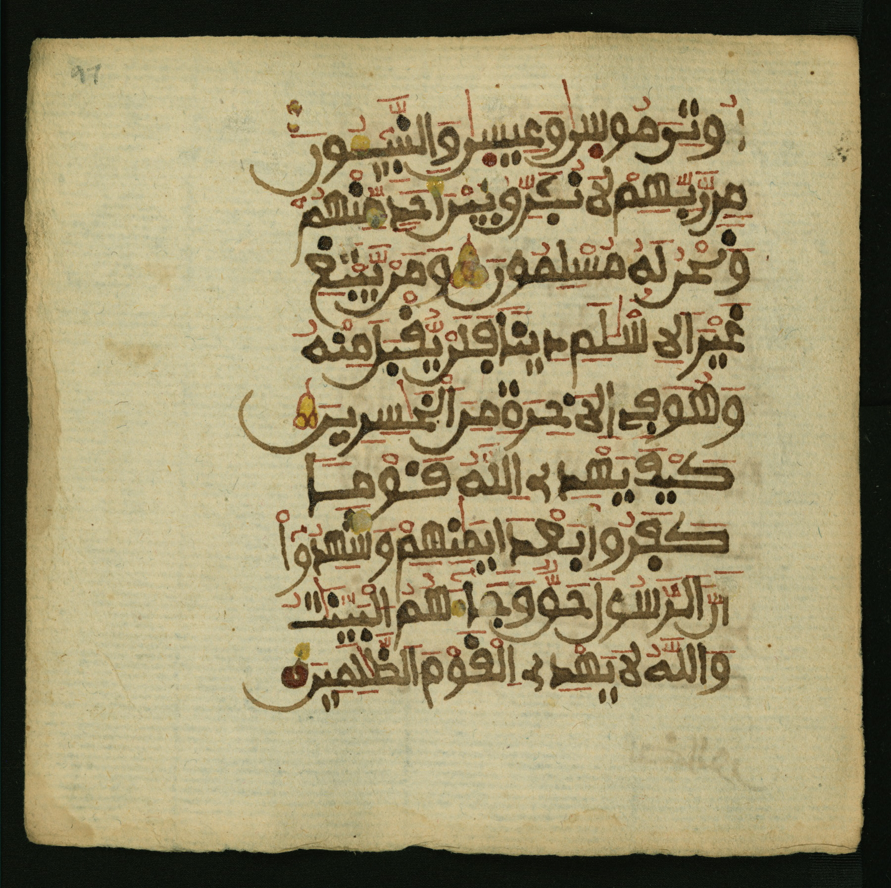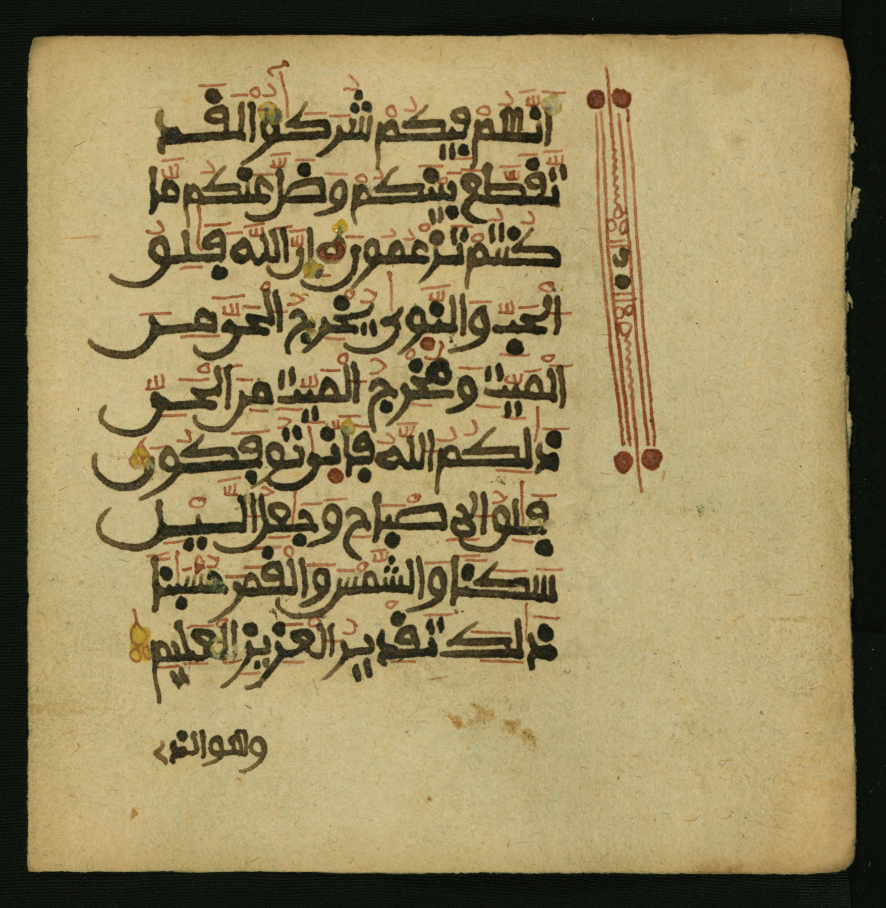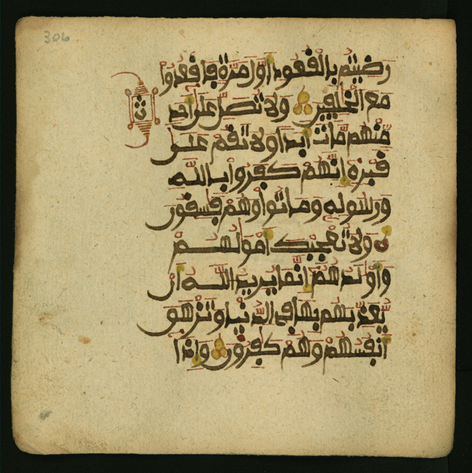 This square-format manuscript is volume 1, containing chapters 1-18 (Sūrat al-fātiḥah through Sūrat al-kahf), of an illuminated two-volume Qur'an produced in Sub-Saharan (West) Africa in the thirteenth century AH / nineteenth CE. The text is written in Sūdānī script in dark brown ink with vocalization in red on loose leaves. Chapter headings are in reddish-brown ink. Three yellow dots outlined in red arranged in a triangular form separate verses. Polychrome circular medallions as well as square and rectangular devices in a variety of patterns and colors mark textual divisions. The leaves of the text are organized between two decorated boards with geometric compositions. The pages and boards are housed in a leather pouch (satchel).