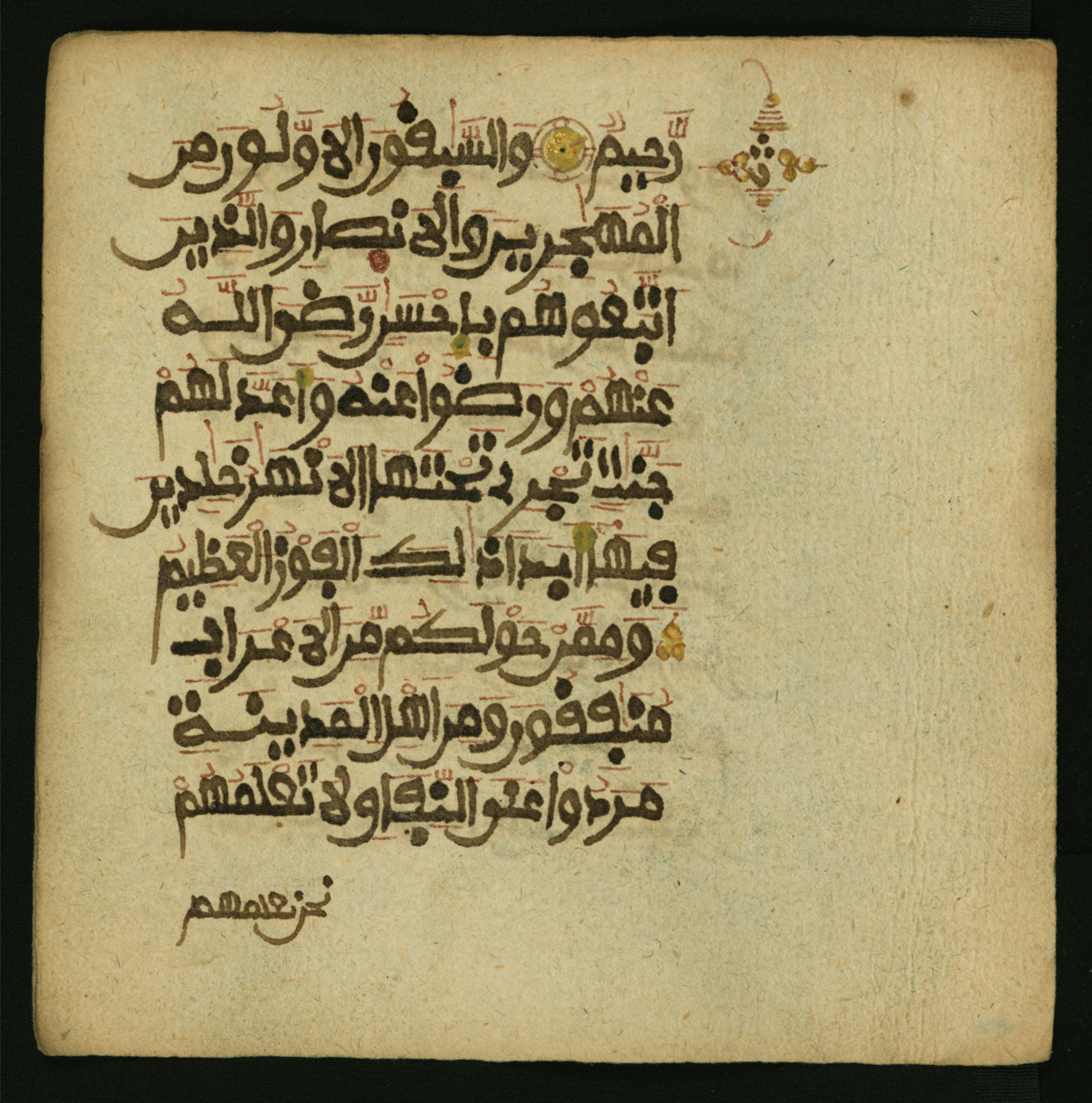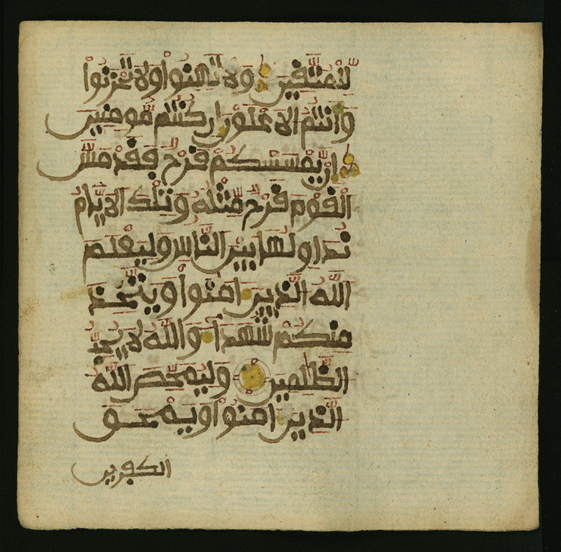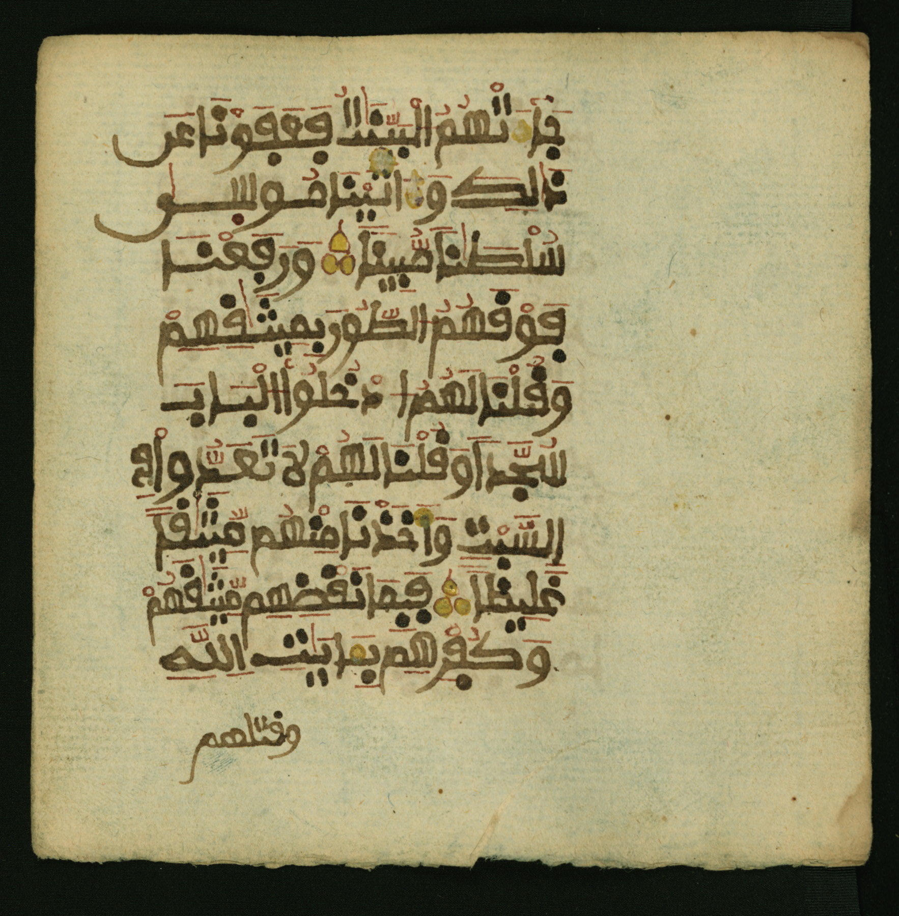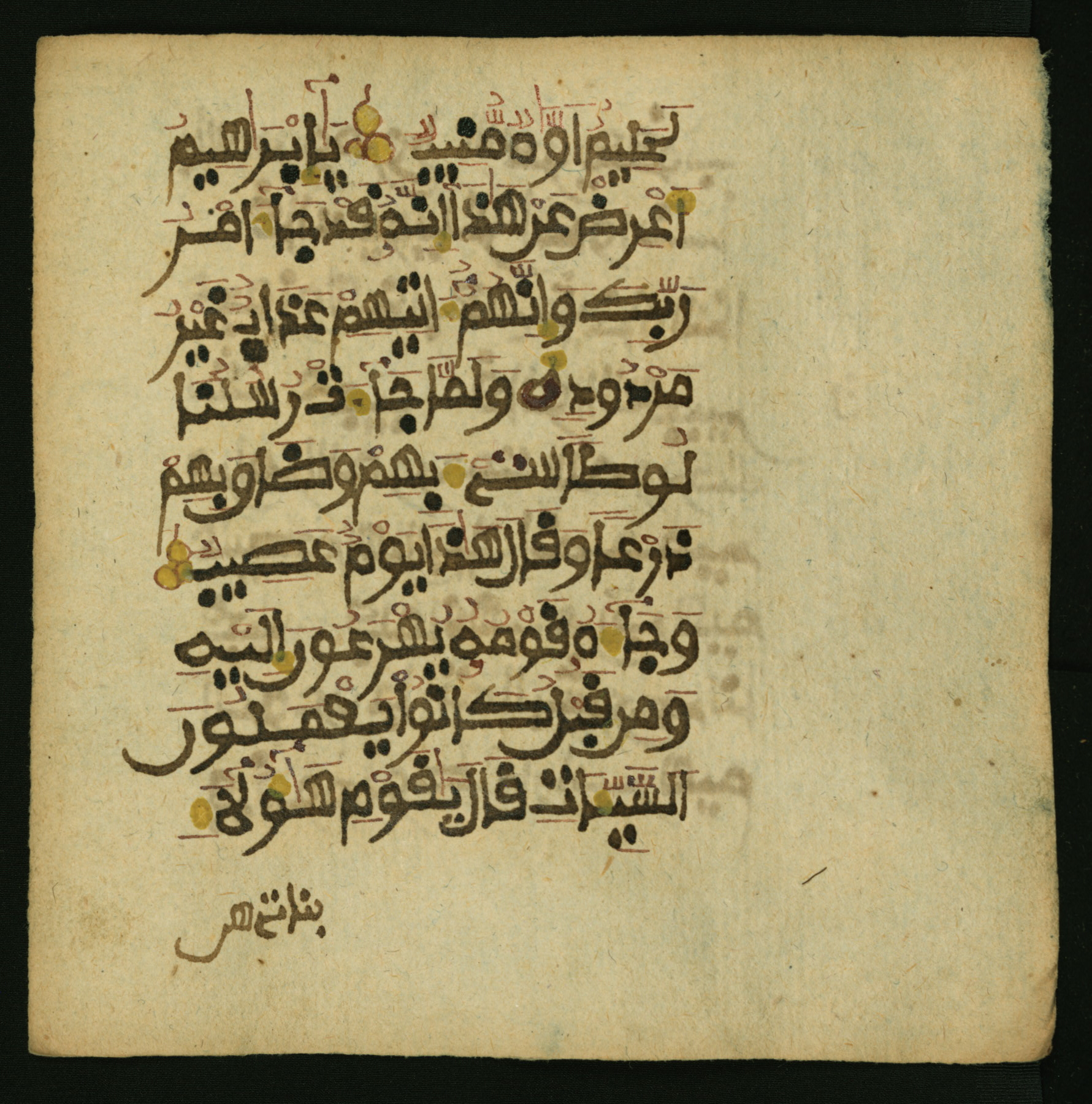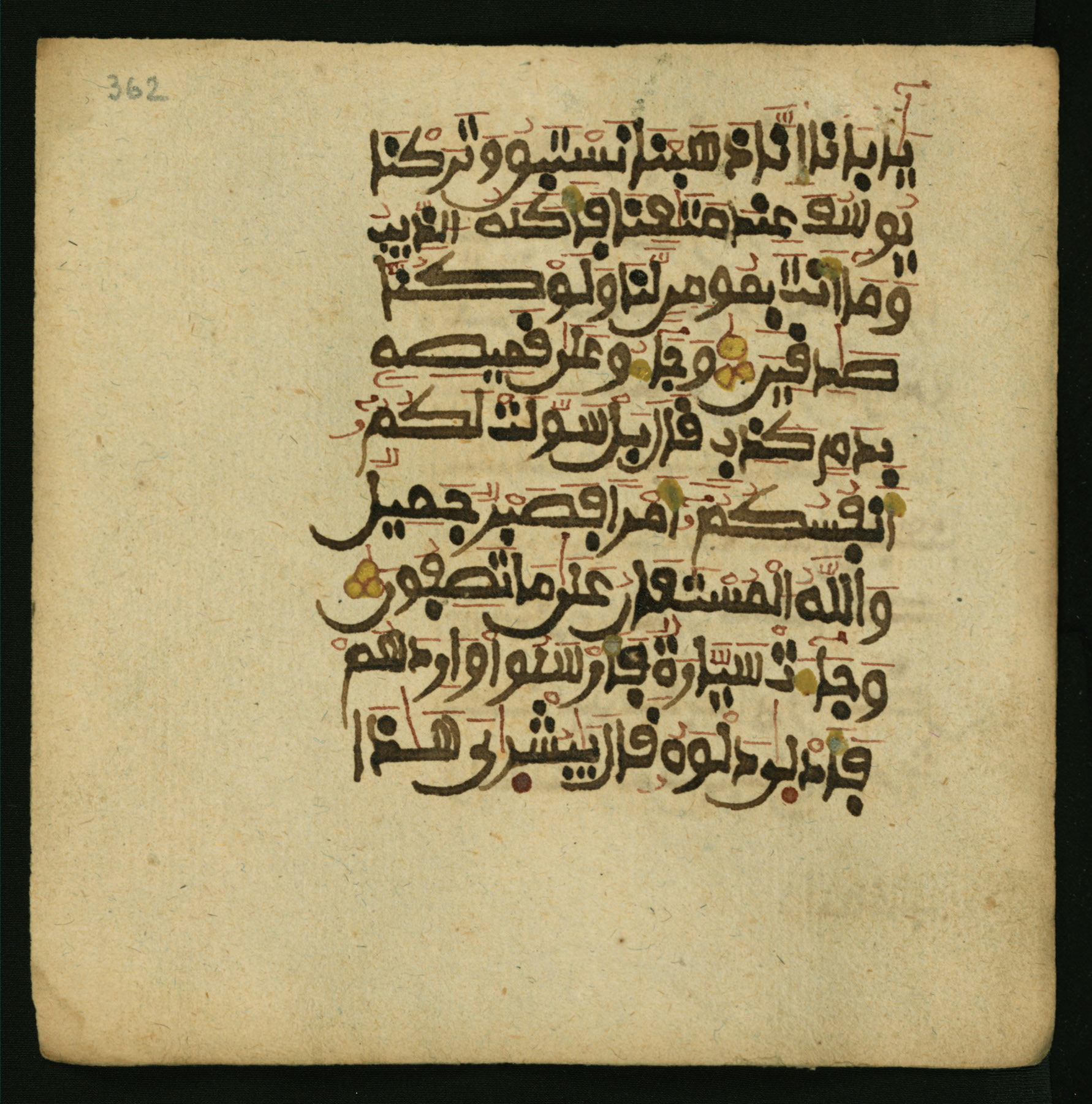 This square-format manuscript is volume 1, containing chapters 1-18 (Sūrat al-fātiḥah through Sūrat al-kahf), of an illuminated two-volume Qur'an produced in Sub-Saharan (West) Africa in the thirteenth century AH / nineteenth CE. The text is written in Sūdānī script in dark brown ink with vocalization in red on loose leaves. Chapter headings are in reddish-brown ink. Three yellow dots outlined in red arranged in a triangular form separate verses. Polychrome circular medallions as well as square and rectangular devices in a variety of patterns and colors mark textual divisions. The leaves of the text are organized between two decorated boards with geometric compositions. The pages and boards are housed in a leather pouch (satchel).