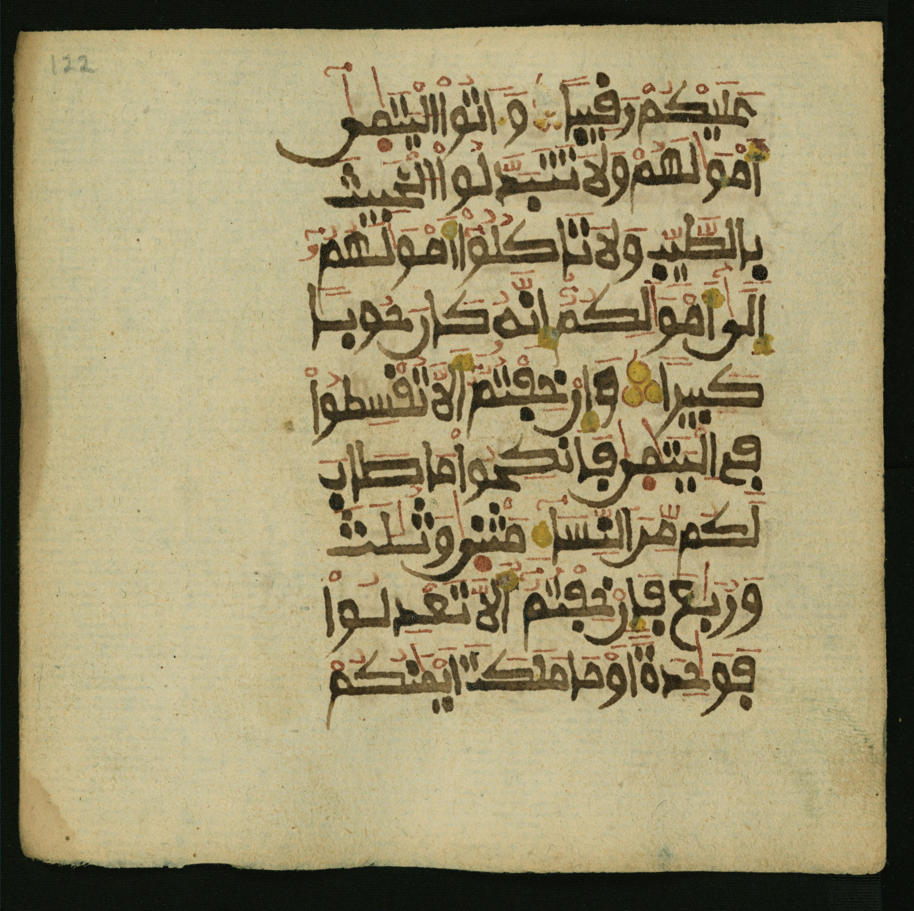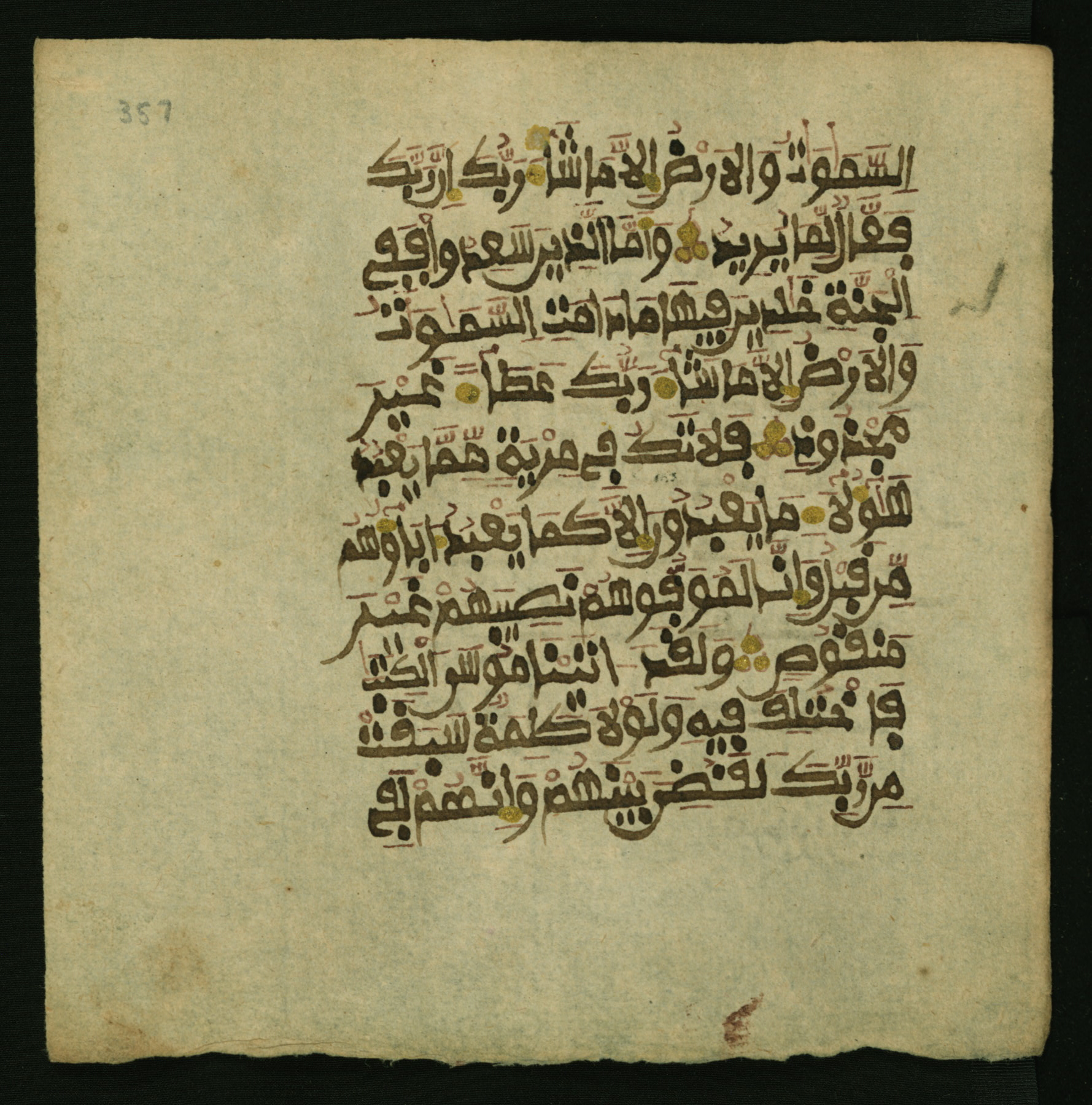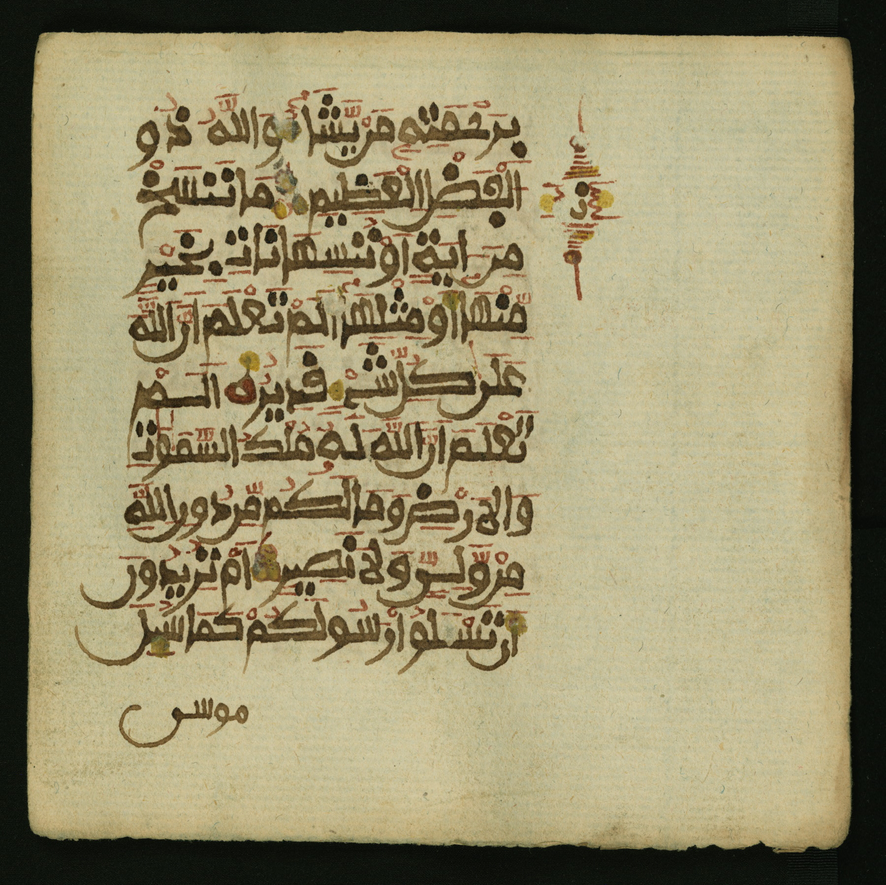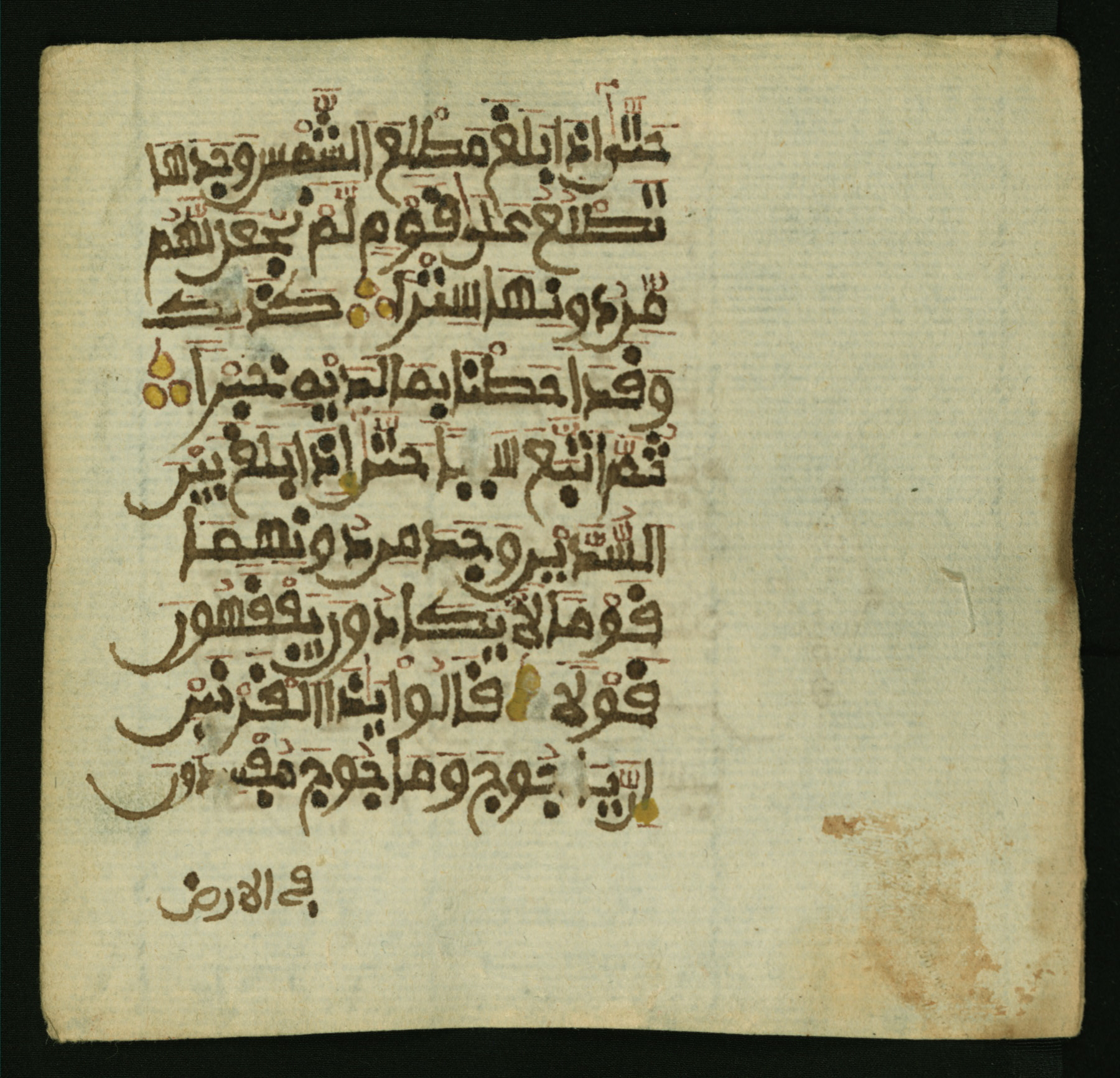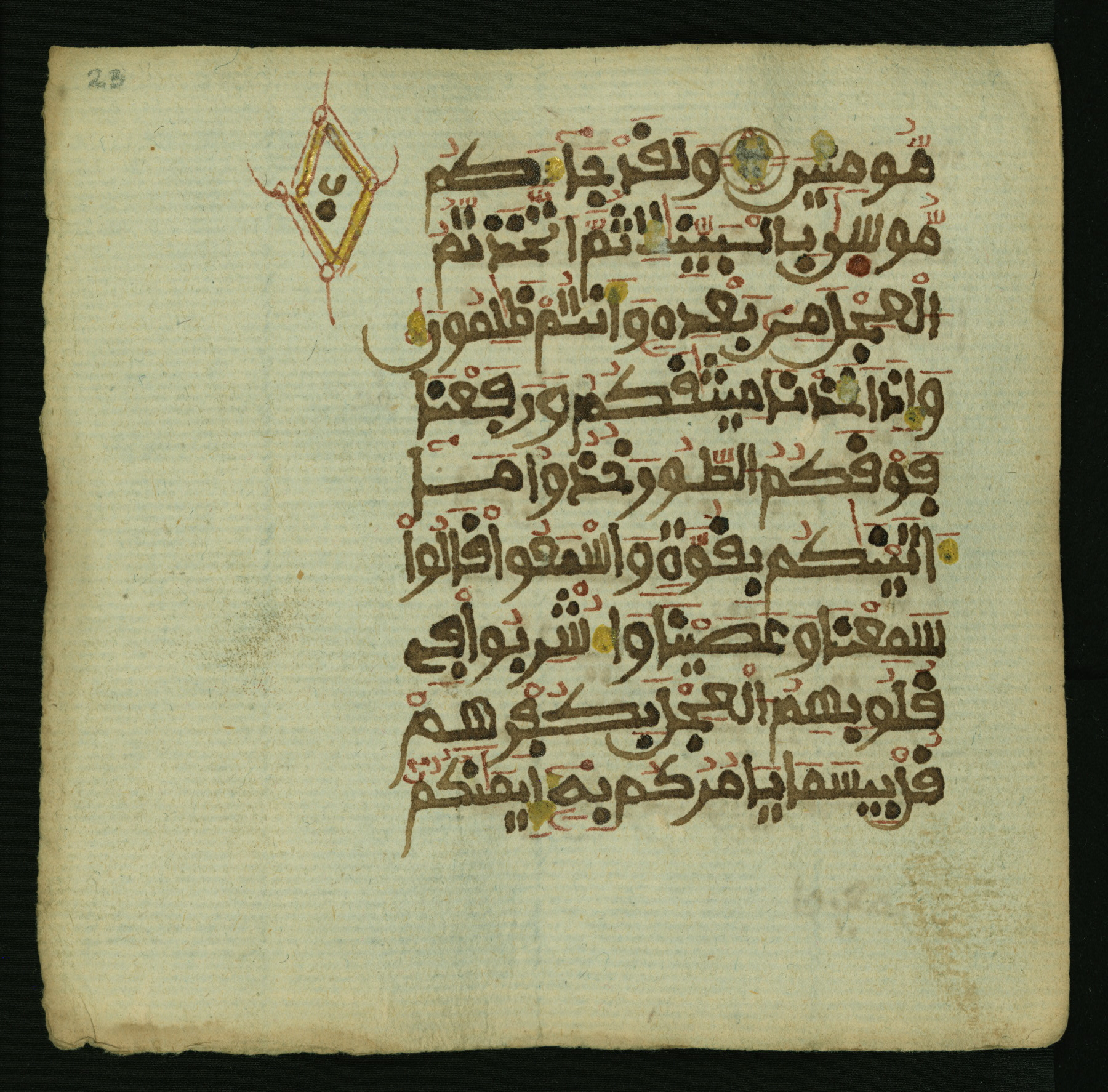 This square-format manuscript is volume 1, containing chapters 1-18 (Sūrat al-fātiḥah through Sūrat al-kahf), of an illuminated two-volume Qur'an produced in Sub-Saharan (West) Africa in the thirteenth century AH / nineteenth CE. The text is written in Sūdānī script in dark brown ink with vocalization in red on loose leaves. Chapter headings are in reddish-brown ink. Three yellow dots outlined in red arranged in a triangular form separate verses. Polychrome circular medallions as well as square and rectangular devices in a variety of patterns and colors mark textual divisions. The leaves of the text are organized between two decorated boards with geometric compositions. The pages and boards are housed in a leather pouch (satchel).