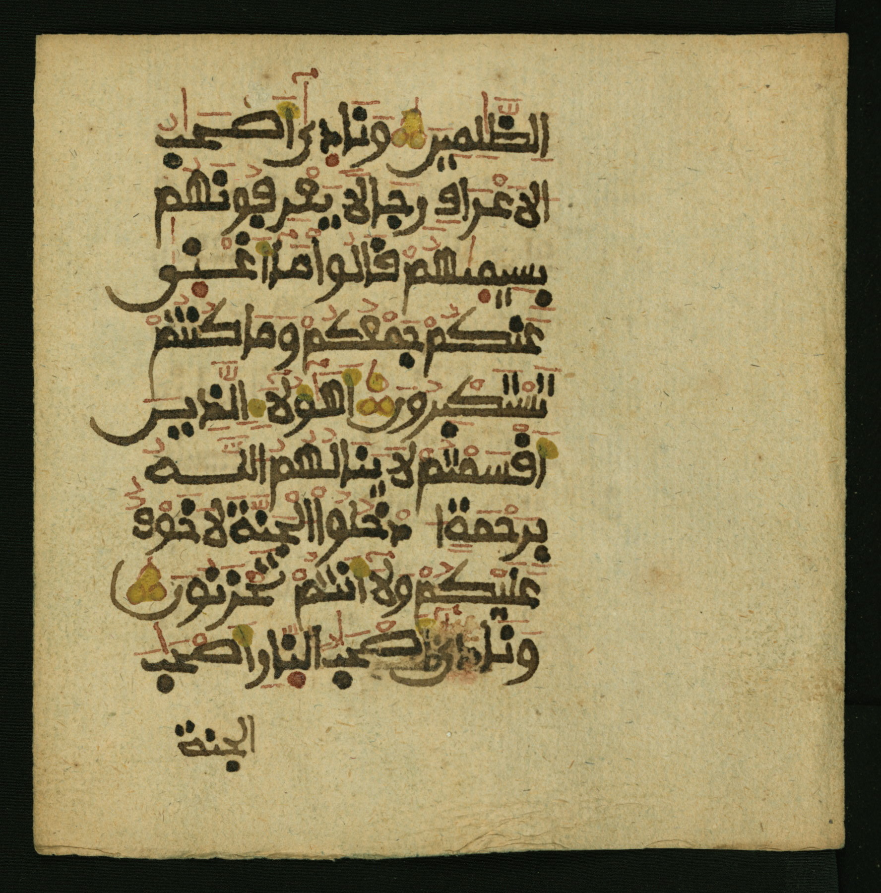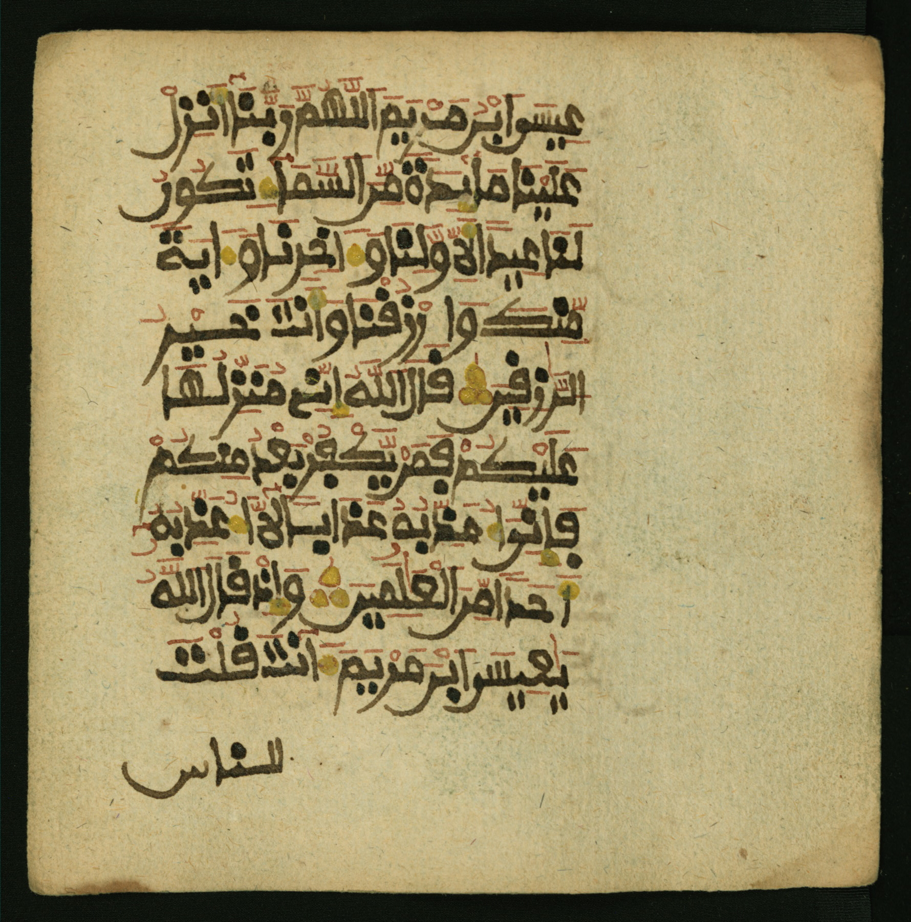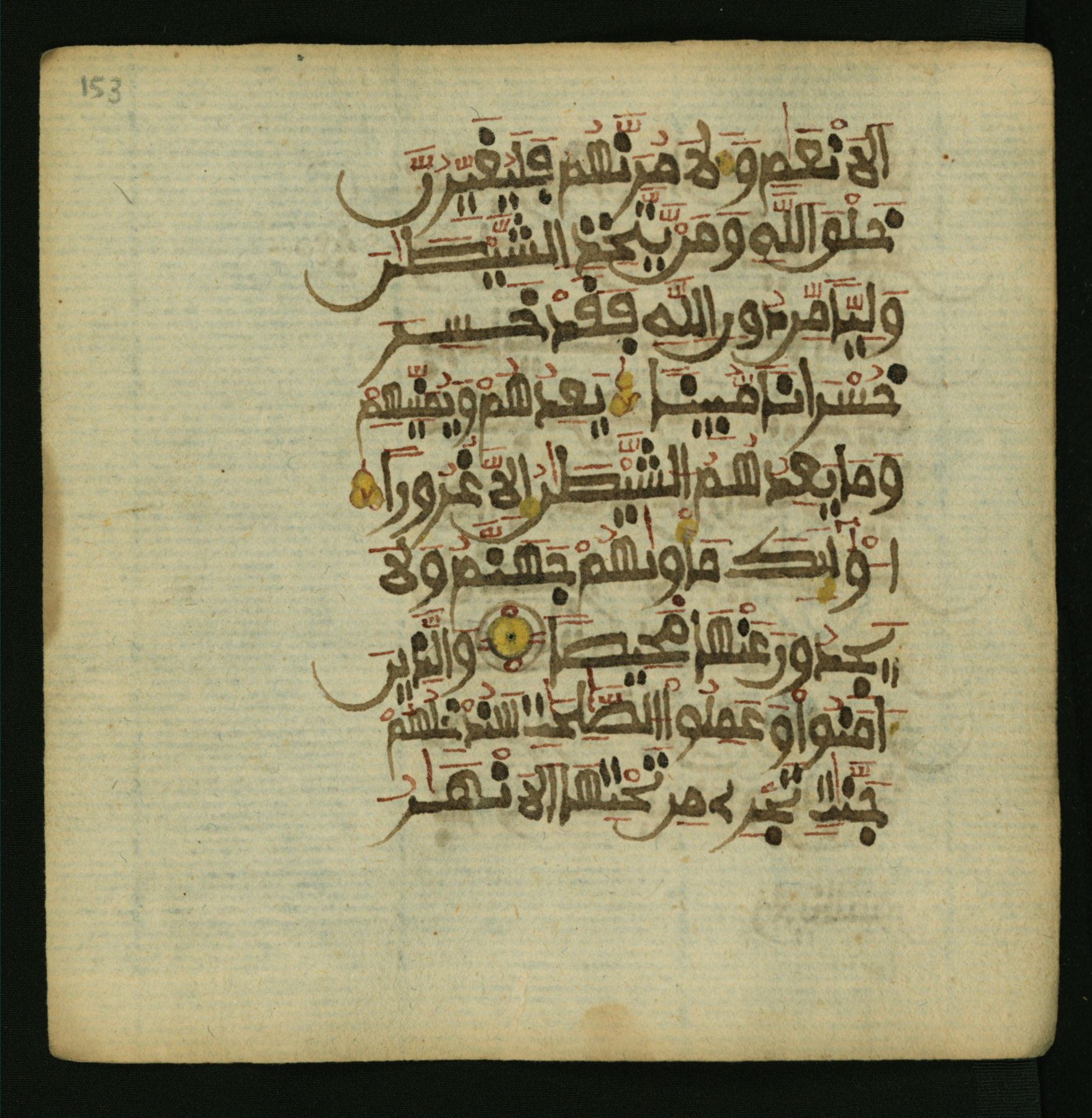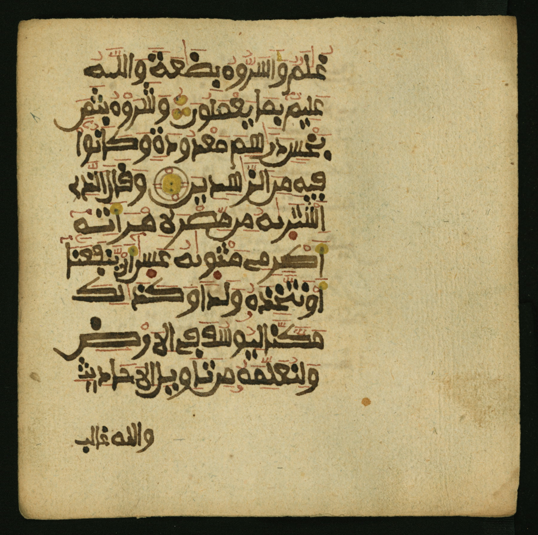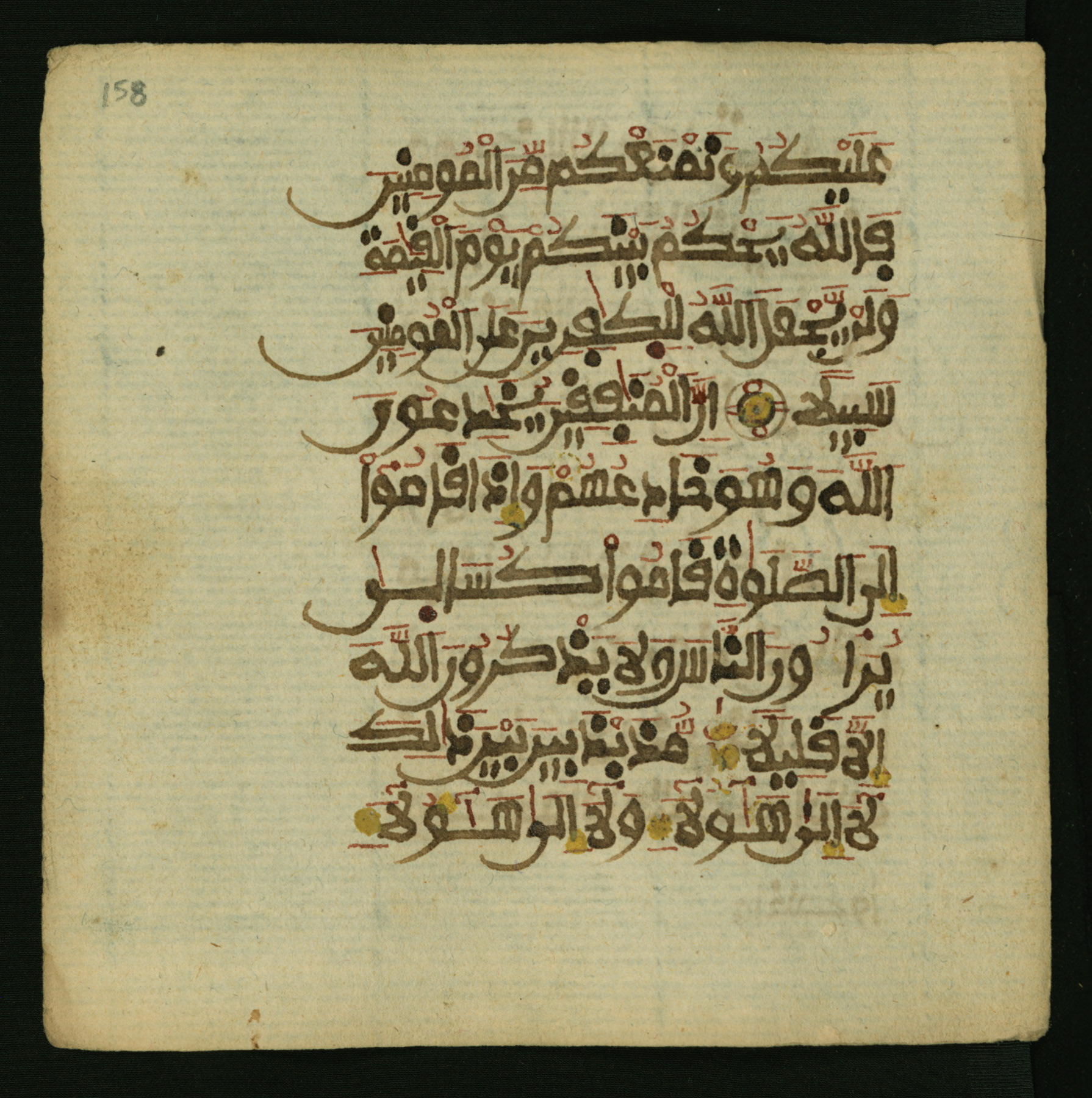 This square-format manuscript is volume 1, containing chapters 1-18 (Sūrat al-fātiḥah through Sūrat al-kahf), of an illuminated two-volume Qur'an produced in Sub-Saharan (West) Africa in the thirteenth century AH / nineteenth CE. The text is written in Sūdānī script in dark brown ink with vocalization in red on loose leaves. Chapter headings are in reddish-brown ink. Three yellow dots outlined in red arranged in a triangular form separate verses. Polychrome circular medallions as well as square and rectangular devices in a variety of patterns and colors mark textual divisions. The leaves of the text are organized between two decorated boards with geometric compositions. The pages and boards are housed in a leather pouch (satchel).