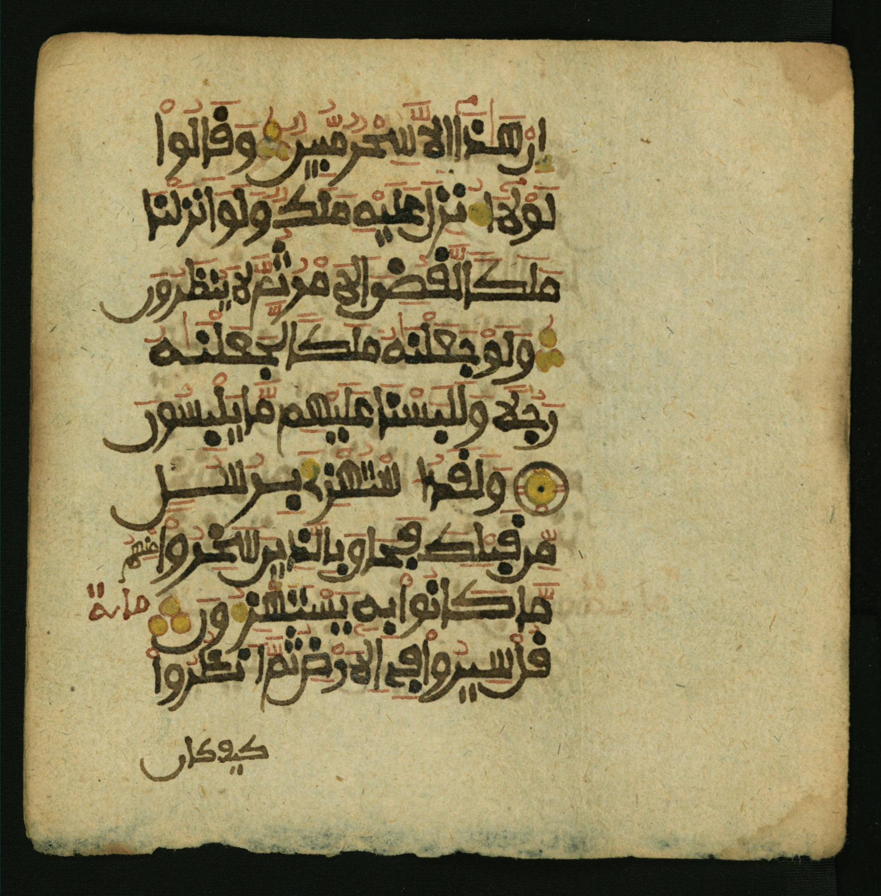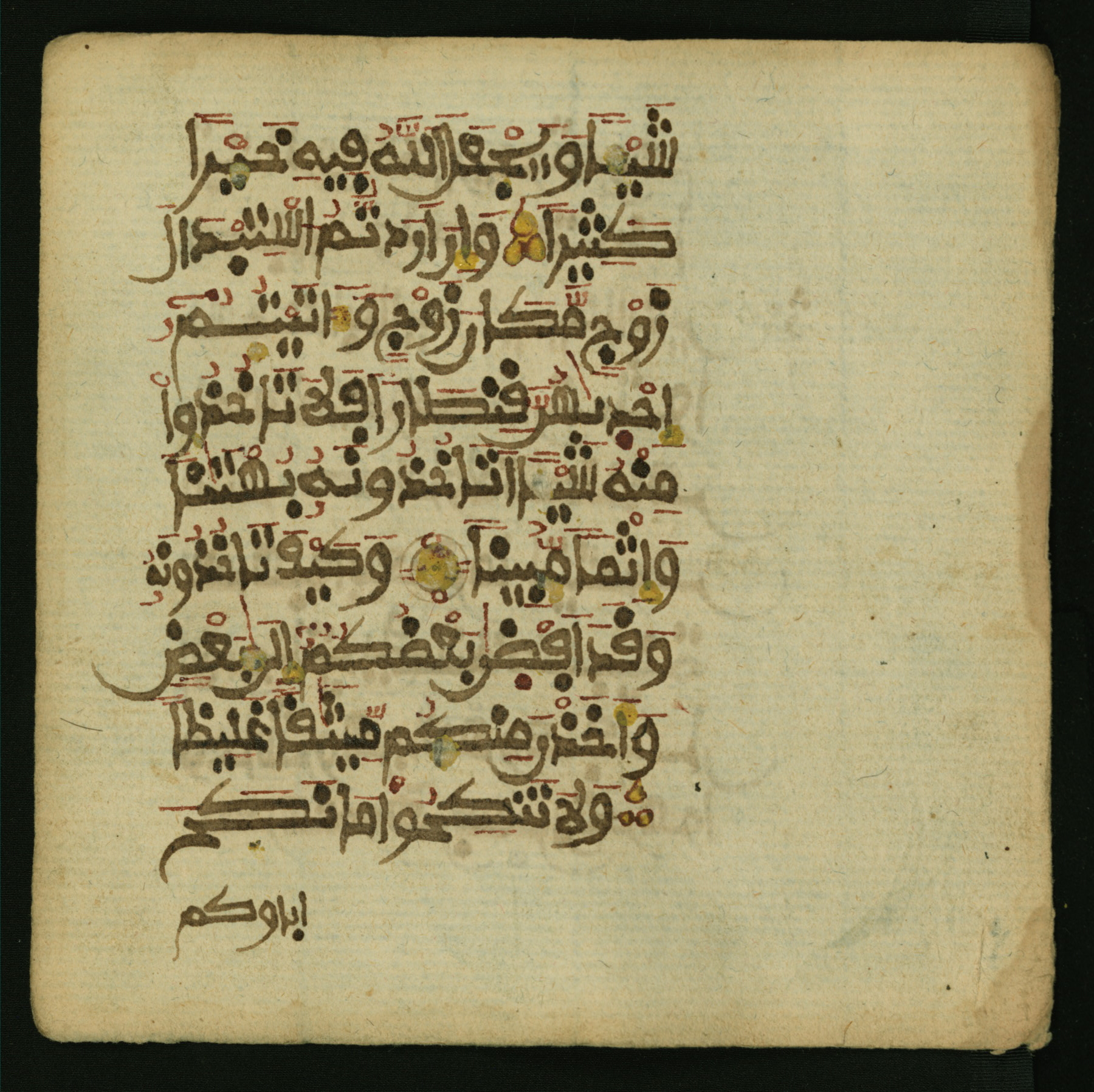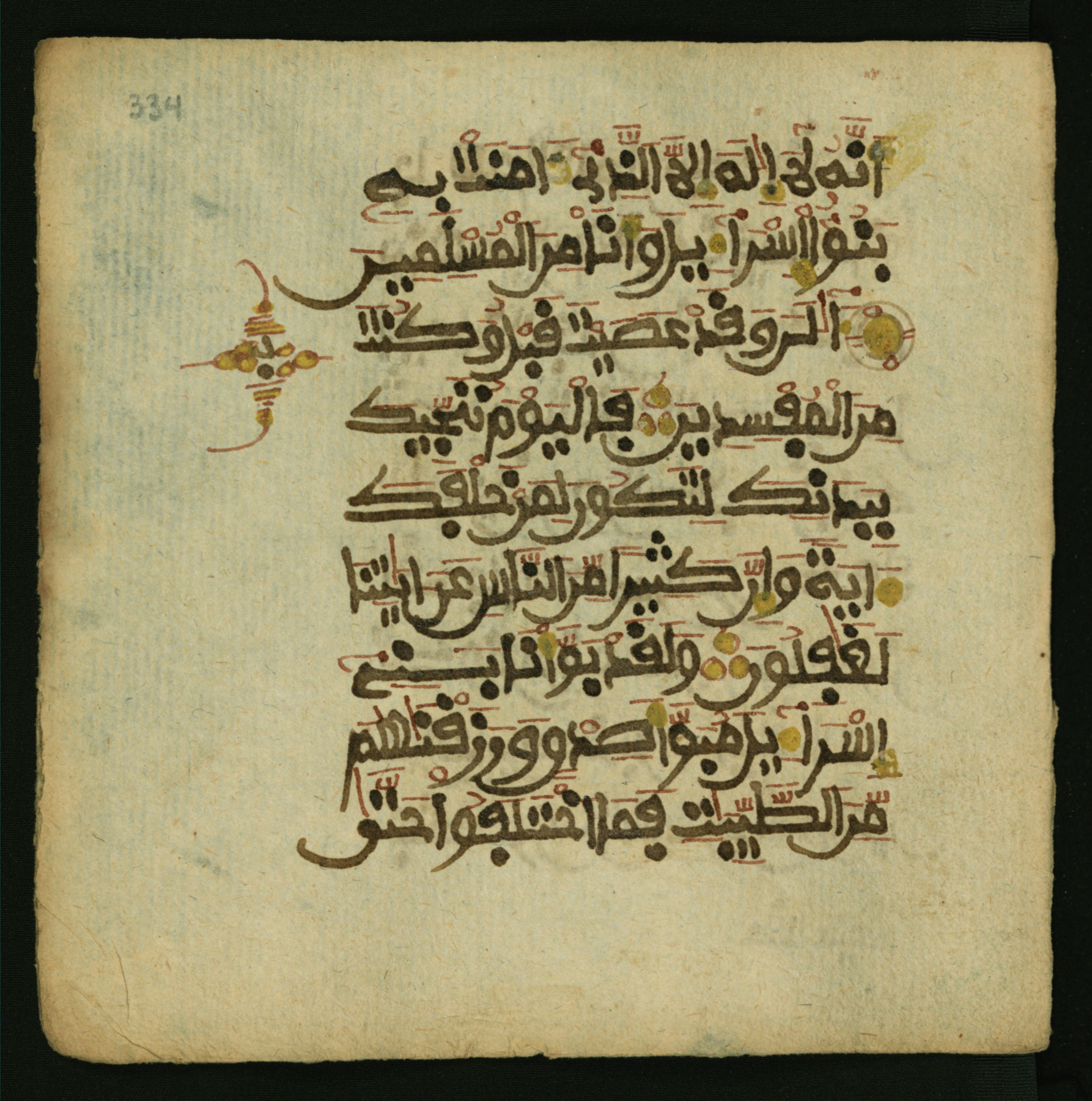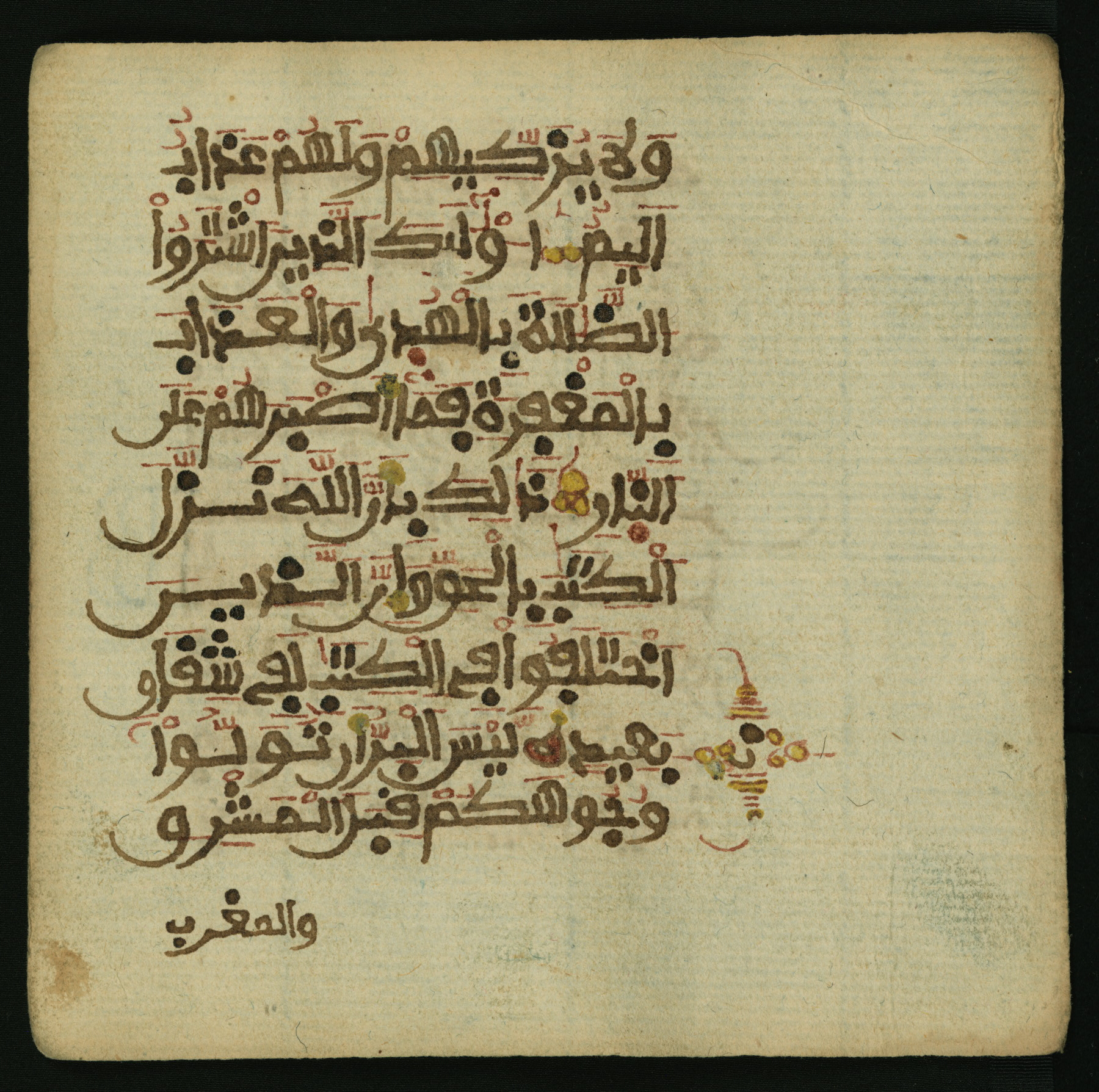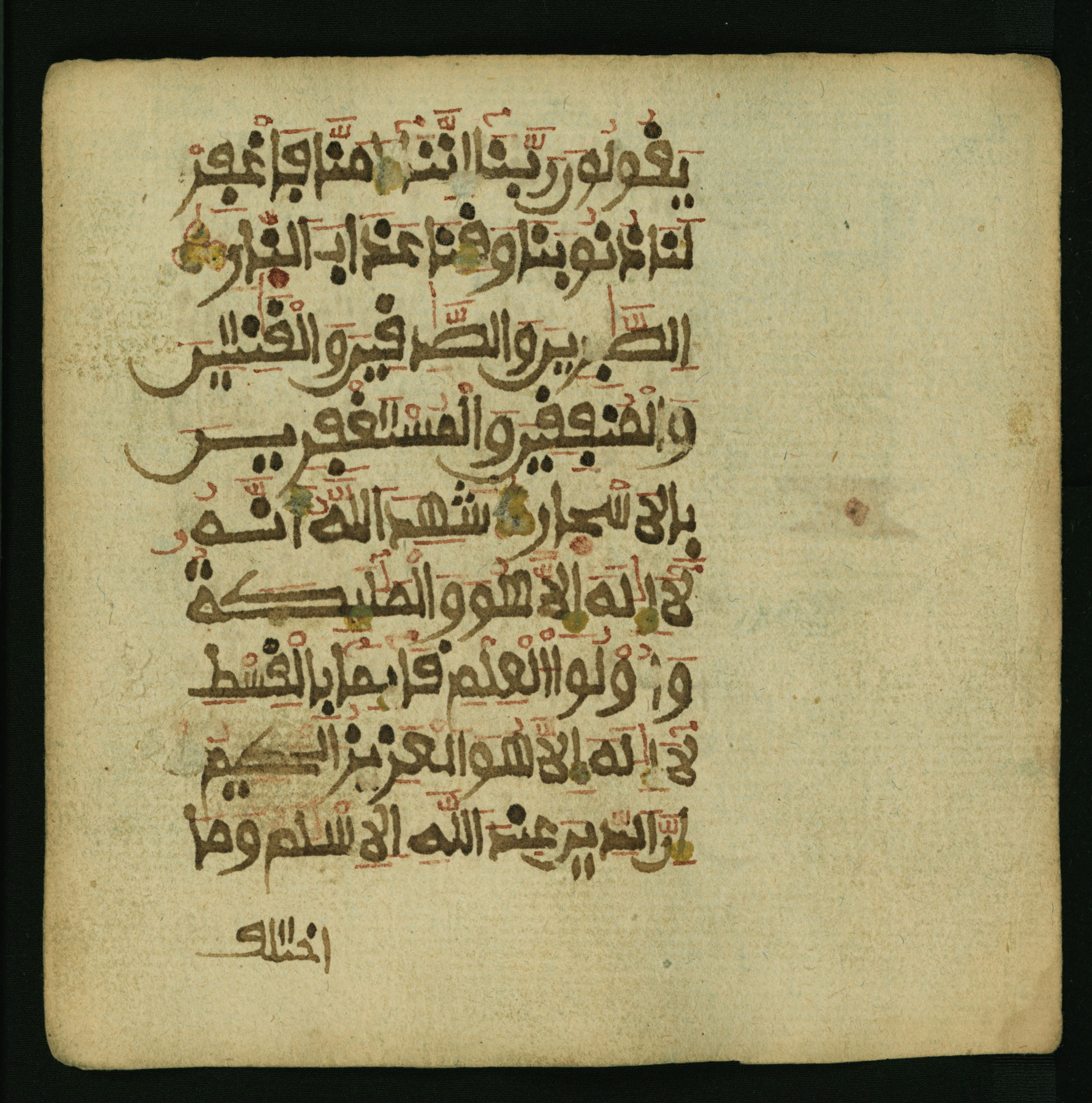 This square-format manuscript is volume 1, containing chapters 1-18 (Sūrat al-fātiḥah through Sūrat al-kahf), of an illuminated two-volume Qur'an produced in Sub-Saharan (West) Africa in the thirteenth century AH / nineteenth CE. The text is written in Sūdānī script in dark brown ink with vocalization in red on loose leaves. Chapter headings are in reddish-brown ink. Three yellow dots outlined in red arranged in a triangular form separate verses. Polychrome circular medallions as well as square and rectangular devices in a variety of patterns and colors mark textual divisions. The leaves of the text are organized between two decorated boards with geometric compositions. The pages and boards are housed in a leather pouch (satchel).