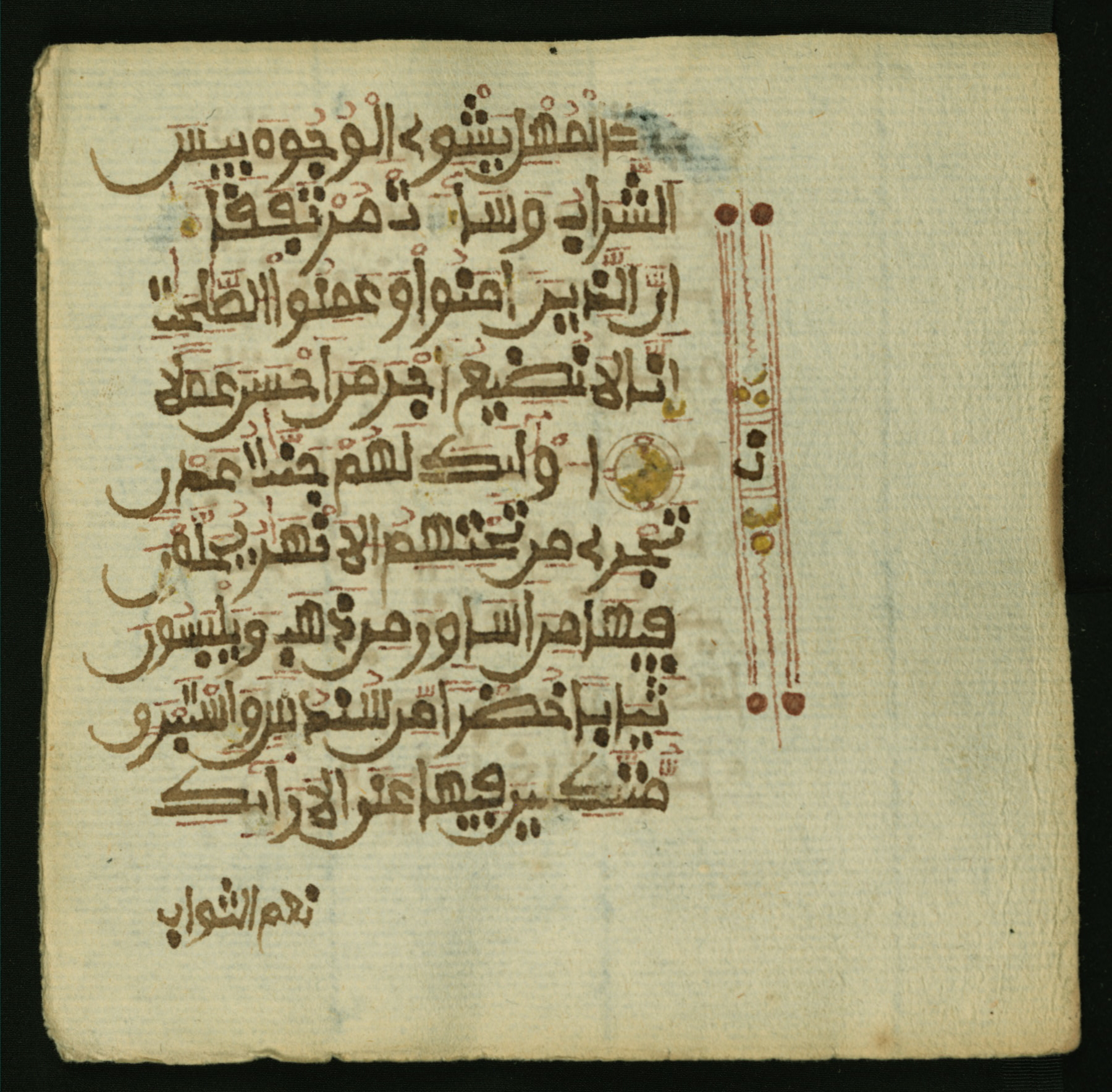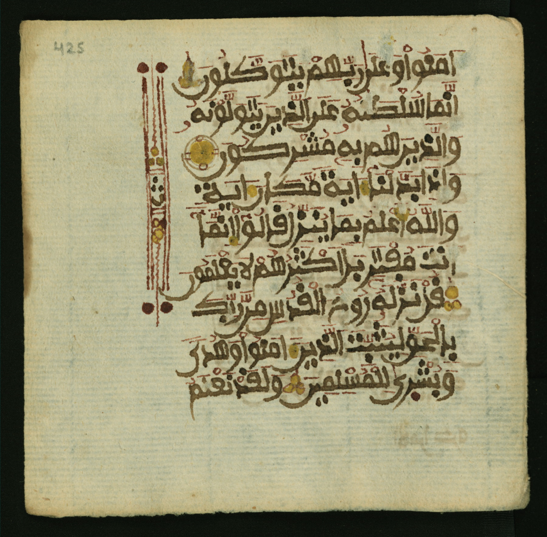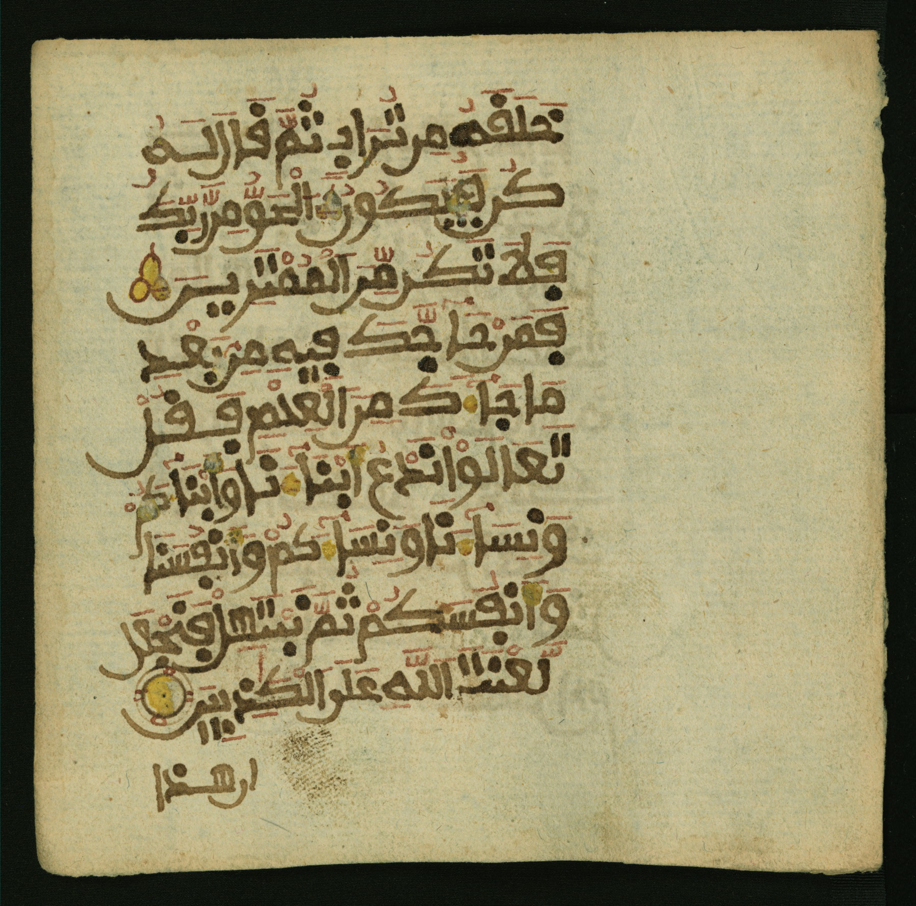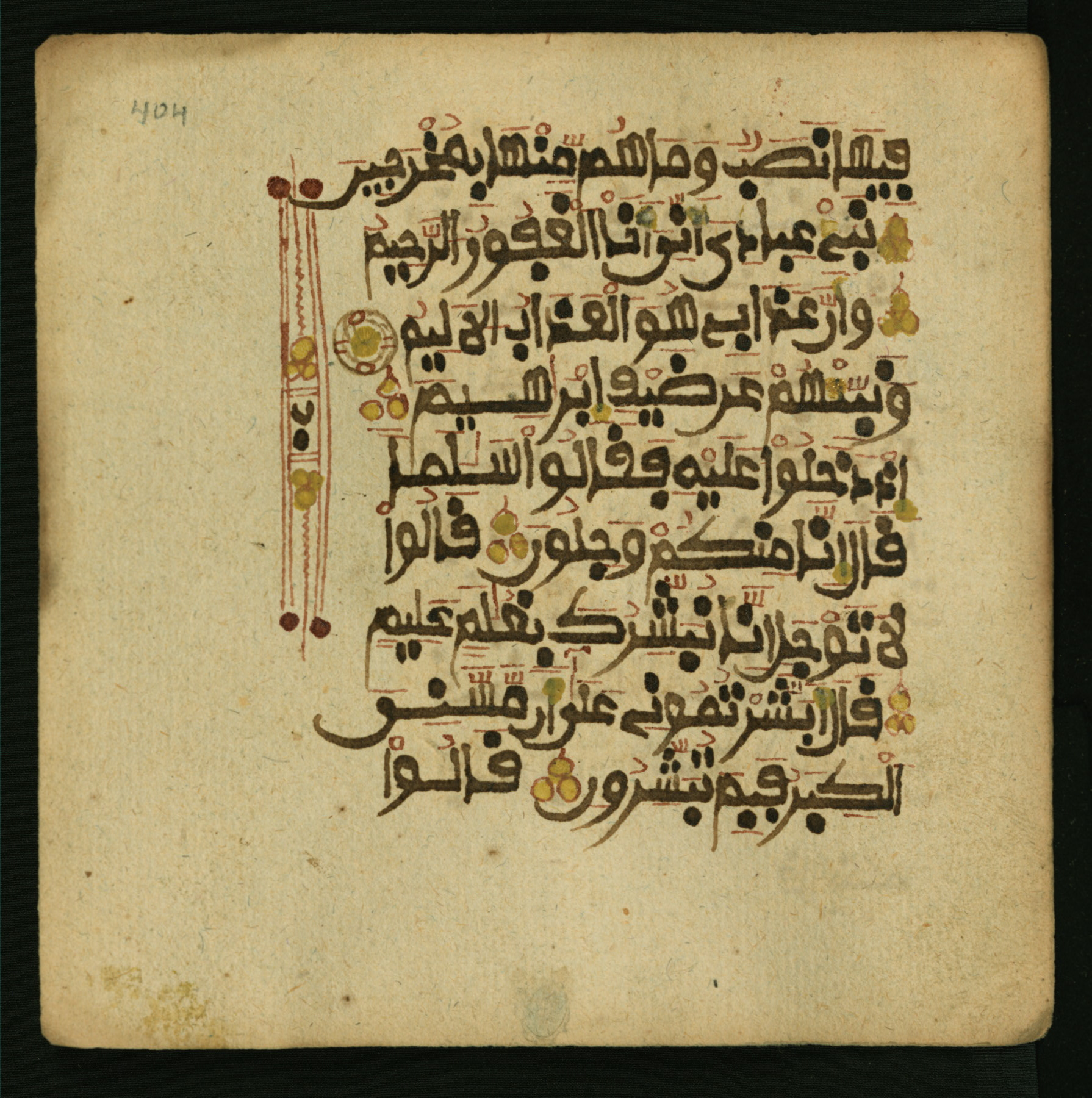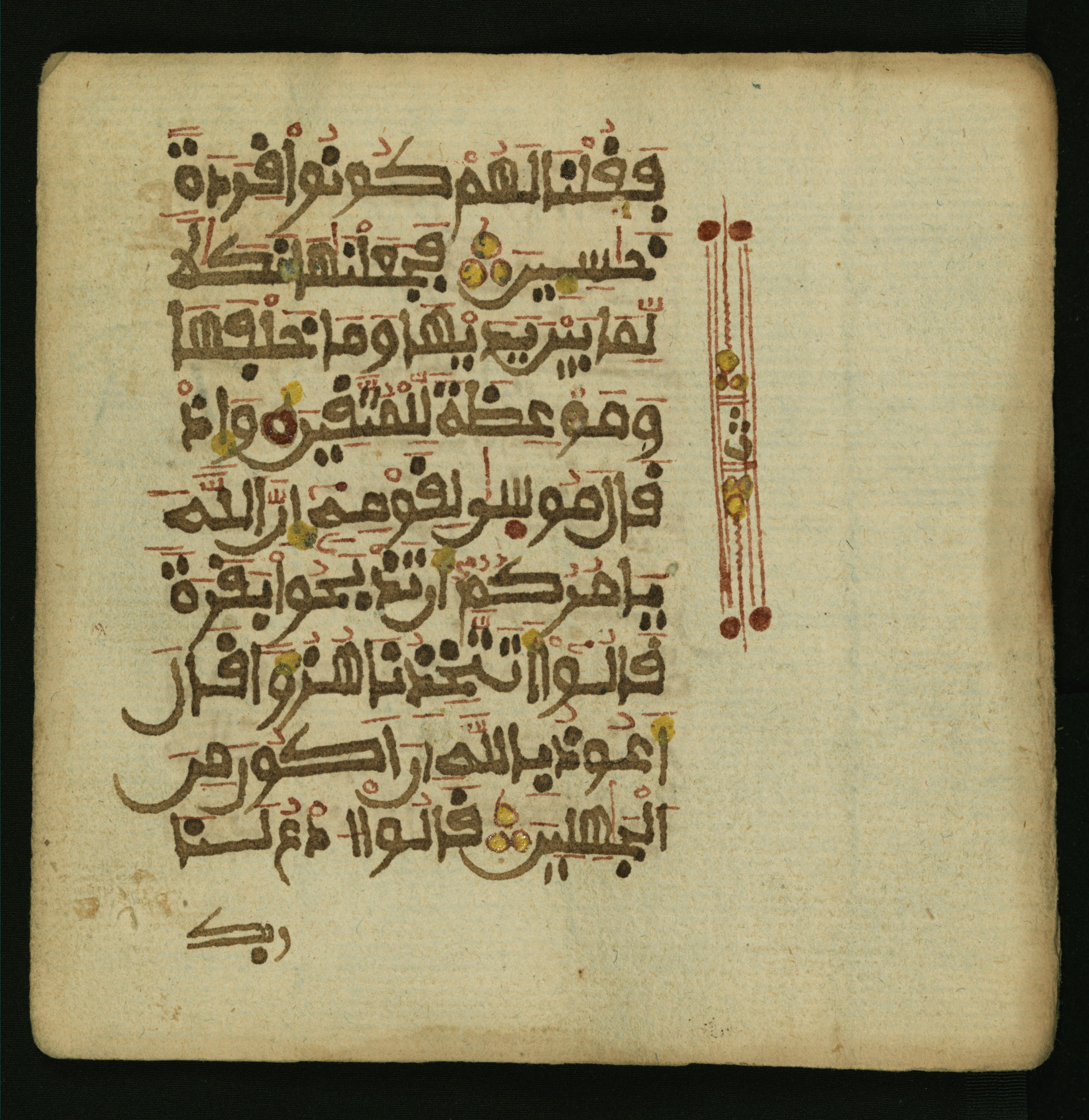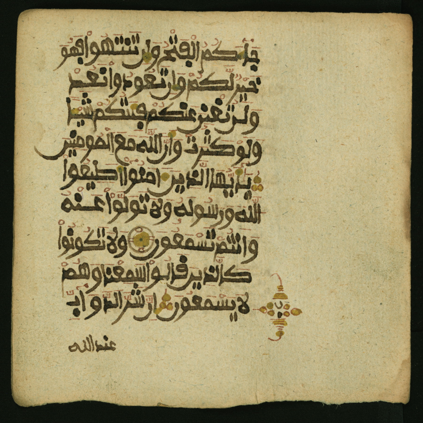 This square-format manuscript is volume 1, containing chapters 1-18 (Sūrat al-fātiḥah through Sūrat al-kahf), of an illuminated two-volume Qur'an produced in Sub-Saharan (West) Africa in the thirteenth century AH / nineteenth CE. The text is written in Sūdānī script in dark brown ink with vocalization in red on loose leaves. Chapter headings are in reddish-brown ink. Three yellow dots outlined in red arranged in a triangular form separate verses. Polychrome circular medallions as well as square and rectangular devices in a variety of patterns and colors mark textual divisions. The leaves of the text are organized between two decorated boards with geometric compositions. The pages and boards are housed in a leather pouch (satchel).