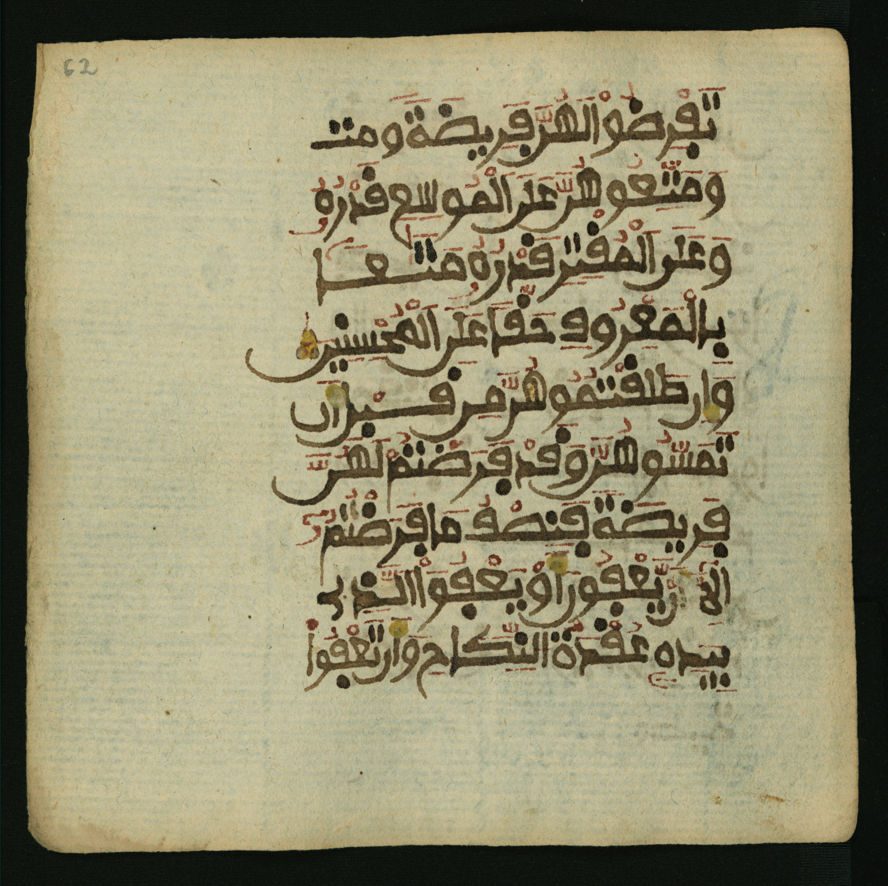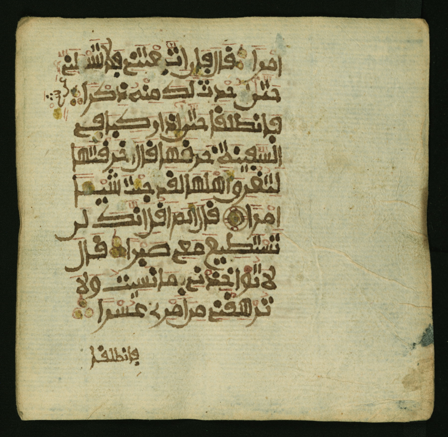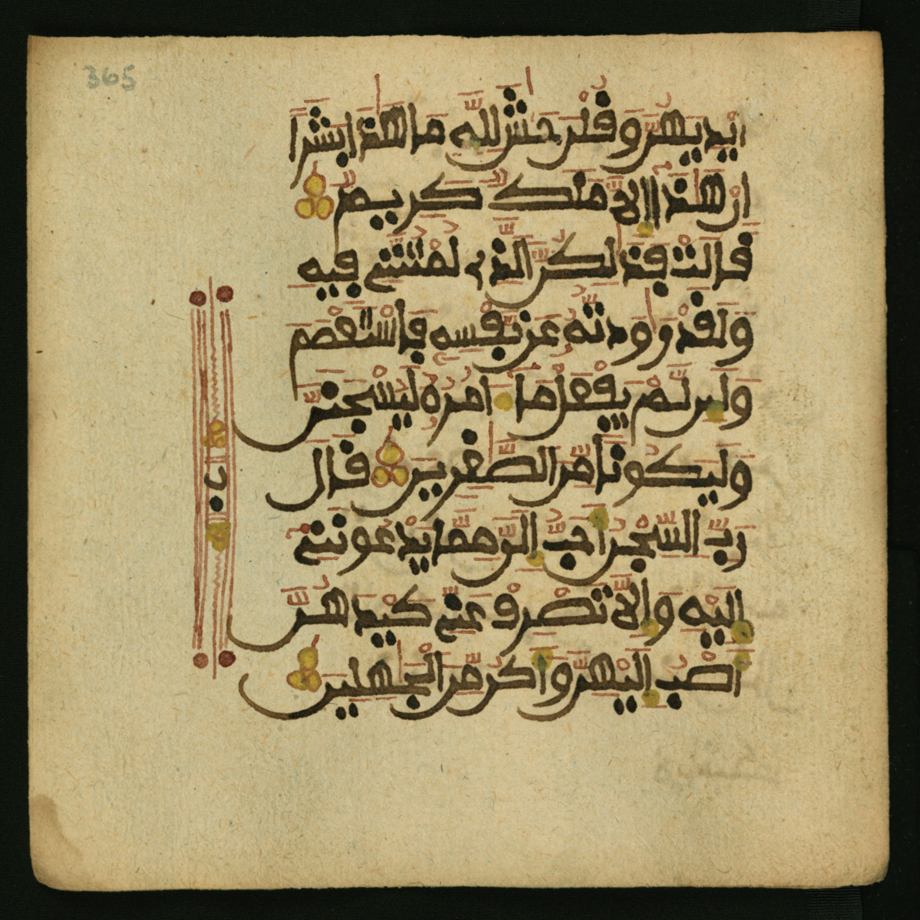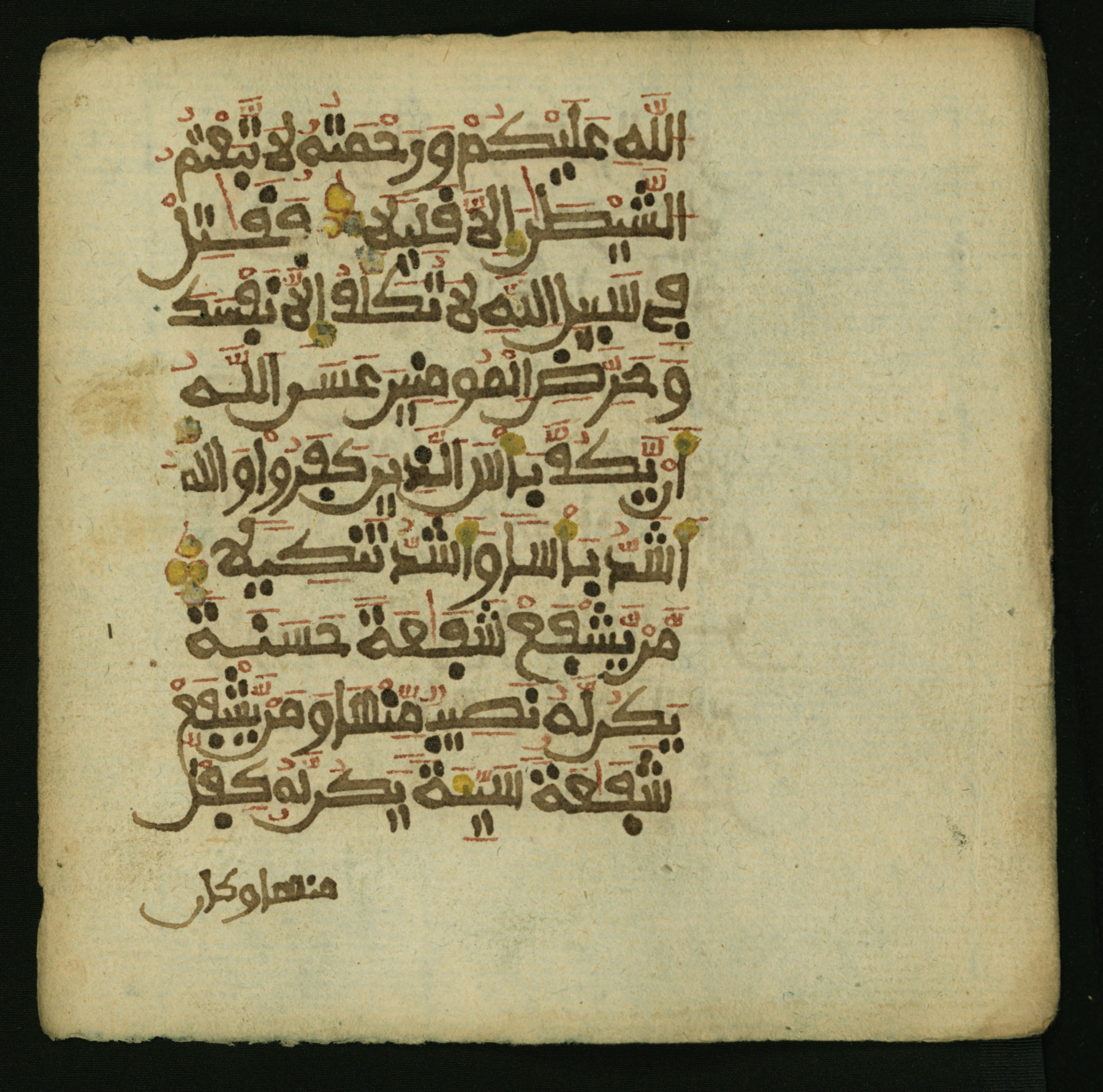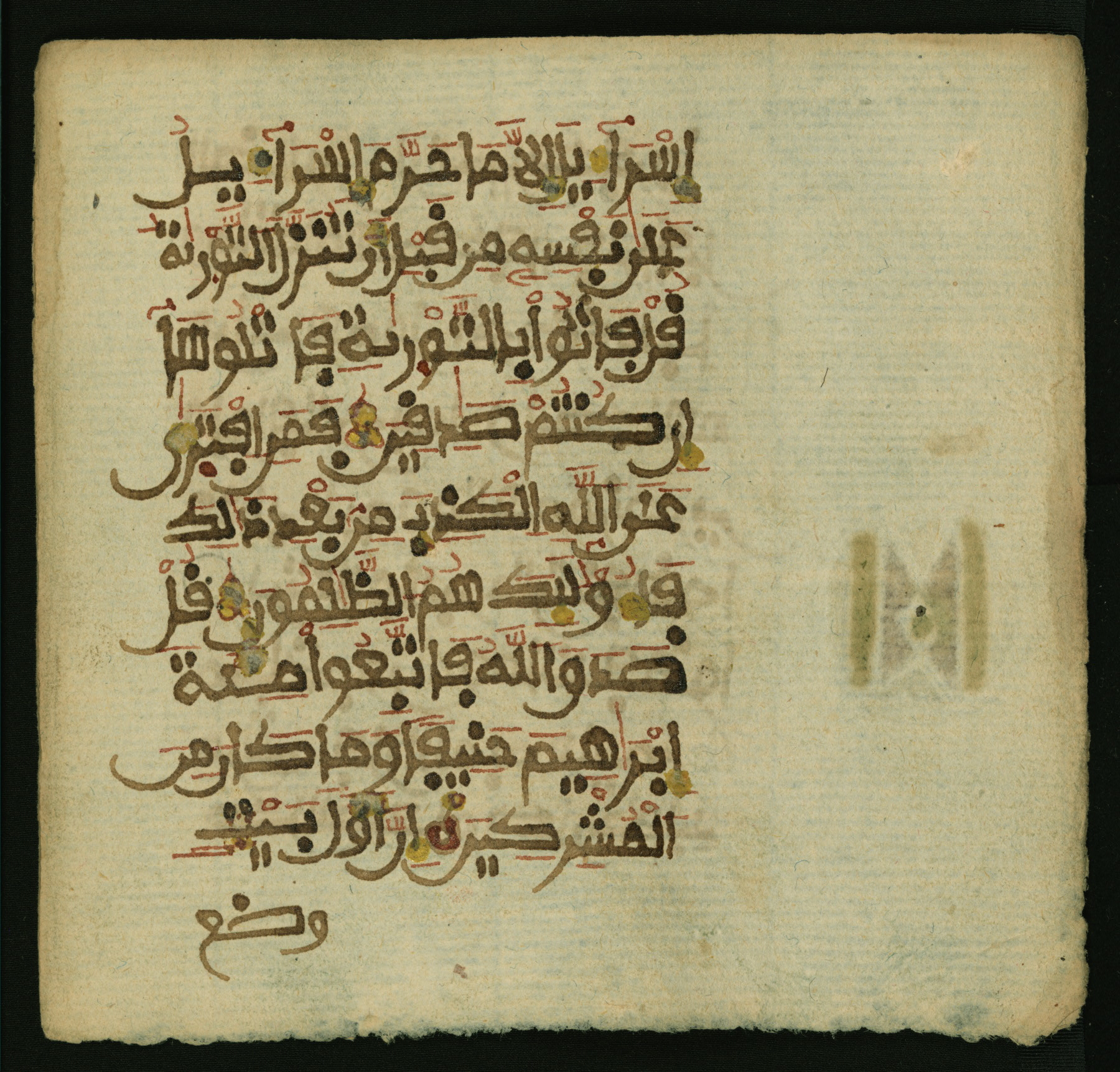 This square-format manuscript is volume 1, containing chapters 1-18 (Sūrat al-fātiḥah through Sūrat al-kahf), of an illuminated two-volume Qur'an produced in Sub-Saharan (West) Africa in the thirteenth century AH / nineteenth CE. The text is written in Sūdānī script in dark brown ink with vocalization in red on loose leaves. Chapter headings are in reddish-brown ink. Three yellow dots outlined in red arranged in a triangular form separate verses. Polychrome circular medallions as well as square and rectangular devices in a variety of patterns and colors mark textual divisions. The leaves of the text are organized between two decorated boards with geometric compositions. The pages and boards are housed in a leather pouch (satchel).