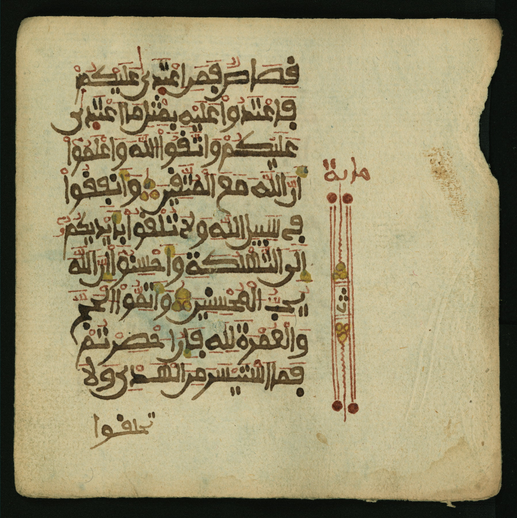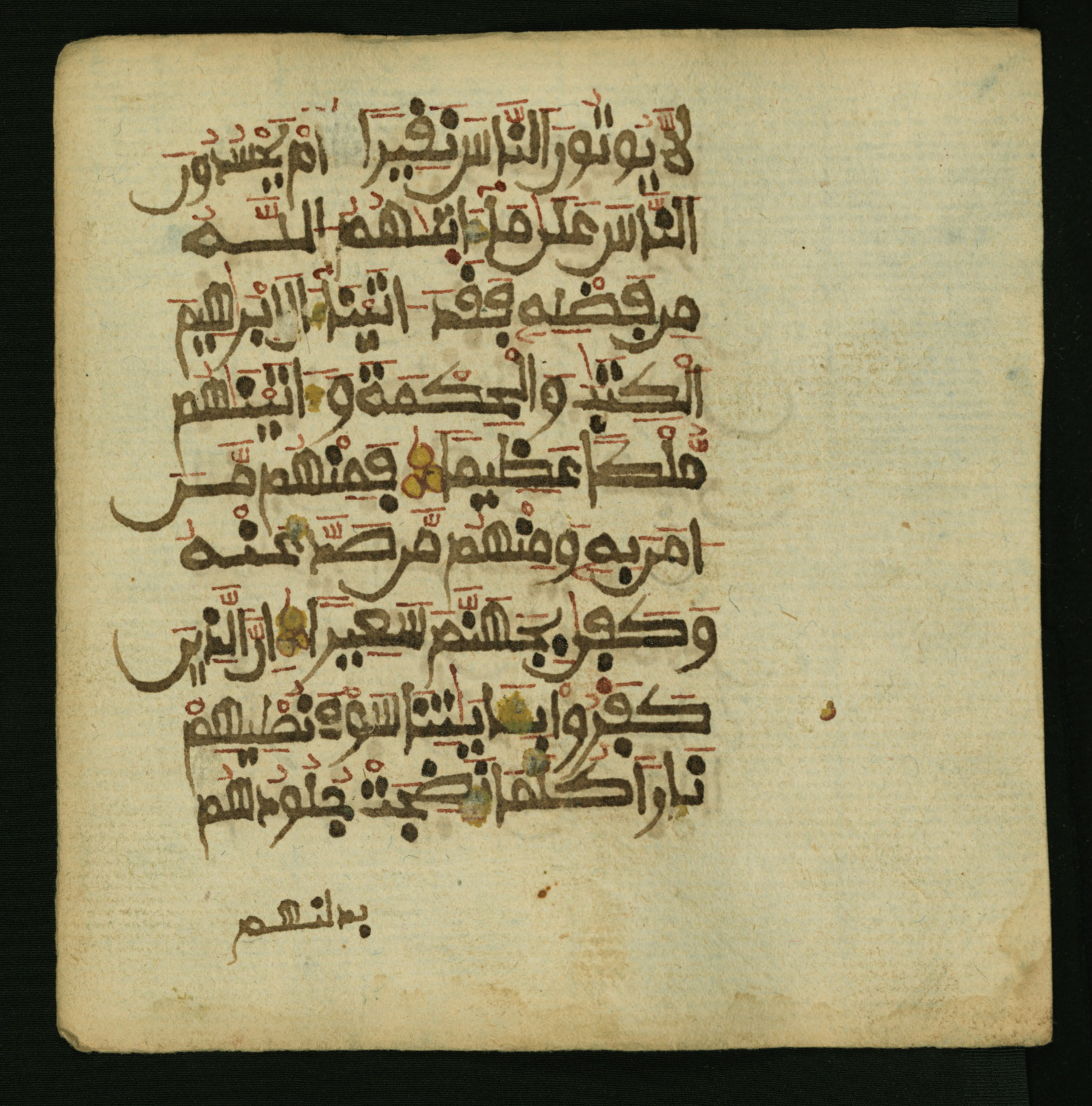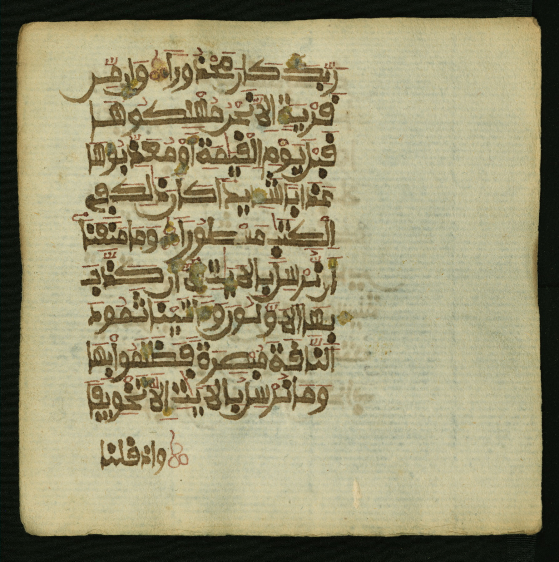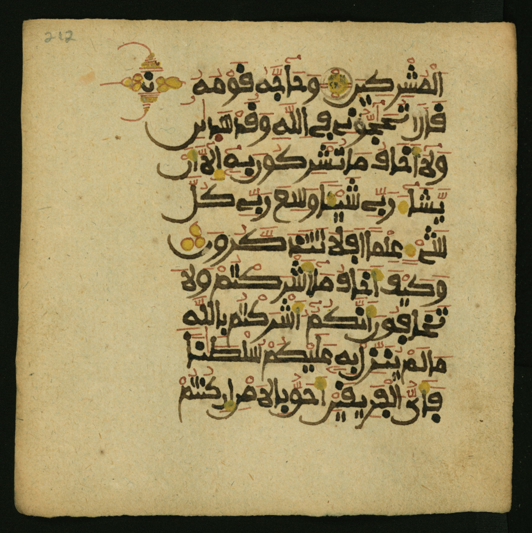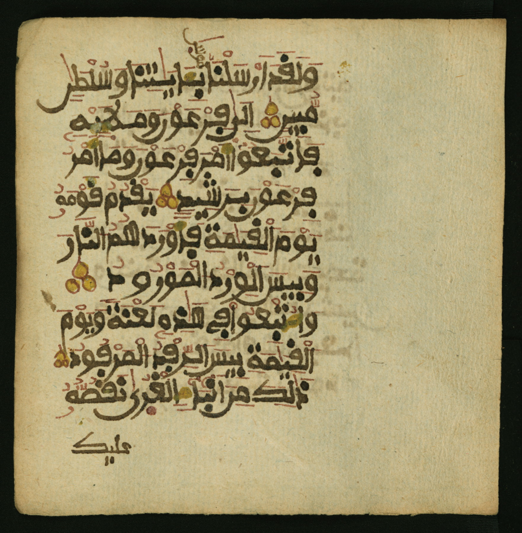 This square-format manuscript is volume 1, containing chapters 1-18 (Sūrat al-fātiḥah through Sūrat al-kahf), of an illuminated two-volume Qur'an produced in Sub-Saharan (West) Africa in the thirteenth century AH / nineteenth CE. The text is written in Sūdānī script in dark brown ink with vocalization in red on loose leaves. Chapter headings are in reddish-brown ink. Three yellow dots outlined in red arranged in a triangular form separate verses. Polychrome circular medallions as well as square and rectangular devices in a variety of patterns and colors mark textual divisions. The leaves of the text are organized between two decorated boards with geometric compositions. The pages and boards are housed in a leather pouch (satchel).