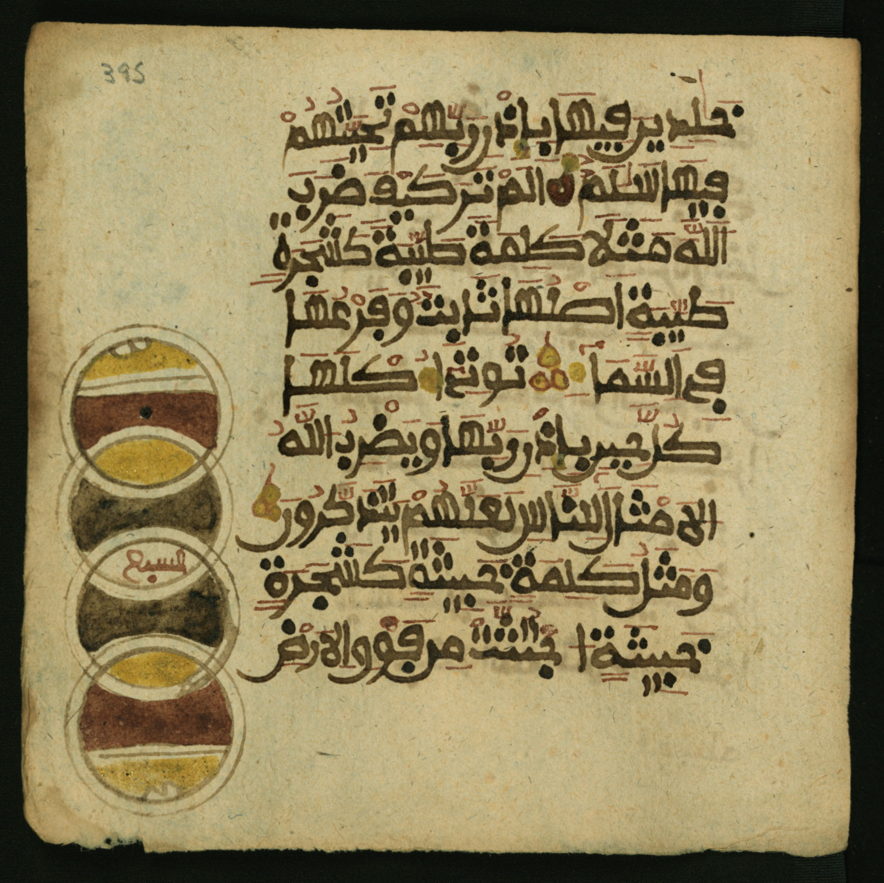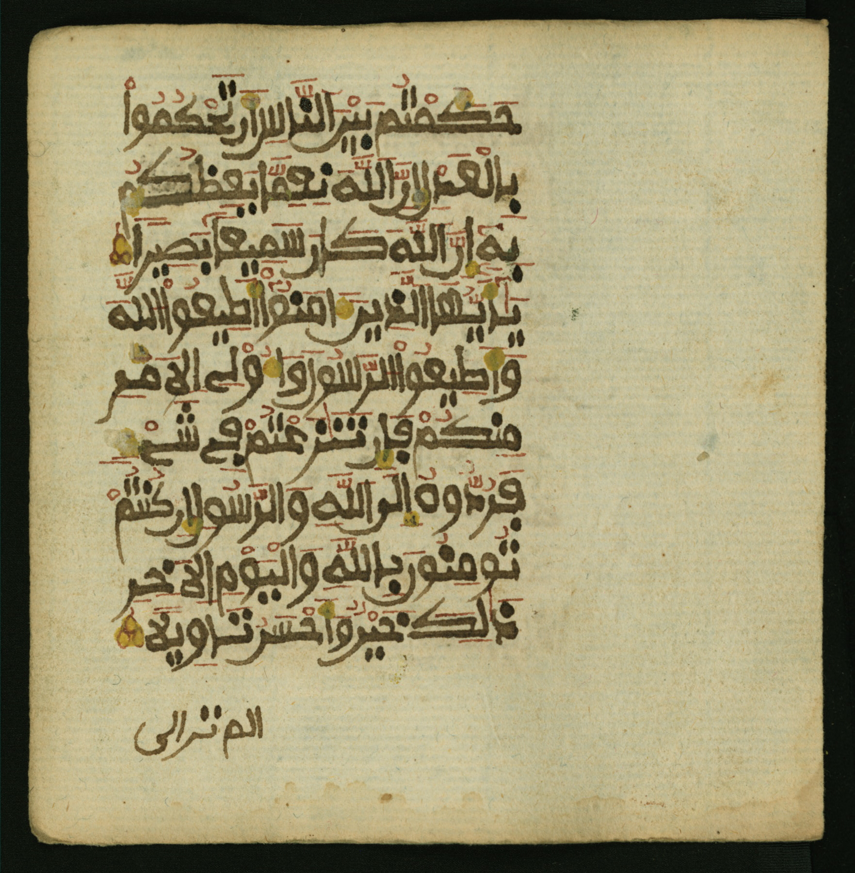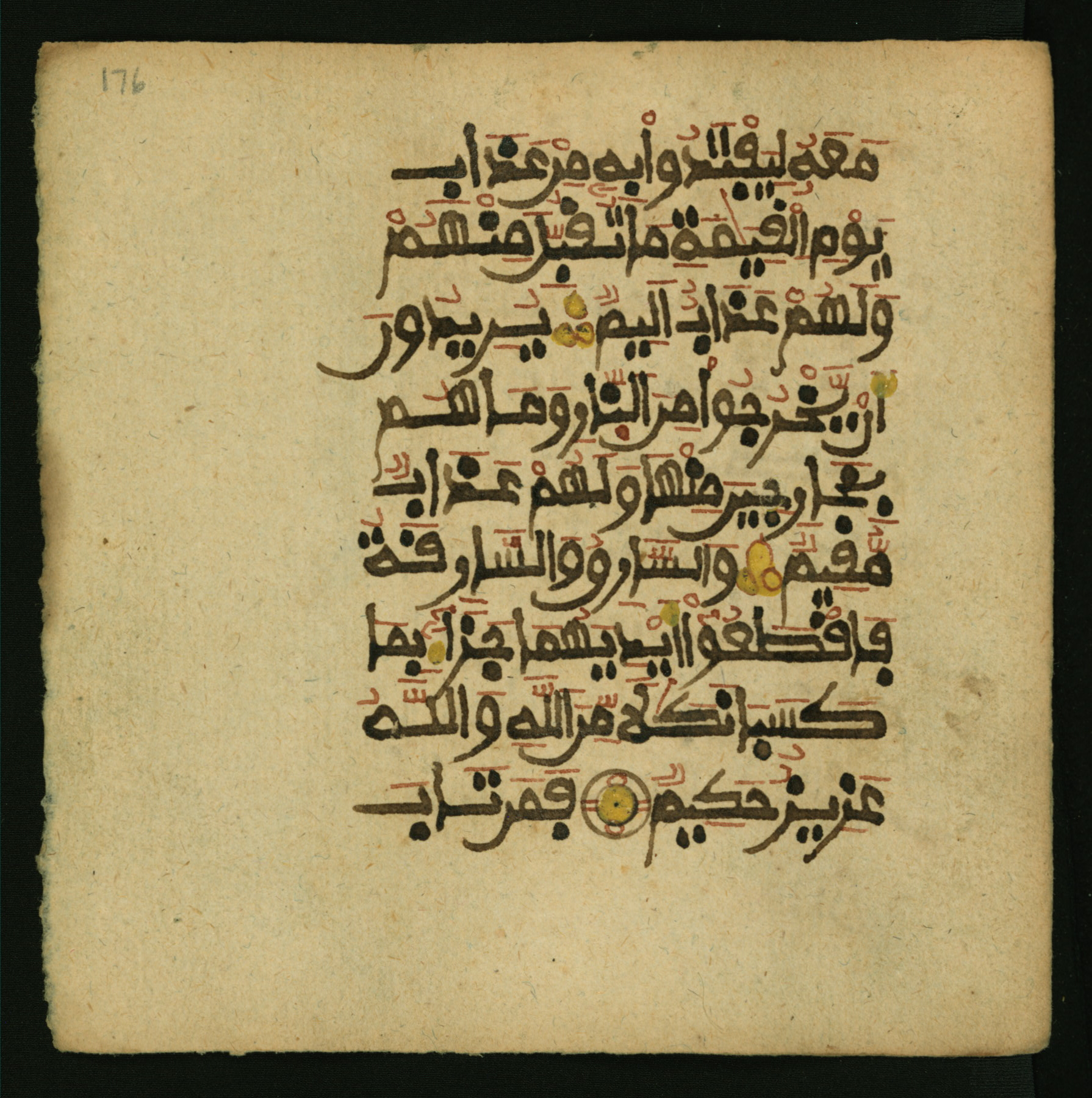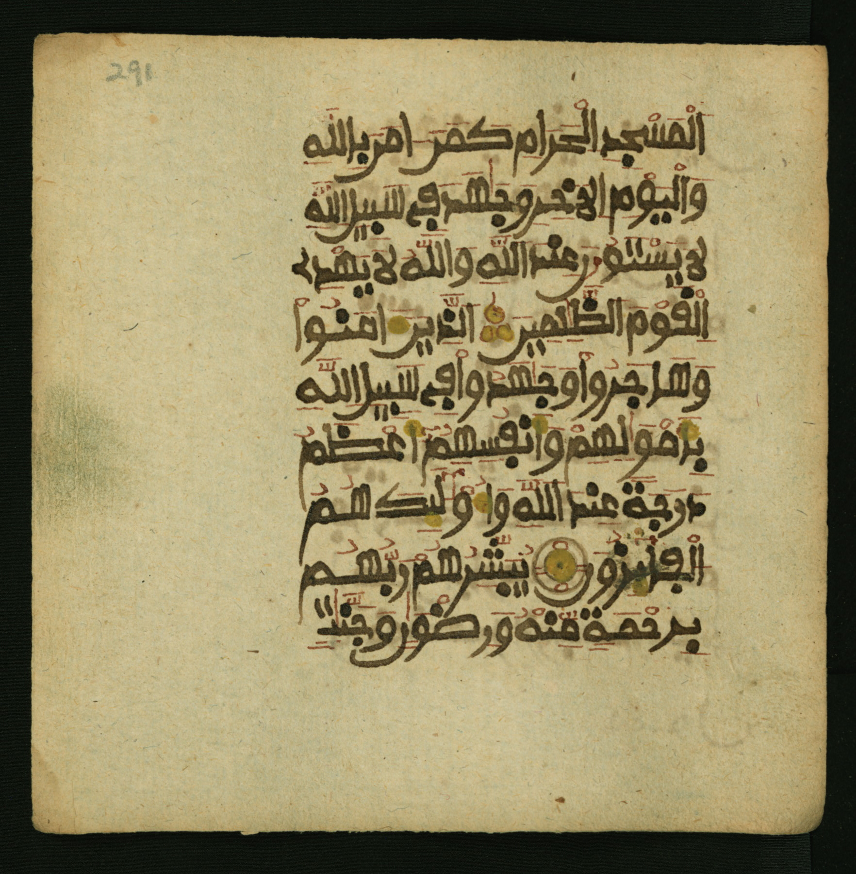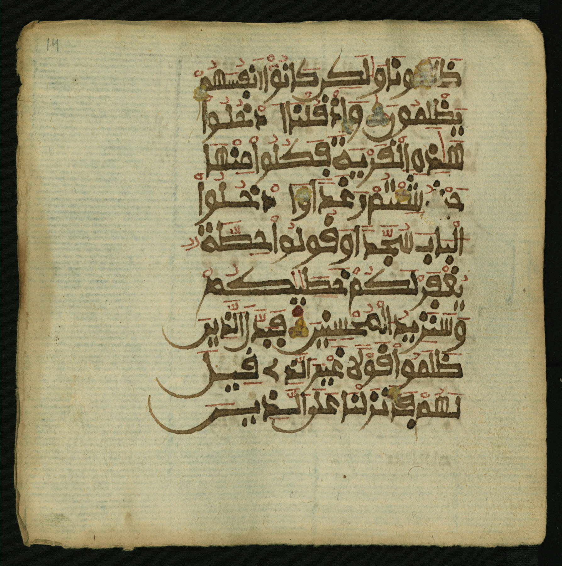 This square-format manuscript is volume 1, containing chapters 1-18 (Sūrat al-fātiḥah through Sūrat al-kahf), of an illuminated two-volume Qur'an produced in Sub-Saharan (West) Africa in the thirteenth century AH / nineteenth CE. The text is written in Sūdānī script in dark brown ink with vocalization in red on loose leaves. Chapter headings are in reddish-brown ink. Three yellow dots outlined in red arranged in a triangular form separate verses. Polychrome circular medallions as well as square and rectangular devices in a variety of patterns and colors mark textual divisions. The leaves of the text are organized between two decorated boards with geometric compositions. The pages and boards are housed in a leather pouch (satchel).