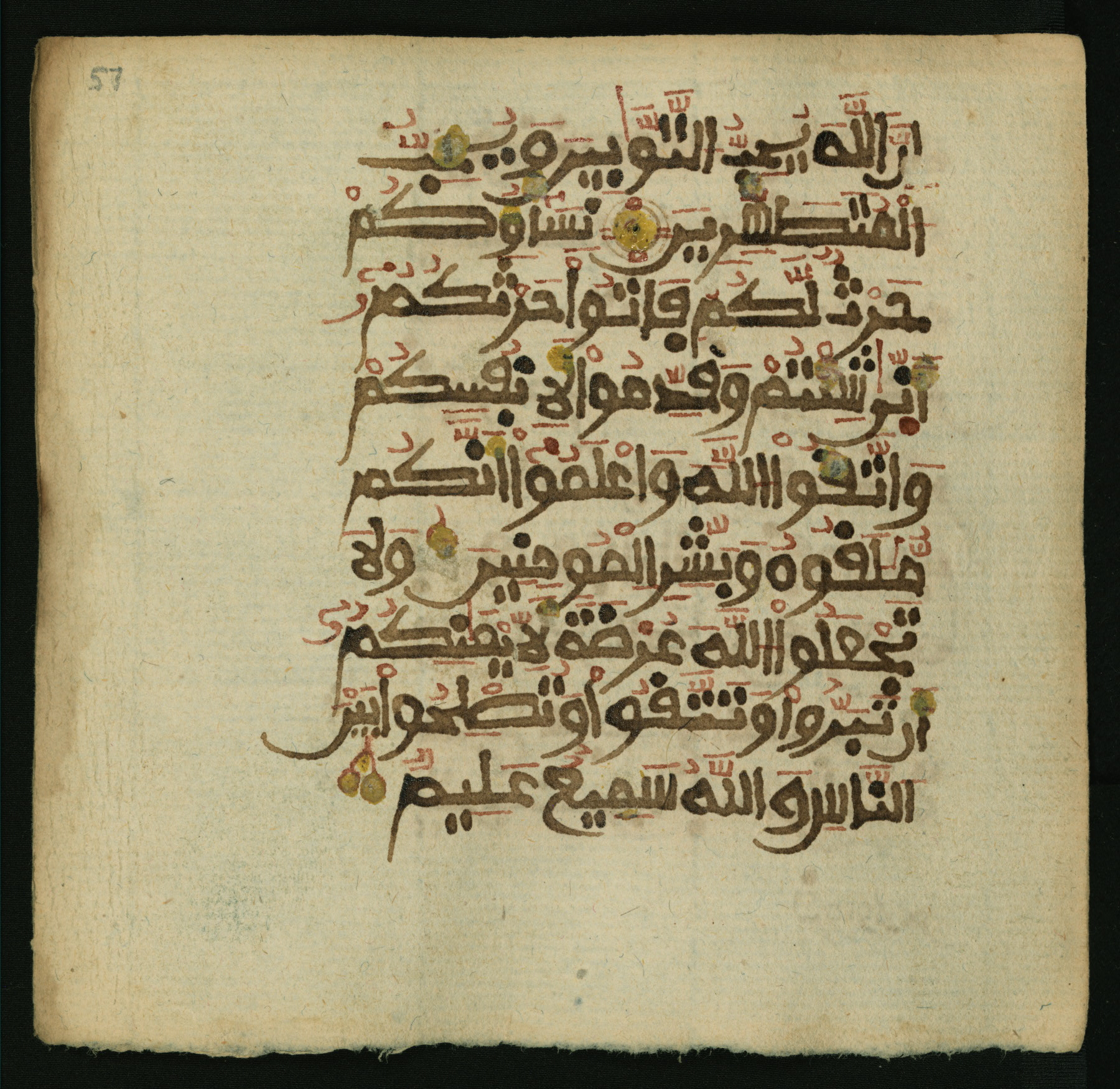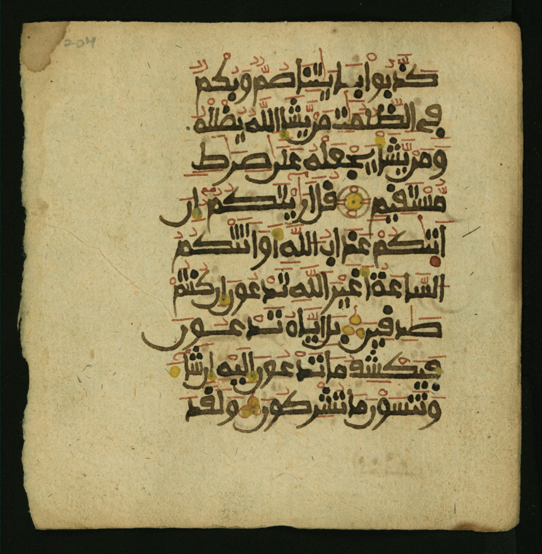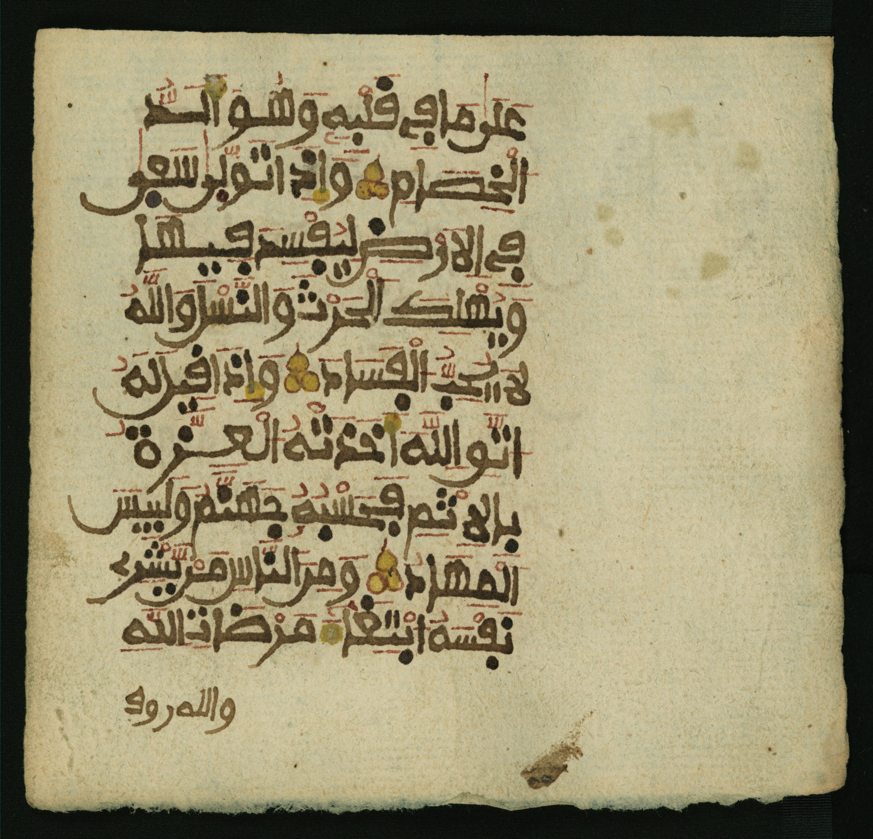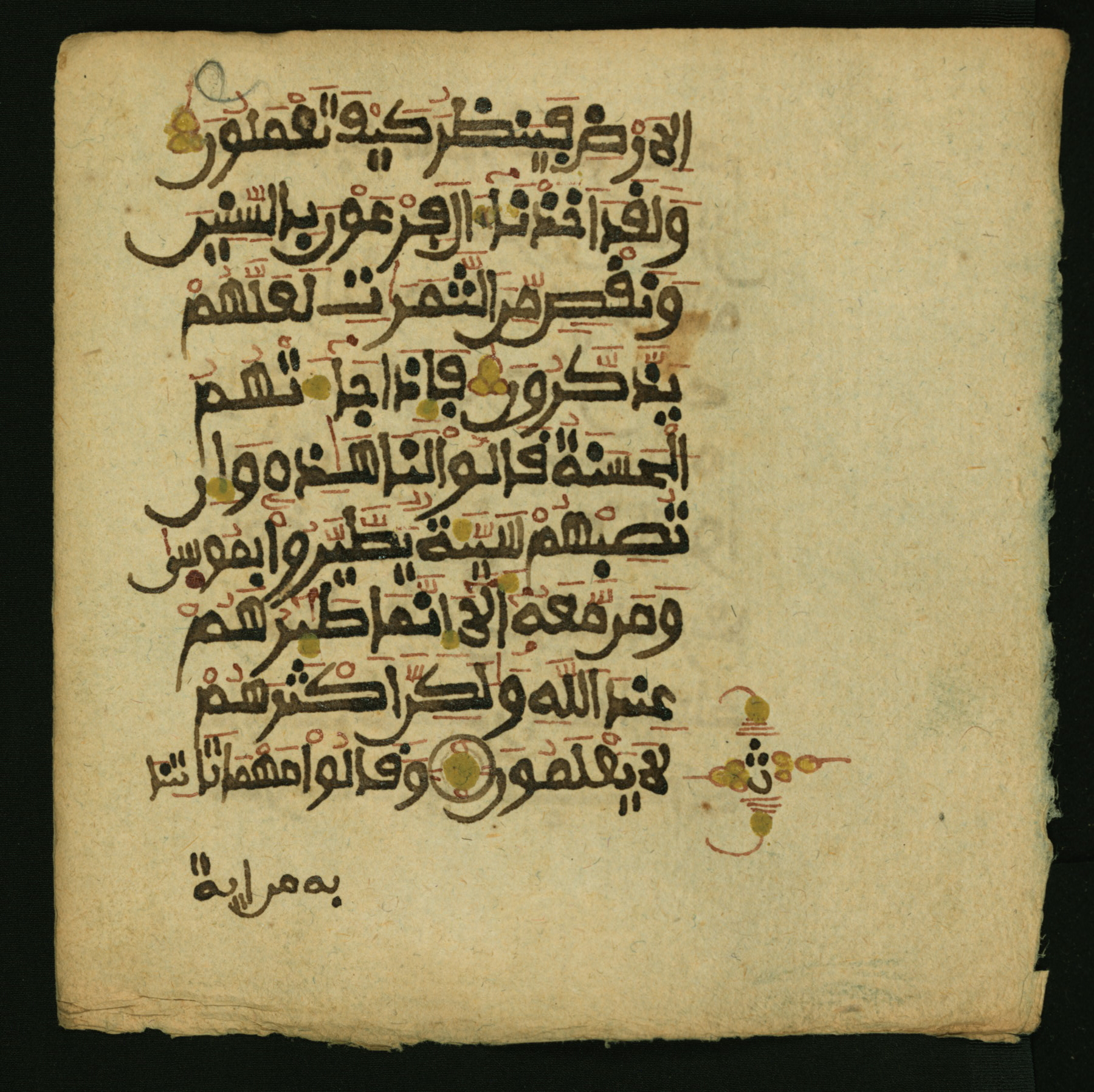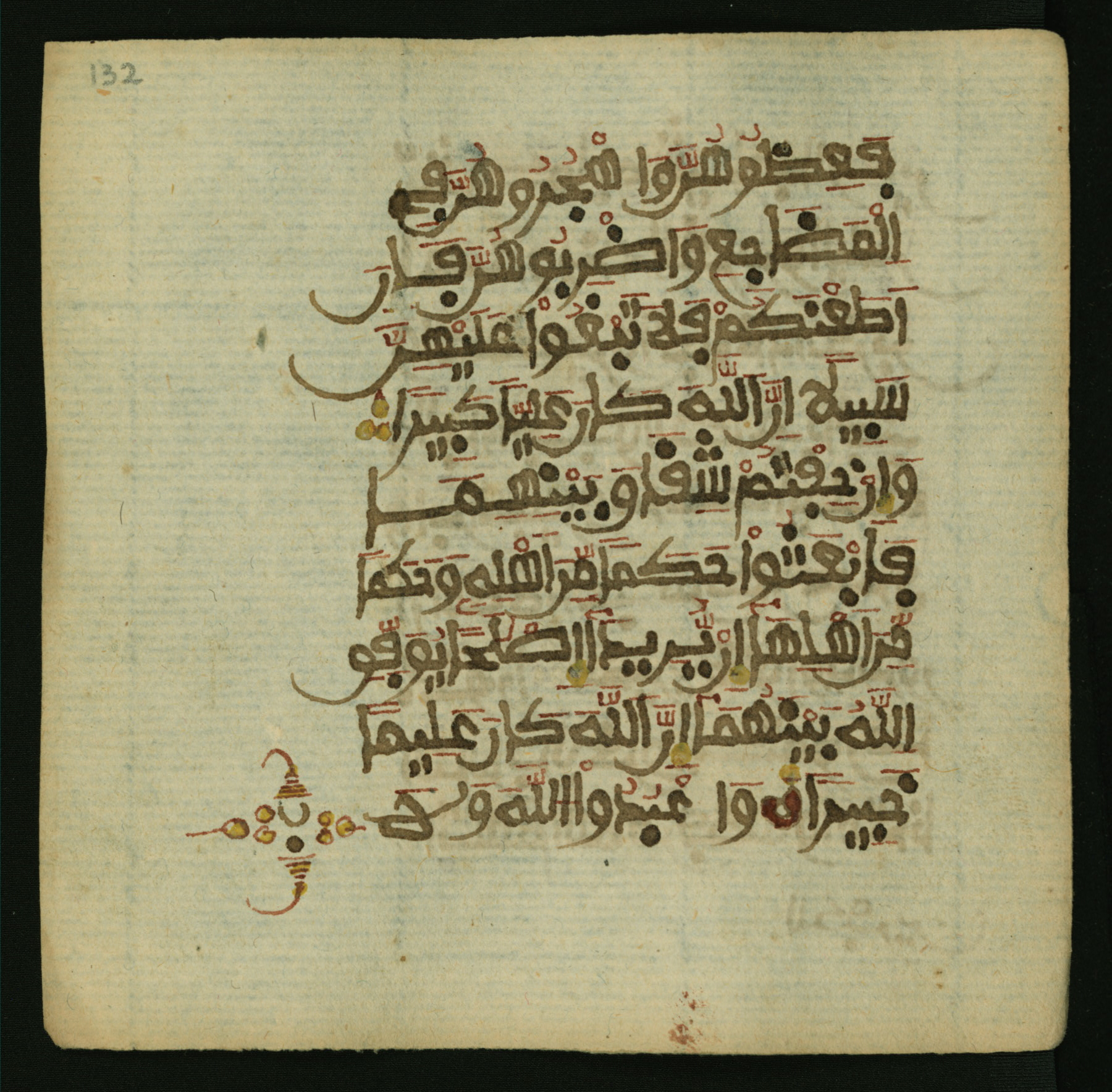 This square-format manuscript is volume 1, containing chapters 1-18 (Sūrat al-fātiḥah through Sūrat al-kahf), of an illuminated two-volume Qur'an produced in Sub-Saharan (West) Africa in the thirteenth century AH / nineteenth CE. The text is written in Sūdānī script in dark brown ink with vocalization in red on loose leaves. Chapter headings are in reddish-brown ink. Three yellow dots outlined in red arranged in a triangular form separate verses. Polychrome circular medallions as well as square and rectangular devices in a variety of patterns and colors mark textual divisions. The leaves of the text are organized between two decorated boards with geometric compositions. The pages and boards are housed in a leather pouch (satchel).