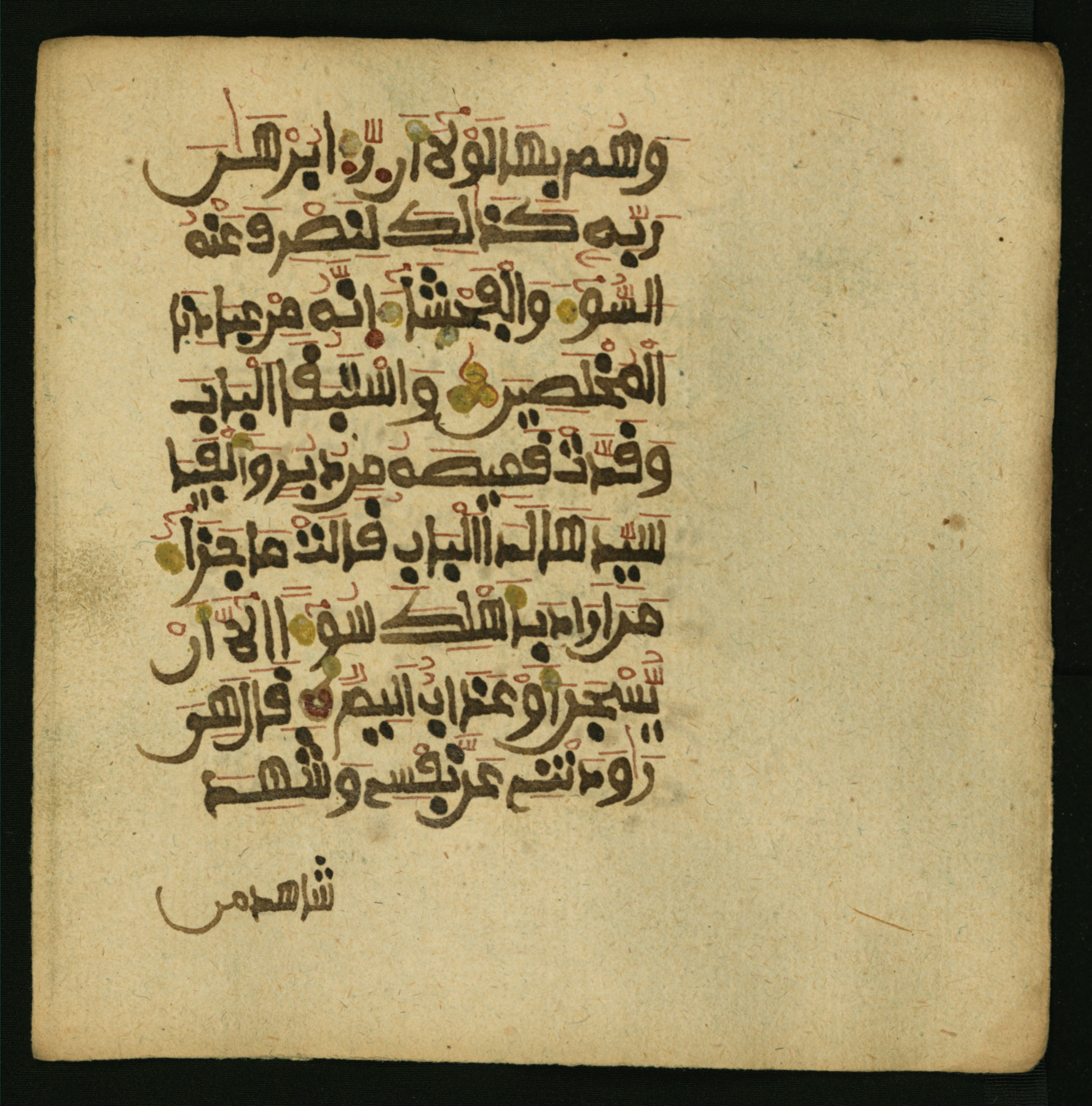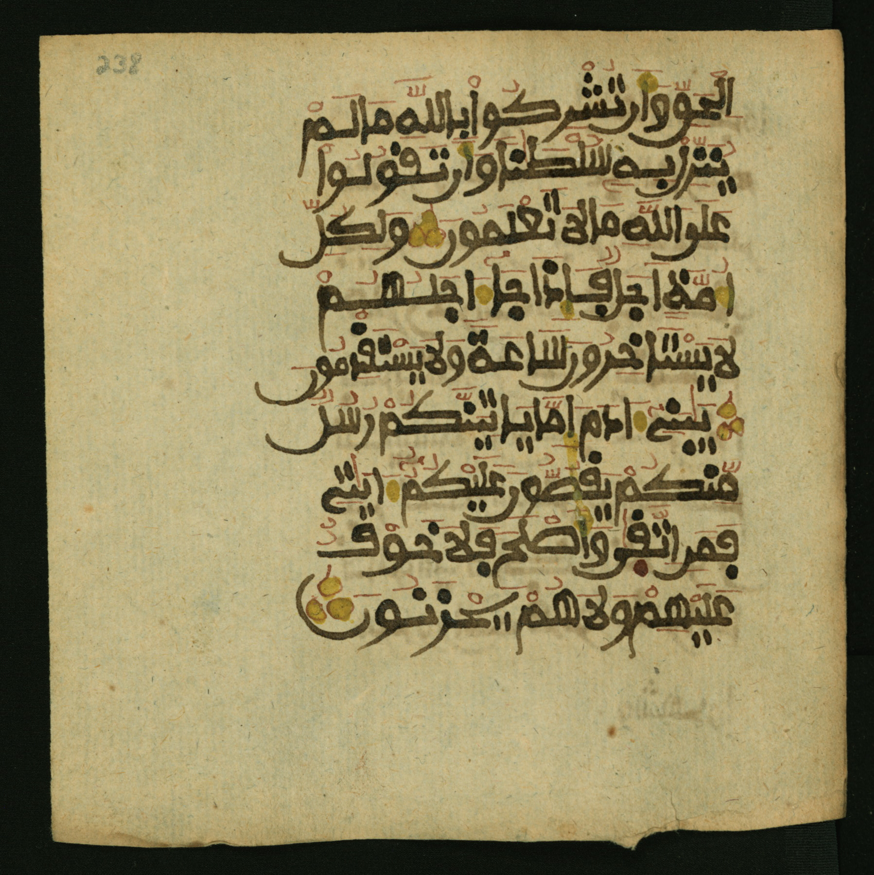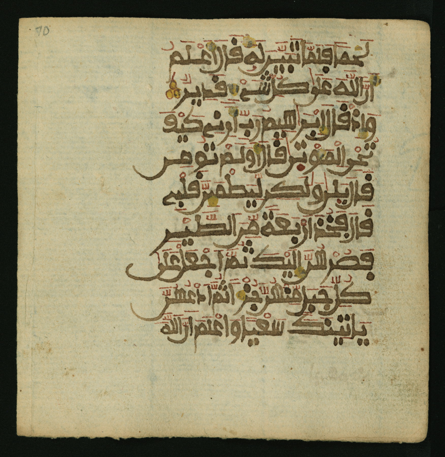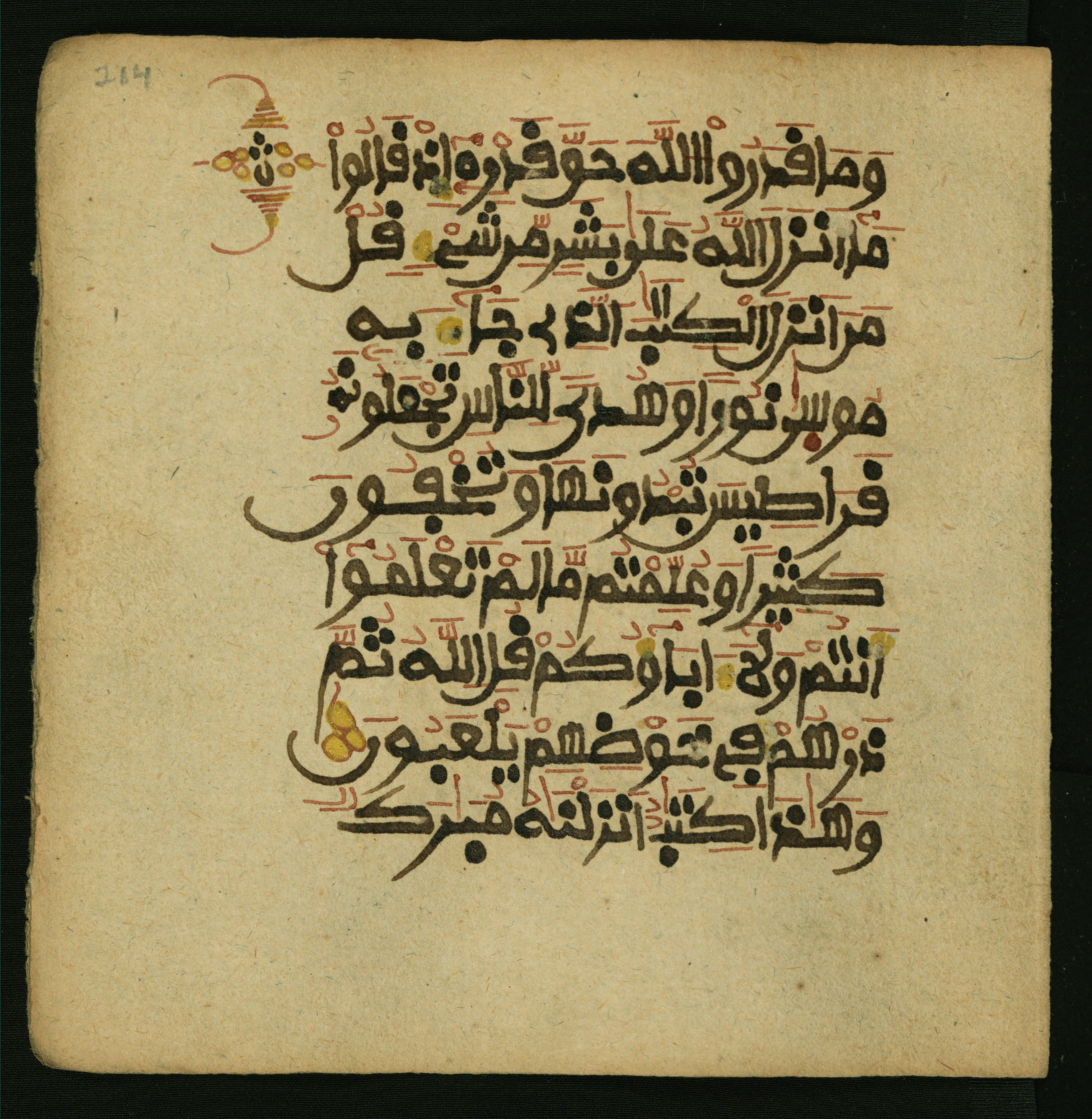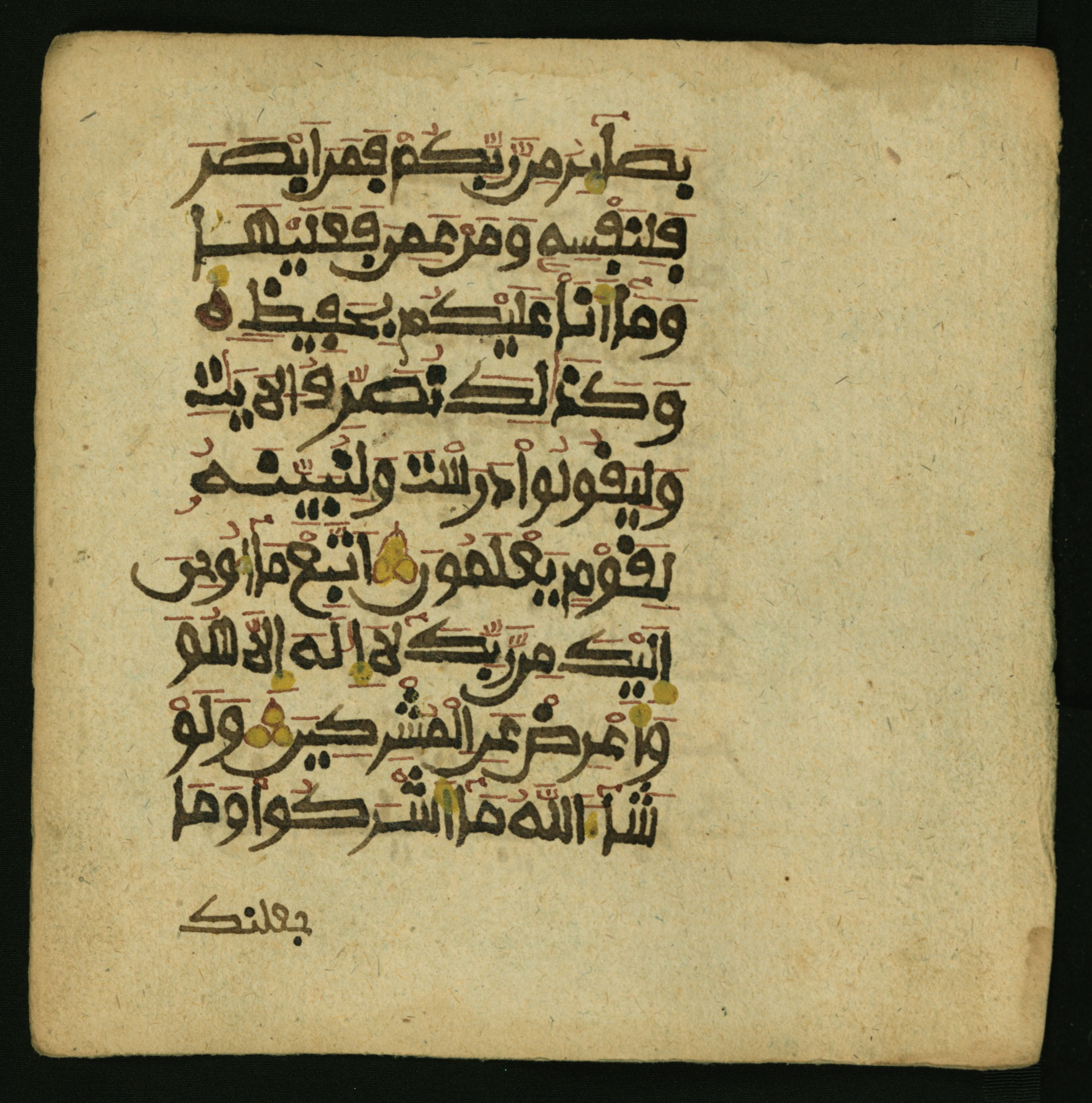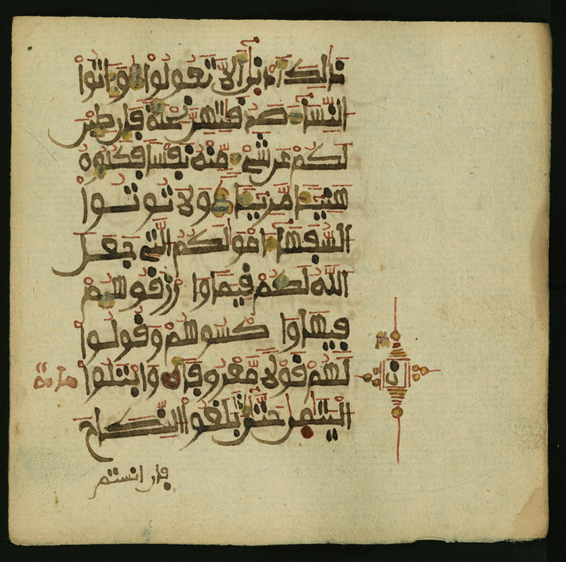This square-format manuscript is volume 1, containing chapters 1-18 (Sūrat al-fātiḥah through Sūrat al-kahf), of an illuminated two-volume Qur'an produced in Sub-Saharan (West) Africa in the thirteenth century AH / nineteenth CE. The text is written in Sūdānī script in dark brown ink with vocalization in red on loose leaves. Chapter headings are in reddish-brown ink. Three yellow dots outlined in red arranged in a triangular form separate verses. Polychrome circular medallions as well as square and rectangular devices in a variety of patterns and colors mark textual divisions. The leaves of the text are organized between two decorated boards with geometric compositions. The pages and boards are housed in a leather pouch (satchel).