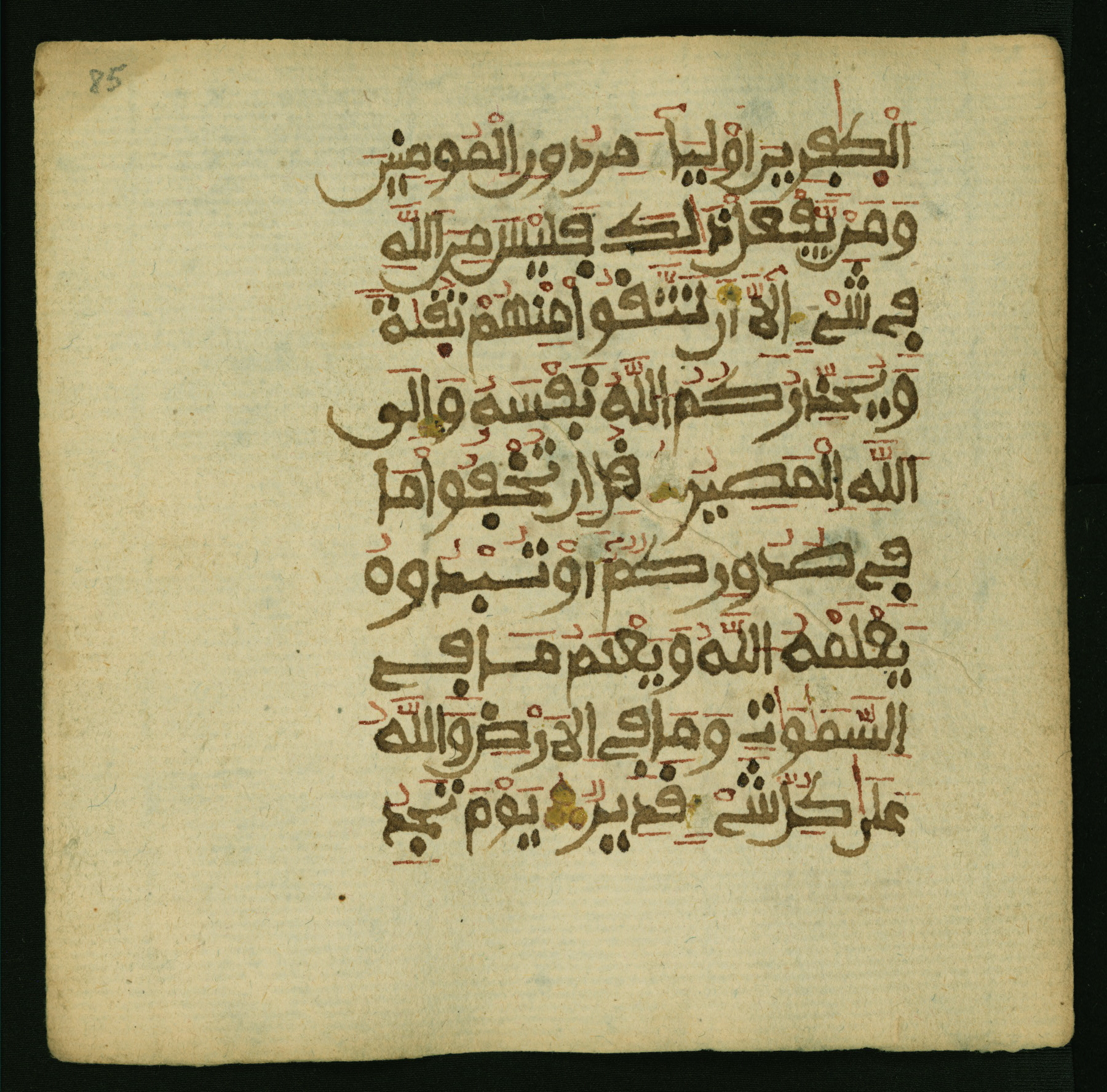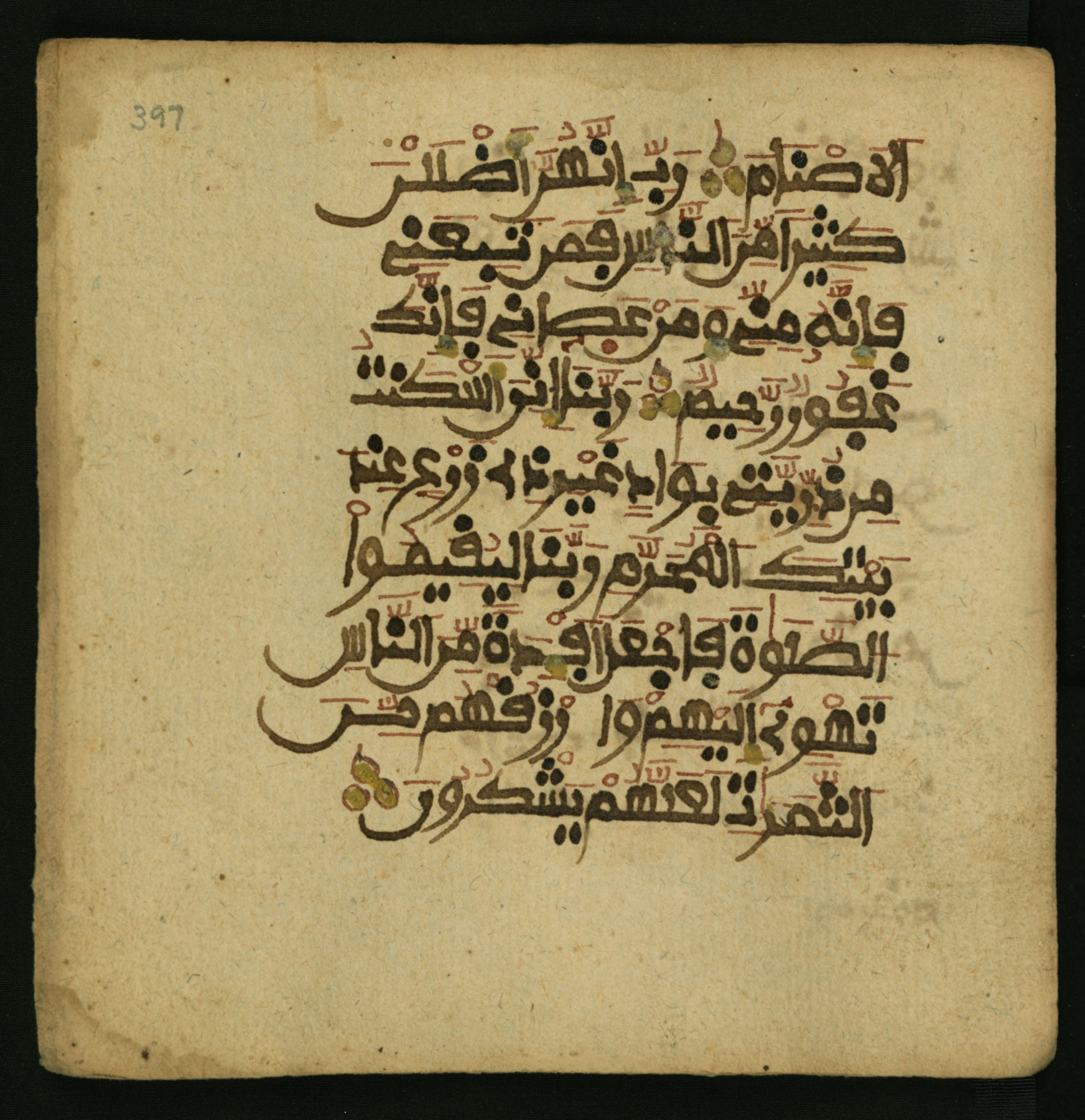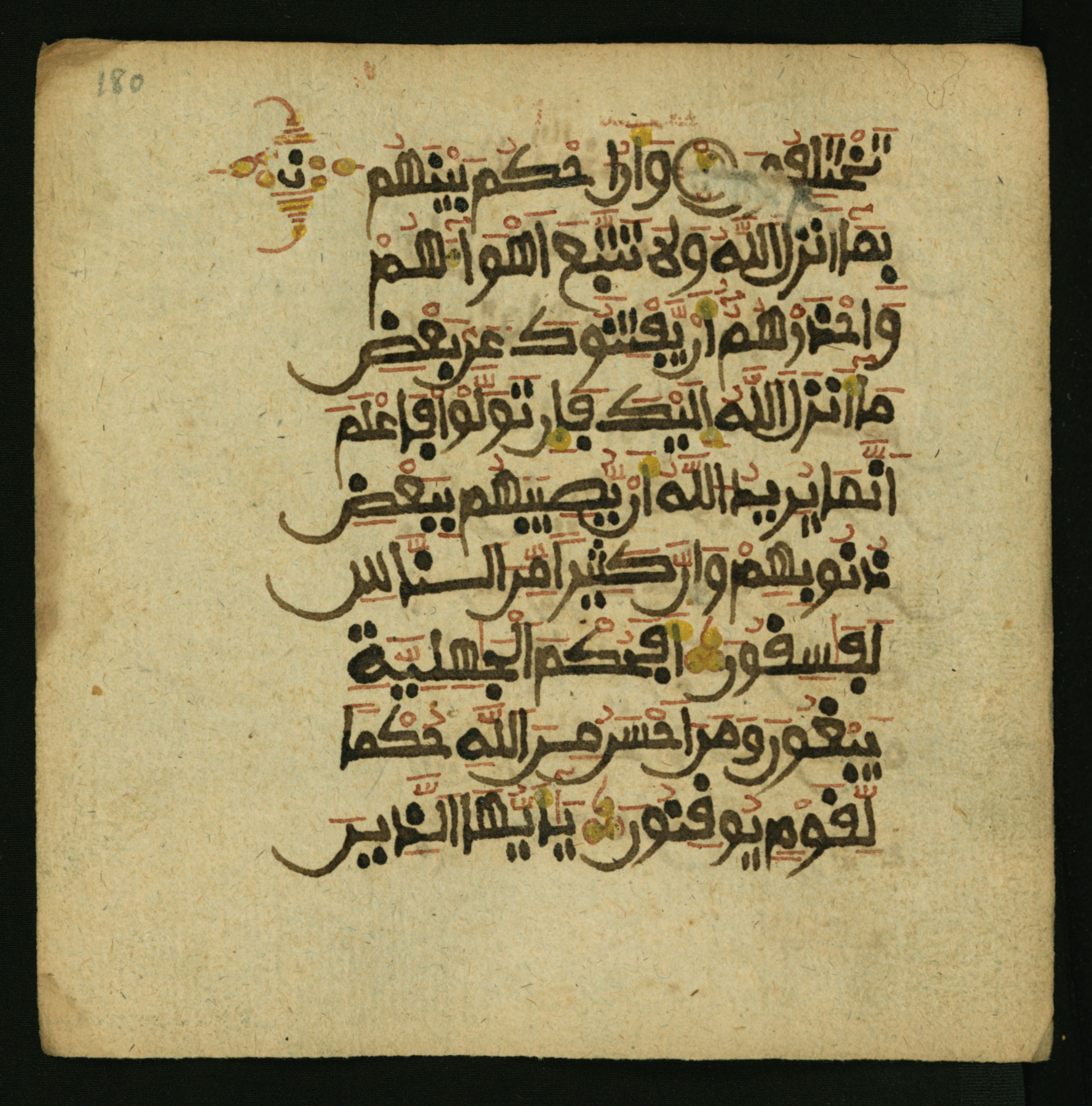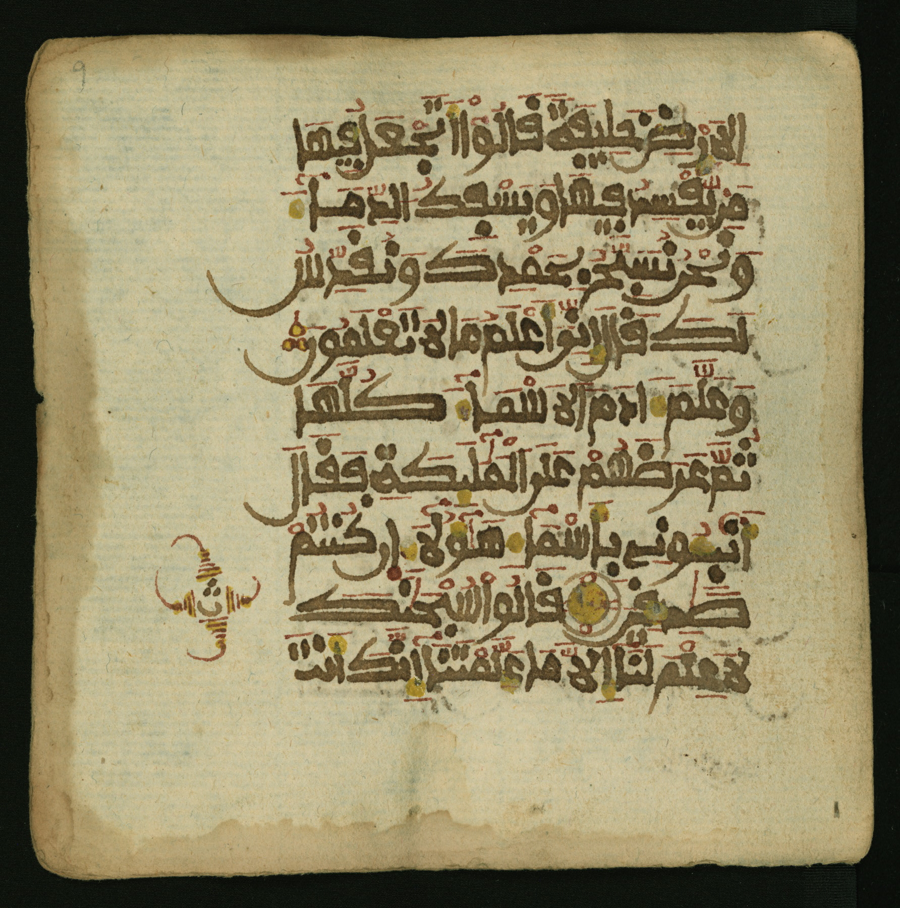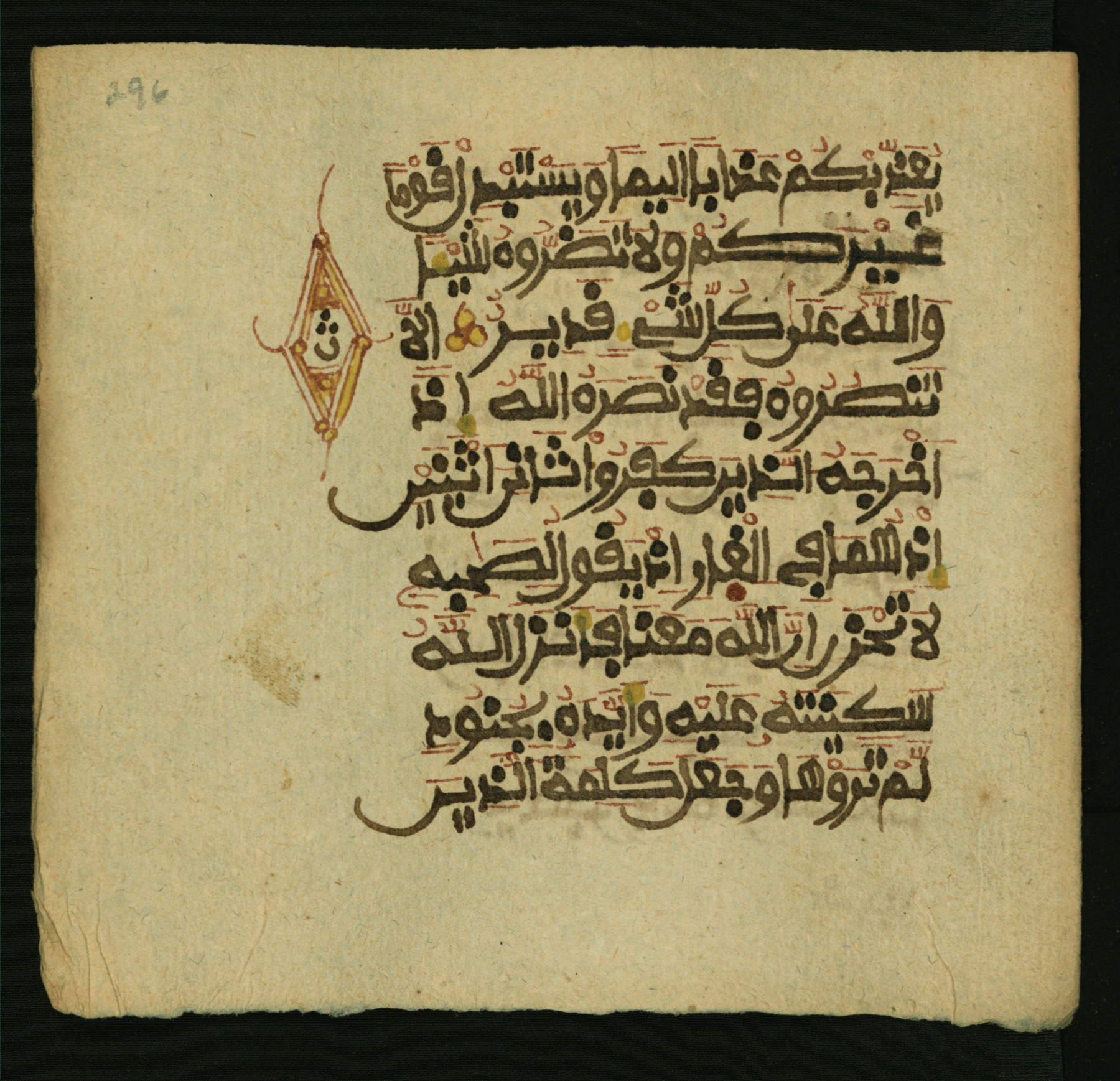 This square-format manuscript is volume 1, containing chapters 1-18 (Sūrat al-fātiḥah through Sūrat al-kahf), of an illuminated two-volume Qur'an produced in Sub-Saharan (West) Africa in the thirteenth century AH / nineteenth CE. The text is written in Sūdānī script in dark brown ink with vocalization in red on loose leaves. Chapter headings are in reddish-brown ink. Three yellow dots outlined in red arranged in a triangular form separate verses. Polychrome circular medallions as well as square and rectangular devices in a variety of patterns and colors mark textual divisions. The leaves of the text are organized between two decorated boards with geometric compositions. The pages and boards are housed in a leather pouch (satchel).