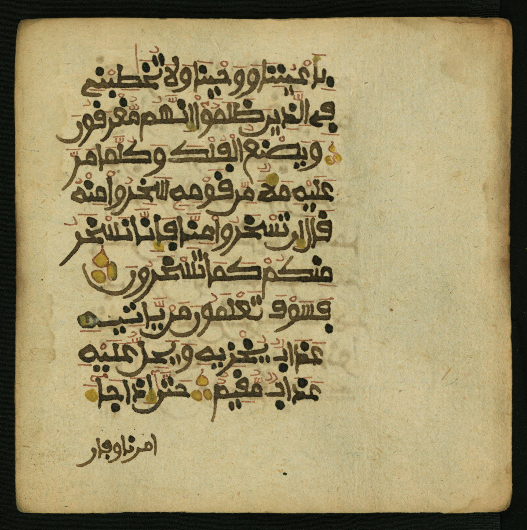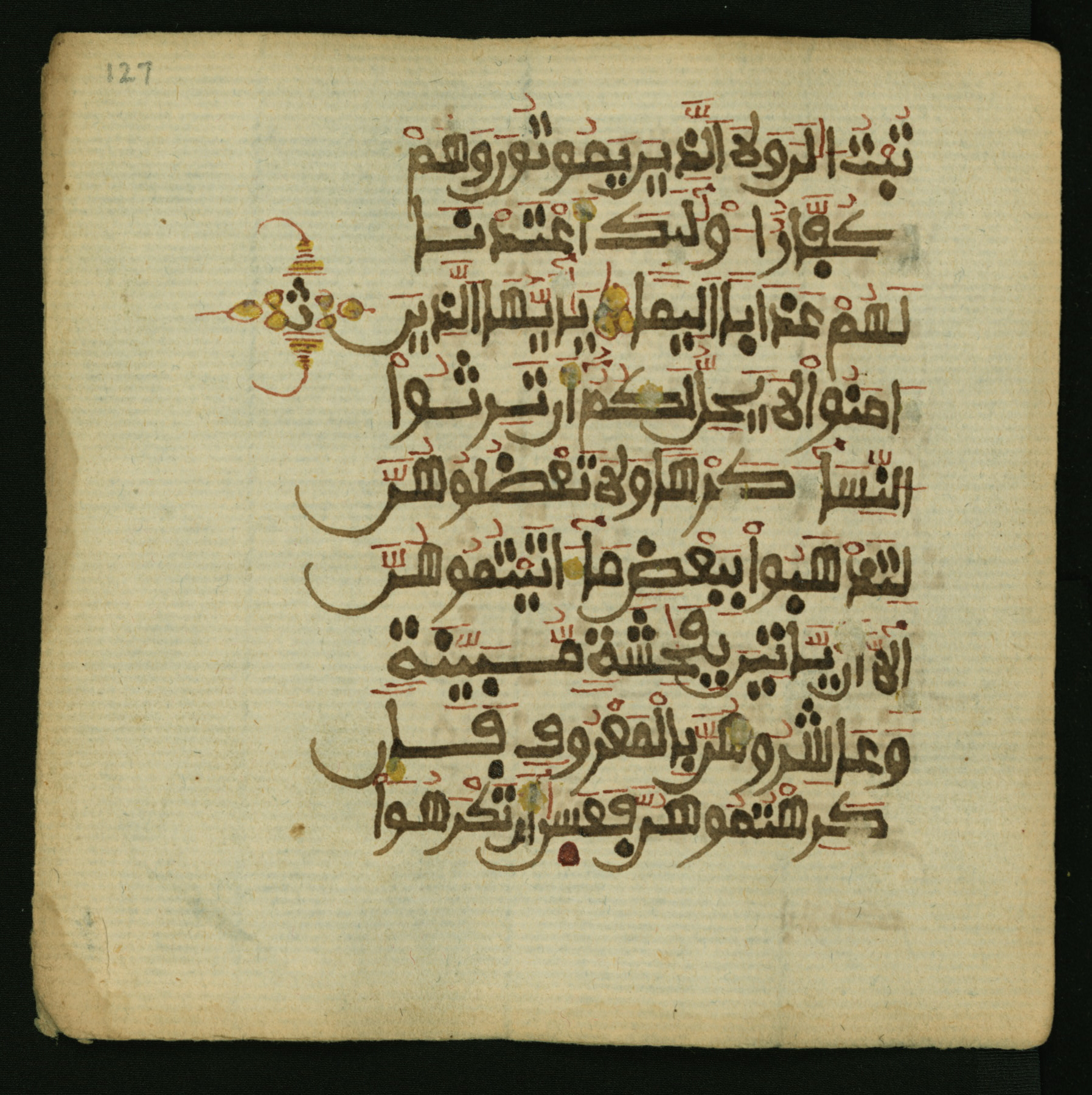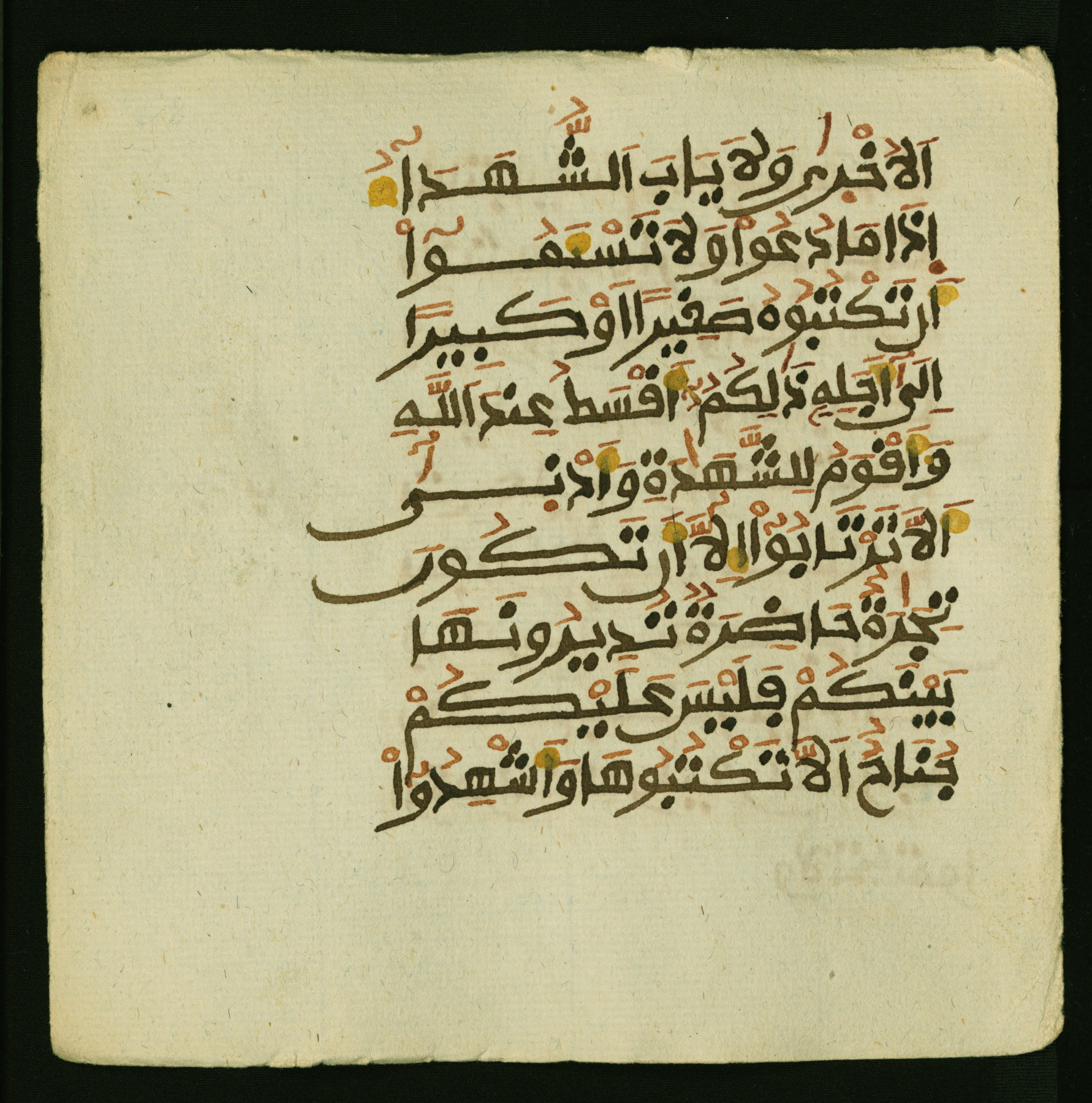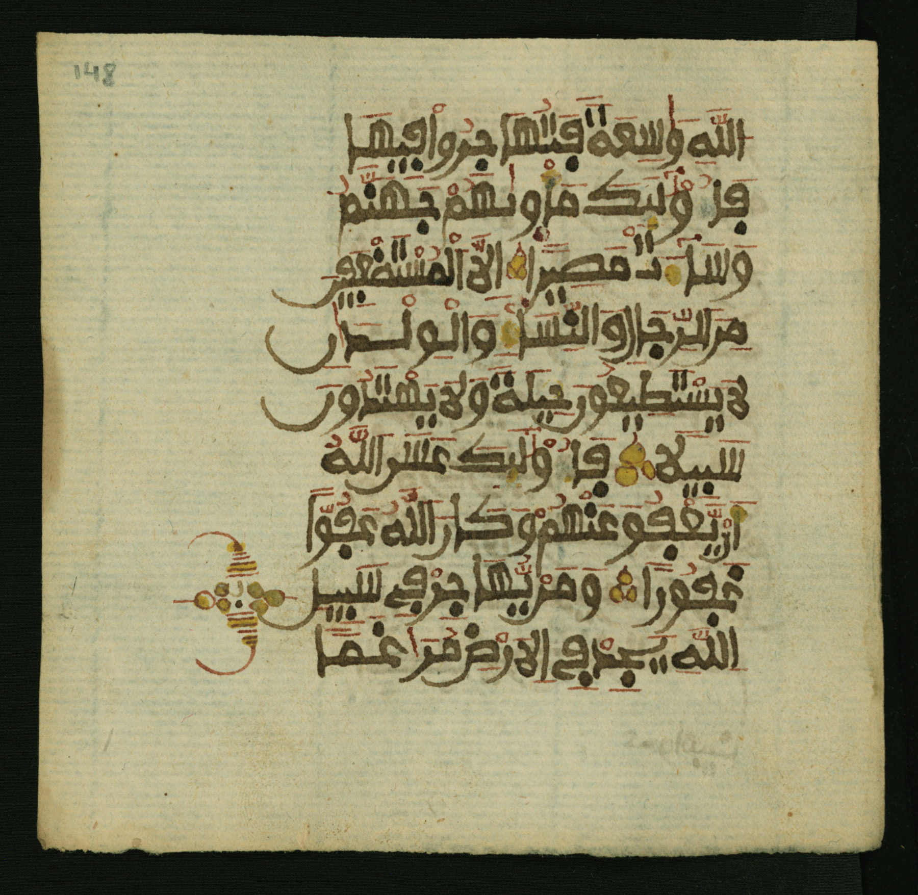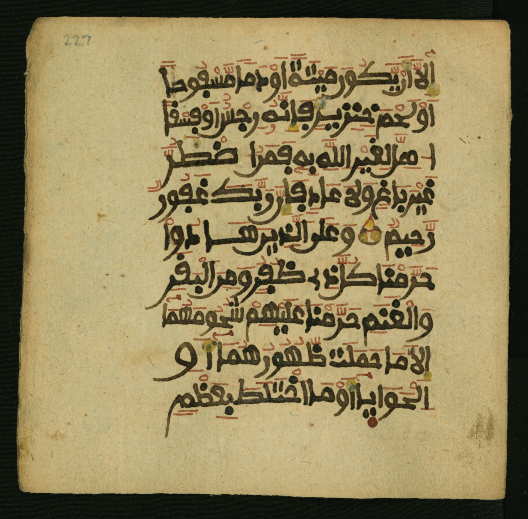 This square-format manuscript is volume 1, containing chapters 1-18 (Sūrat al-fātiḥah through Sūrat al-kahf), of an illuminated two-volume Qur'an produced in Sub-Saharan (West) Africa in the thirteenth century AH / nineteenth CE. The text is written in Sūdānī script in dark brown ink with vocalization in red on loose leaves. Chapter headings are in reddish-brown ink. Three yellow dots outlined in red arranged in a triangular form separate verses. Polychrome circular medallions as well as square and rectangular devices in a variety of patterns and colors mark textual divisions. The leaves of the text are organized between two decorated boards with geometric compositions. The pages and boards are housed in a leather pouch (satchel).