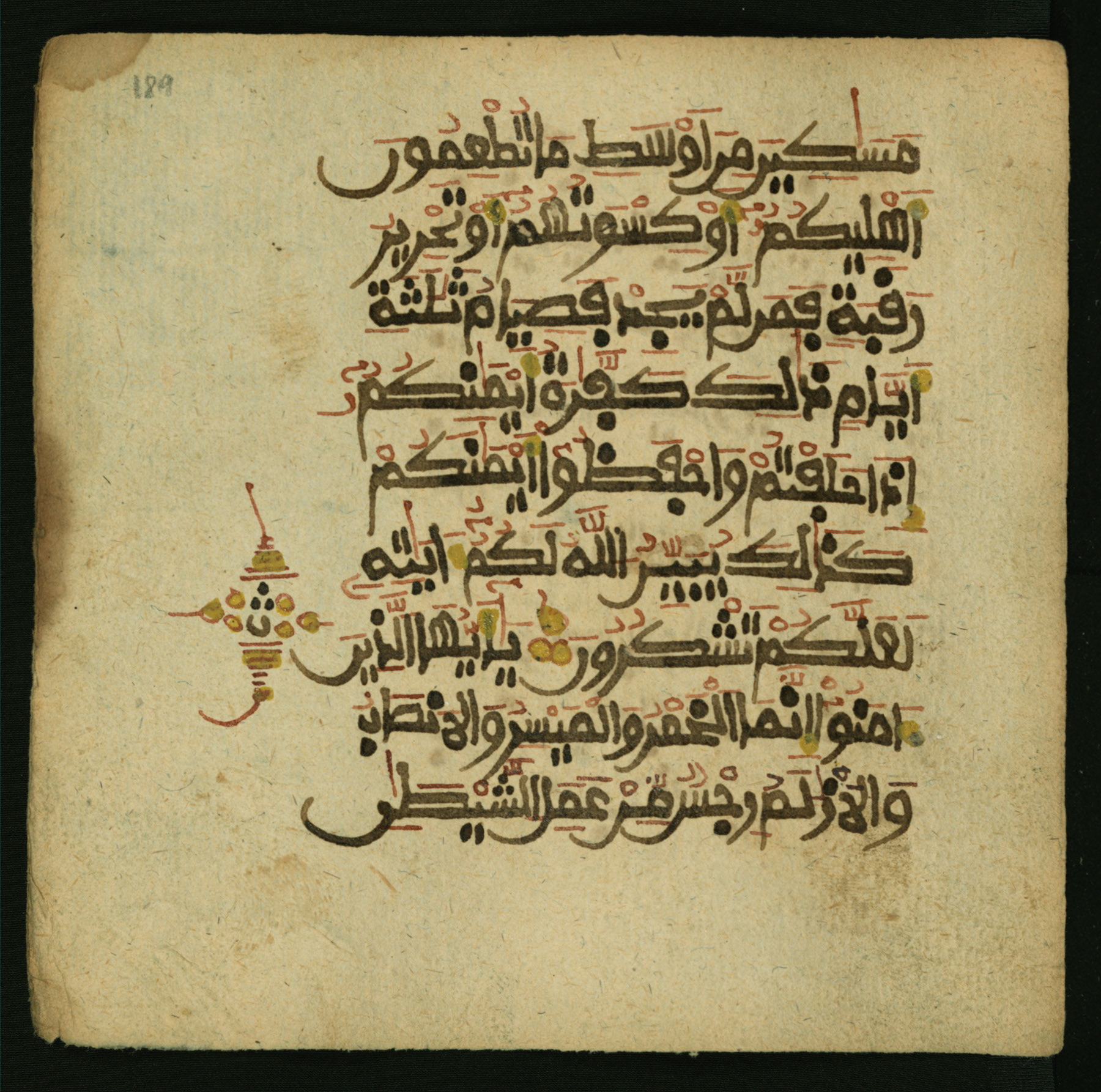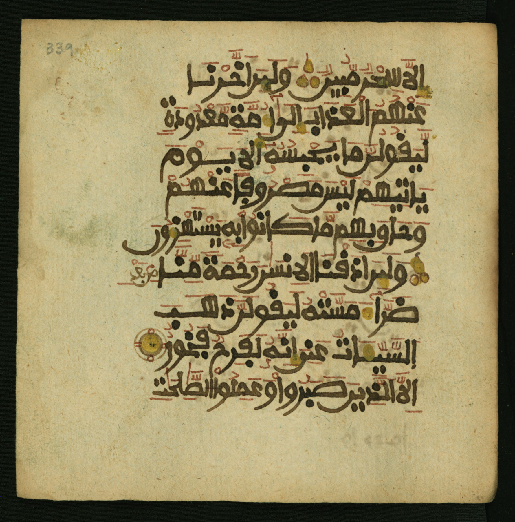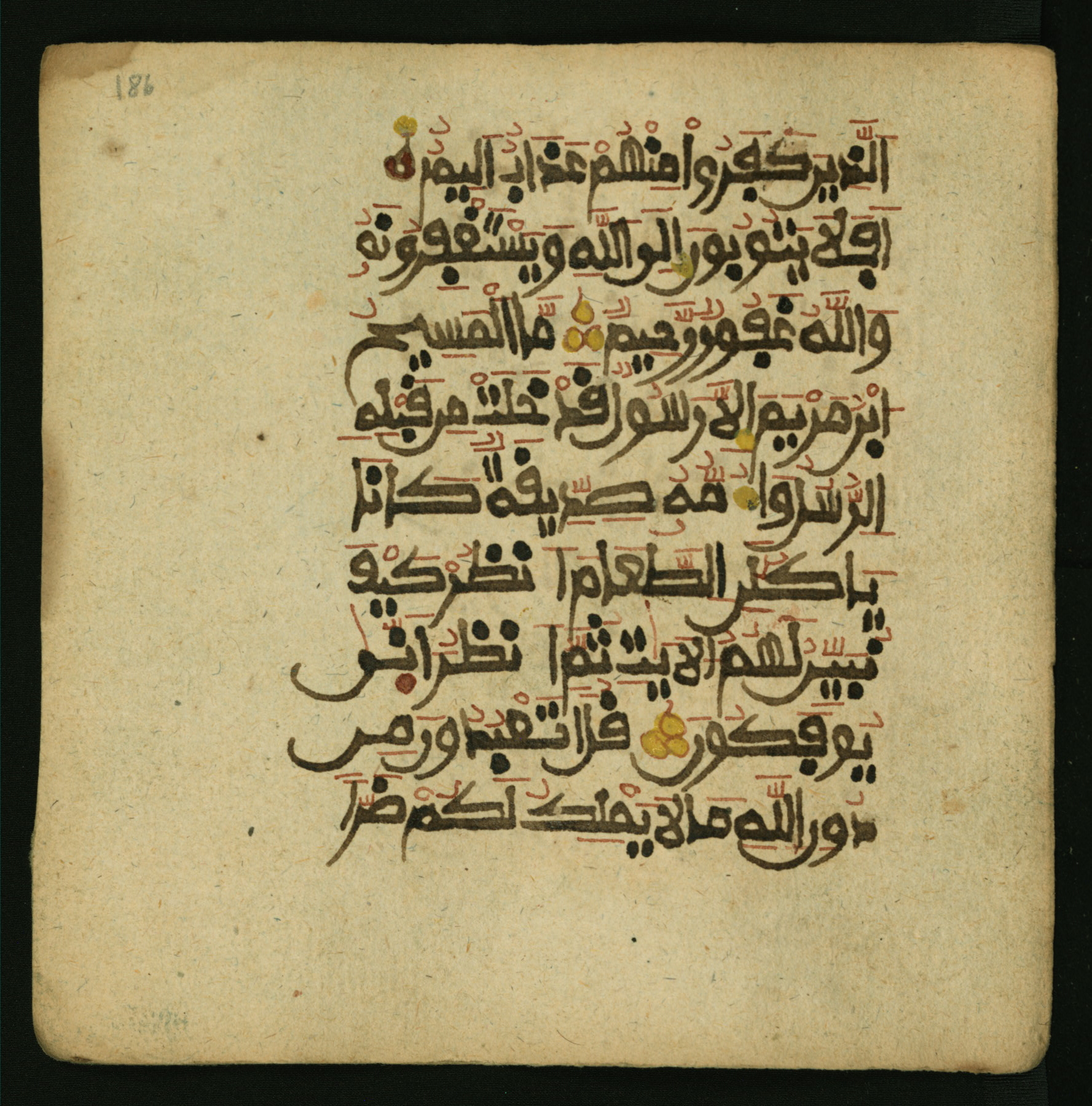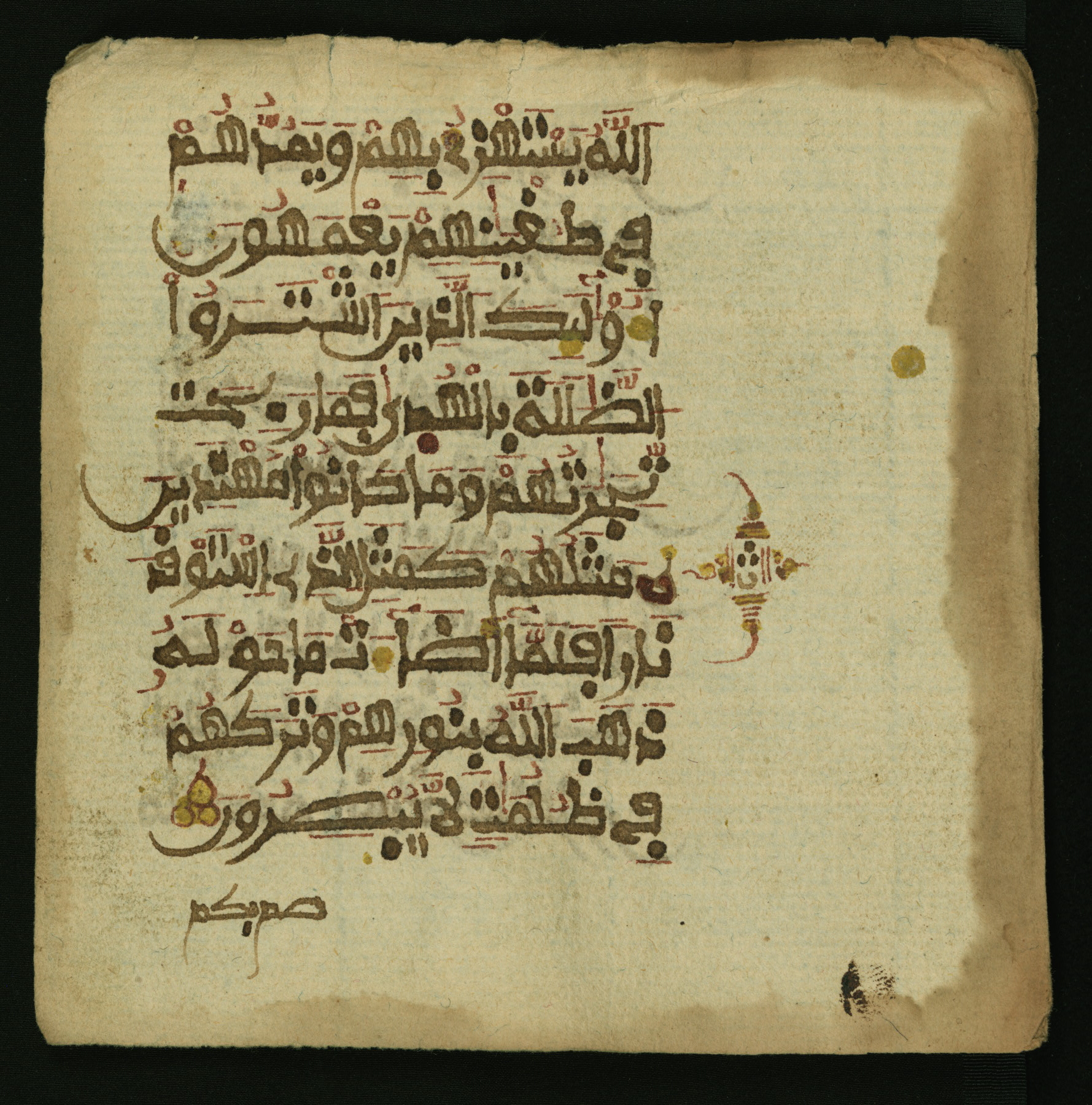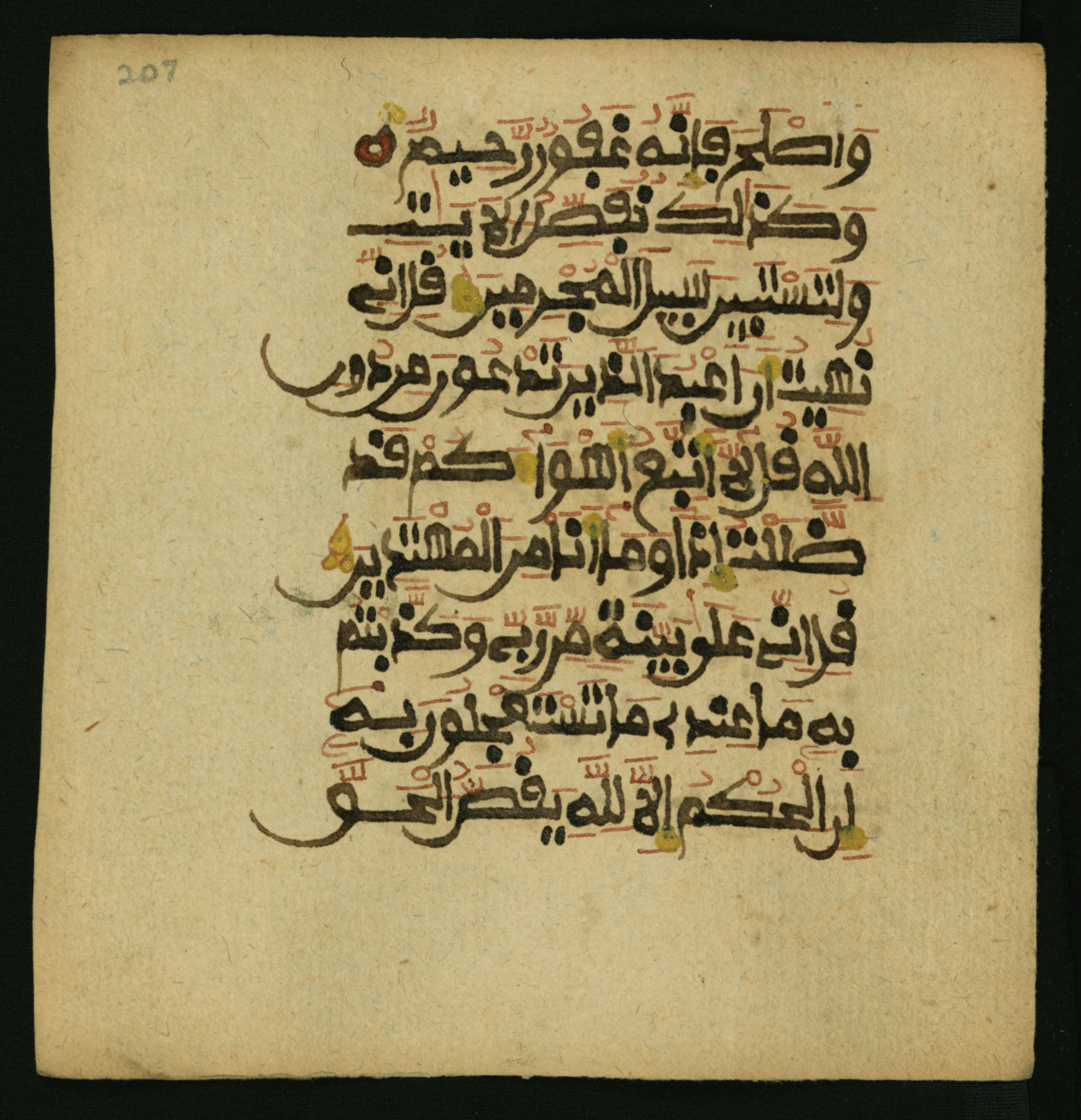 This square-format manuscript is volume 1, containing chapters 1-18 (Sūrat al-fātiḥah through Sūrat al-kahf), of an illuminated two-volume Qur'an produced in Sub-Saharan (West) Africa in the thirteenth century AH / nineteenth CE. The text is written in Sūdānī script in dark brown ink with vocalization in red on loose leaves. Chapter headings are in reddish-brown ink. Three yellow dots outlined in red arranged in a triangular form separate verses. Polychrome circular medallions as well as square and rectangular devices in a variety of patterns and colors mark textual divisions. The leaves of the text are organized between two decorated boards with geometric compositions. The pages and boards are housed in a leather pouch (satchel).