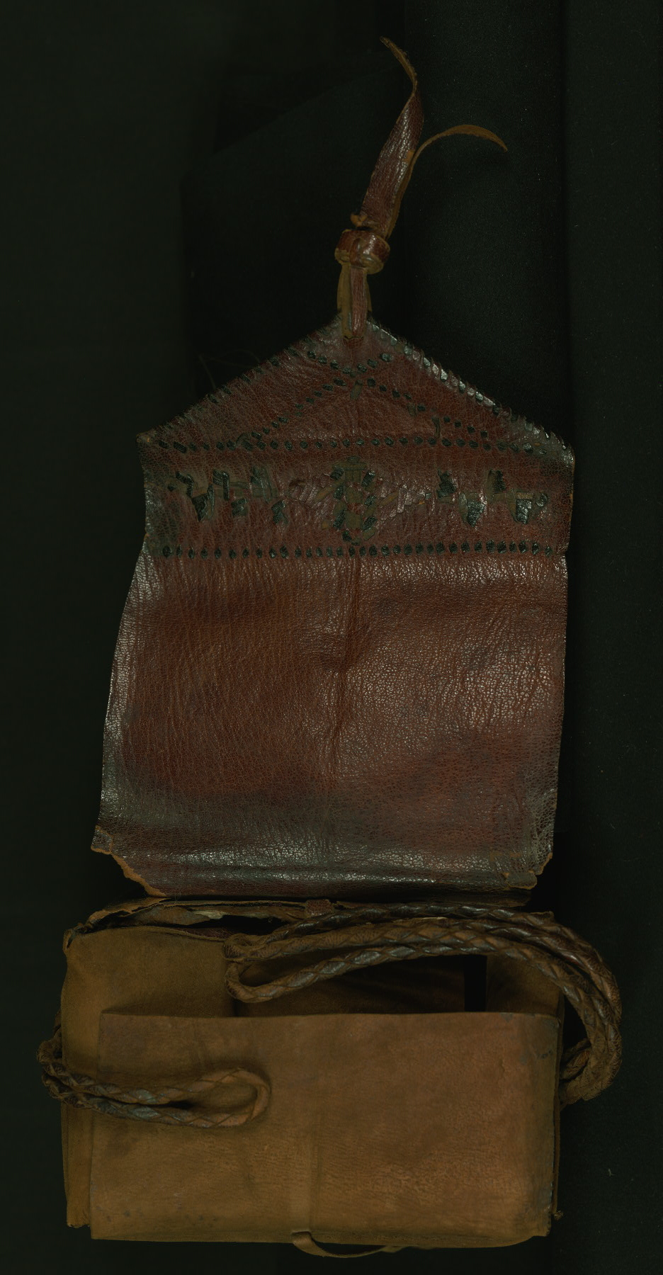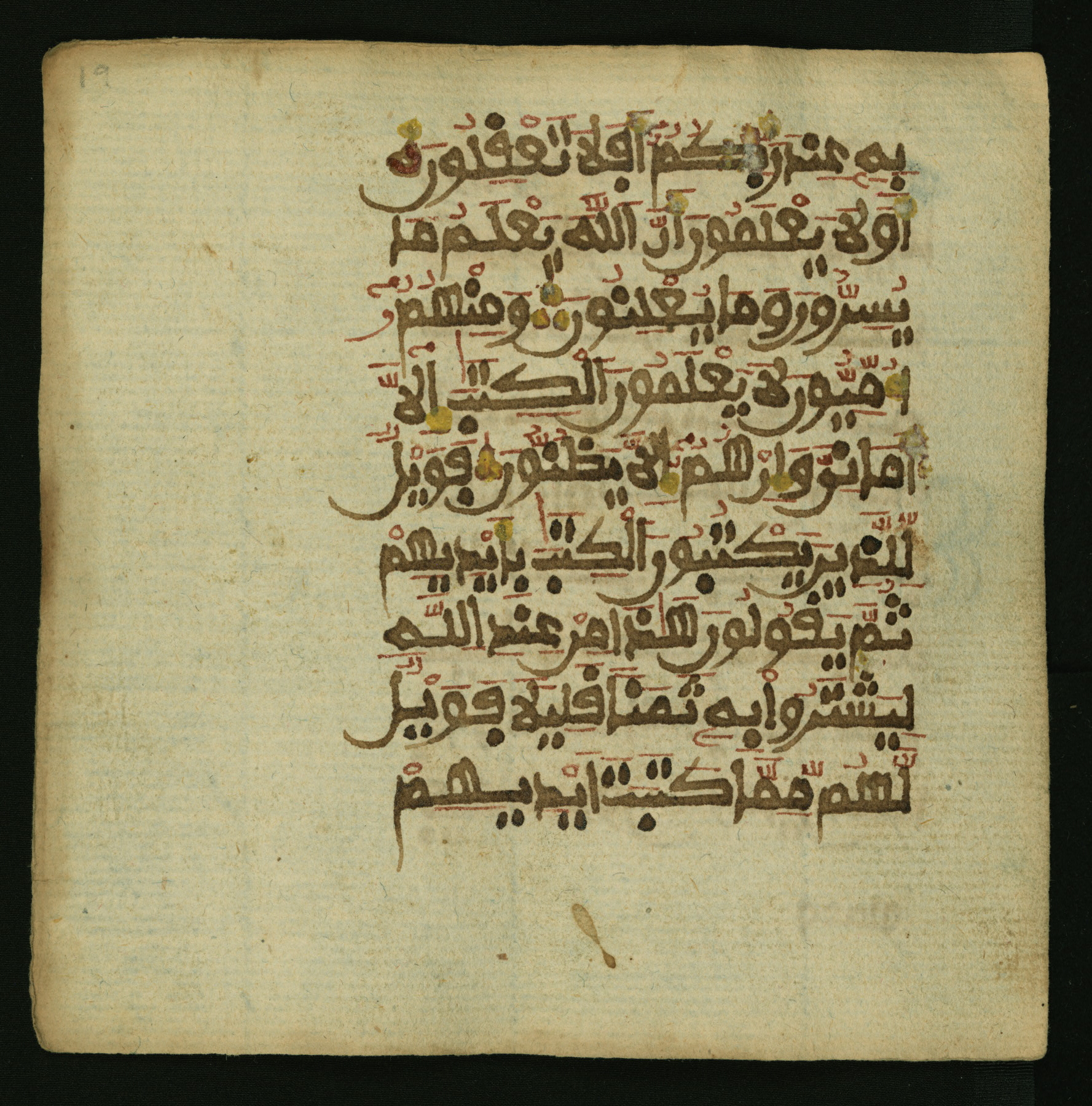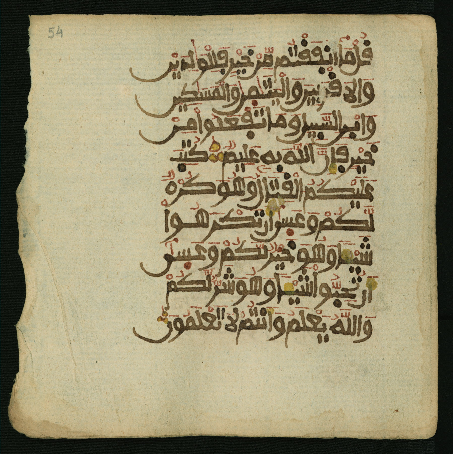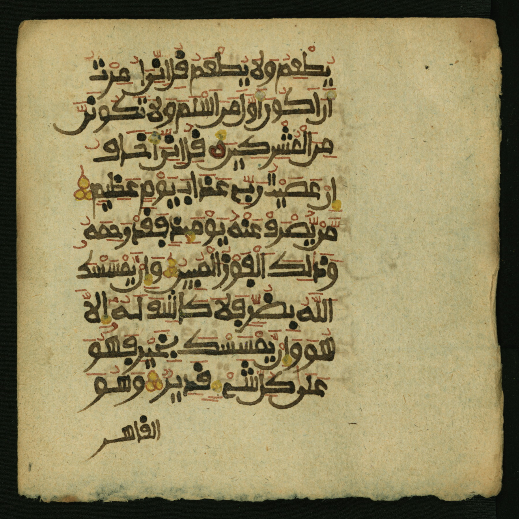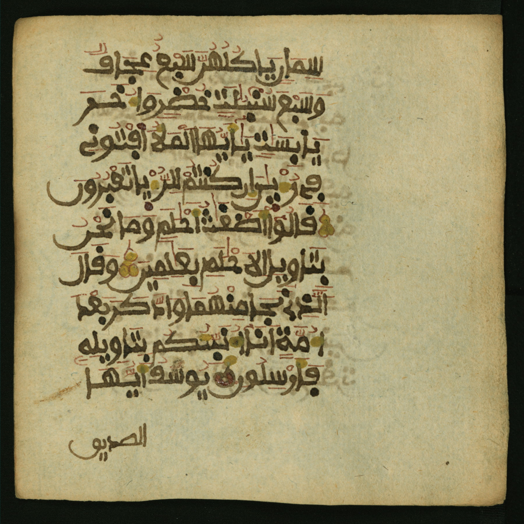 This square-format manuscript is volume 1, containing chapters 1-18 (Sūrat al-fātiḥah through Sūrat al-kahf), of an illuminated two-volume Qur'an produced in Sub-Saharan (West) Africa in the thirteenth century AH / nineteenth CE. The text is written in Sūdānī script in dark brown ink with vocalization in red on loose leaves. Chapter headings are in reddish-brown ink. Three yellow dots outlined in red arranged in a triangular form separate verses. Polychrome circular medallions as well as square and rectangular devices in a variety of patterns and colors mark textual divisions. The leaves of the text are organized between two decorated boards with geometric compositions. The pages and boards are housed in a leather pouch (satchel).