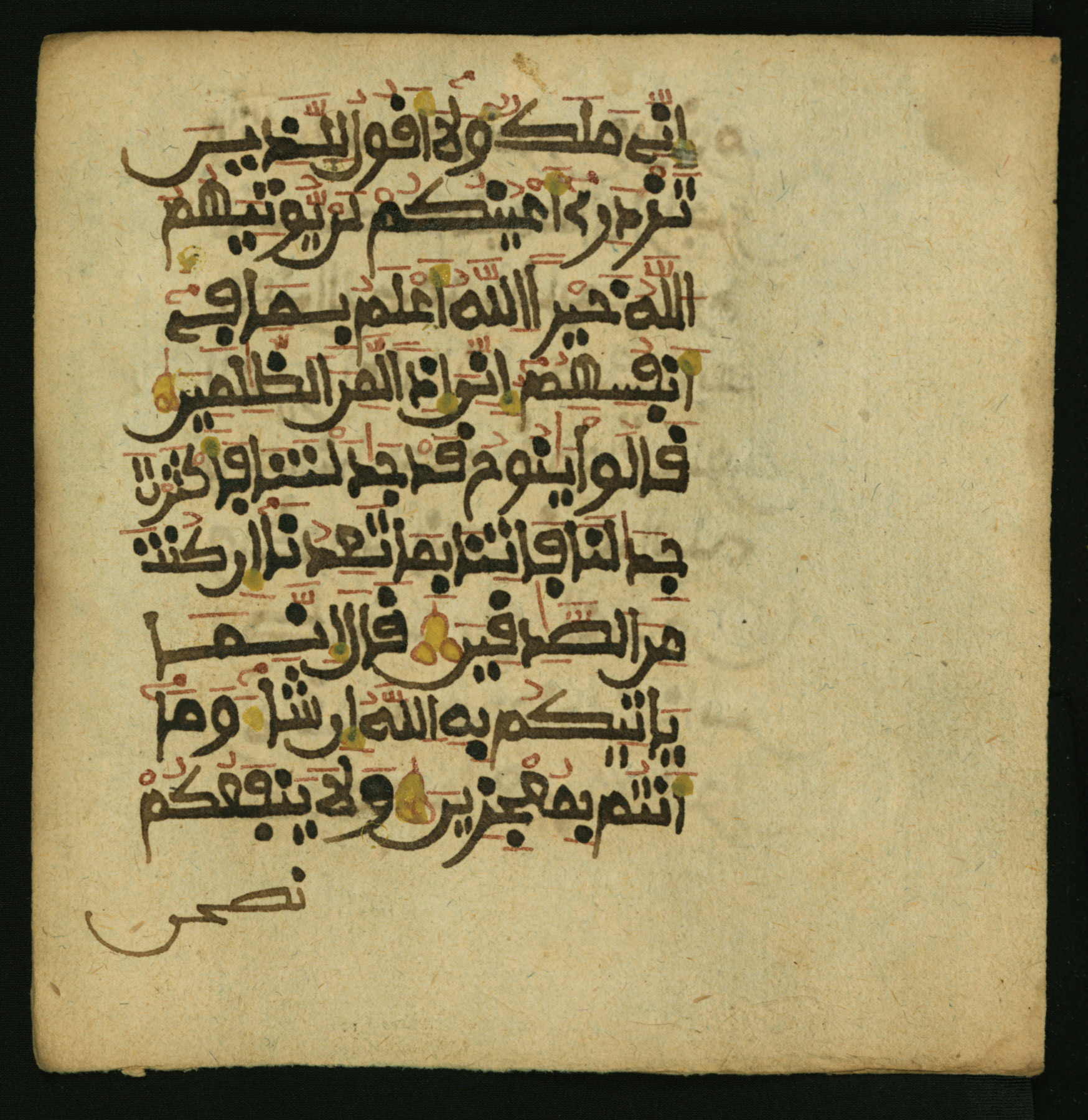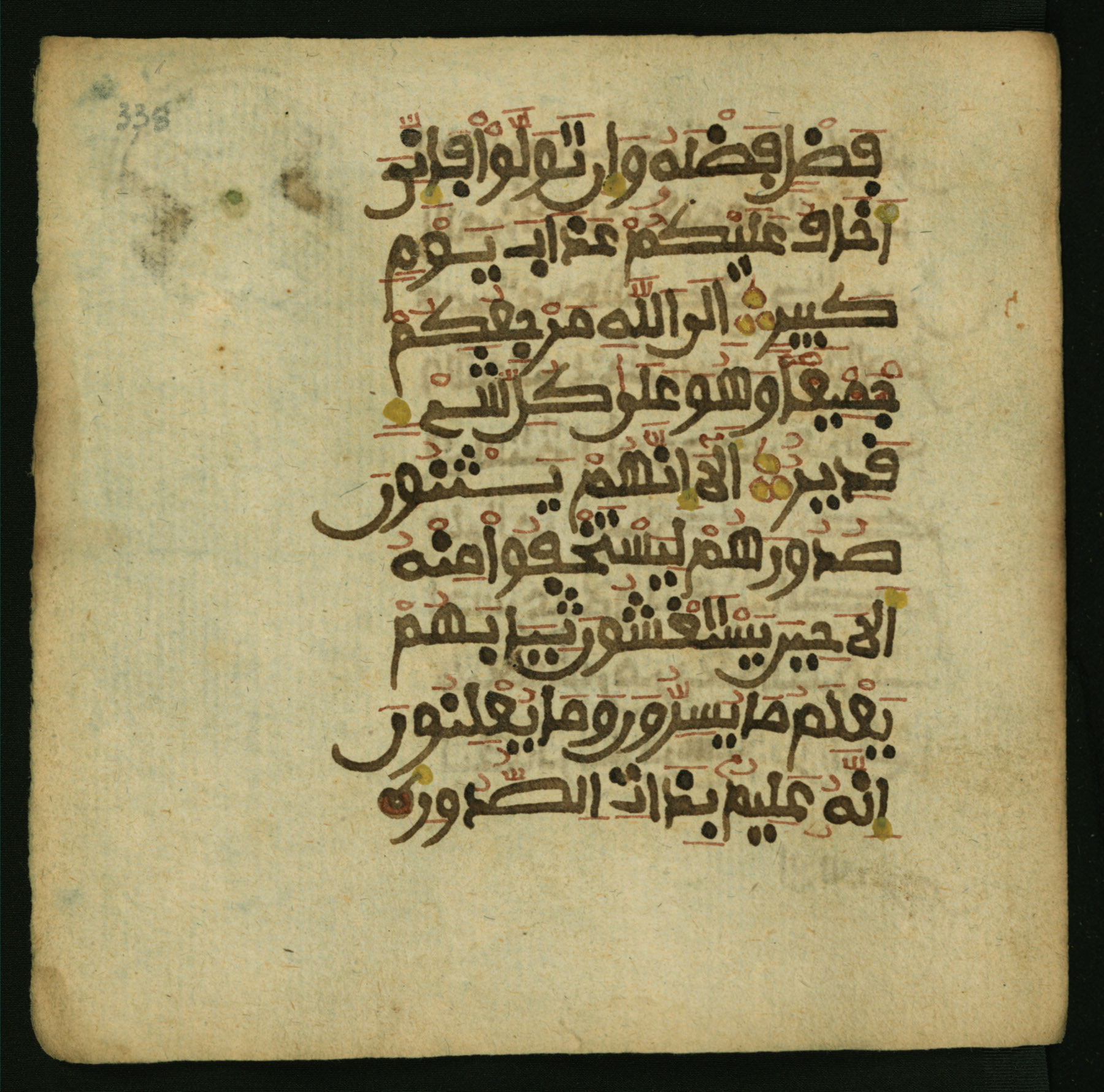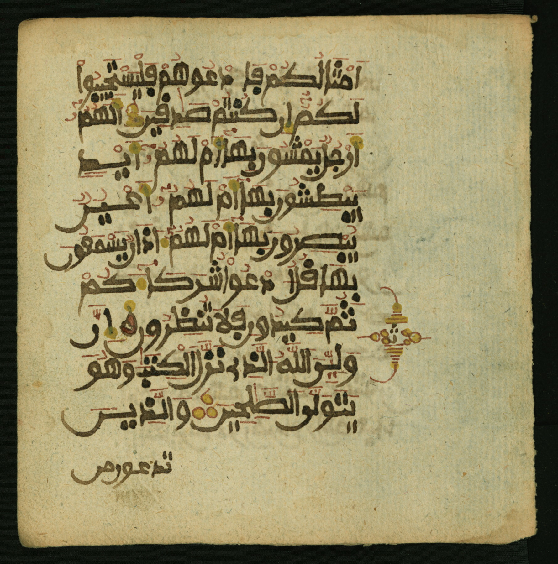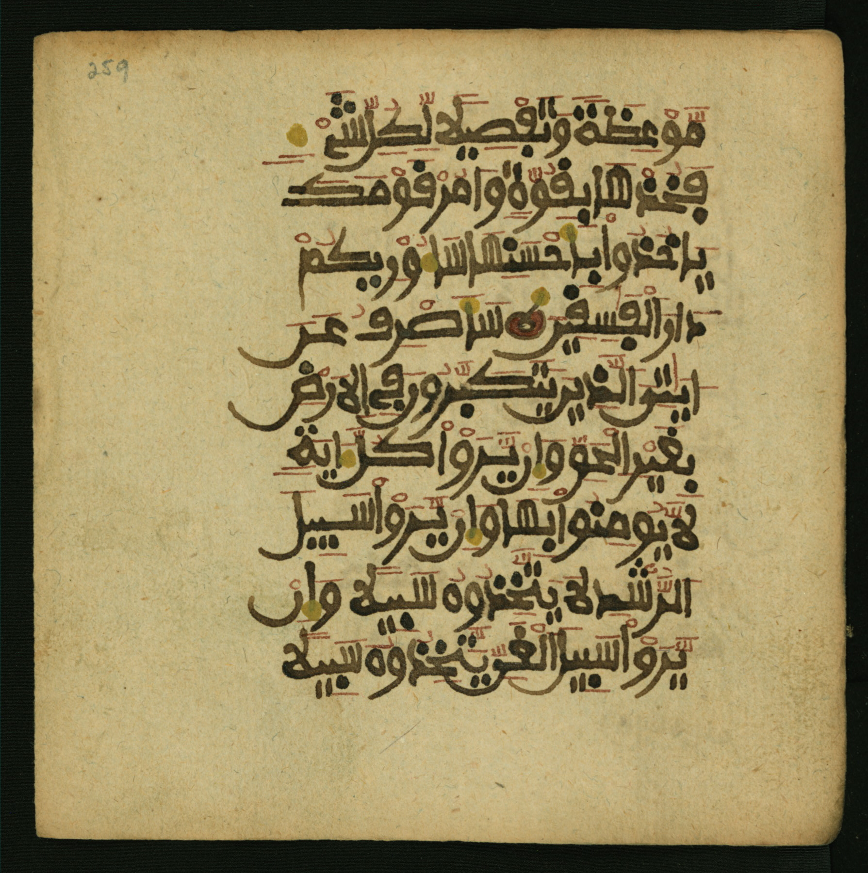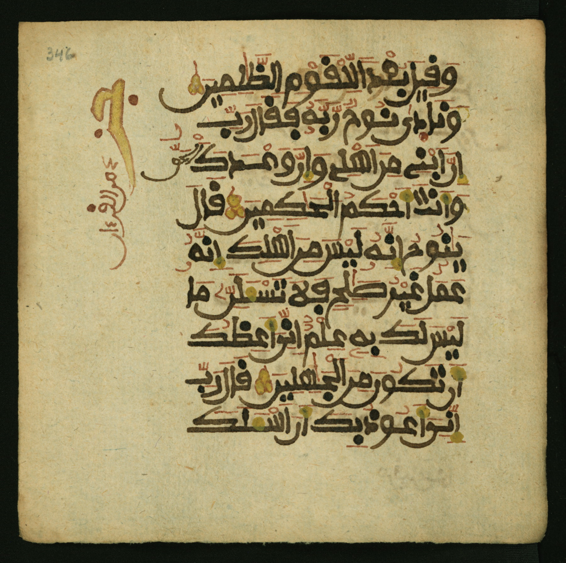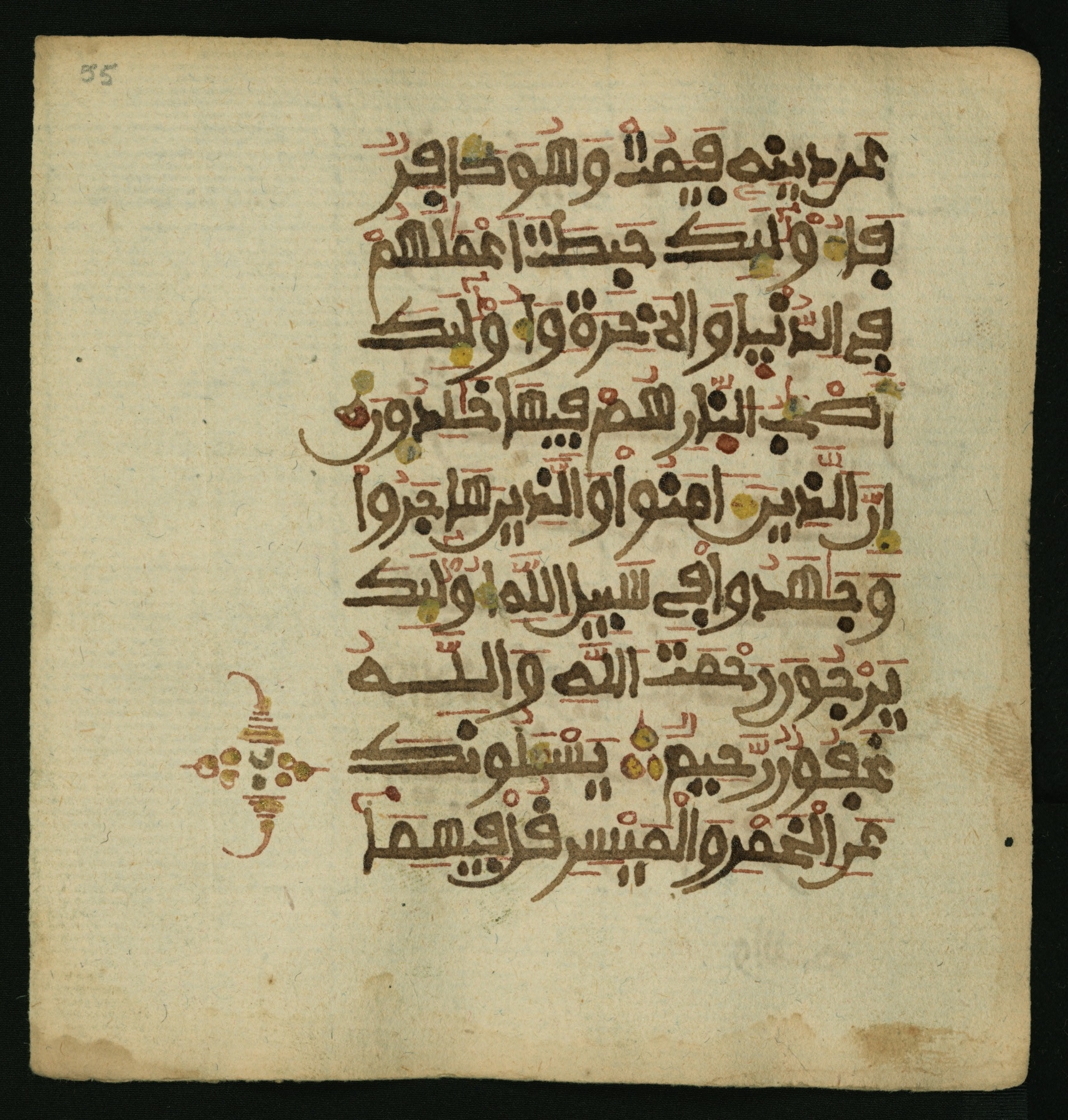 This square-format manuscript is volume 1, containing chapters 1-18 (Sūrat al-fātiḥah through Sūrat al-kahf), of an illuminated two-volume Qur'an produced in Sub-Saharan (West) Africa in the thirteenth century AH / nineteenth CE. The text is written in Sūdānī script in dark brown ink with vocalization in red on loose leaves. Chapter headings are in reddish-brown ink. Three yellow dots outlined in red arranged in a triangular form separate verses. Polychrome circular medallions as well as square and rectangular devices in a variety of patterns and colors mark textual divisions. The leaves of the text are organized between two decorated boards with geometric compositions. The pages and boards are housed in a leather pouch (satchel).